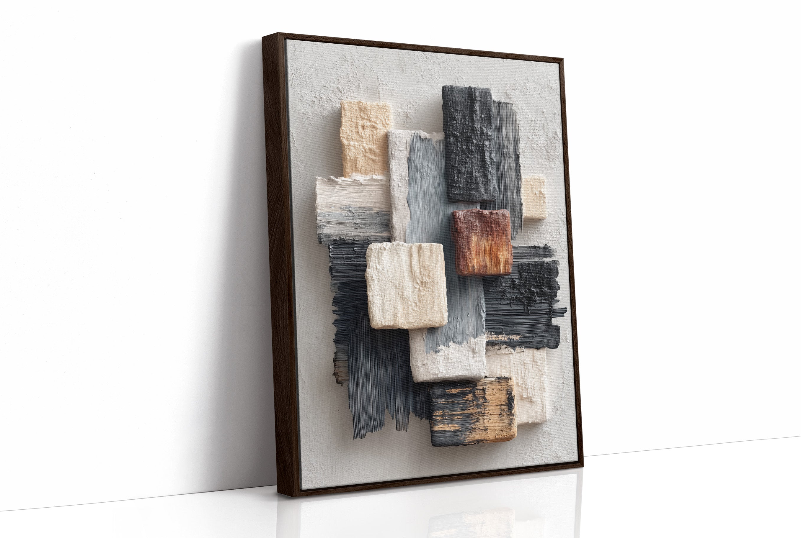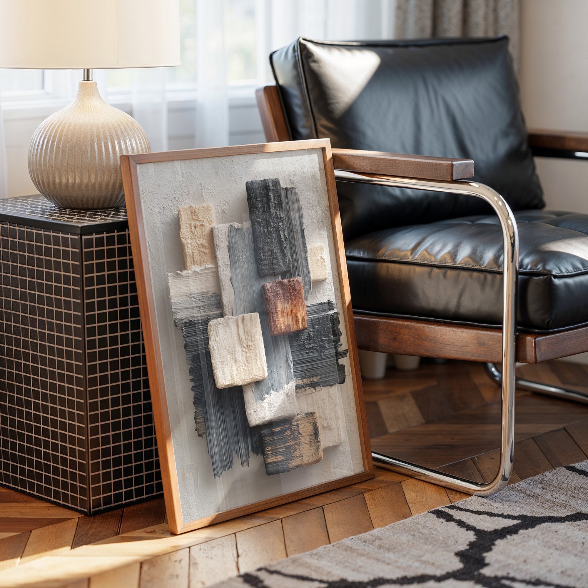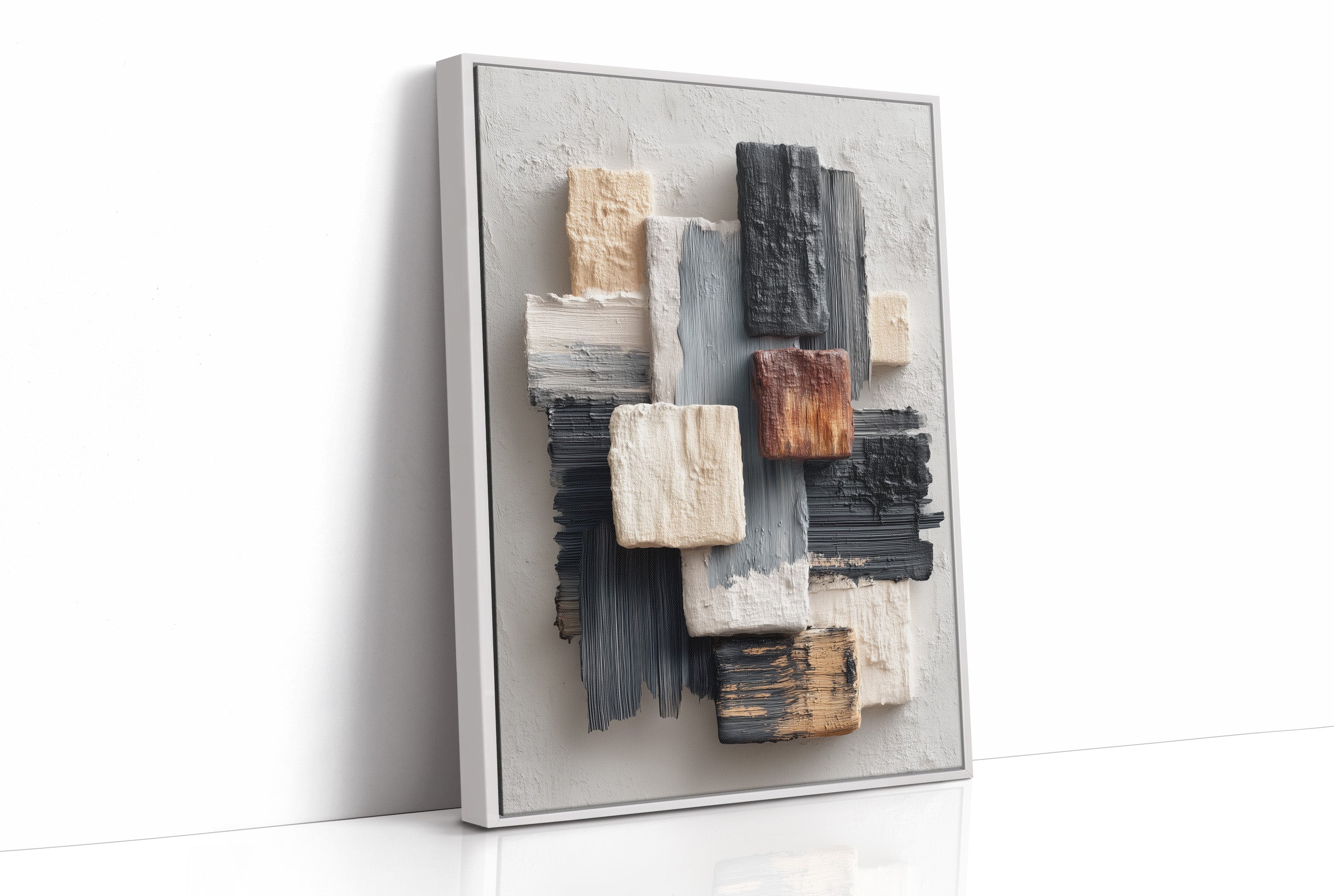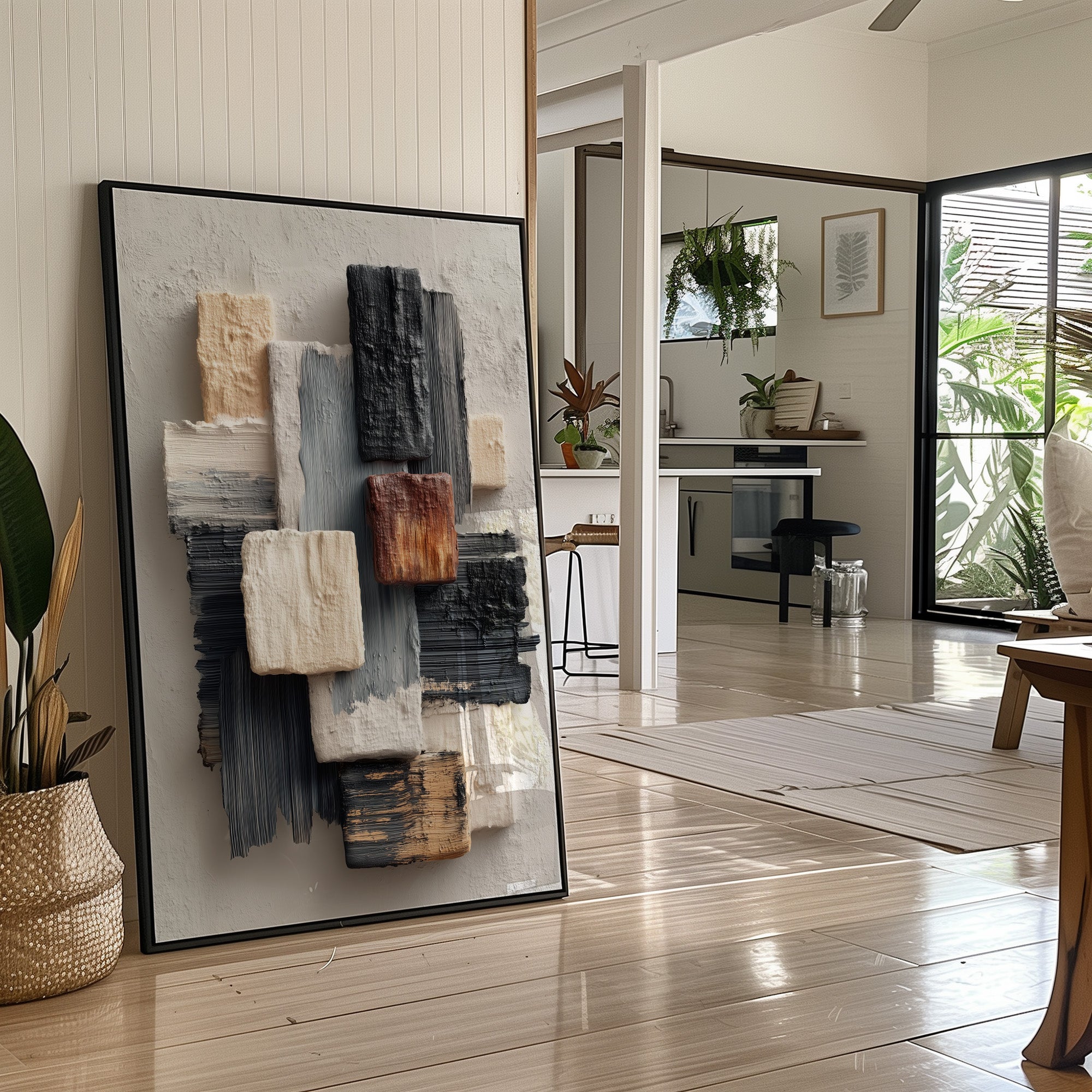 Sunlight streams across a modern living space, illuminating an abstract composition where textured blocks of cream, grey, and copper seem to float against a neutral canvas. The piece creates a gentle rhythm through its layered brushstrokes and architectural forms, speaking to both structure and fluidity. The wooden frame perfectly complements the warm metallic accents of the nearby furniture, while the textural elements echo the room's sophisticated mix of materials. This piece would elevate any contemporary space, particularly suited for a refined living room, executive office, or modern dining area where its subtle palette can engage in dialogue with natural light throughout the day.
