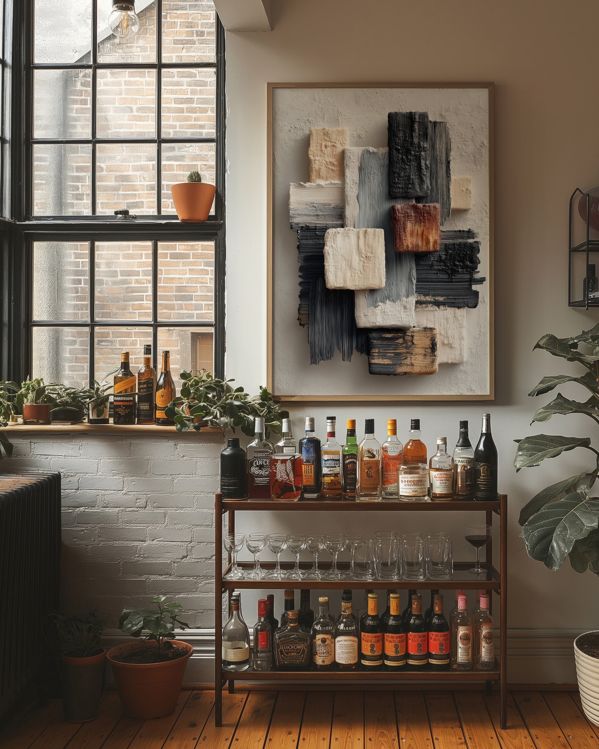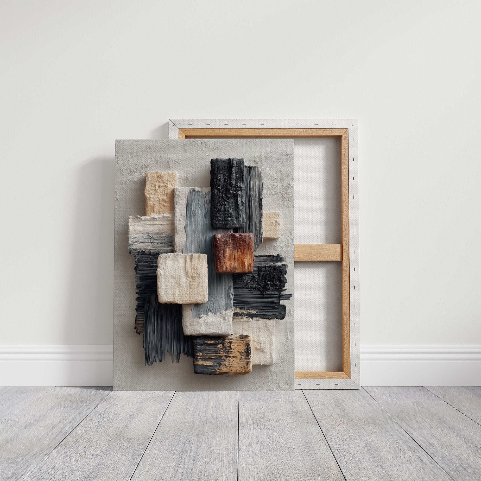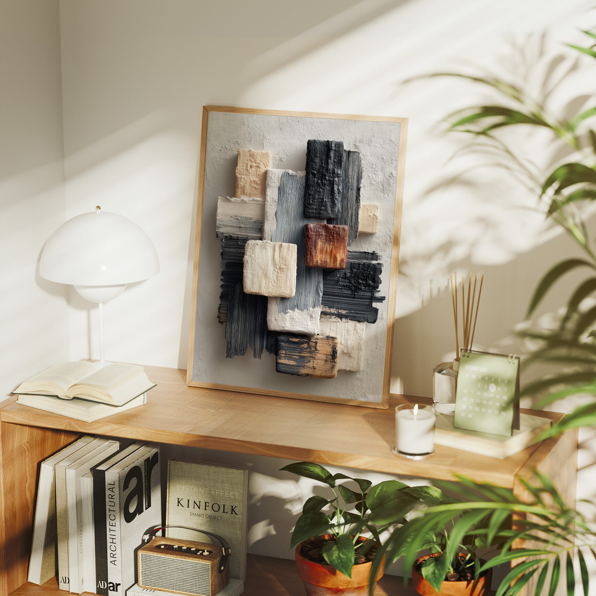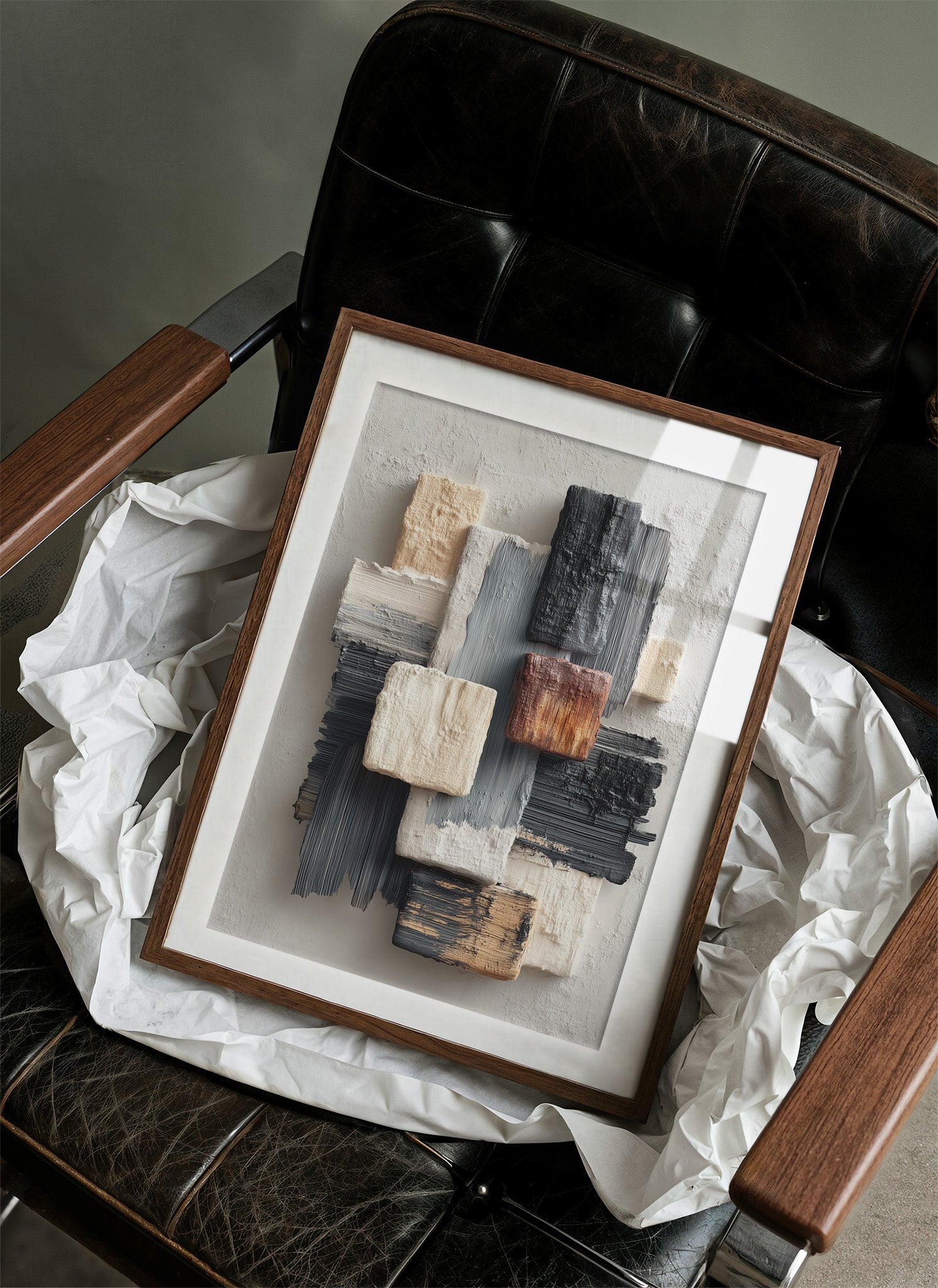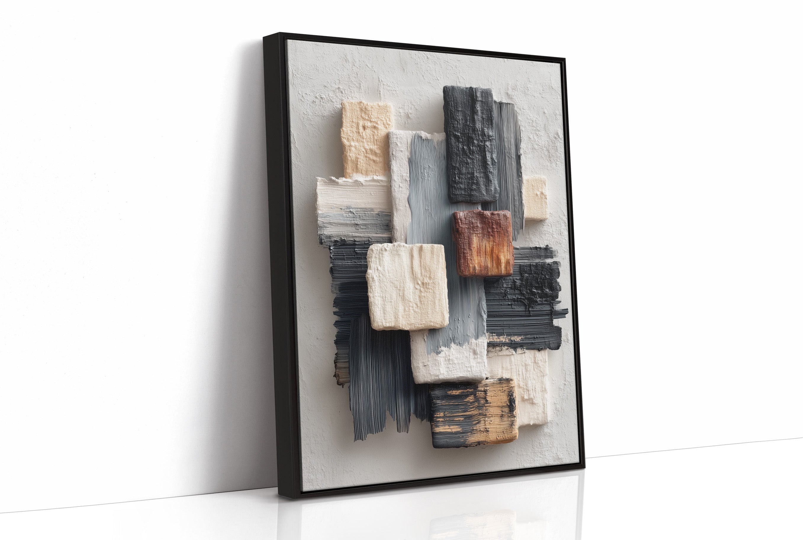 Sunlight streams across a modern living space, illuminating an abstract composition where textured blocks of cream, grey, and copper seem to float against a neutral canvas. The piece creates a gentle rhythm through its layered brushstrokes and architectural forms, speaking to both structure and fluidity. The wooden frame perfectly complements the warm metallic accents of the nearby furniture, while the textural elements echo the room's sophisticated mix of materials. This piece would elevate any contemporary space, particularly suited for a refined living room, executive office, or modern dining area where its subtle palette can engage in dialogue with natural light throughout the day.