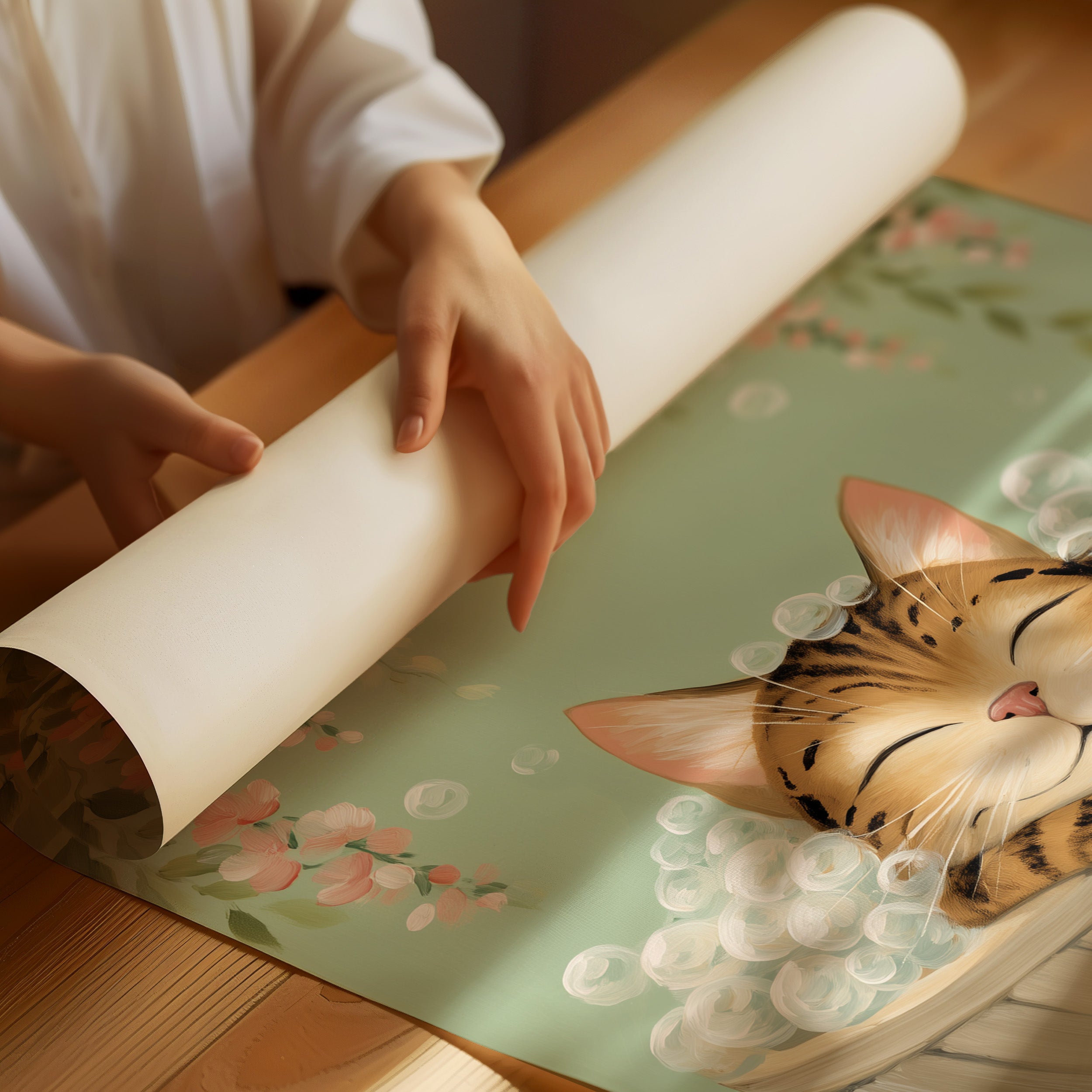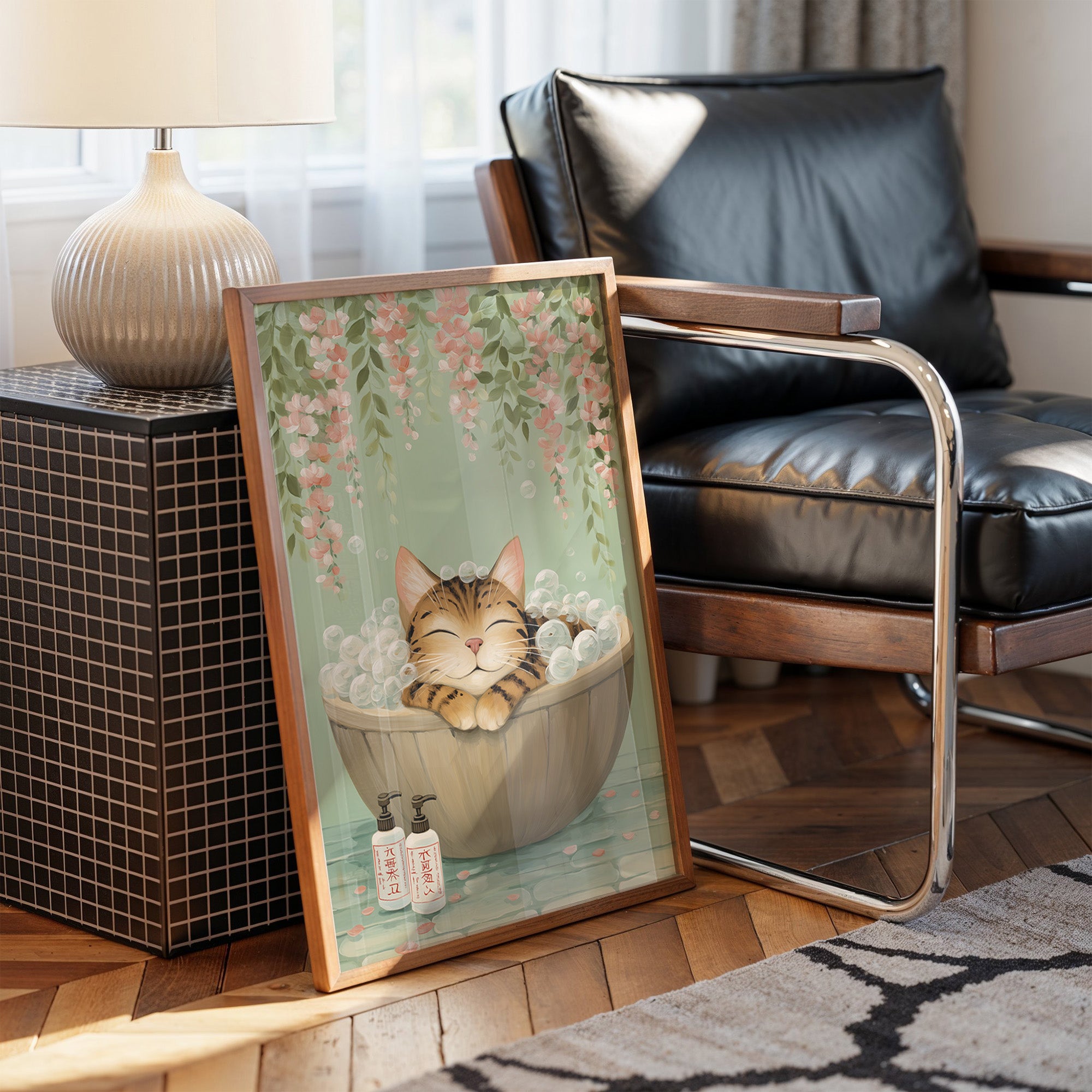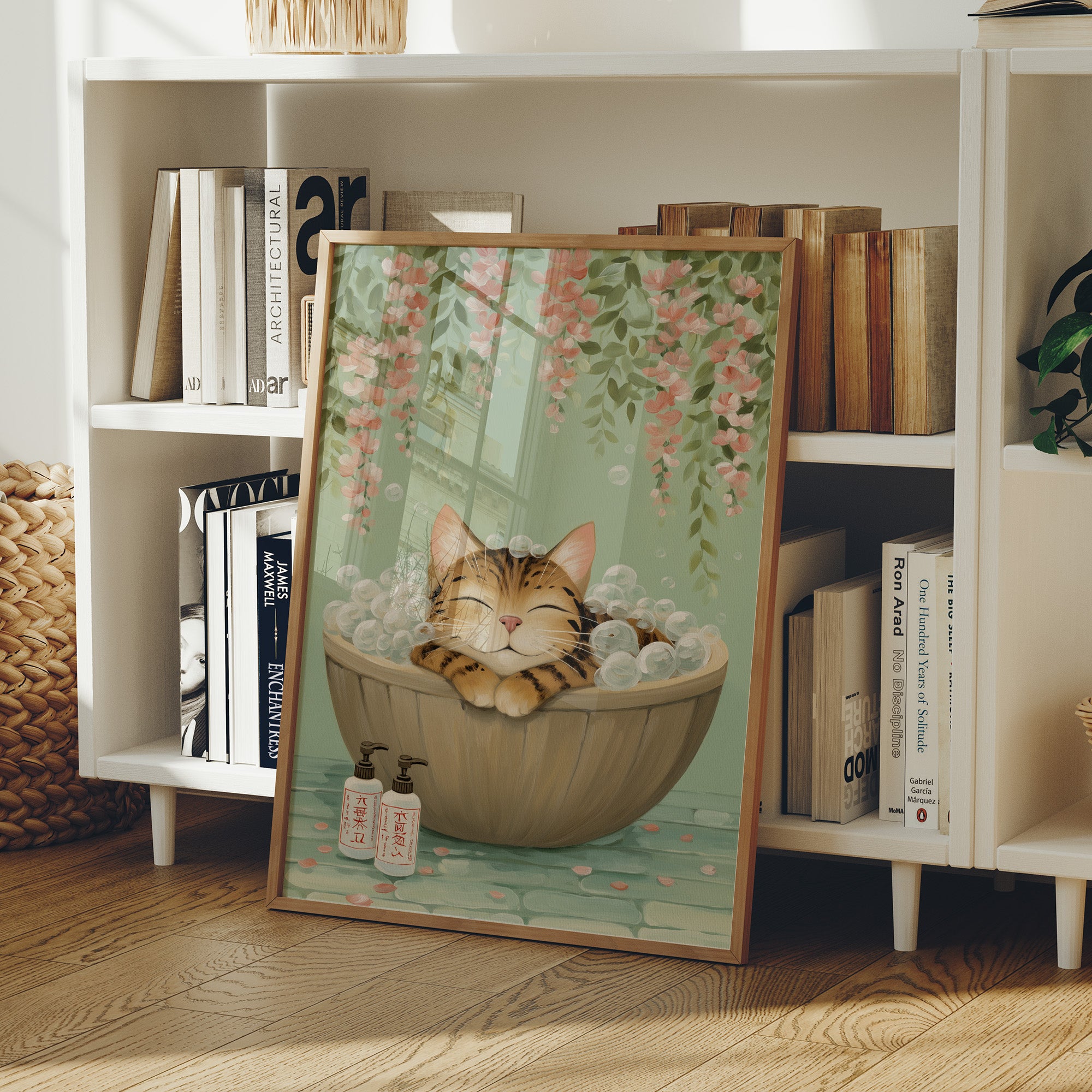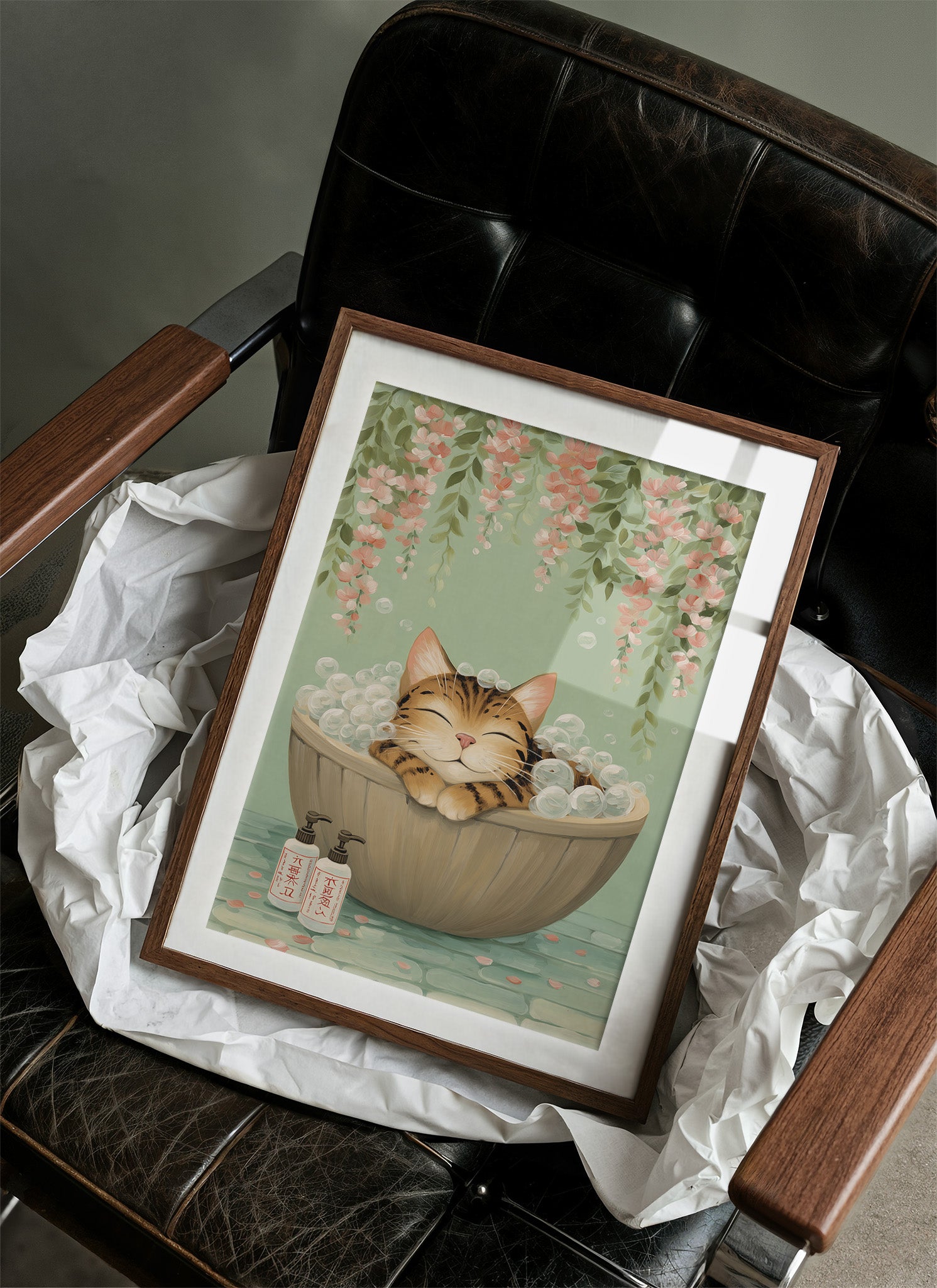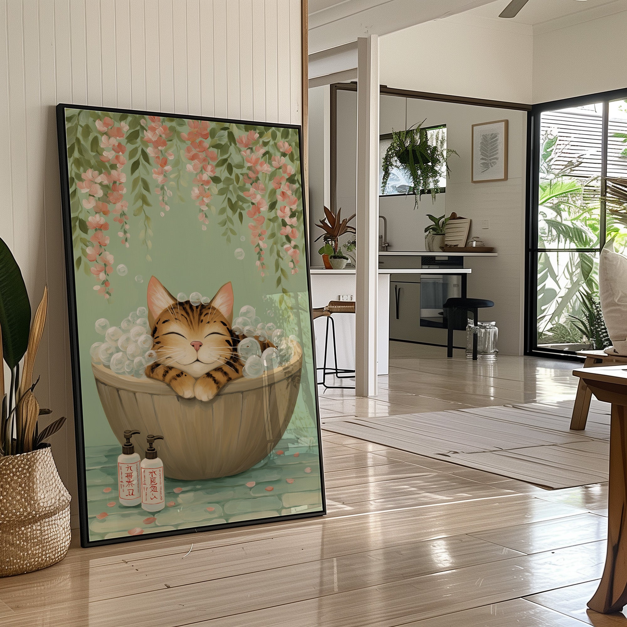 A whimsical moment captures a content tabby cat luxuriating in a bubble-filled basin, surrounded by cascading cherry blossoms. Soft mint-green tones create a dreamy backdrop while delicate pink petals dance above, perfectly framing this peaceful scene of feline indulgence. Japanese-inspired elements blend seamlessly with the playful illustration style, from the gentle curve of the cat's satisfied smile to the carefully placed bath products with their oriental labels. This charming piece would bring a touch of zen-like serenity to a bathroom, powder room, or any space where a moment of pure joy and relaxation is needed.