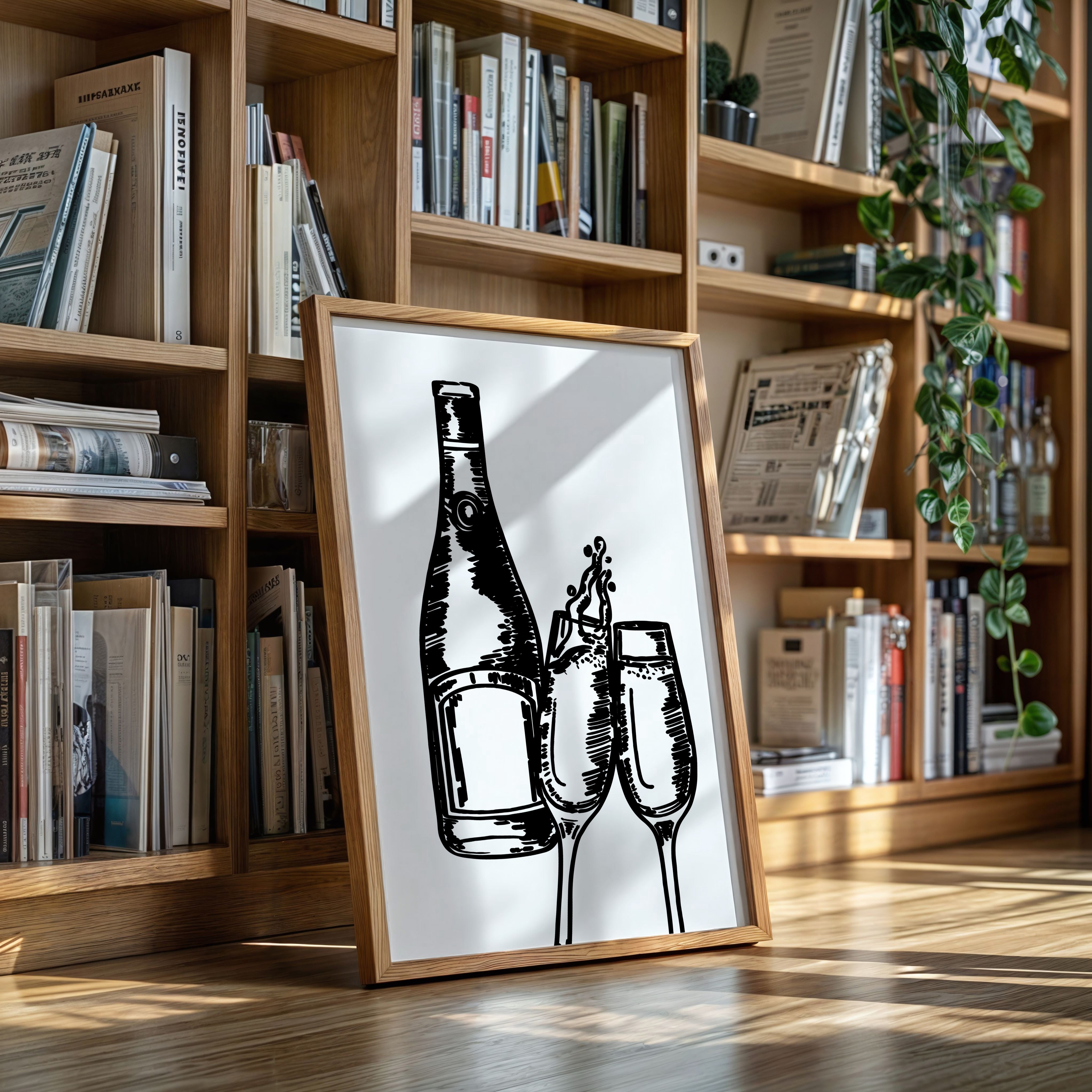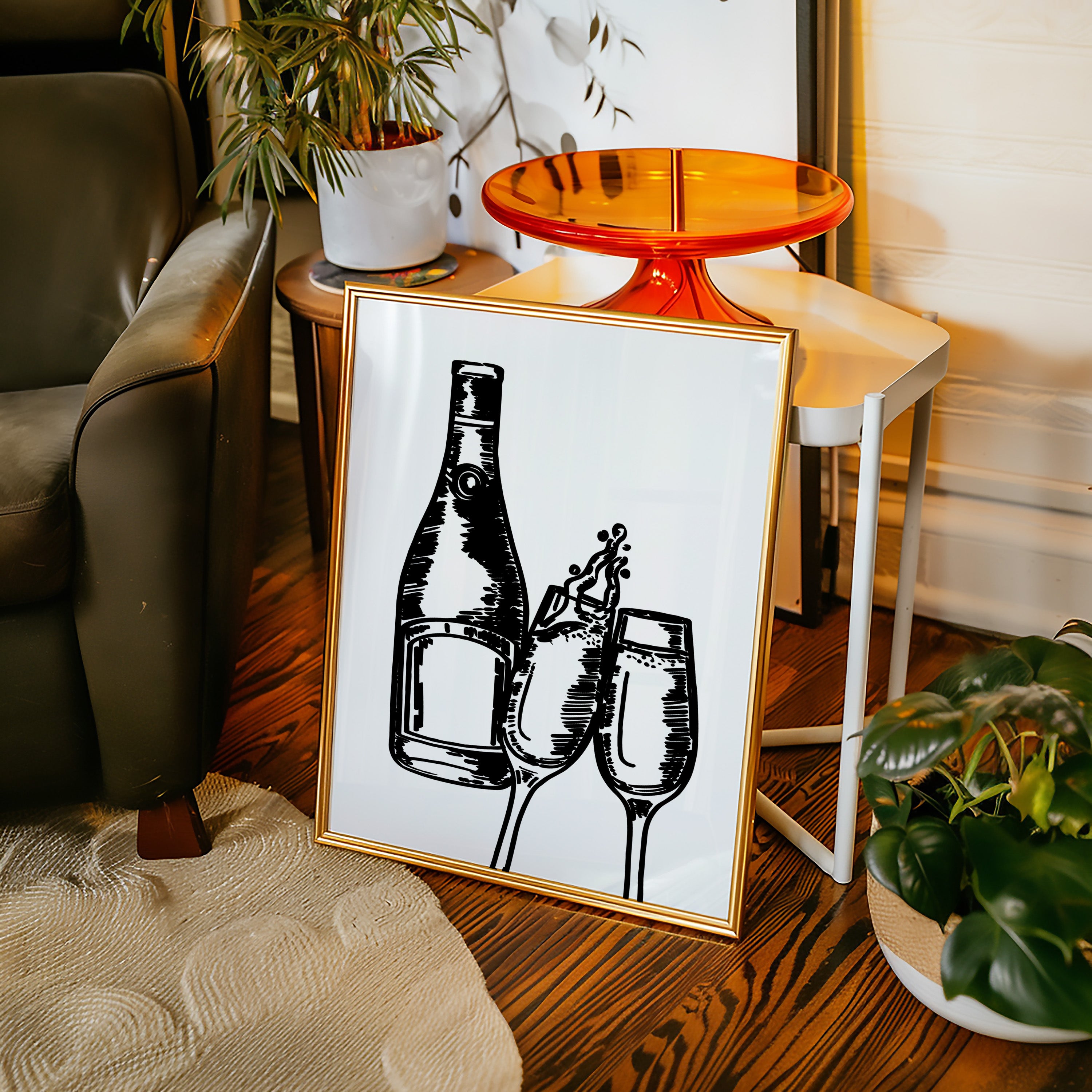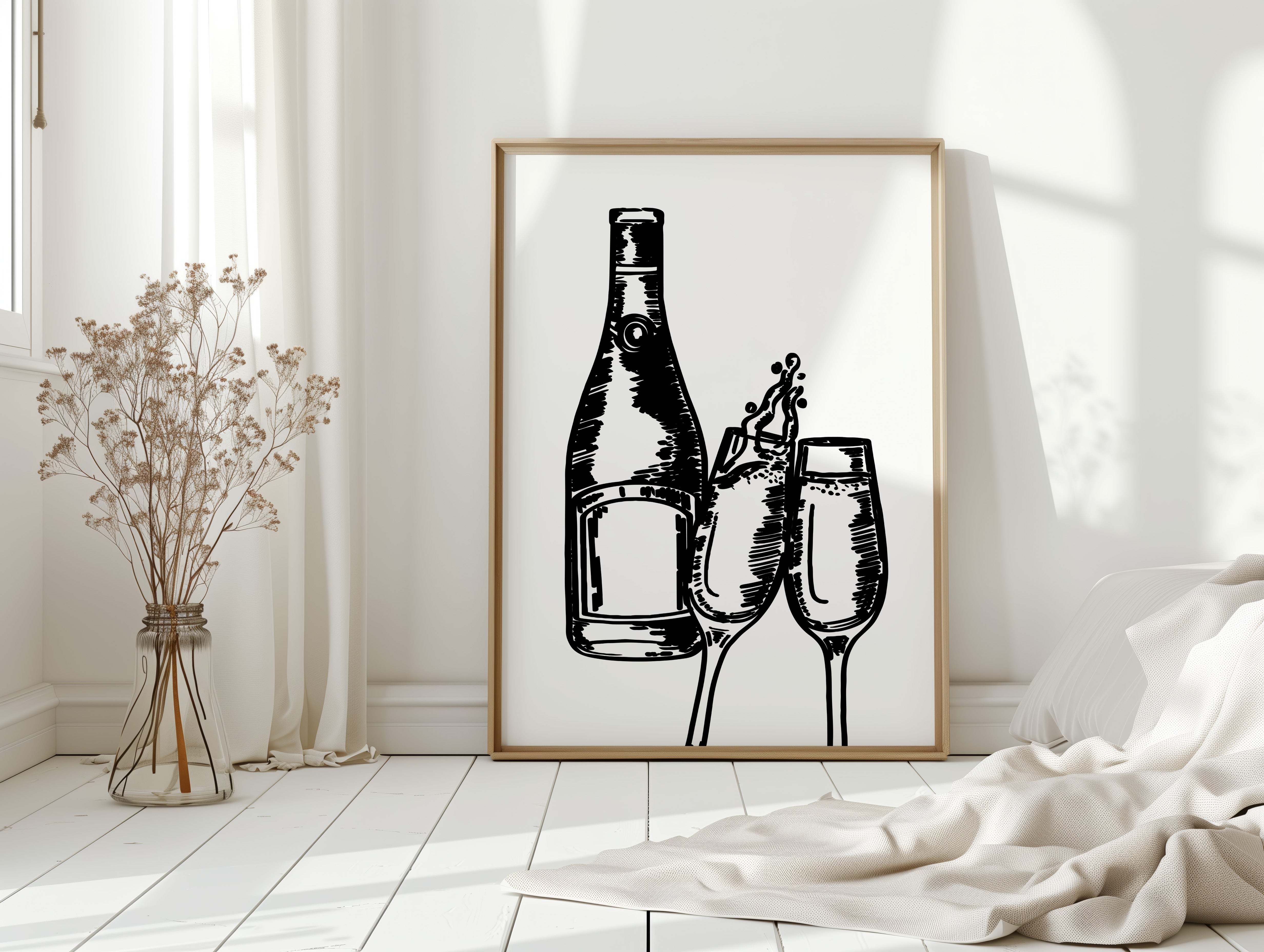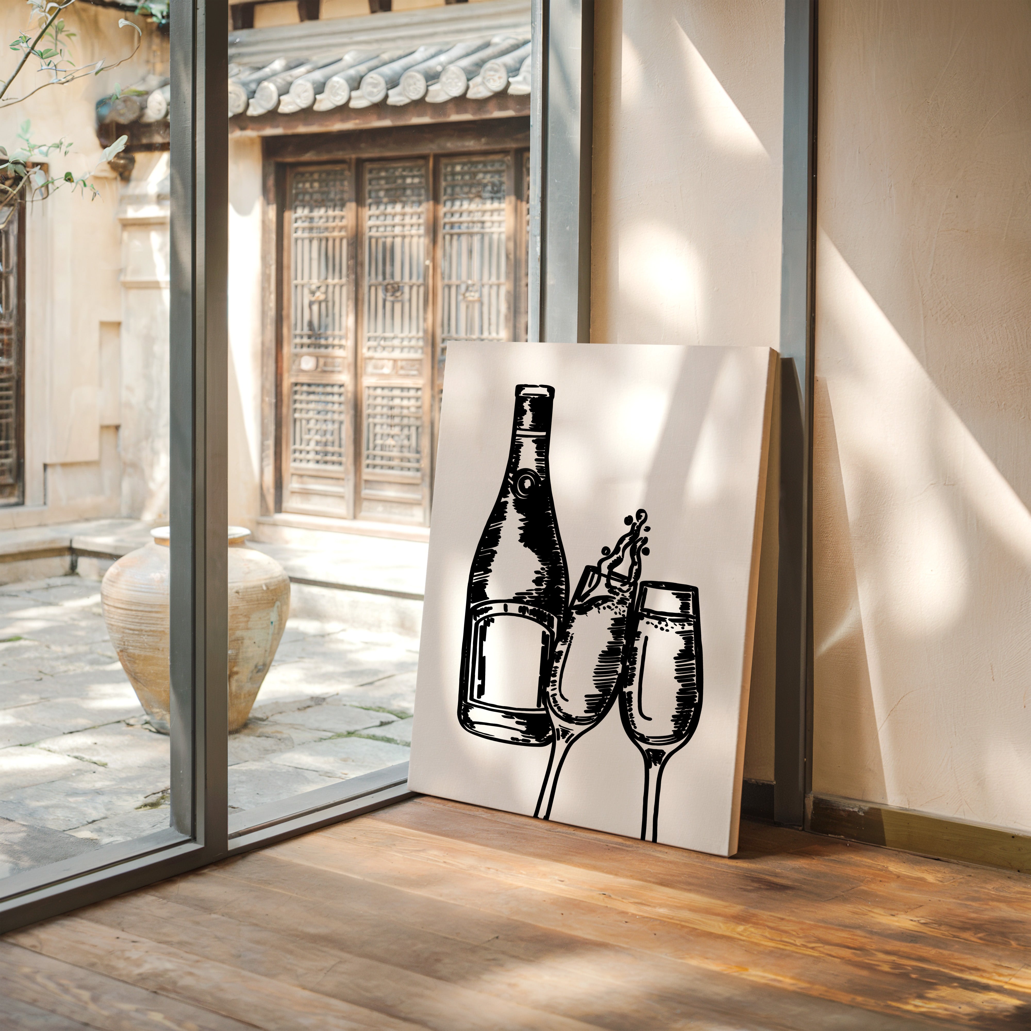 A moment of pure celebration captured in bold black strokes, where effervescent bubbles rise like tiny stars in crystal flutes. This striking contemporary piece brings modern minimalism to classic sophistication. The composition tells a story of special occasions and cherished memories, with a champagne bottle standing proudly alongside two elegant glasses caught in a moment of festive anticipation. Perfect for dining rooms, home bars, or kitchen spaces where gatherings naturally flow. This piece invites both intimate conversations and grand celebrations, adding a touch of sophistication to any entertaining space.