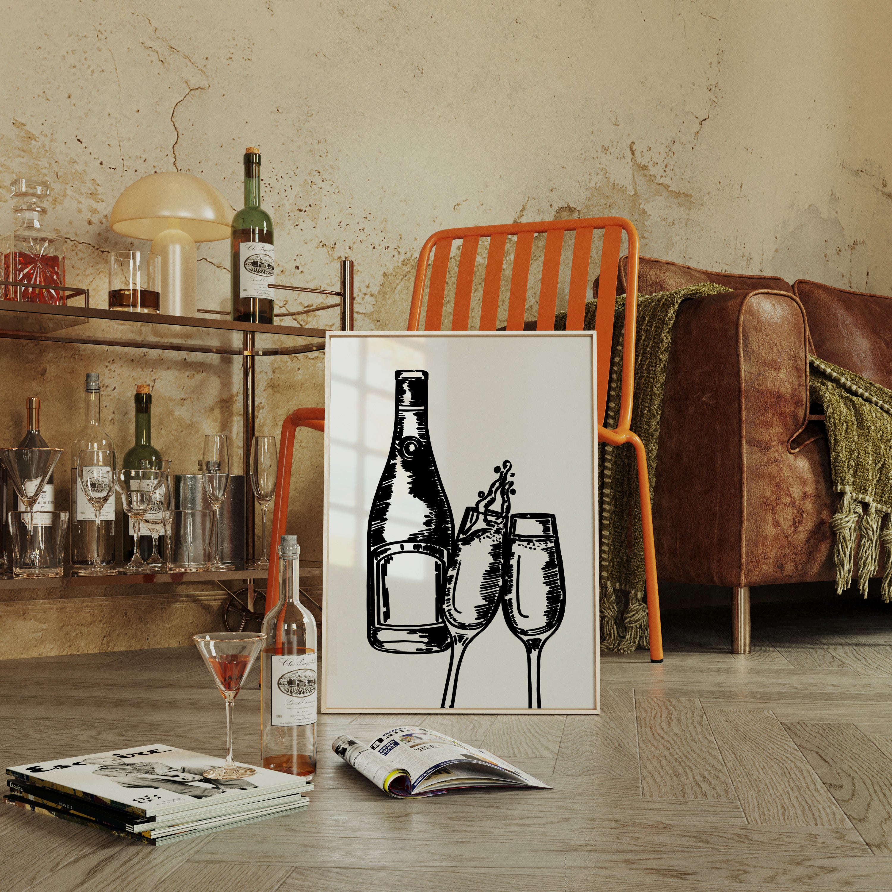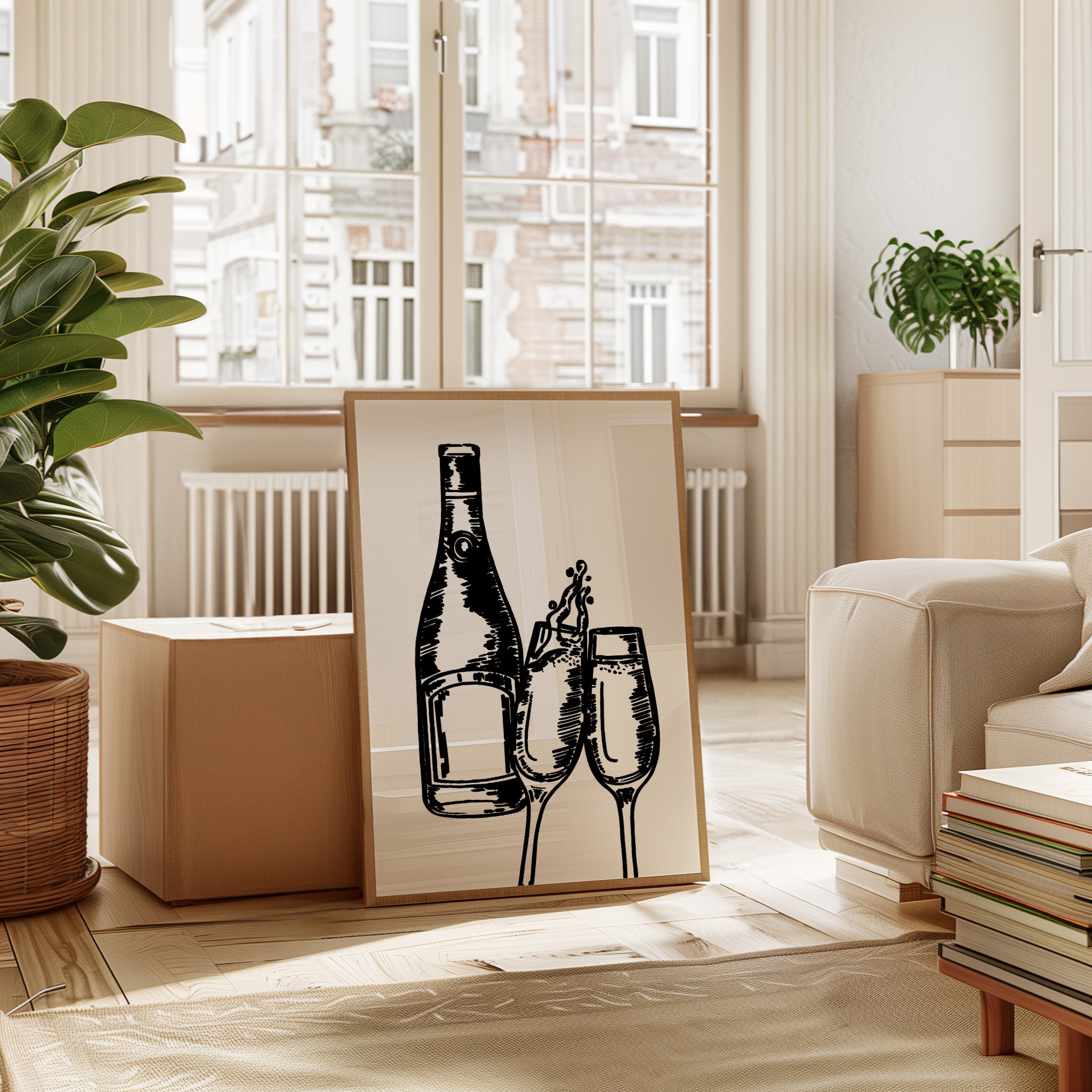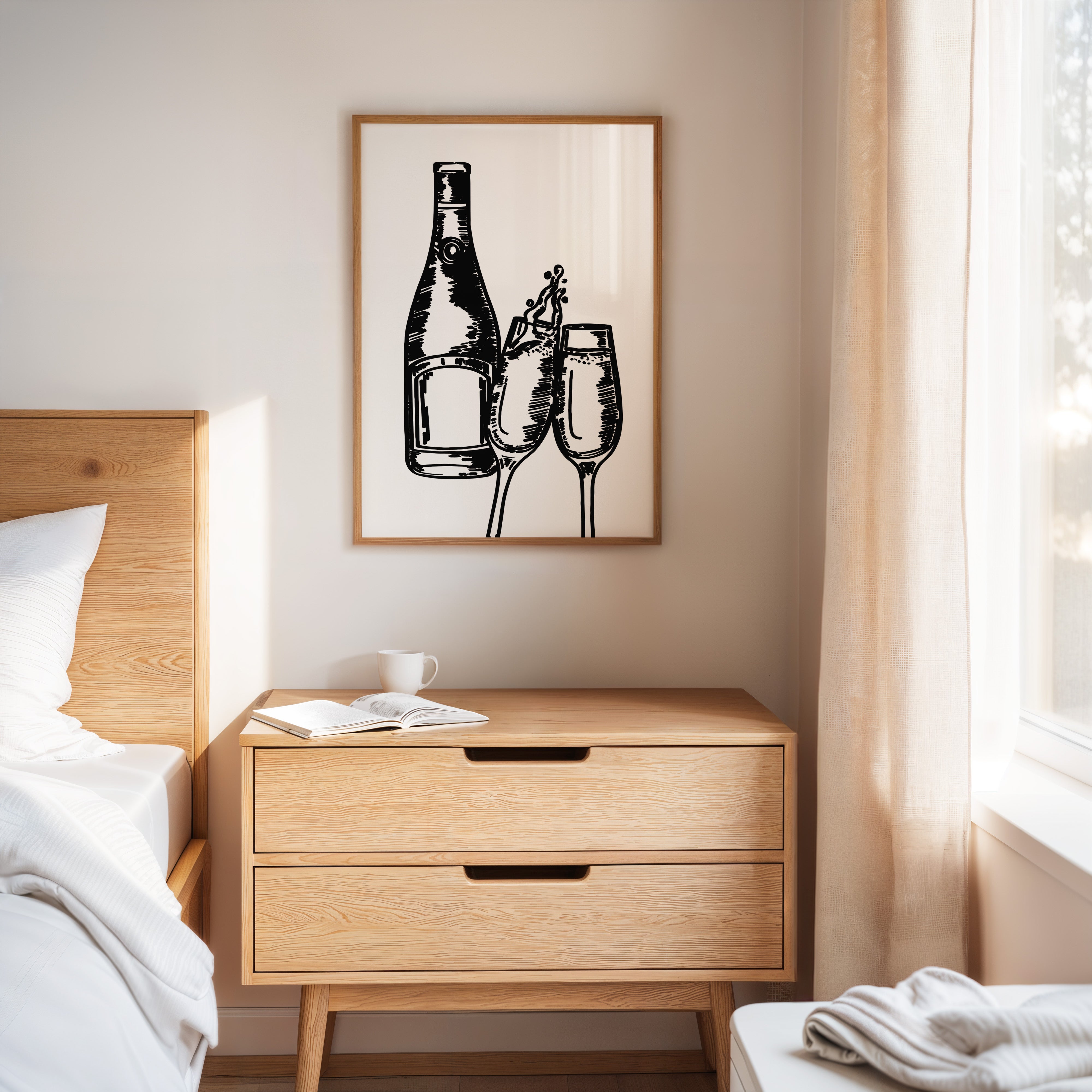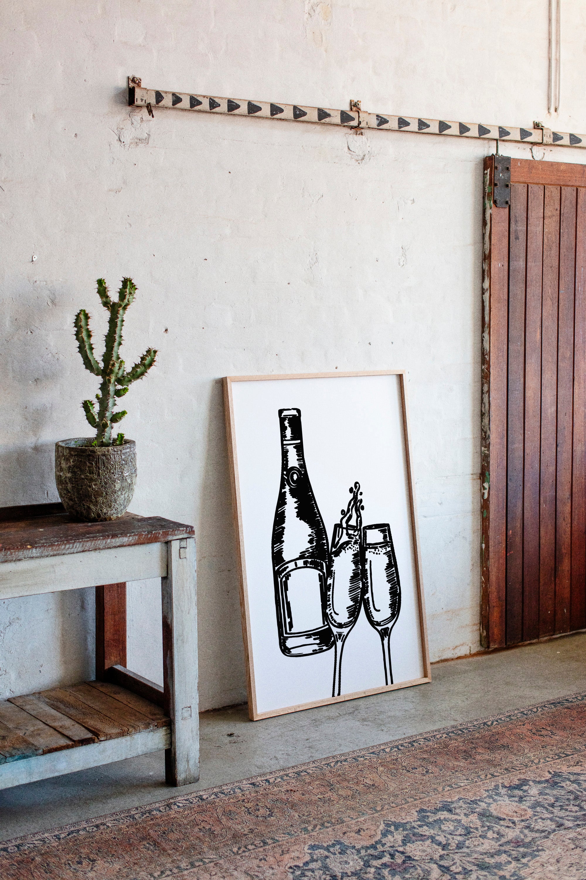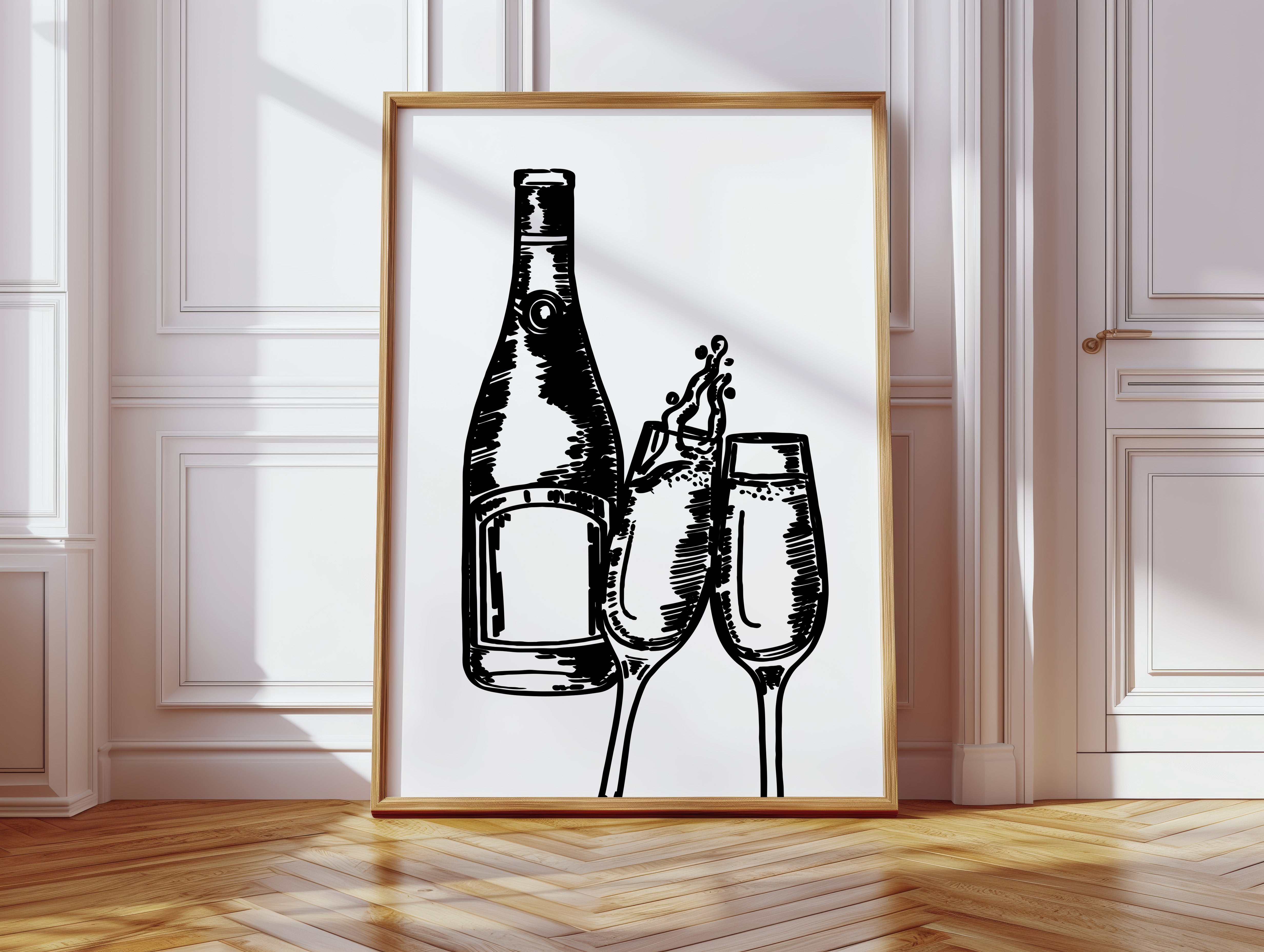 A moment of pure celebration captured in bold black strokes, where effervescent bubbles rise like tiny stars in crystal flutes. This striking contemporary piece brings modern minimalism to classic sophistication. The composition tells a story of special occasions and cherished memories, with a champagne bottle standing proudly alongside two elegant glasses caught in a moment of festive anticipation. Perfect for dining rooms, home bars, or kitchen spaces where gatherings naturally flow. This piece invites both intimate conversations and grand celebrations, adding a touch of sophistication to any entertaining space.