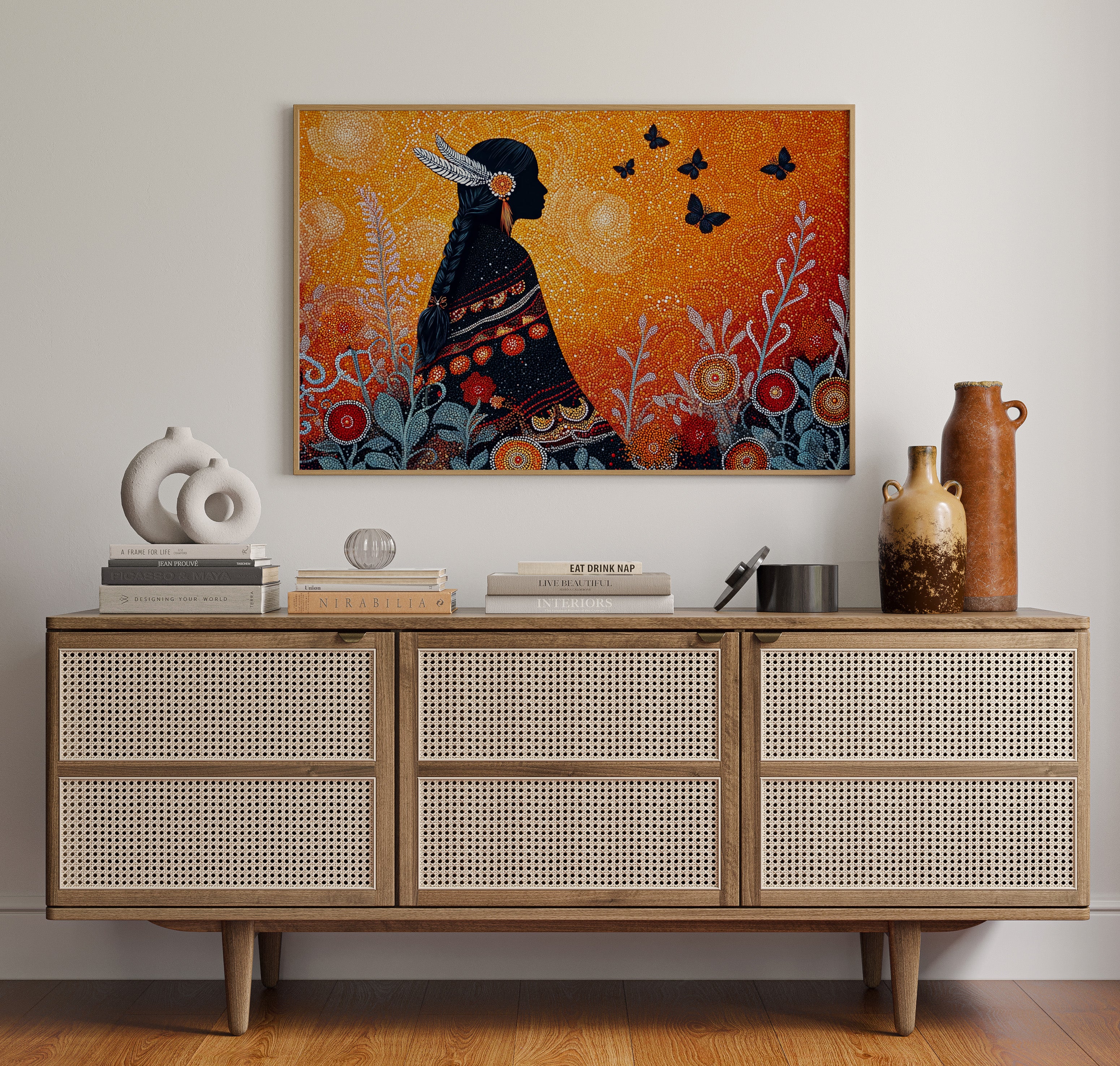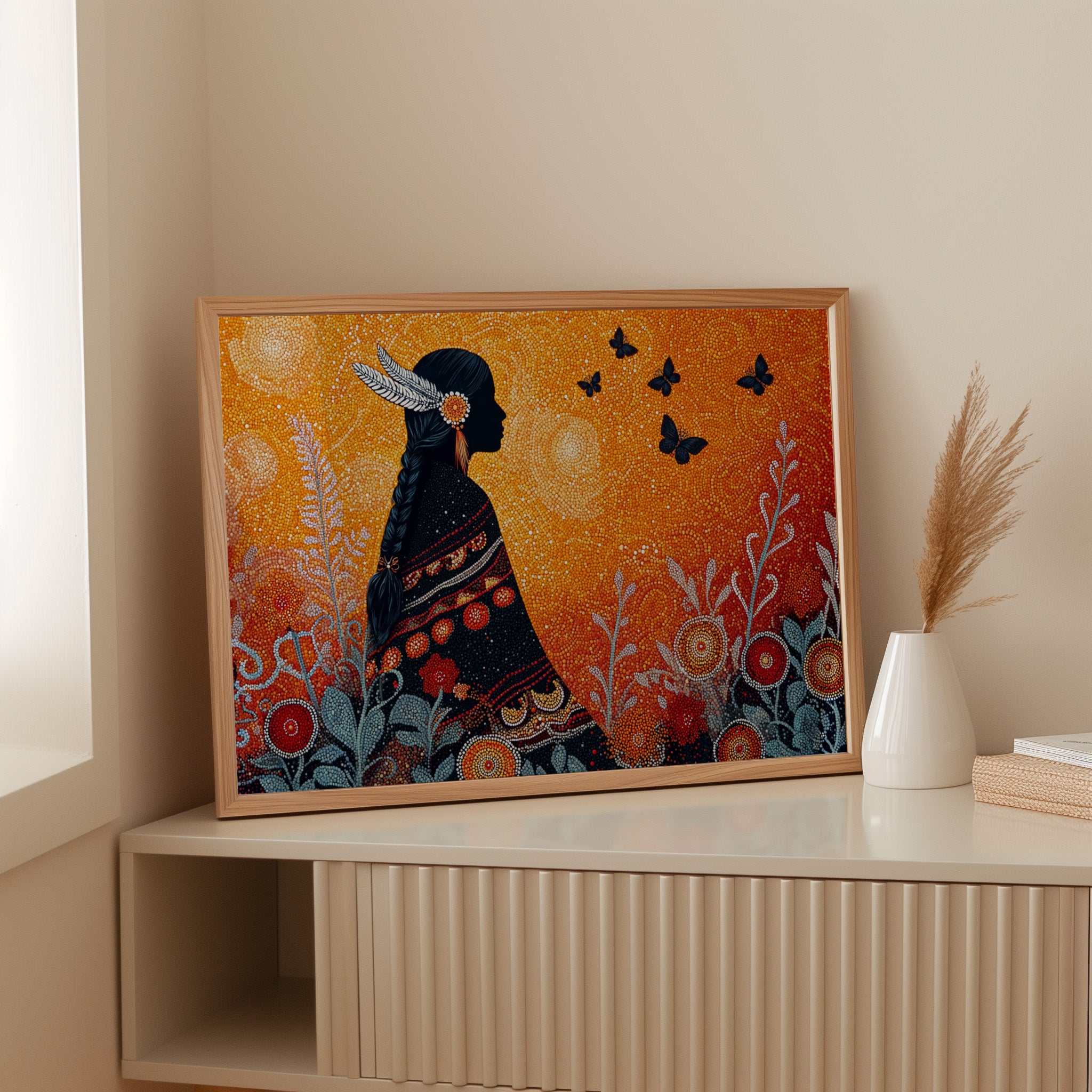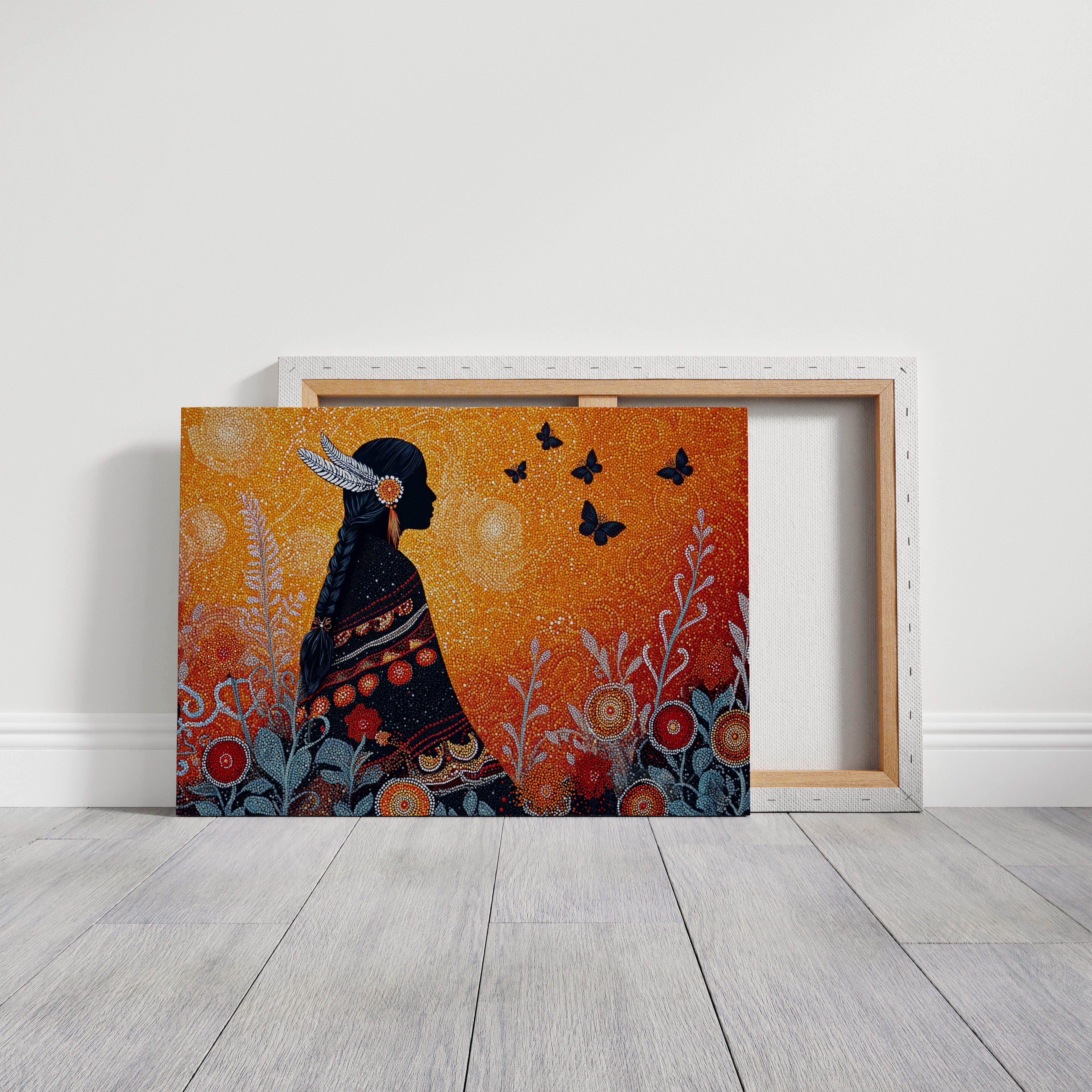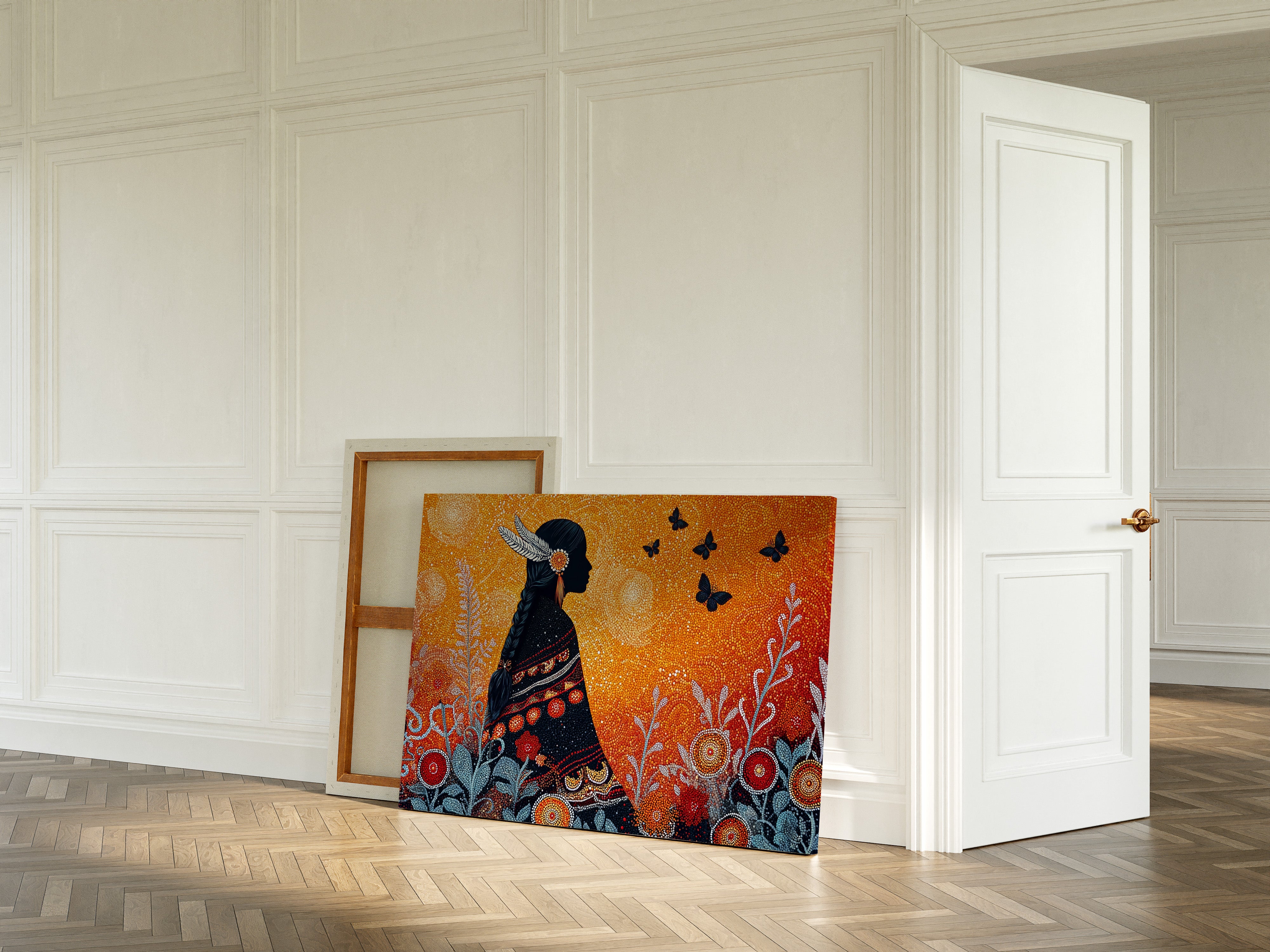 A mosaic-like scene unfolds in vibrant amber and deep indigo, where dots of light create a magical twilight atmosphere. The silhouette stands in dignified profile, adorned with feathers and intricate traditional garments, while black butterflies float freely in the golden sky. The detailed dot work creates a mesmerizing pattern of circular blooms and silver-blue foliage, weaving together elements of nature and cultural heritage.