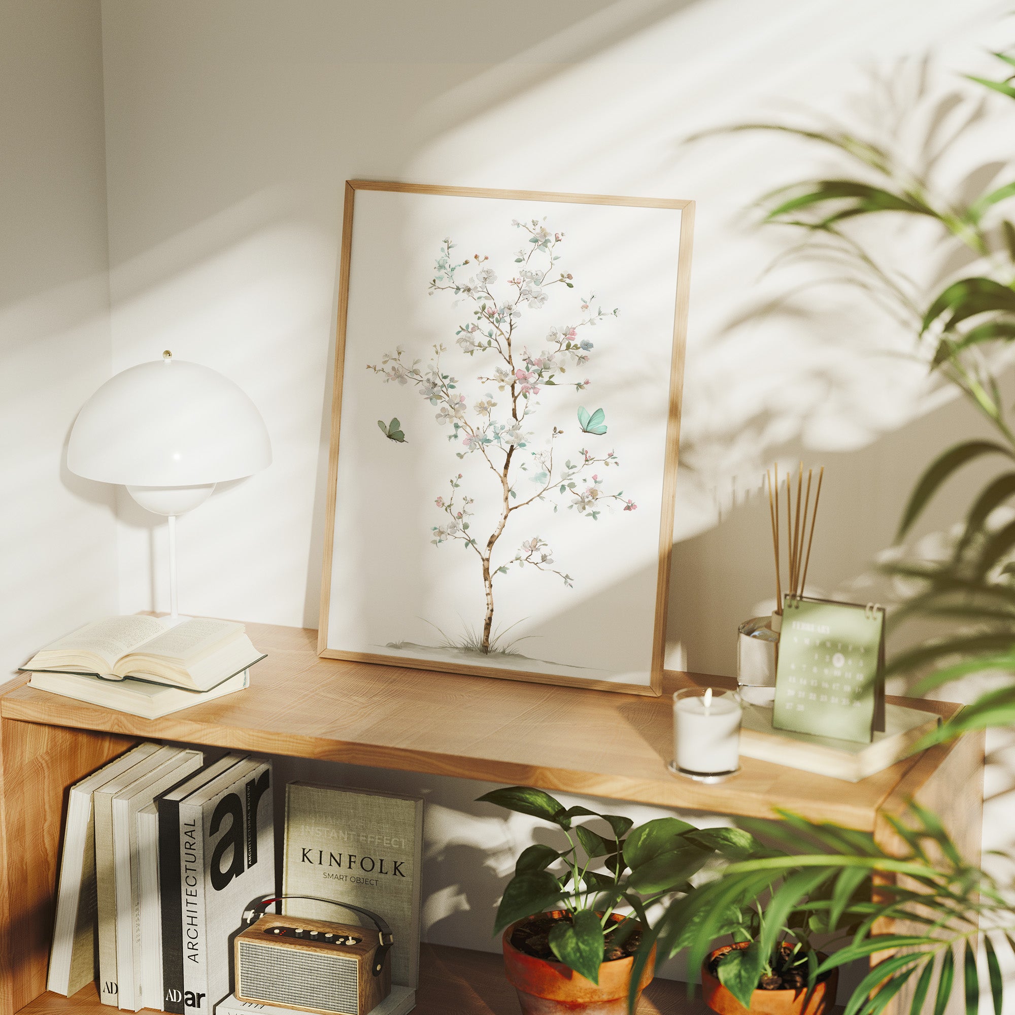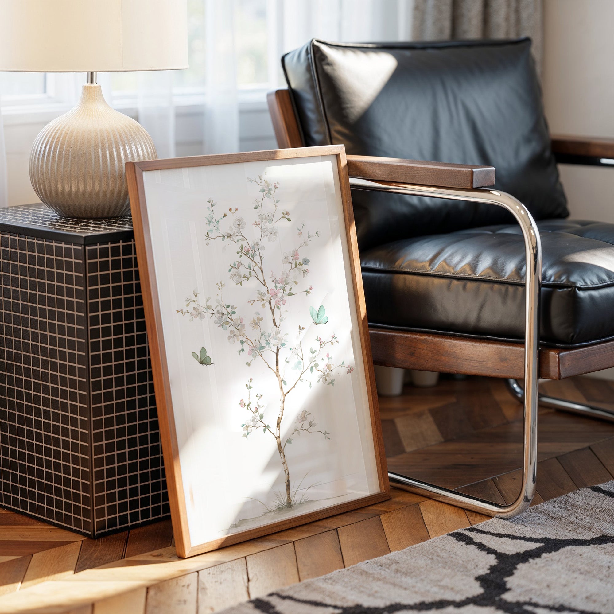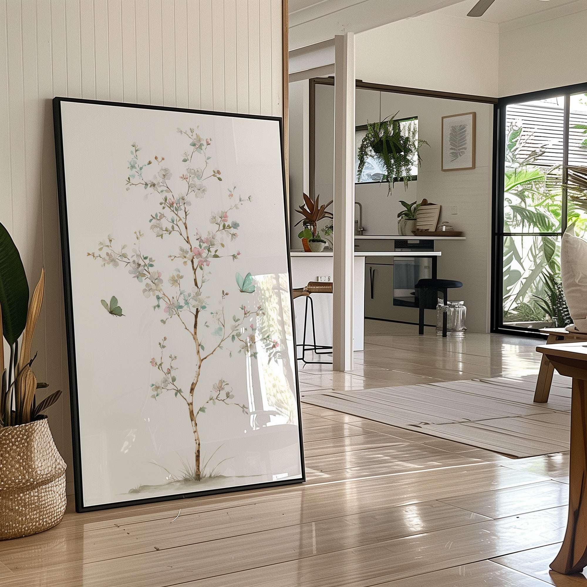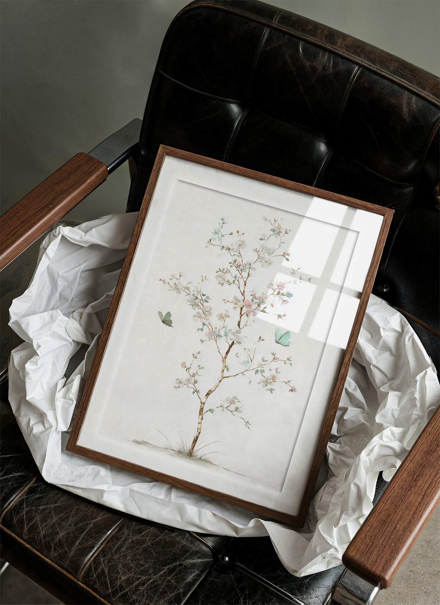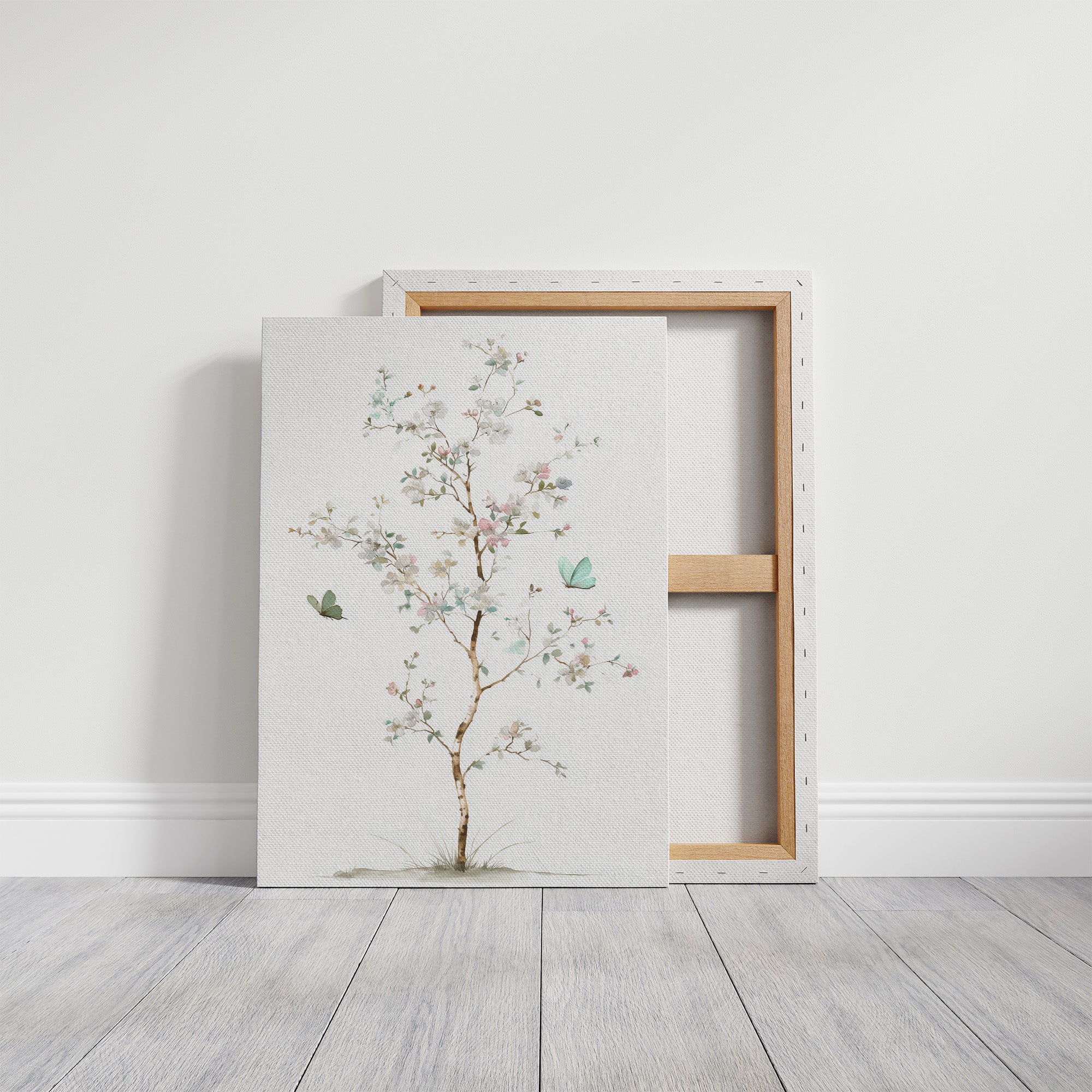 Delicate brushstrokes capture the ethereal dance of spring, where mint-hued butterflies flutter among blooming branches against pristine white. The graceful composition balances subtle pink blossoms with tender green leaves, creating a meditation on nature's most gentle moments. Watercolor techniques blend seamlessly to portray the fleeting beauty of seasonal renewal, while the minimal color palette maintains an air of sophisticated serenity. This piece brings tranquil energy to reading nooks, meditation spaces, or anywhere you seek a moment of peaceful contemplation.