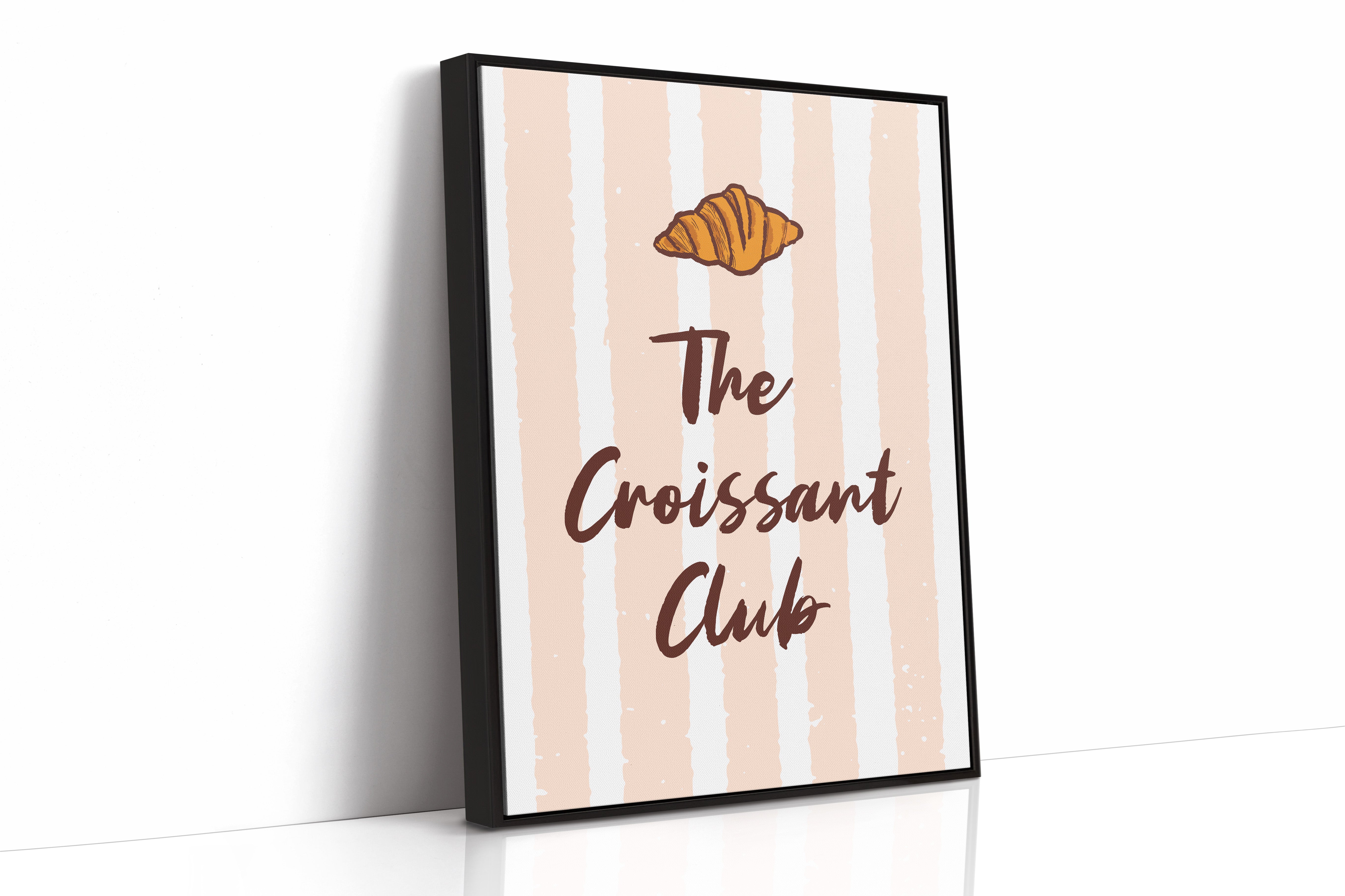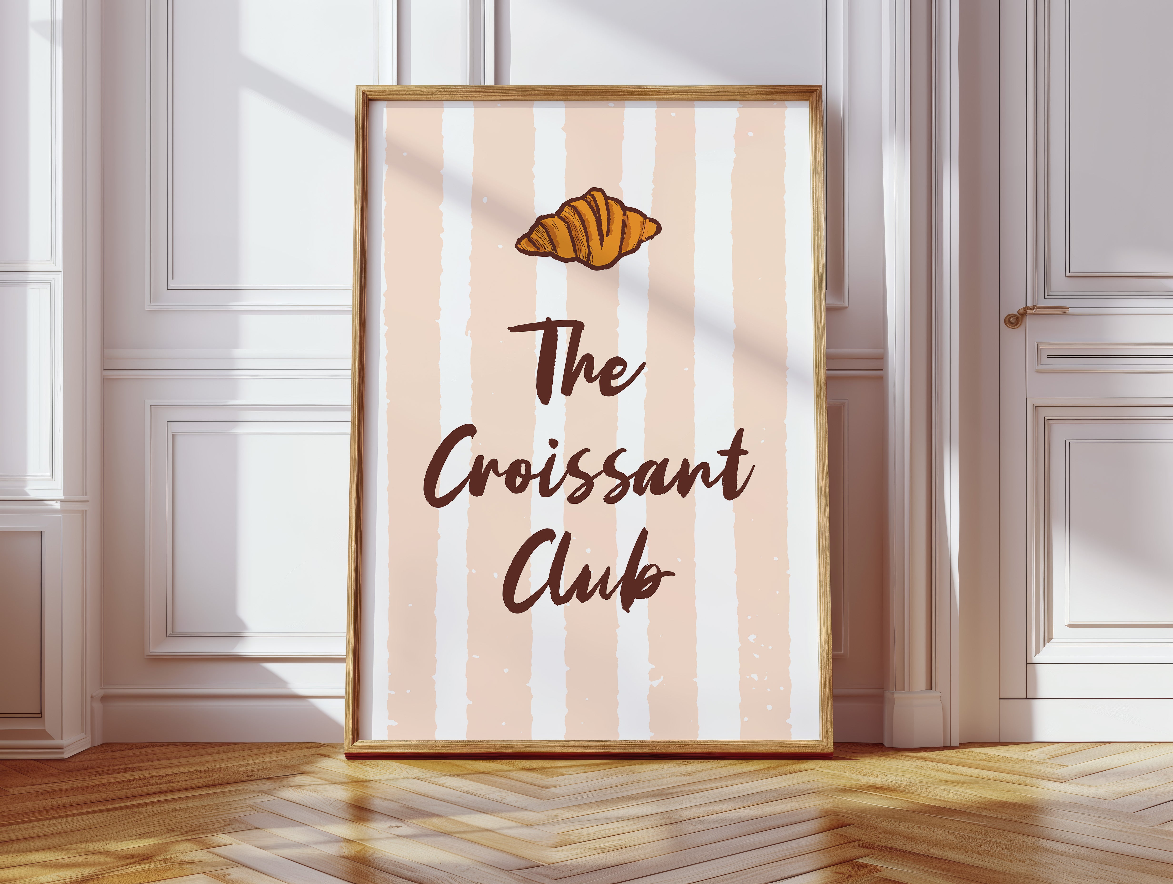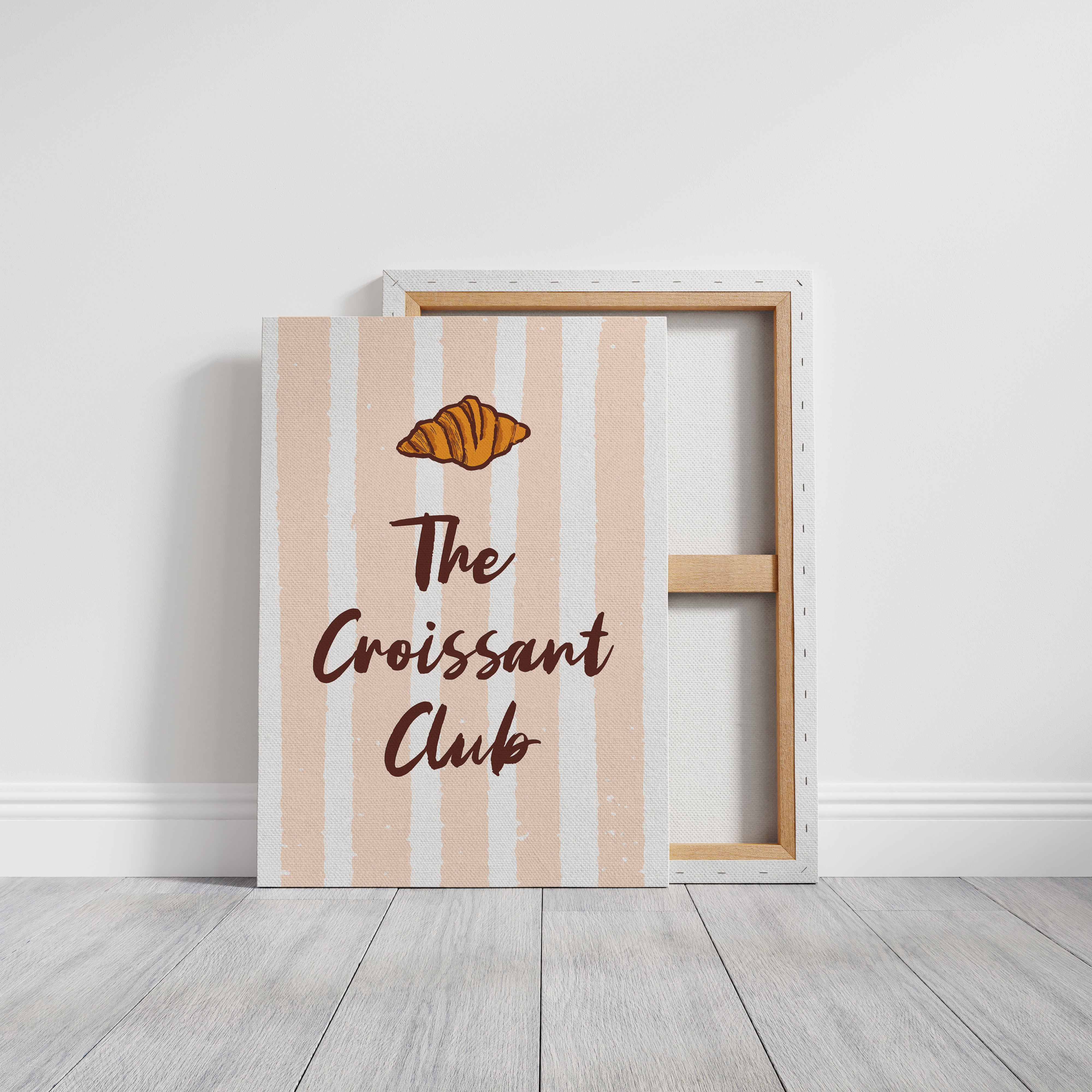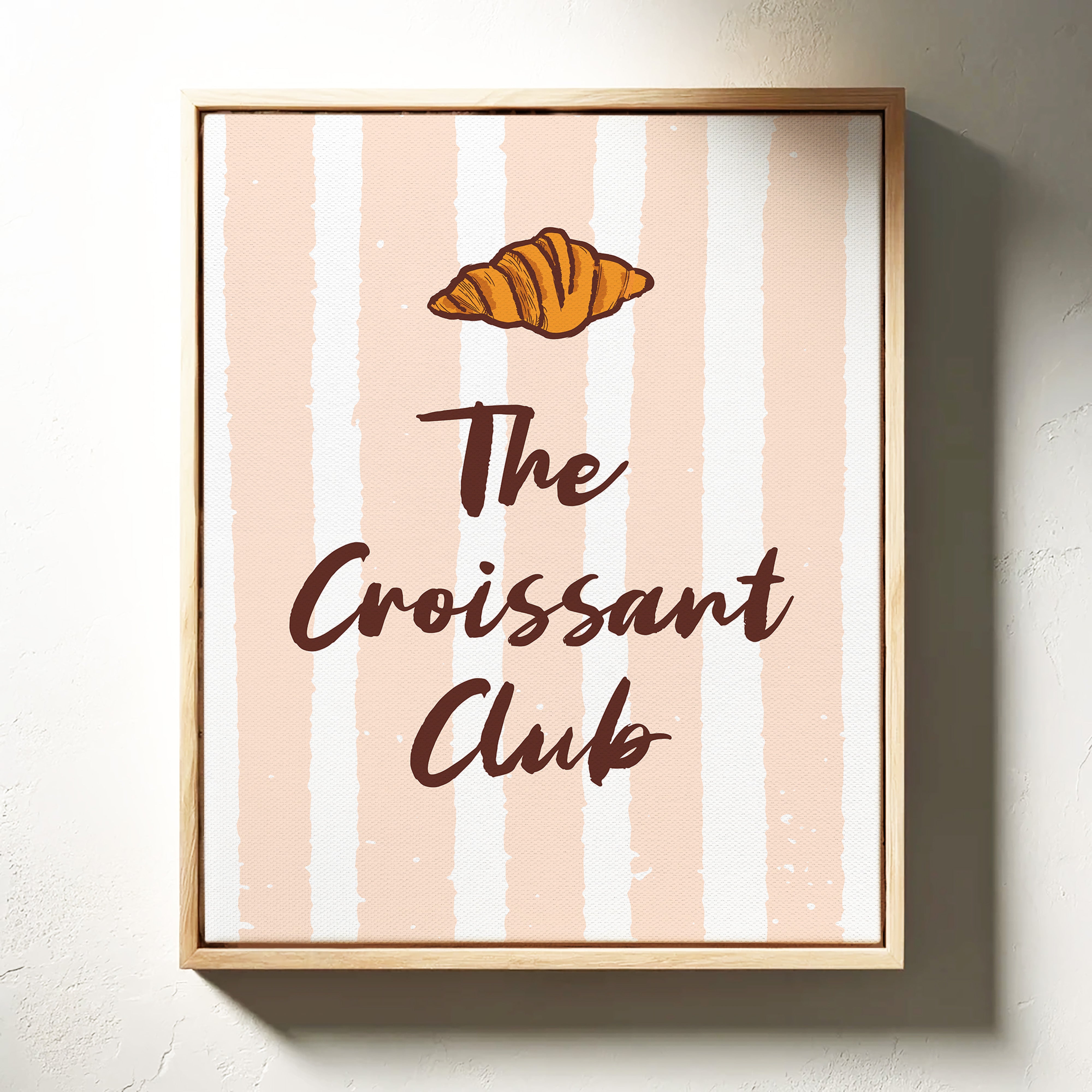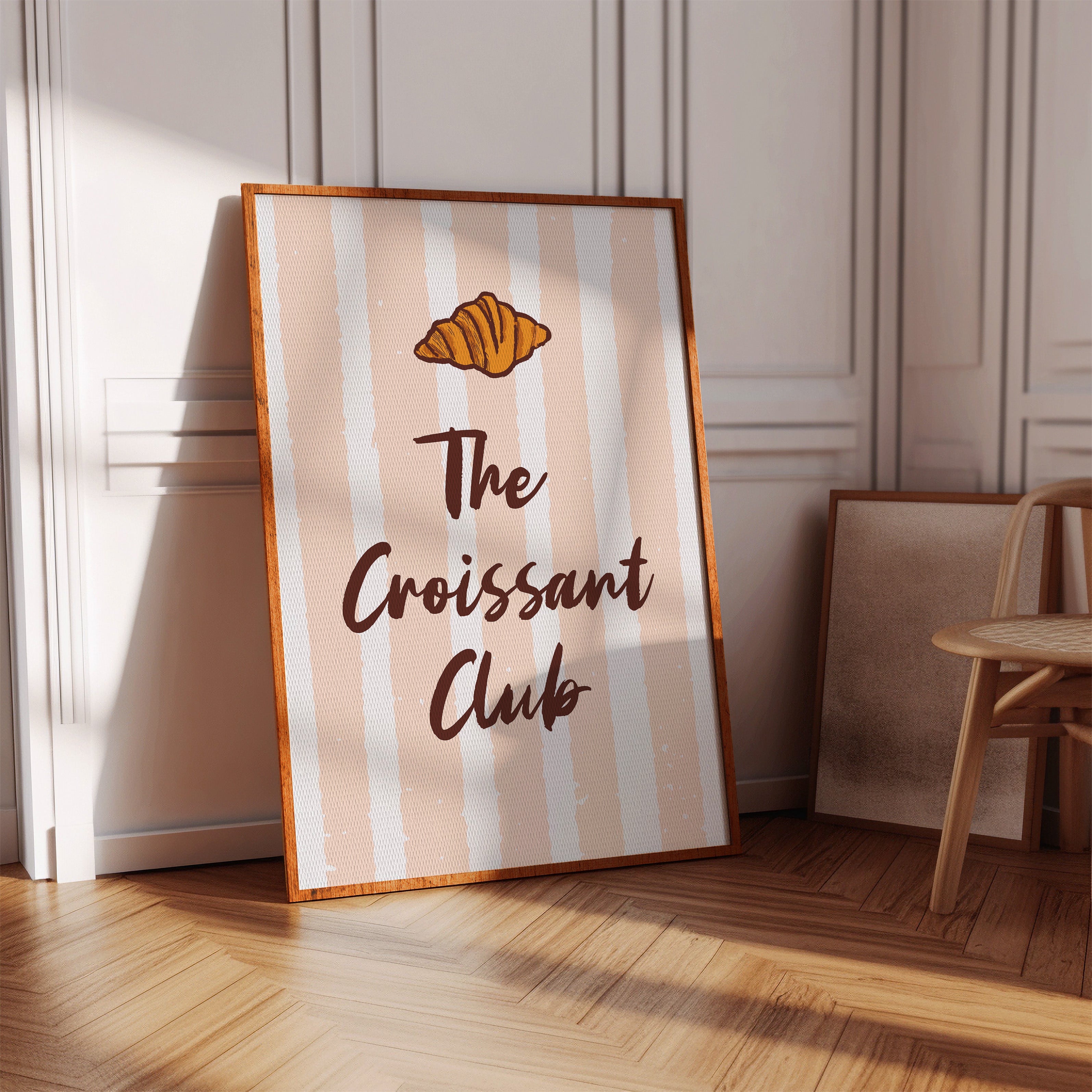 The golden curves of a perfectly baked croissant float against delicate blush stripes, promising the sweetness of dawn and possibility. This piece from our Contemporary collection marries whimsical food illustration with minimalist typography. The warm amber tones of the pastry contrast beautifully with deep chocolate lettering, while subtle texture details capture the flaky, layered essence that makes croissants irresistible. The soft peachy background creates a gentle rhythm with its vertical stripes, dotted with tiny stars like morning sunshine through cafe windows. Perfect for kitchen spaces, breakfast nooks, or any room where you want to add a touch of Parisian charm and modern sophistication. Each glance invites thoughts of lazy weekend mornings and the simple pleasure of fresh-baked happiness.