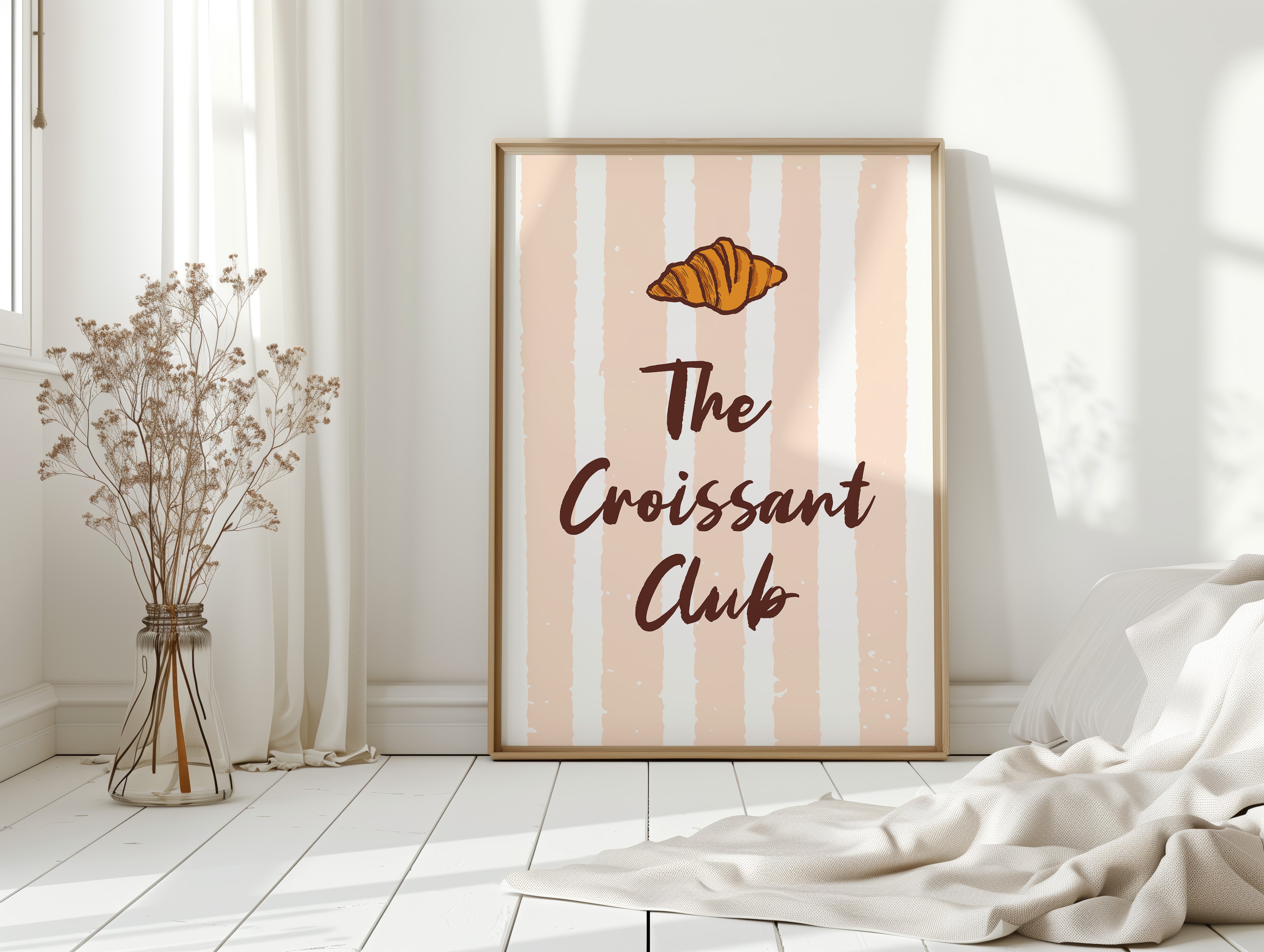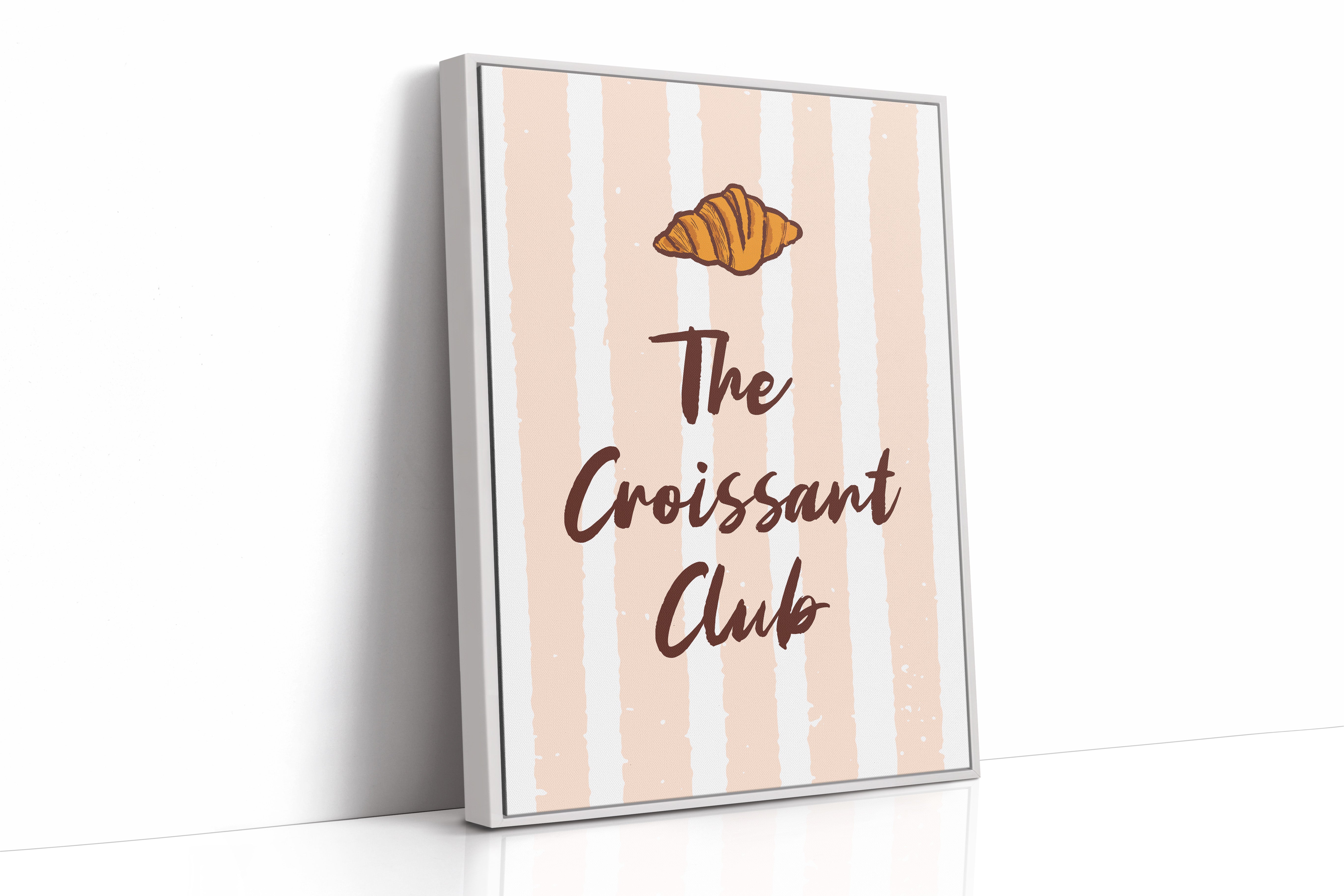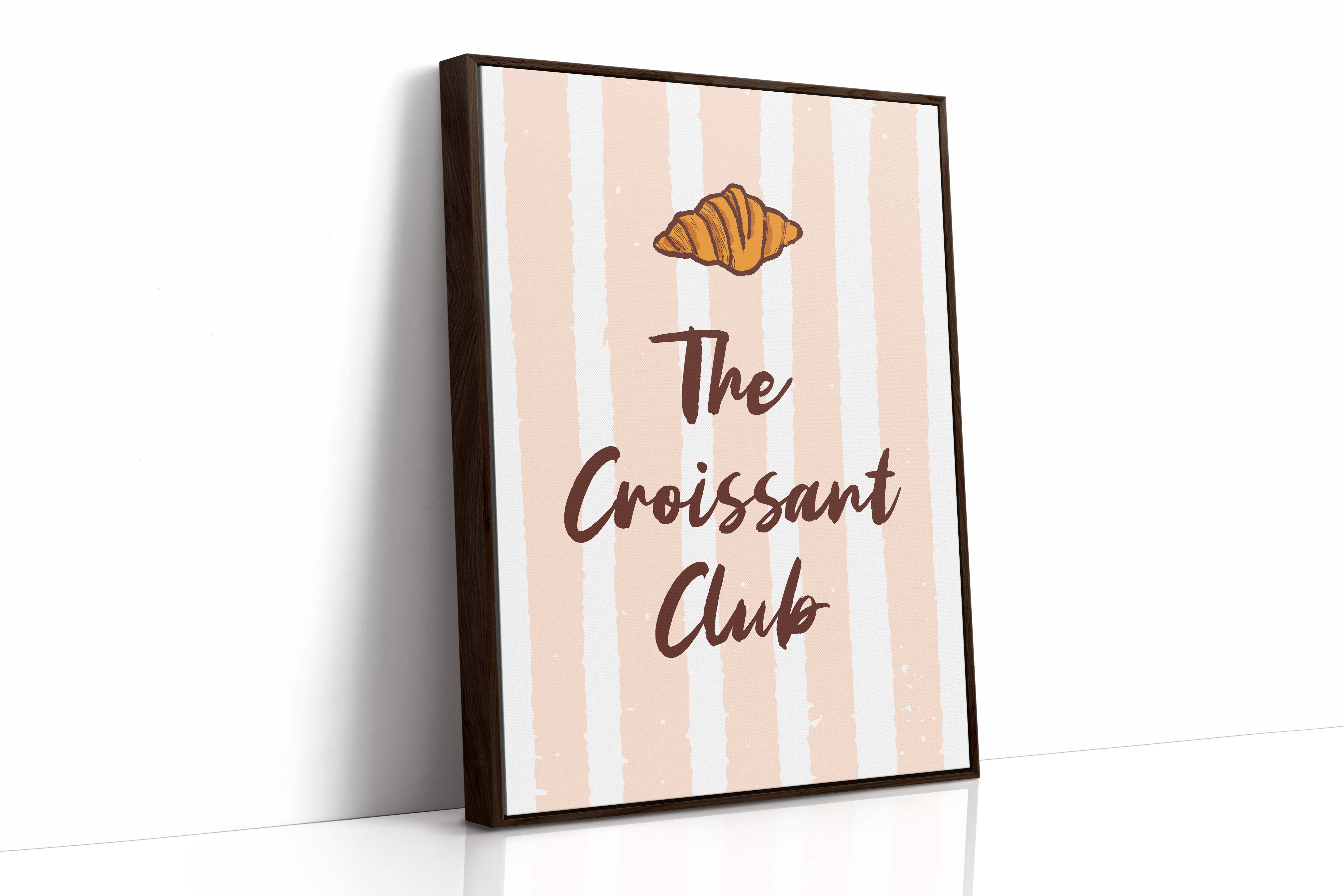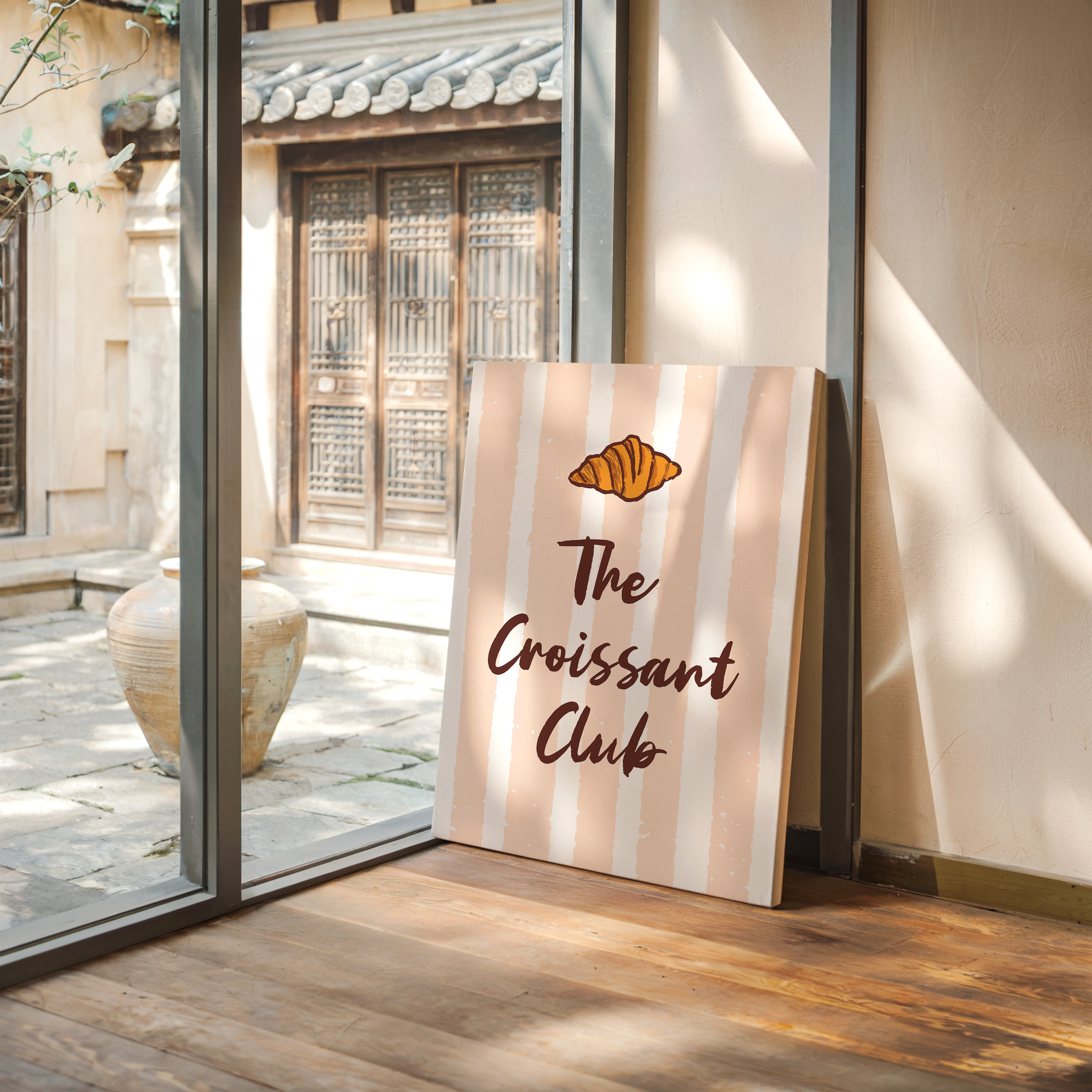 The golden curves of a perfectly baked croissant float against delicate blush stripes, promising the sweetness of dawn and possibility. This piece from our Contemporary collection marries whimsical food illustration with minimalist typography. The warm amber tones of the pastry contrast beautifully with deep chocolate lettering, while subtle texture details capture the flaky, layered essence that makes croissants irresistible. The soft peachy background creates a gentle rhythm with its vertical stripes, dotted with tiny stars like morning sunshine through cafe windows. Perfect for kitchen spaces, breakfast nooks, or any room where you want to add a touch of Parisian charm and modern sophistication. Each glance invites thoughts of lazy weekend mornings and the simple pleasure of fresh-baked happiness.