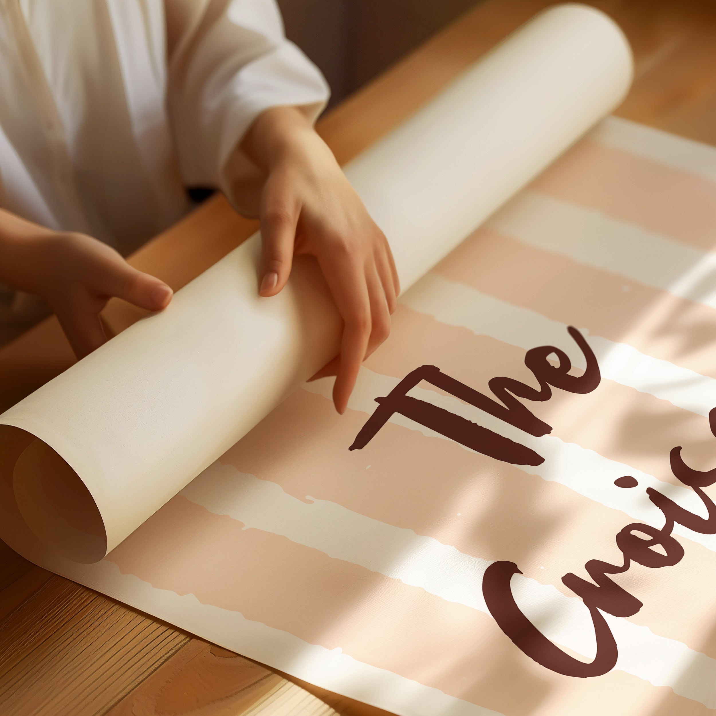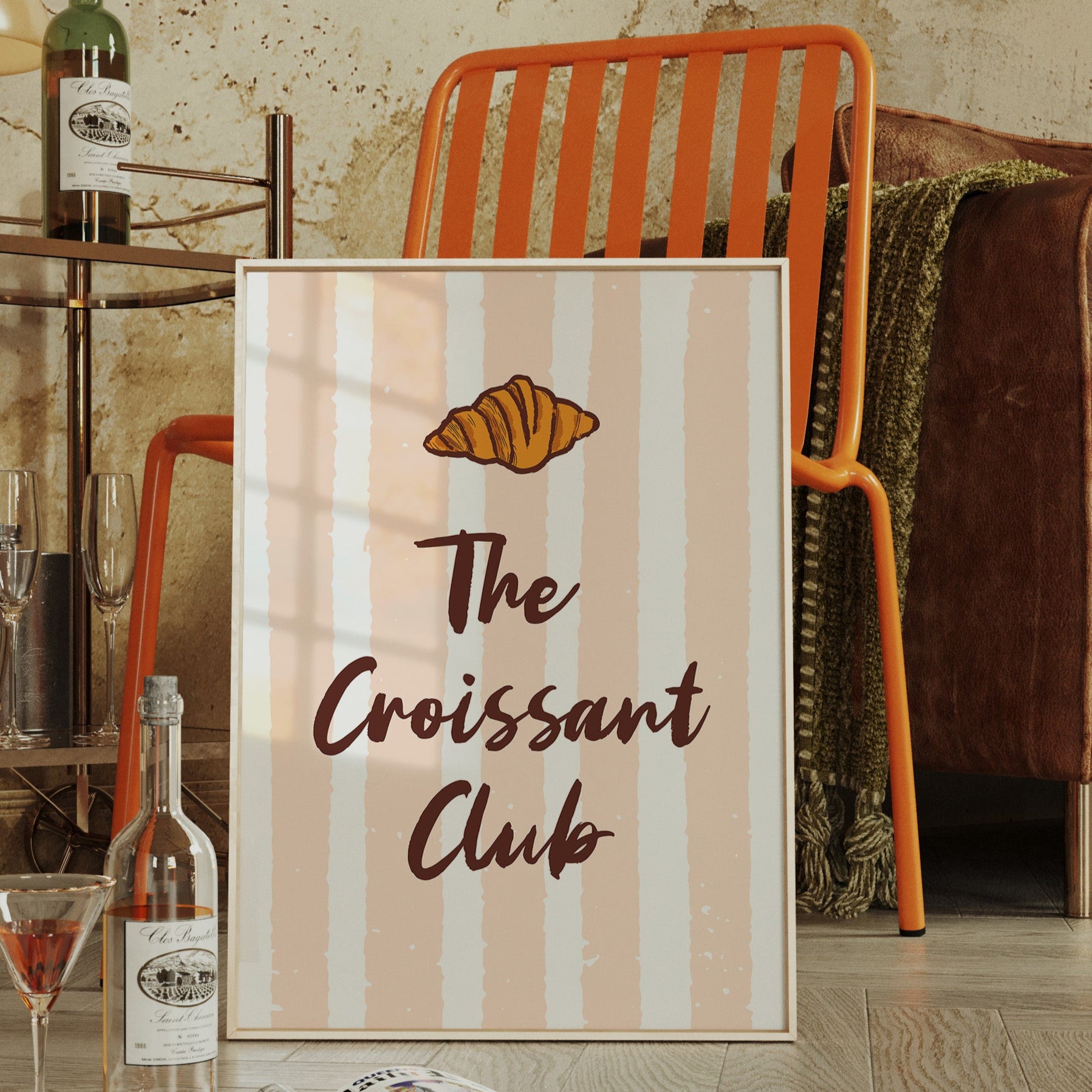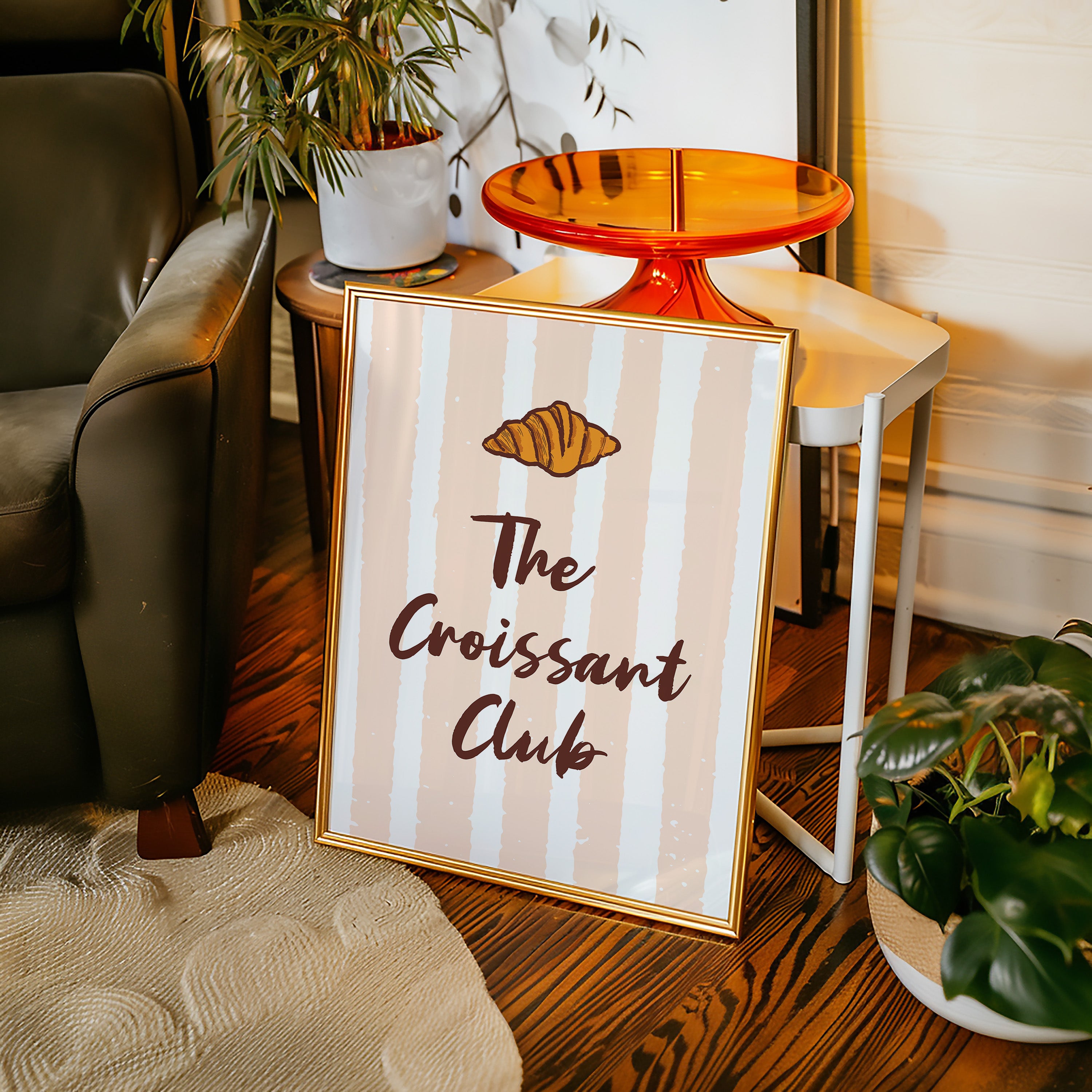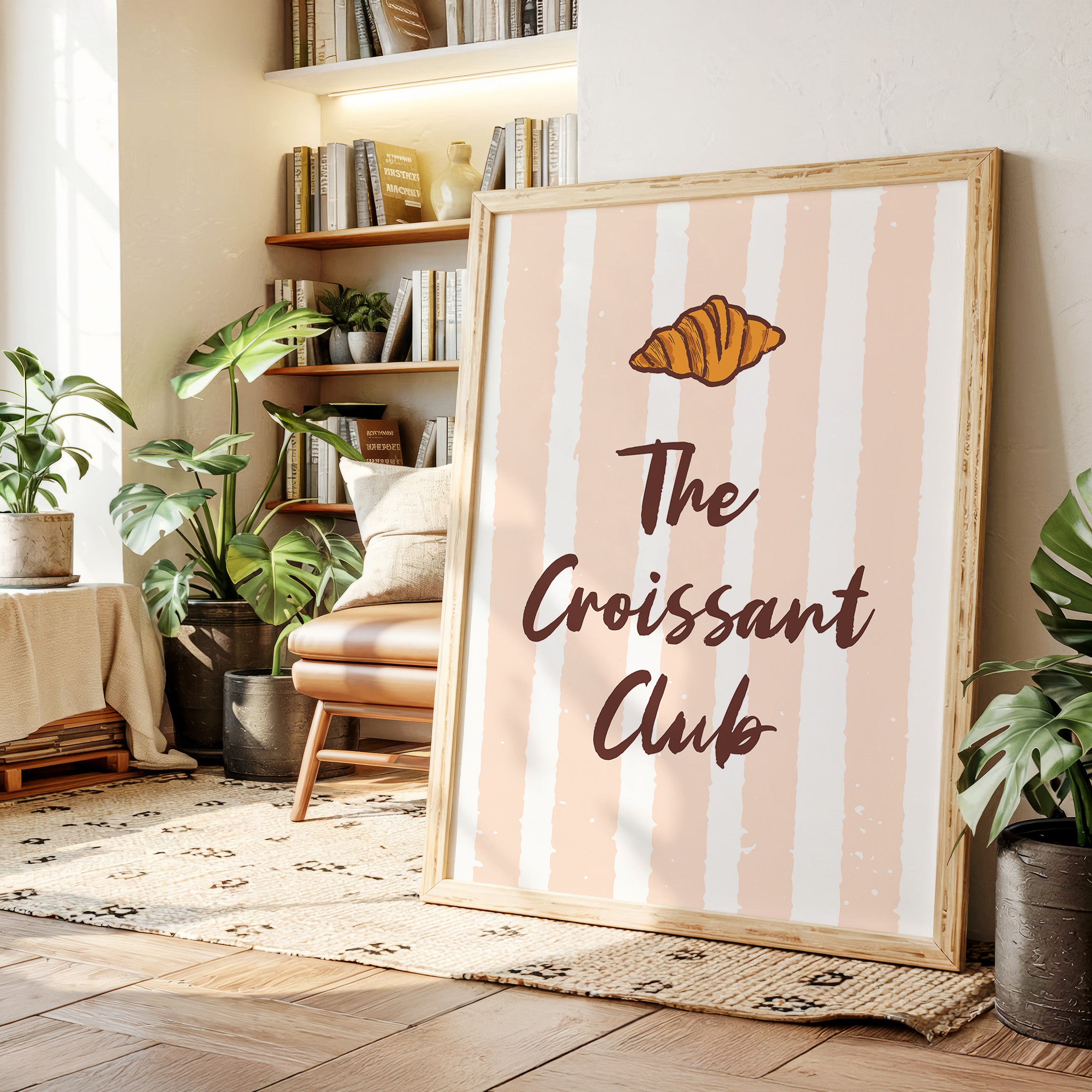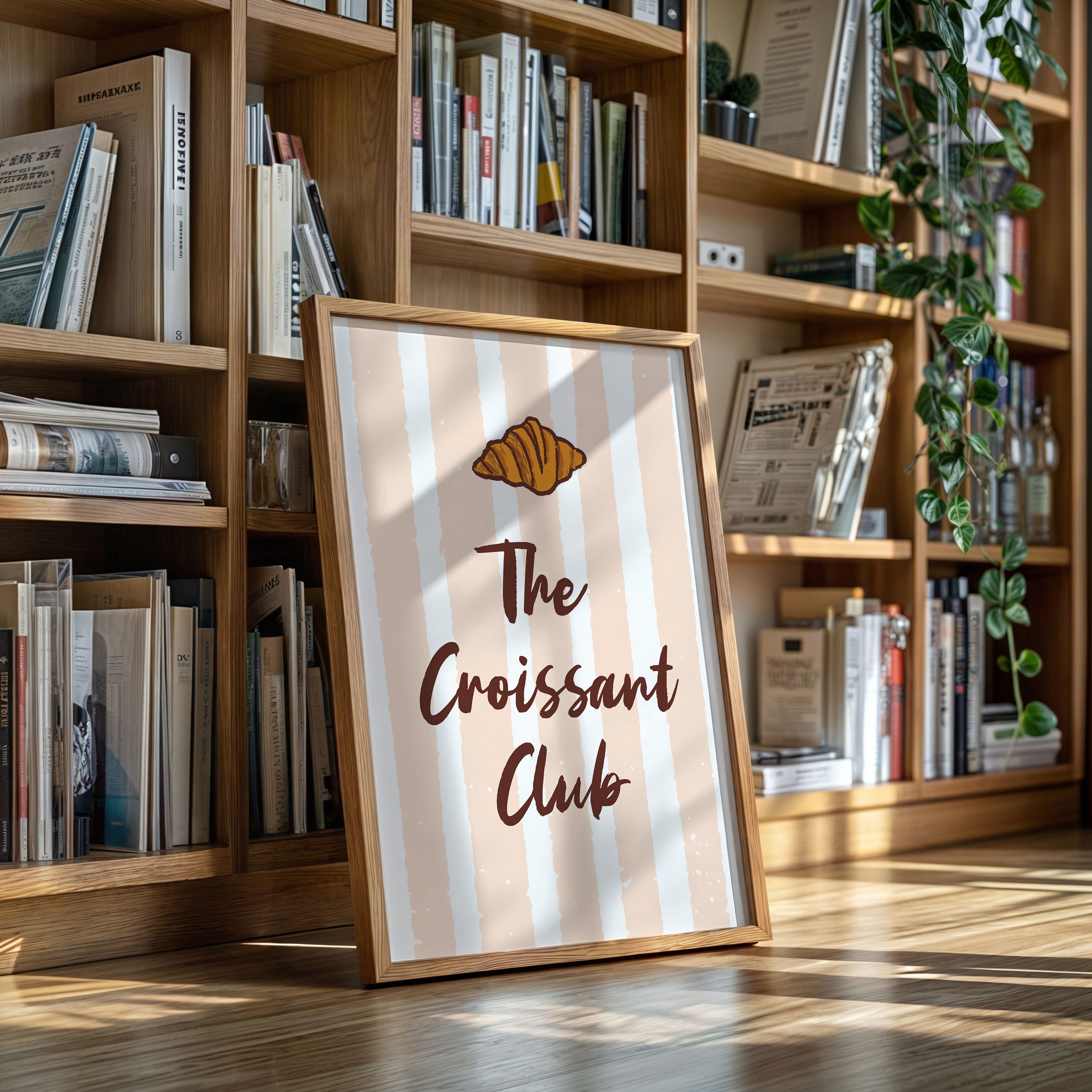 The golden curves of a perfectly baked croissant float against delicate blush stripes, promising the sweetness of dawn and possibility. This piece from our Contemporary collection marries whimsical food illustration with minimalist typography. The warm amber tones of the pastry contrast beautifully with deep chocolate lettering, while subtle texture details capture the flaky, layered essence that makes croissants irresistible. The soft peachy background creates a gentle rhythm with its vertical stripes, dotted with tiny stars like morning sunshine through cafe windows. Perfect for kitchen spaces, breakfast nooks, or any room where you want to add a touch of Parisian charm and modern sophistication. Each glance invites thoughts of lazy weekend mornings and the simple pleasure of fresh-baked happiness.