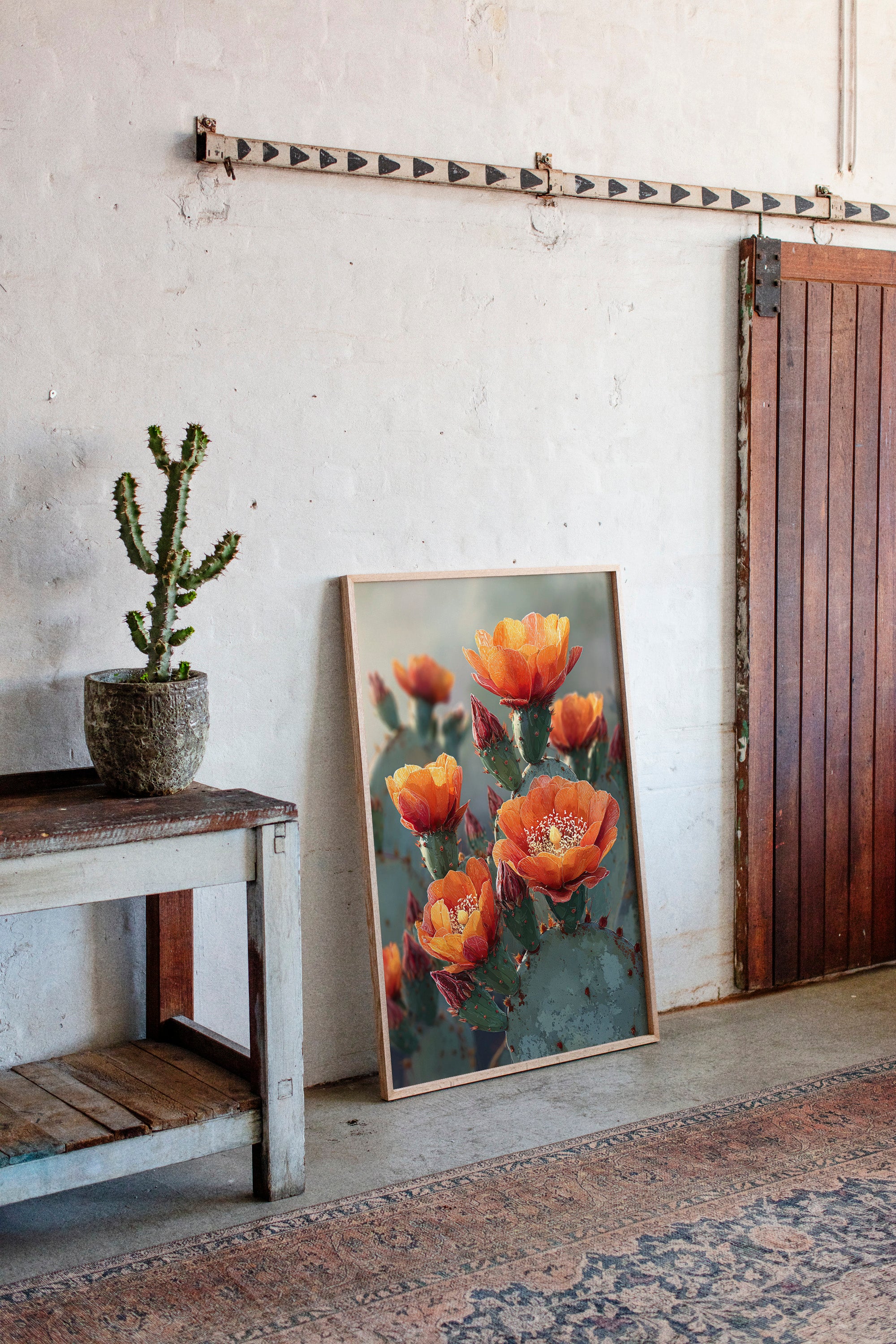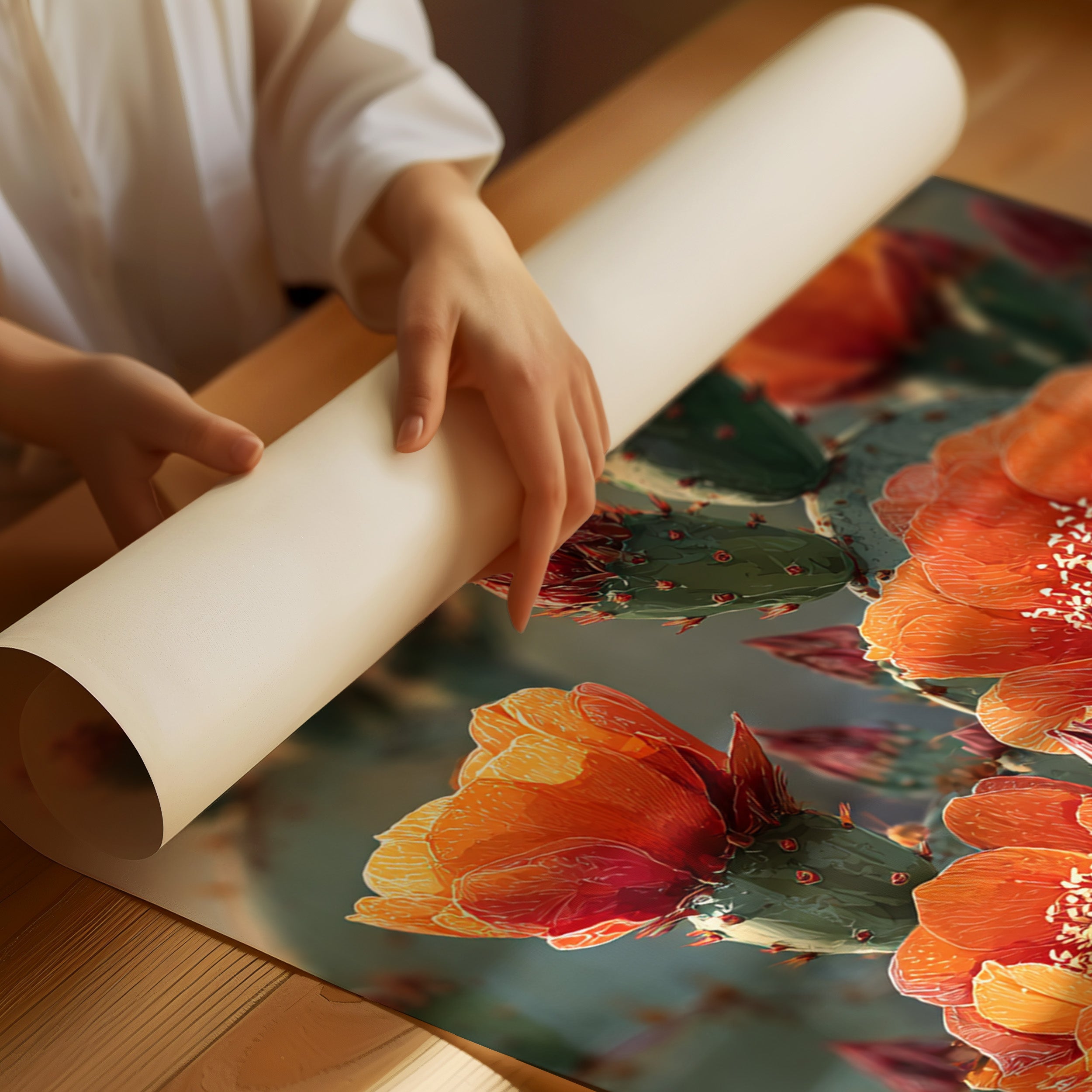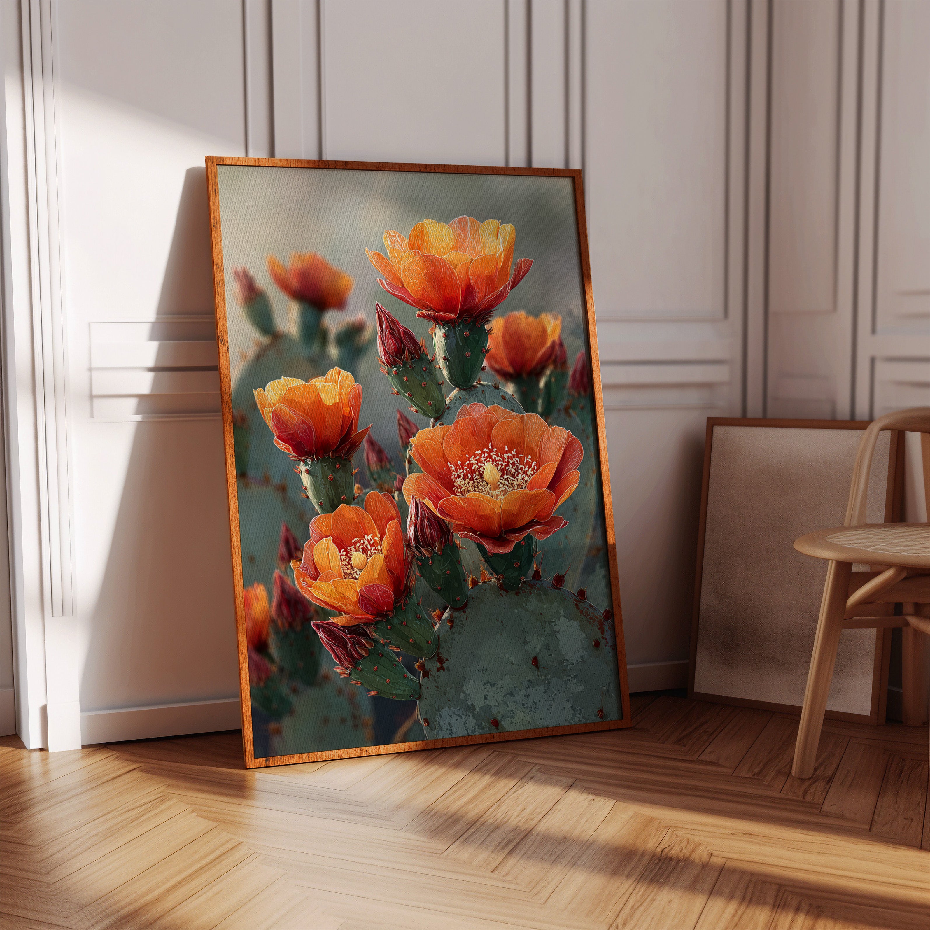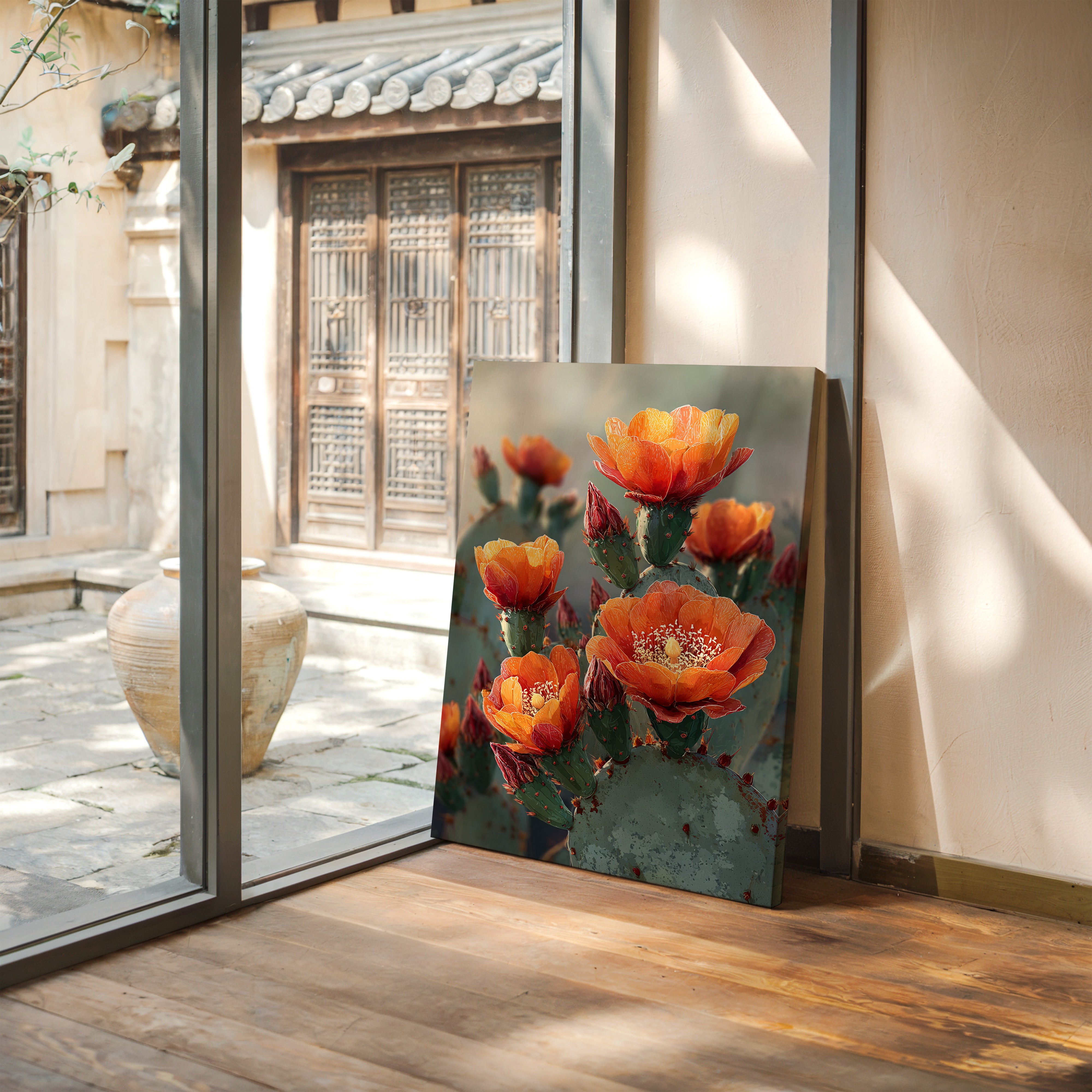 In the heart of the arid landscape, vibrant blossoms burst forth, igniting the stillness with their fiery hues. This piece embodies the artisanal spirit, celebrating nature's resilience and beauty. Each petal, intricately detailed, glimmers in shades of orange and red, inviting the viewer to marvel at the delicate balance of life in harsh environments. Picture this piece adorning a sunlit kitchen or a cozy reading nook, infusing warmth and vitality into the space.