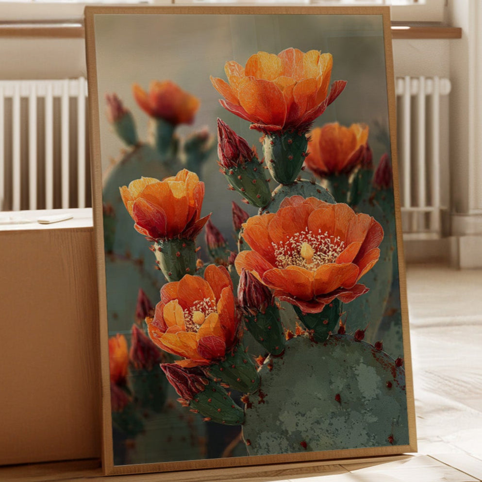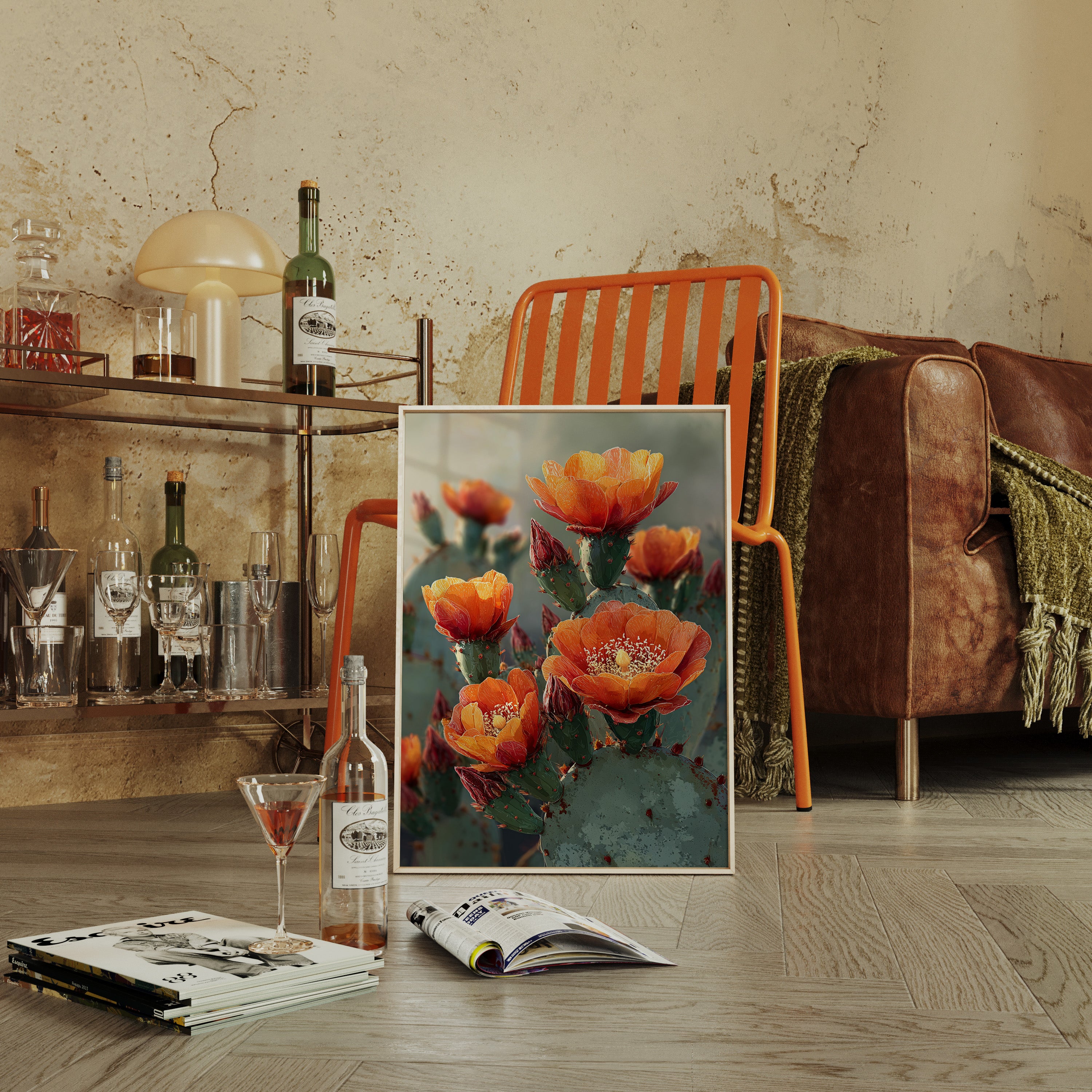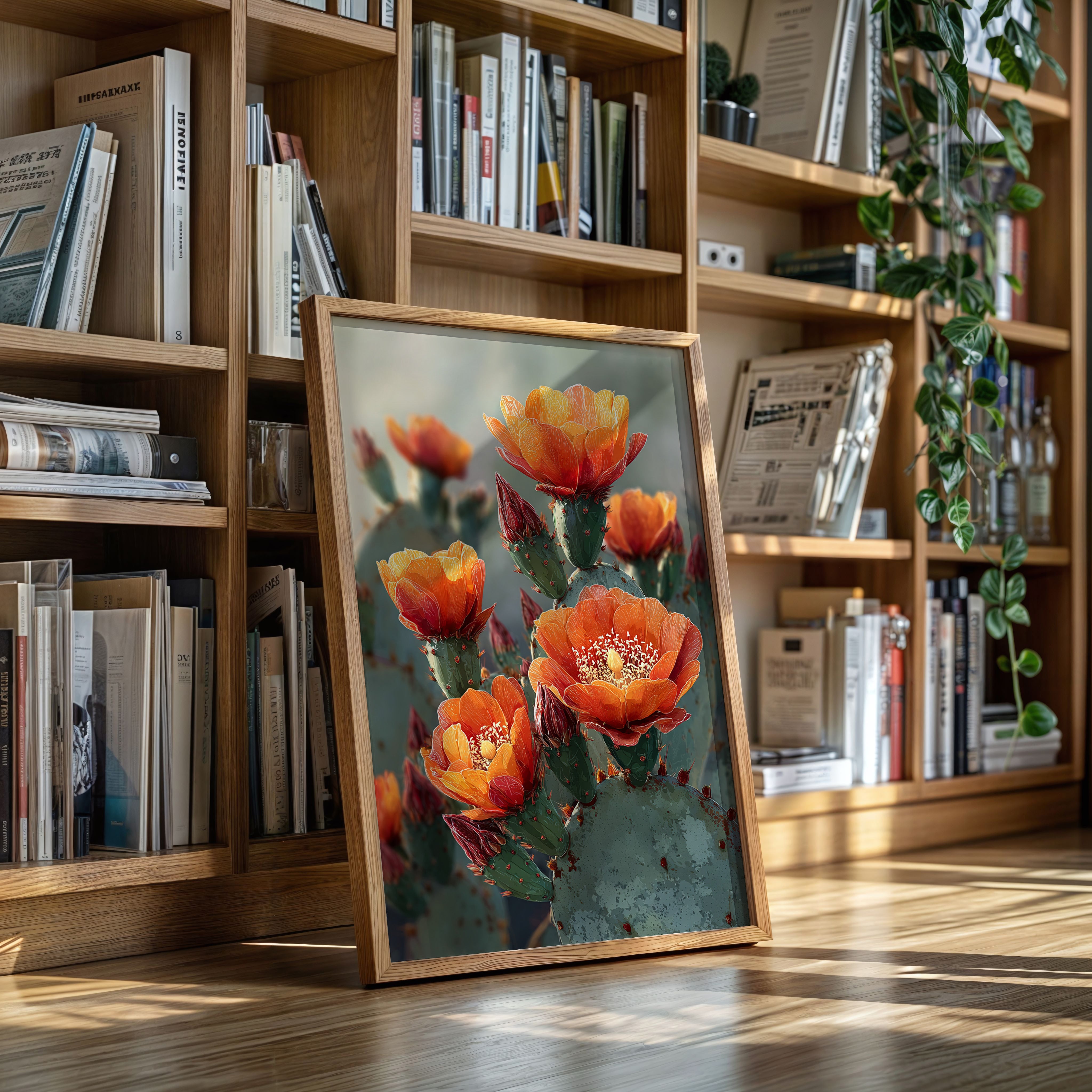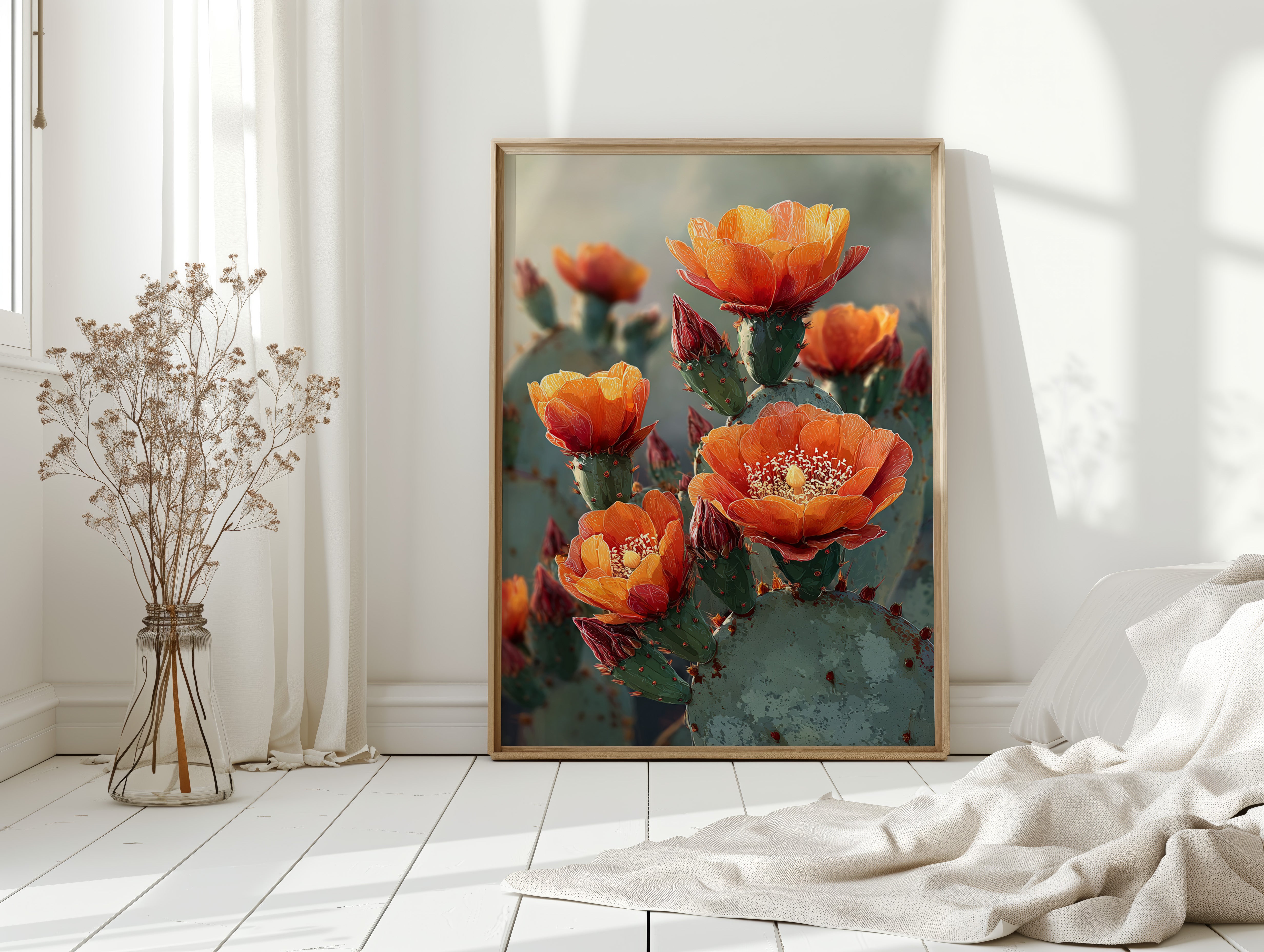 In the heart of the arid landscape, vibrant blossoms burst forth, igniting the stillness with their fiery hues. This piece embodies the artisanal spirit, celebrating nature's resilience and beauty. Each petal, intricately detailed, glimmers in shades of orange and red, inviting the viewer to marvel at the delicate balance of life in harsh environments. Picture this piece adorning a sunlit kitchen or a cozy reading nook, infusing warmth and vitality into the space.