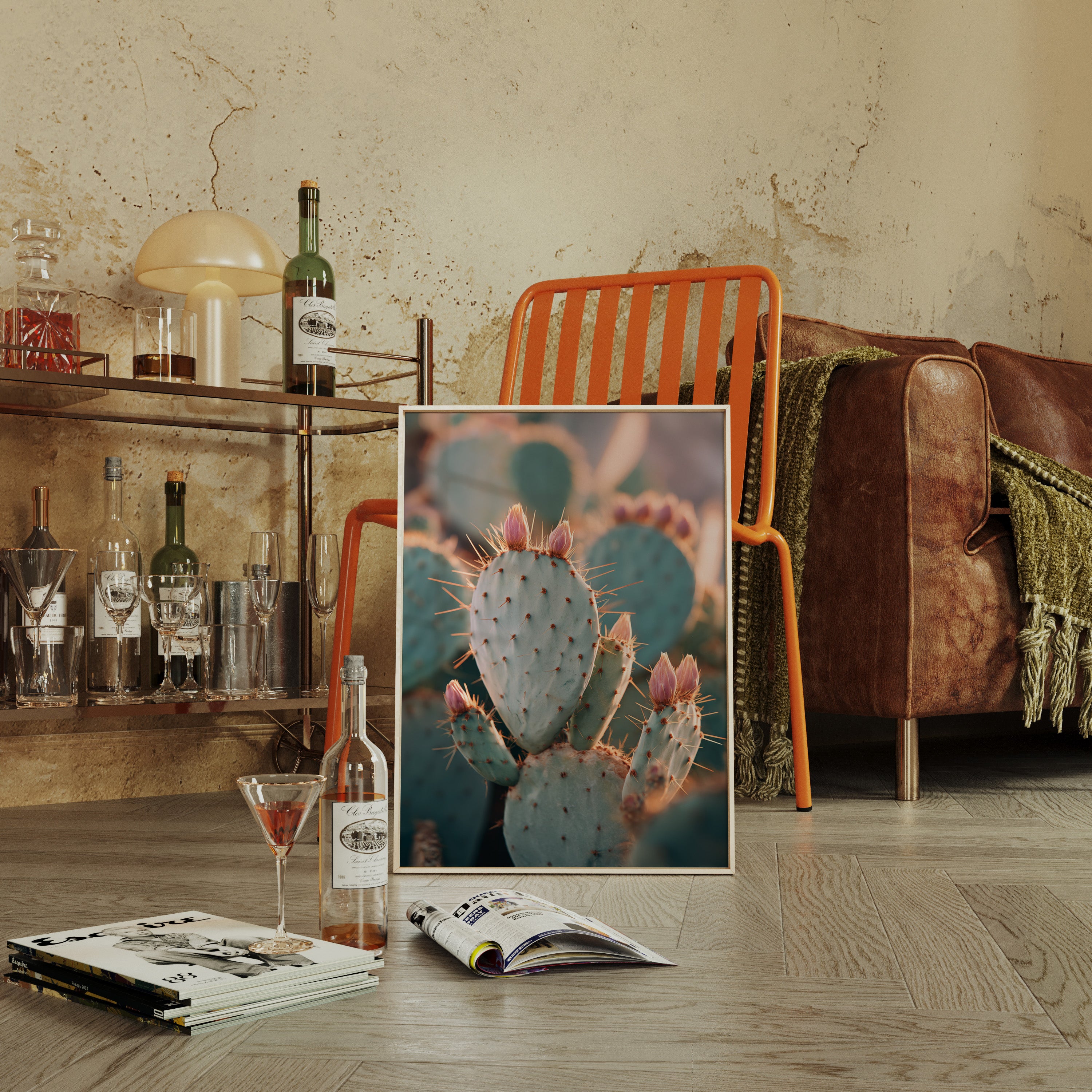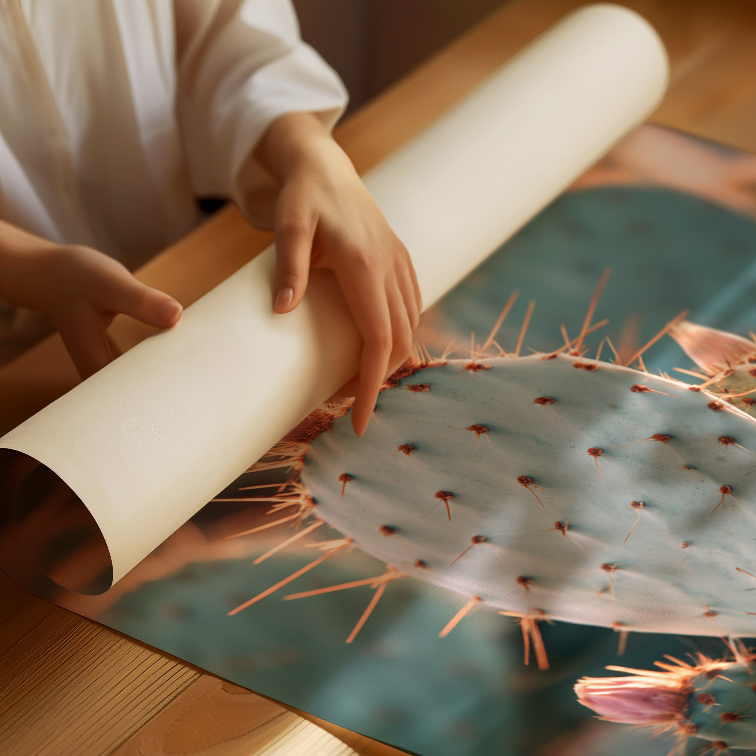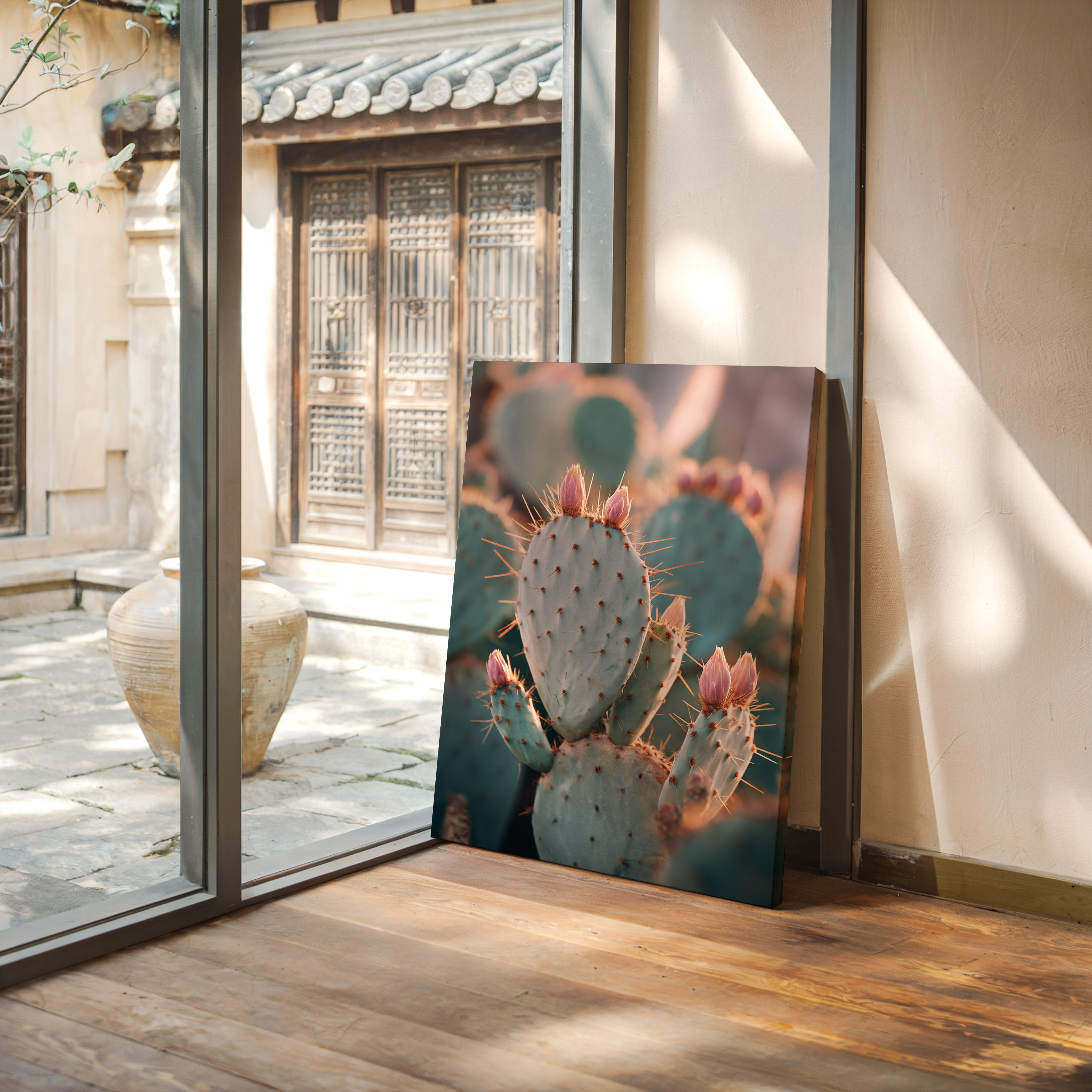 This piece captures the delicate bloom of a cactus, juxtaposed against its tough exterior, highlighting nature's remarkable ability to flourish in harsh conditions. The soft pastels and intricate details invite viewers to explore the subtle beauty in every thorn and petal.