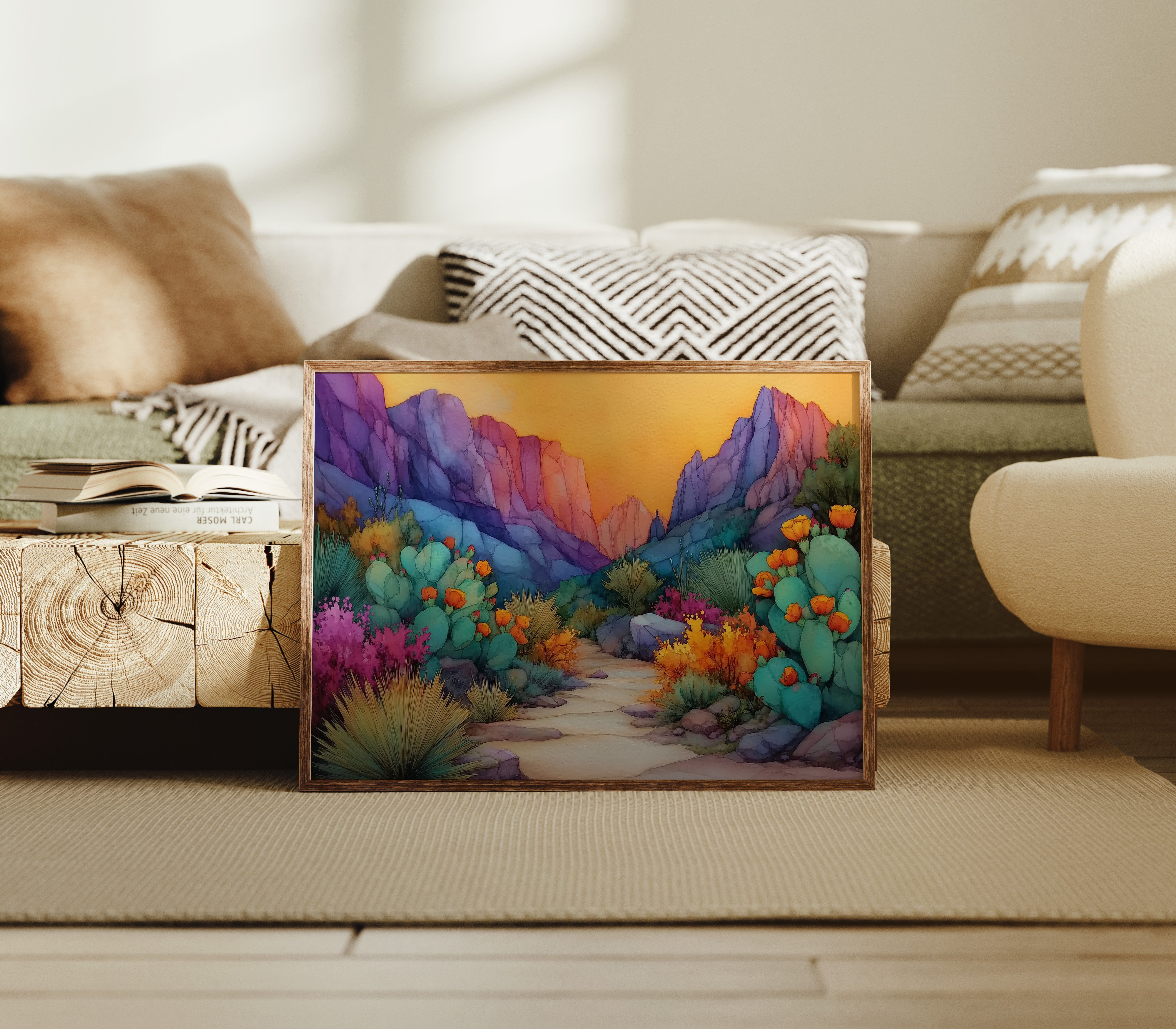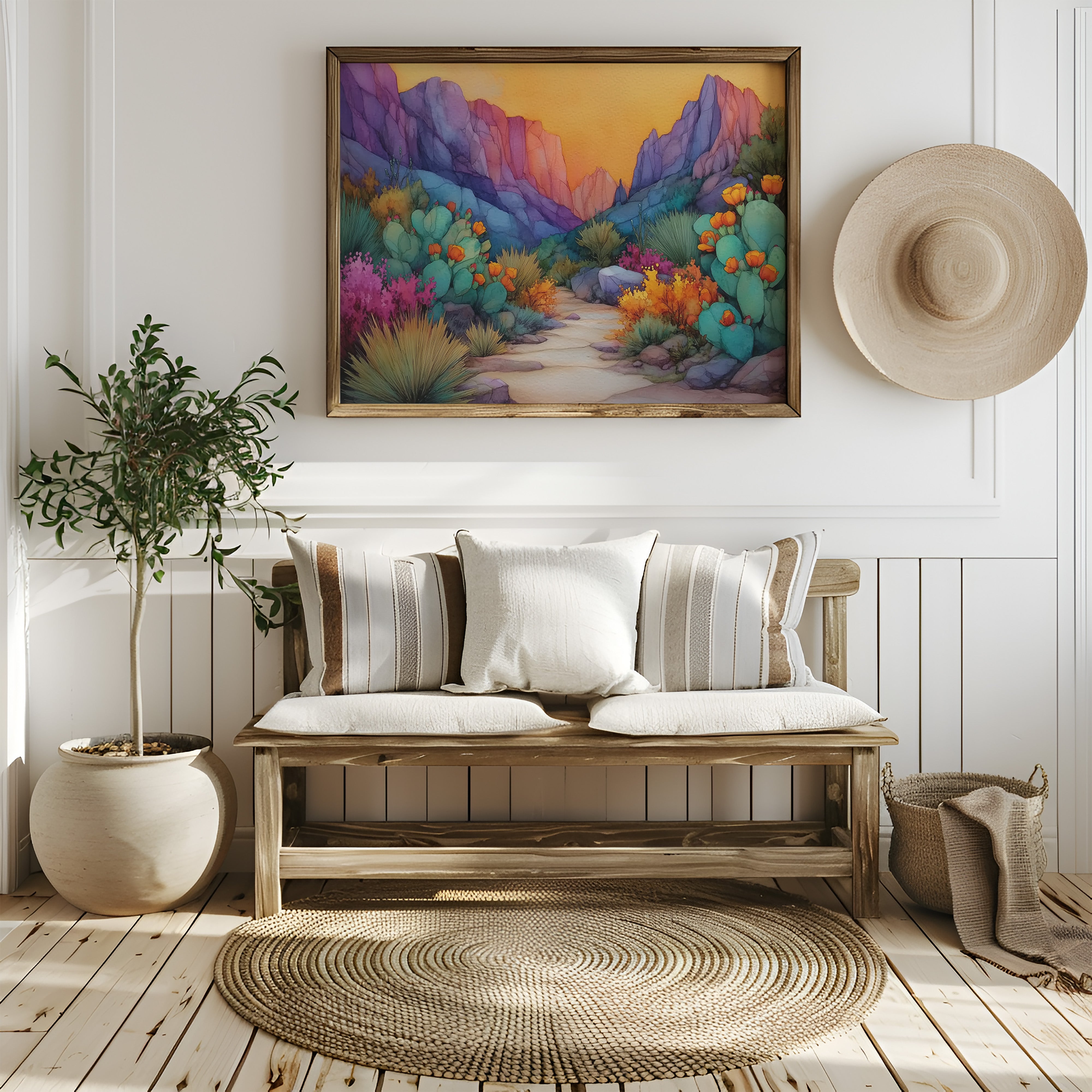 A winding path leads through a vibrant desert garden where prickly pear cacti burst with golden blooms against purple mountain peaks. This contemporary watercolor captures the magical intersection of rugged landscape and delicate desert flora. The scene unfolds in layers of color - from the soft orange sunset sky to the deep purple canyons, while mint-green cacti and magenta wildflowers create a lush foreground tapestry. Desert grasses catch the last rays of sunlight, their golden tips swaying against the ethereal backdrop. This piece brings southwestern serenity to living spaces, perfect for creating a focal point in modern homes where nature-inspired art elevates the everyday.