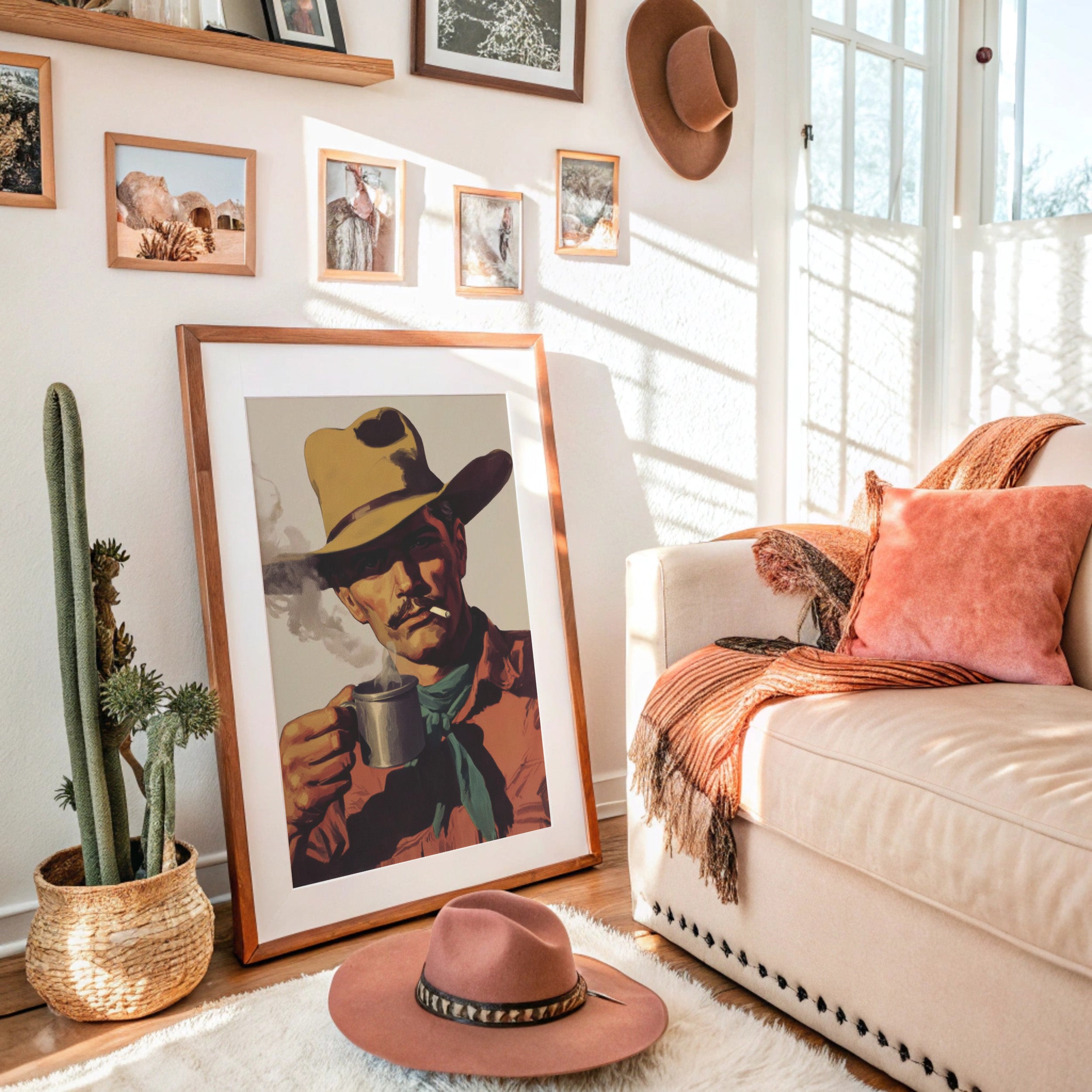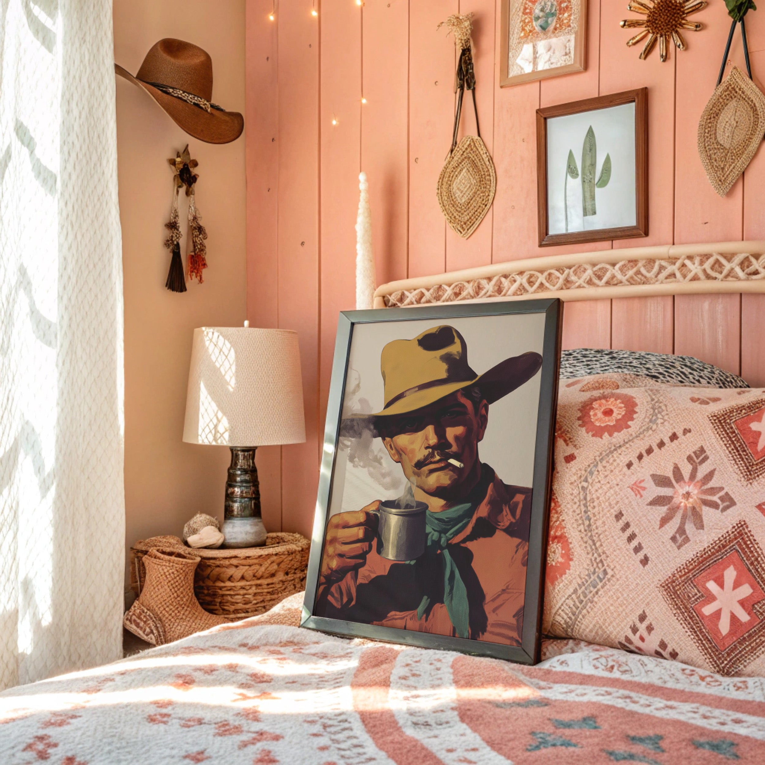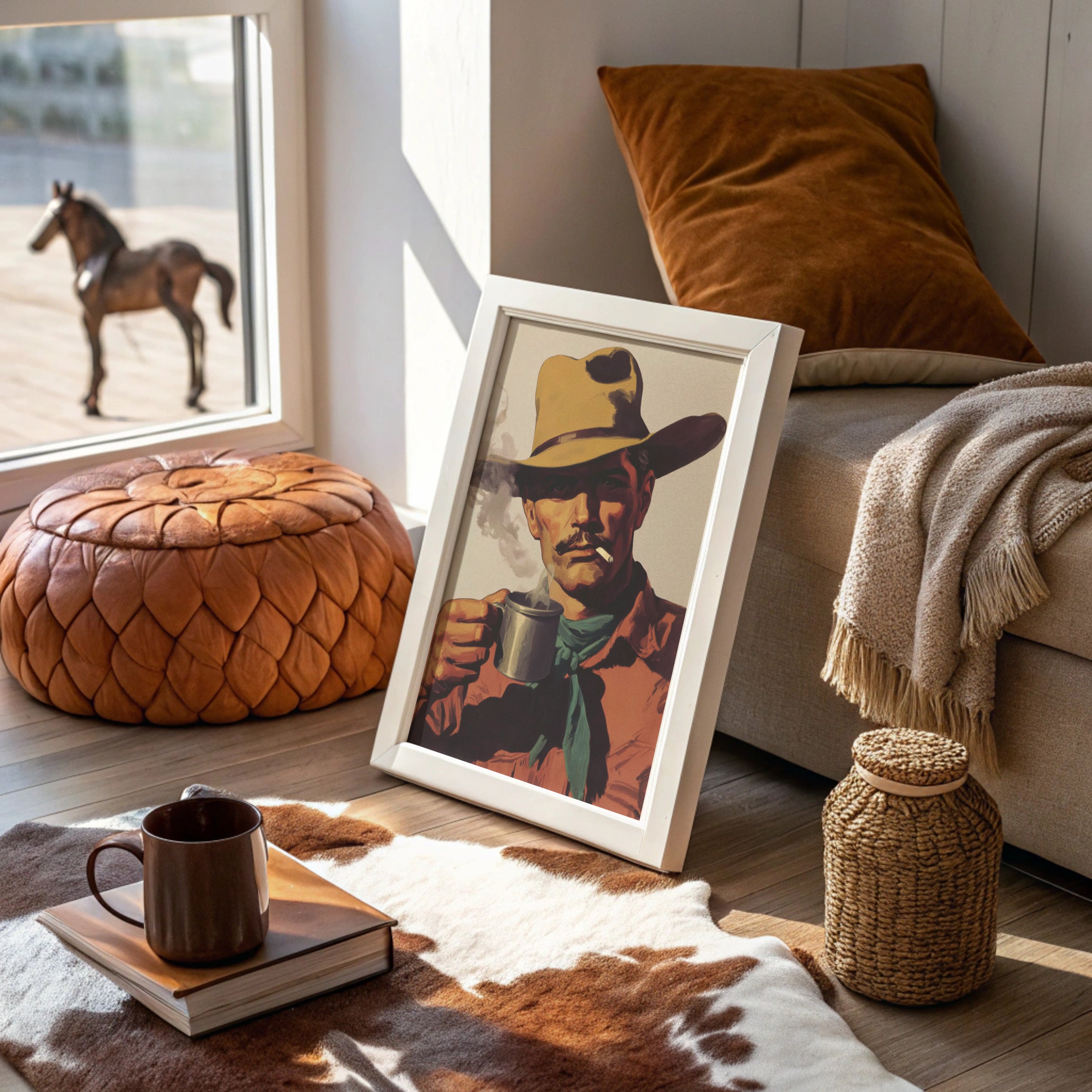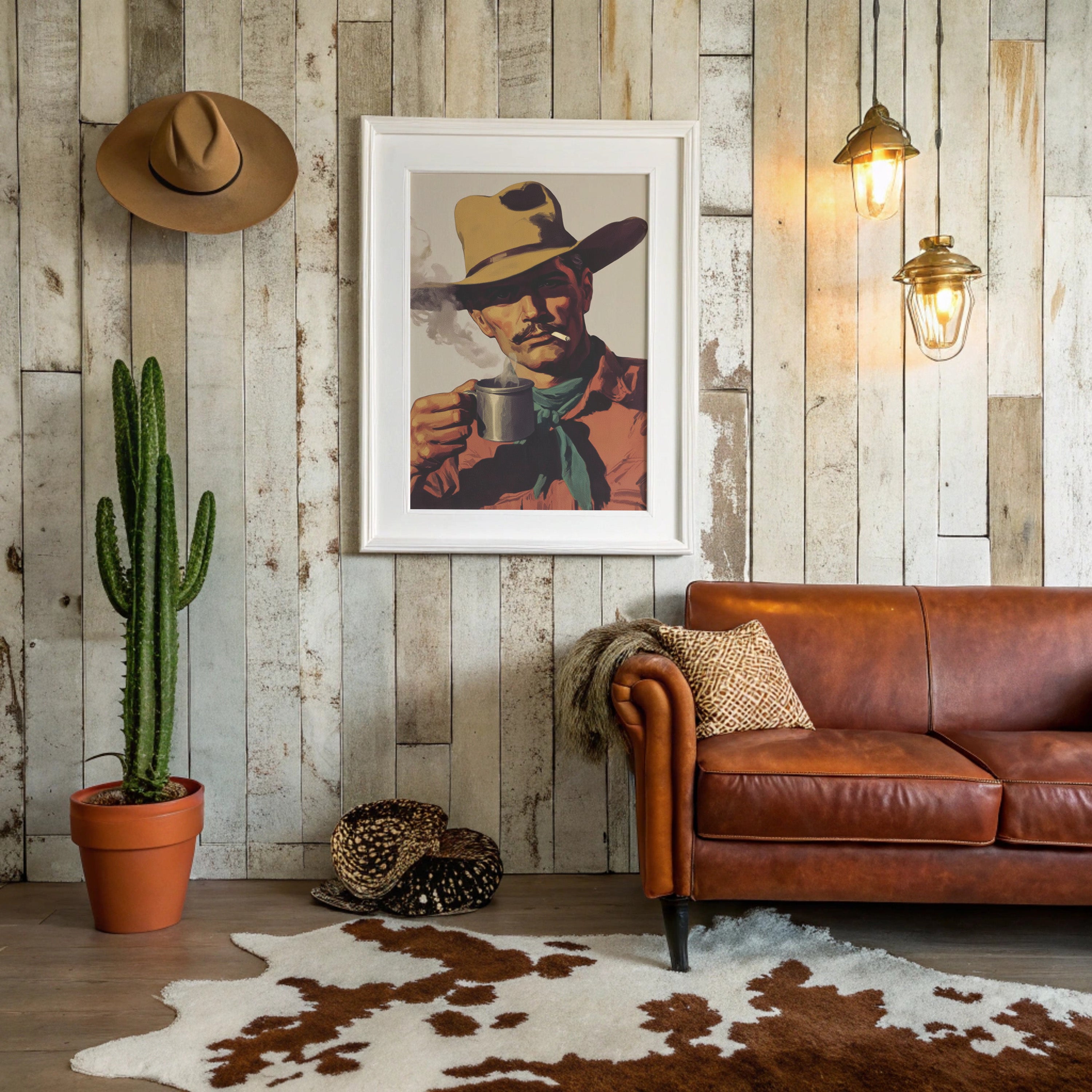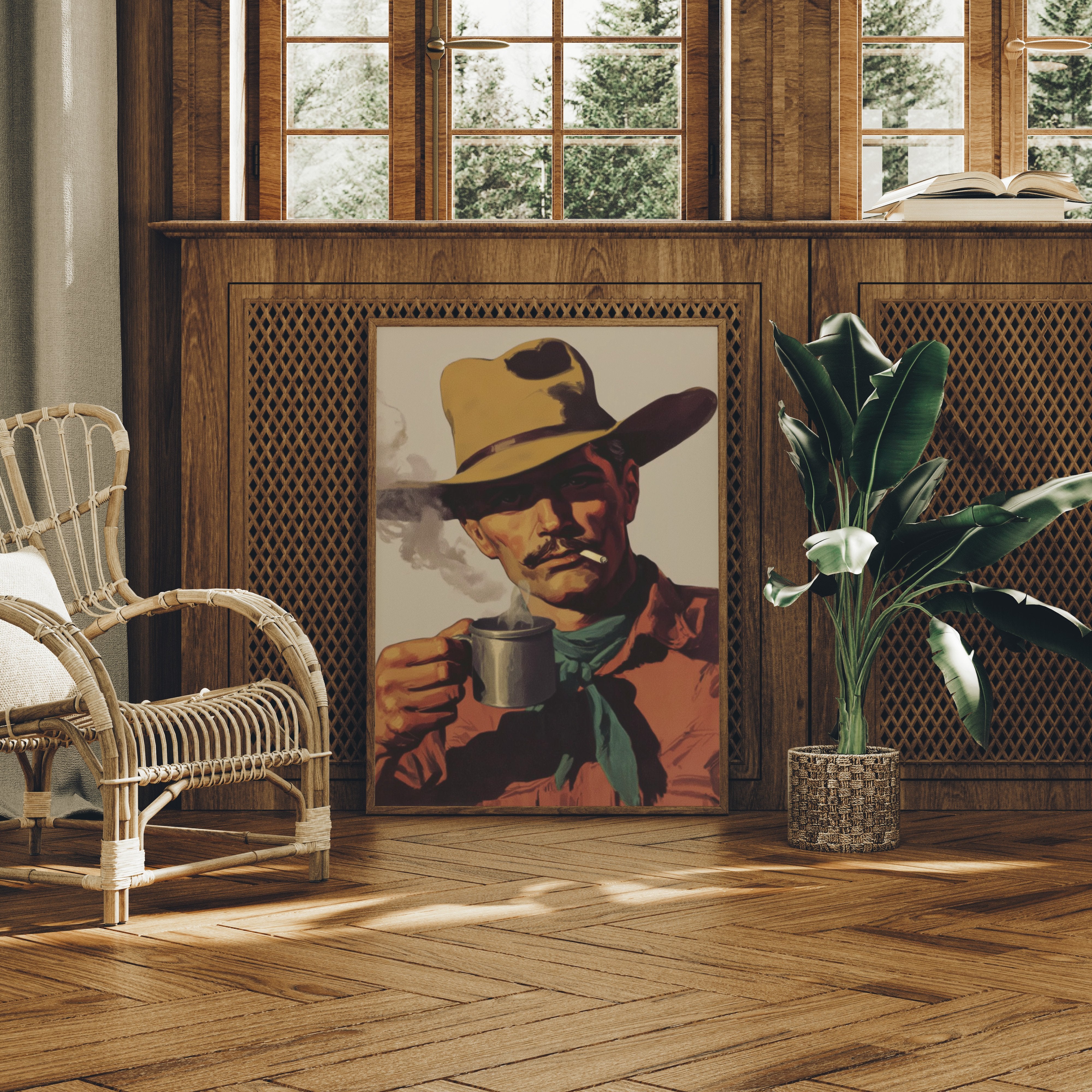 Steam rises like memories against the dawn sky, curling from a tin cup held by weathered hands. This striking contemporary piece captures the essence of American frontier spirit. Rich earth tones and bold brushstrokes bring to life a moment of contemplation - where coffee meets cigarette smoke and the day's first light catches the brim of a well-worn hat. The interplay of warm amber, deep shadows, and that splash of turquoise bandana creates a portrait of rugged independence and quiet strength. Perfect for adding a touch of classic Americana to a study, den, or anywhere you want to evoke the spirit of adventure and solitude.
