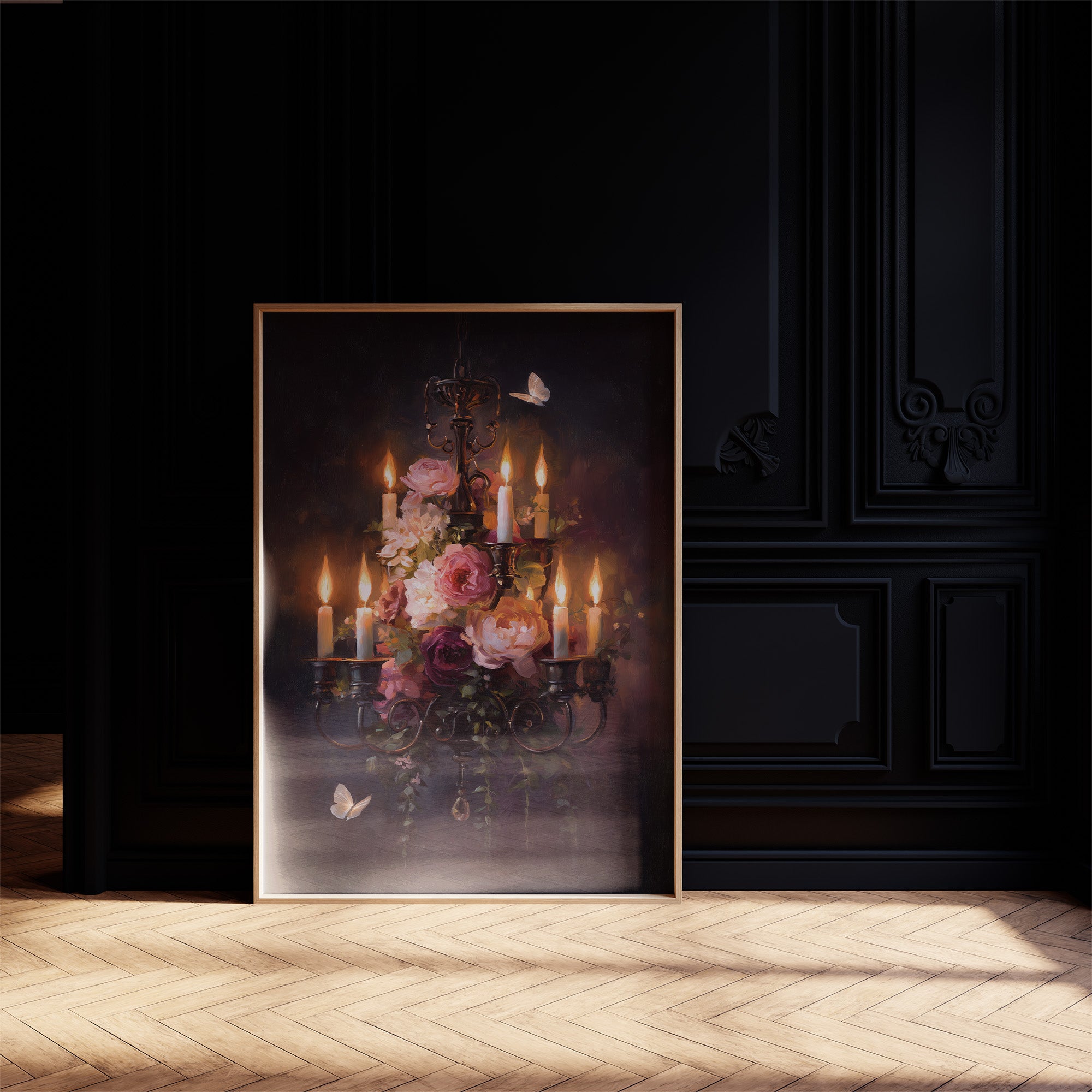 Flames dance delicately against darkness, illuminating soft petals in their golden glow. The ornate candelabra cradles both fire and flora in perfect harmony, with roses in blush and burgundy nestled between tapered candles. White butterflies hover near the arrangement, drawn to the warmth and beauty like silent witnesses to this moment suspended between opulence and tranquility.