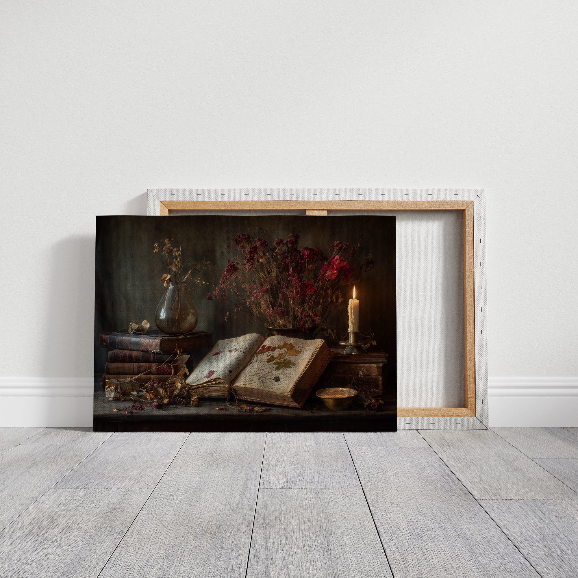 Time stands still in this intimate corner where knowledge and beauty converge. A gilded frame captures the quiet drama of an open botanical journal, its pages adorned with pressed autumn leaves, illuminated by the gentle flicker of a solitary candle. Rich burgundy dried flowers spill from their vessel beside weathered book spines and delicate glass containers, all set against a backdrop of moody darkness that heightens the scene's contemplative warmth. This piece brings scholarly elegance to a home library, reading nook, or study where thoughtful conversations unfold over cups of tea.