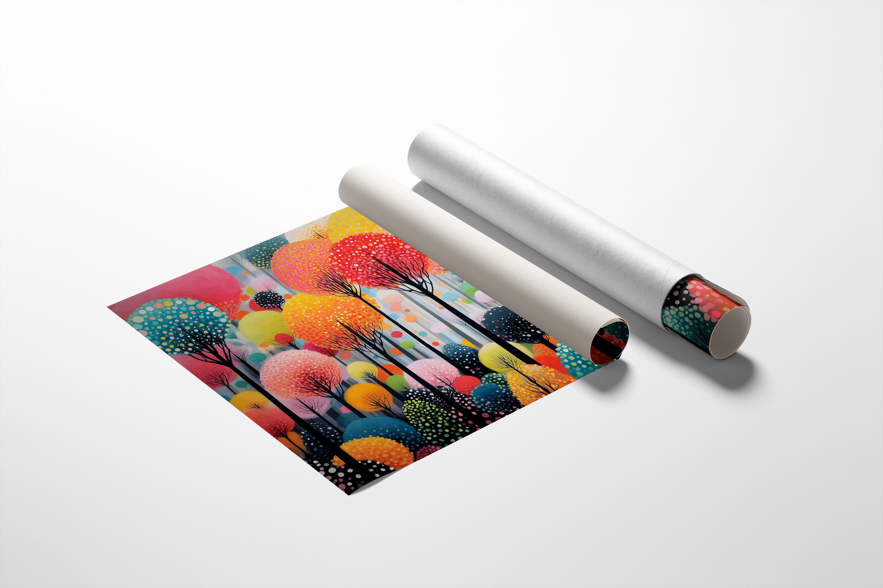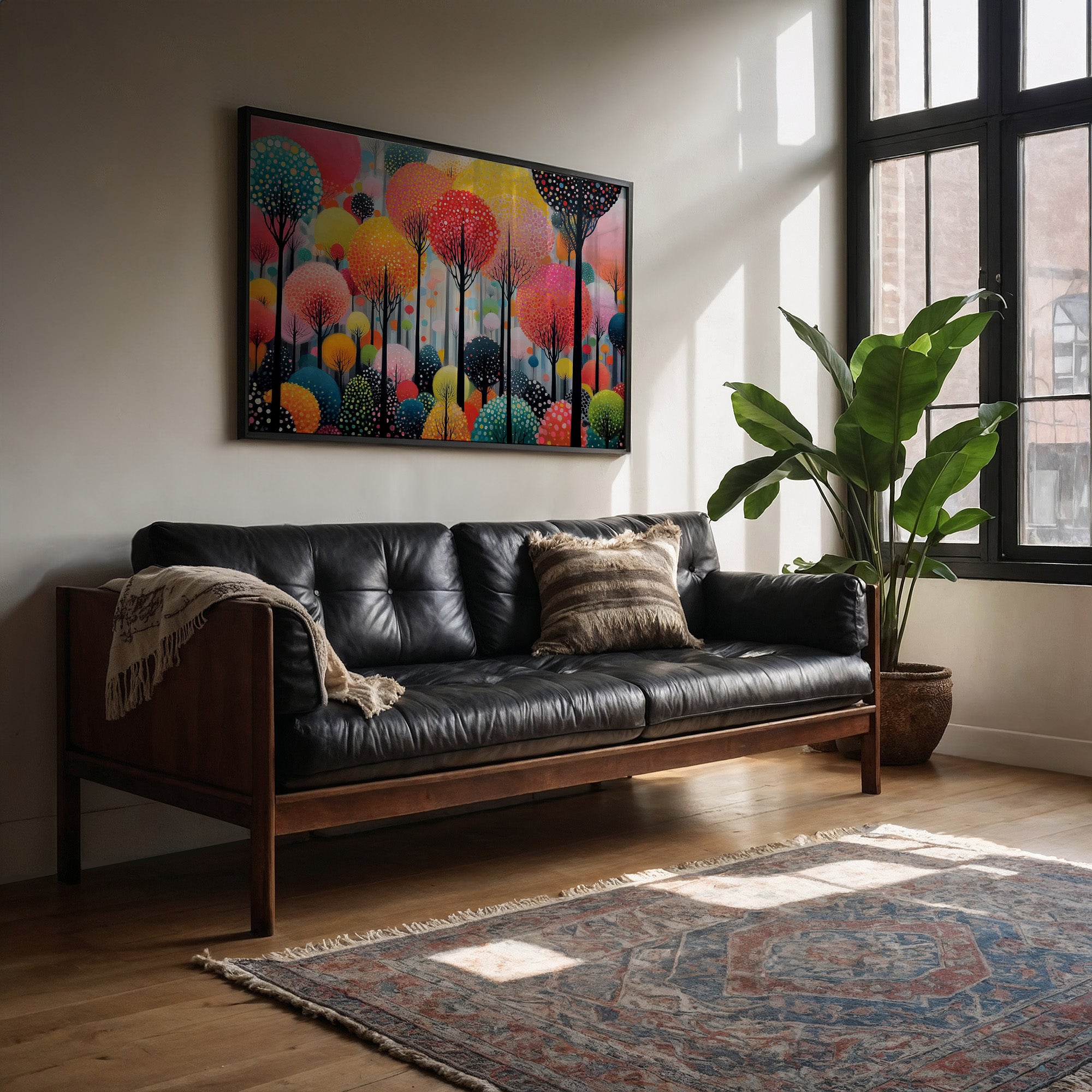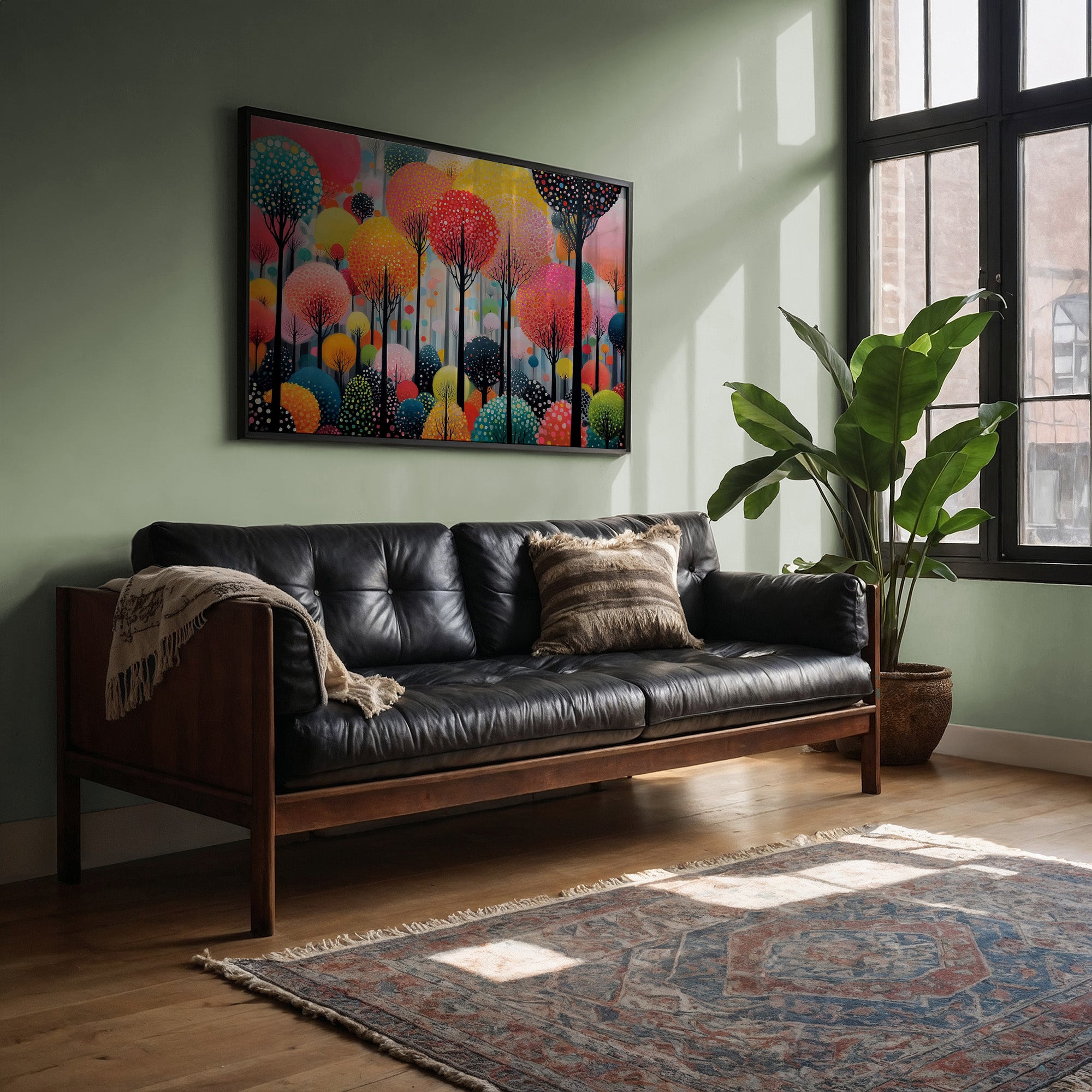 Golden afternoon light streams across a corduroy couch, casting delicate plant shadows that dance along cream walls. A whimsical forest scene bursts with vibrant coral, turquoise, and sunshine yellow hues, each tree crown dotted with starlike spots that create a magical woodland rhythm. The contemporary illustration transforms familiar forest elements into a candy-colored dreamscape, where reality and fantasy merge in a celebration of color and pattern. This piece would bring a perfect pop of joy to a reading nook, child's room, or any space seeking a touch of enchanted optimism.
