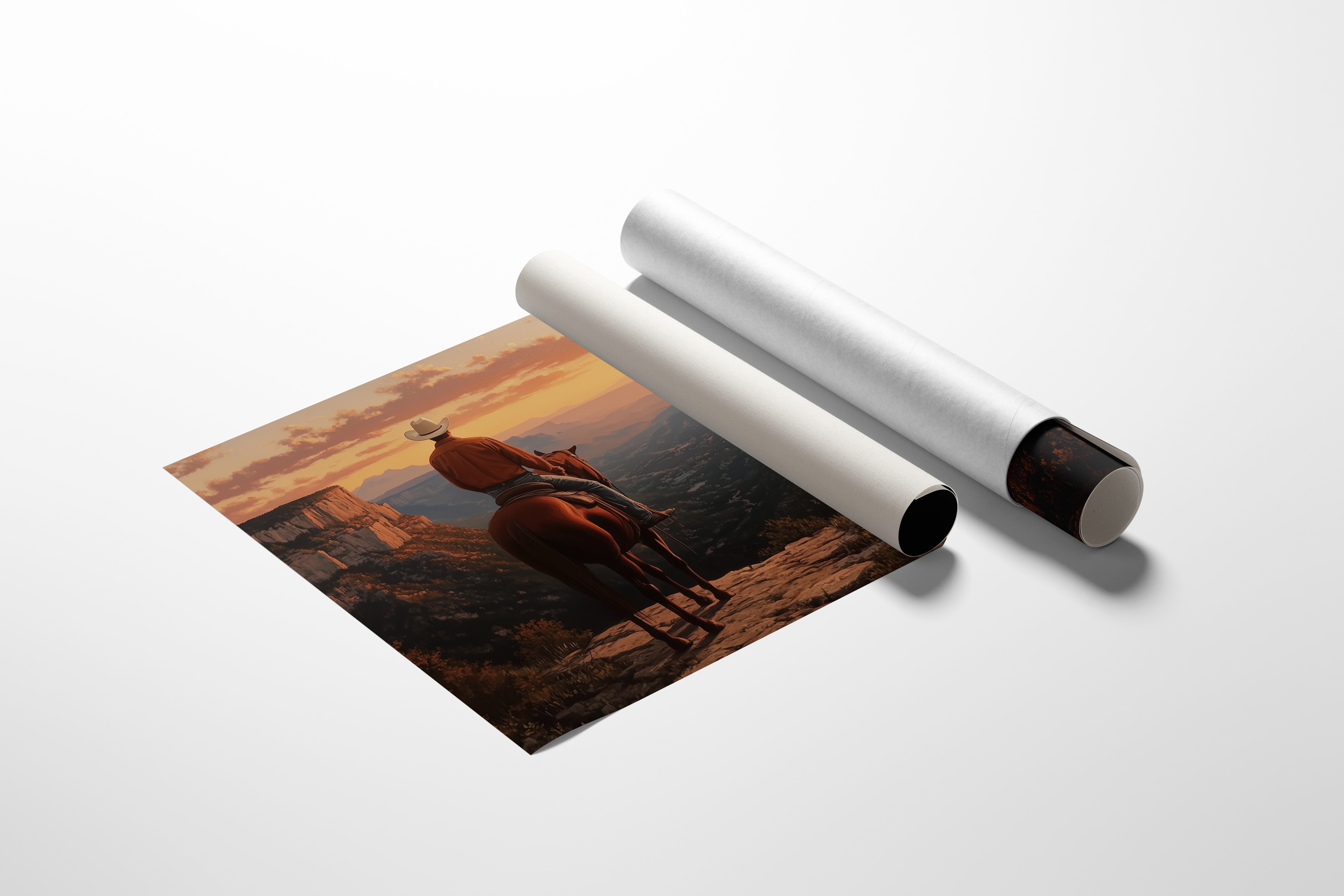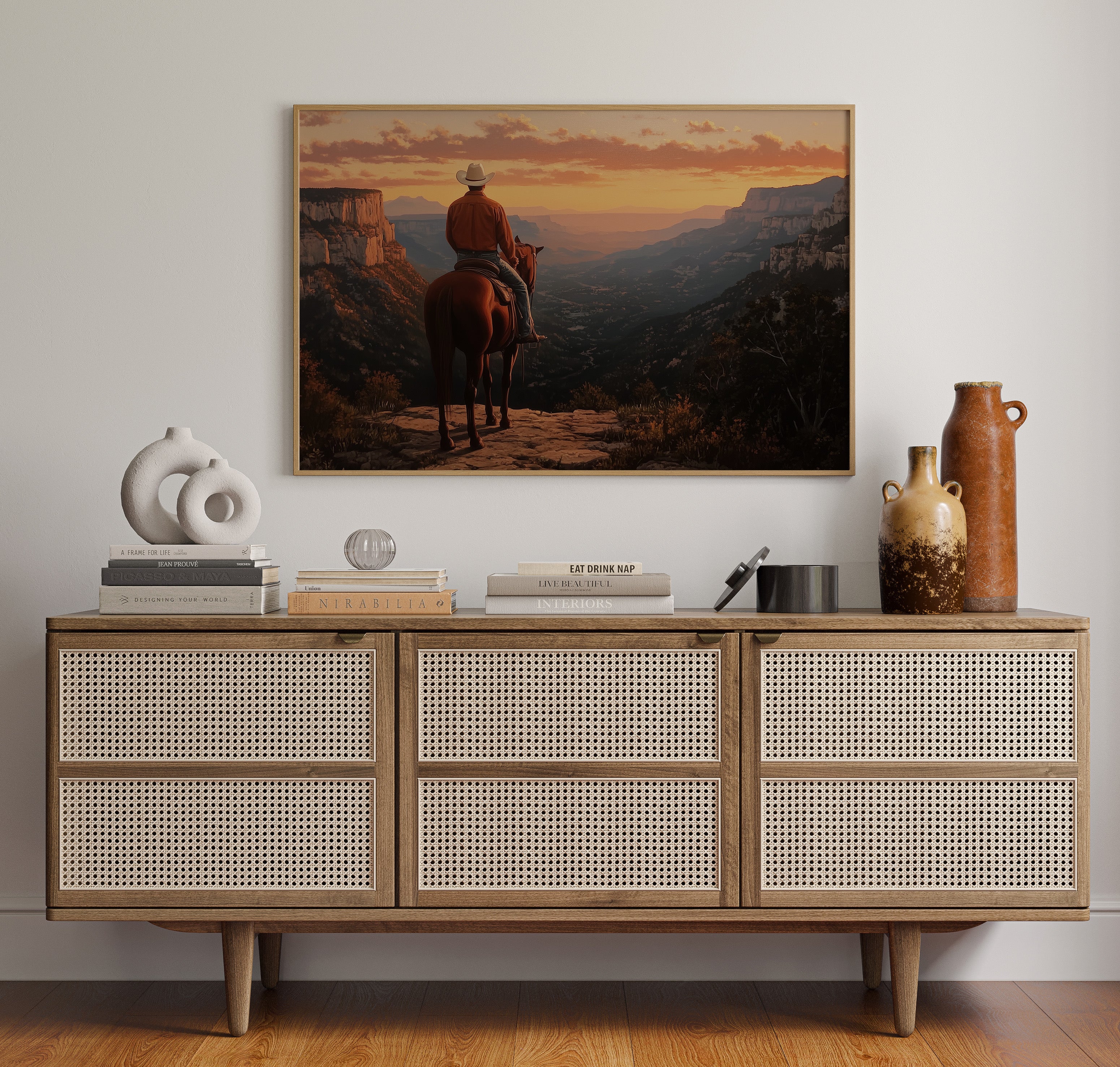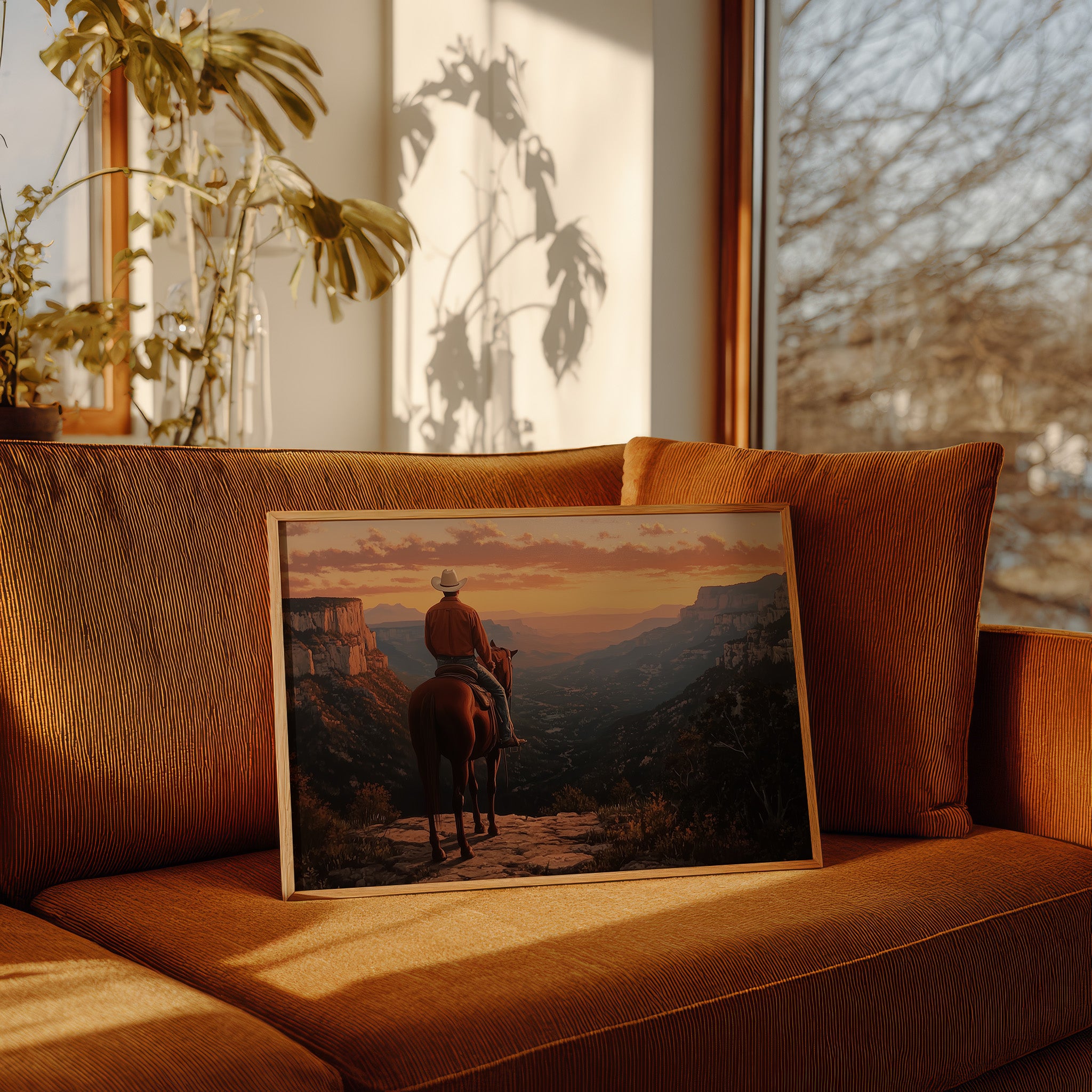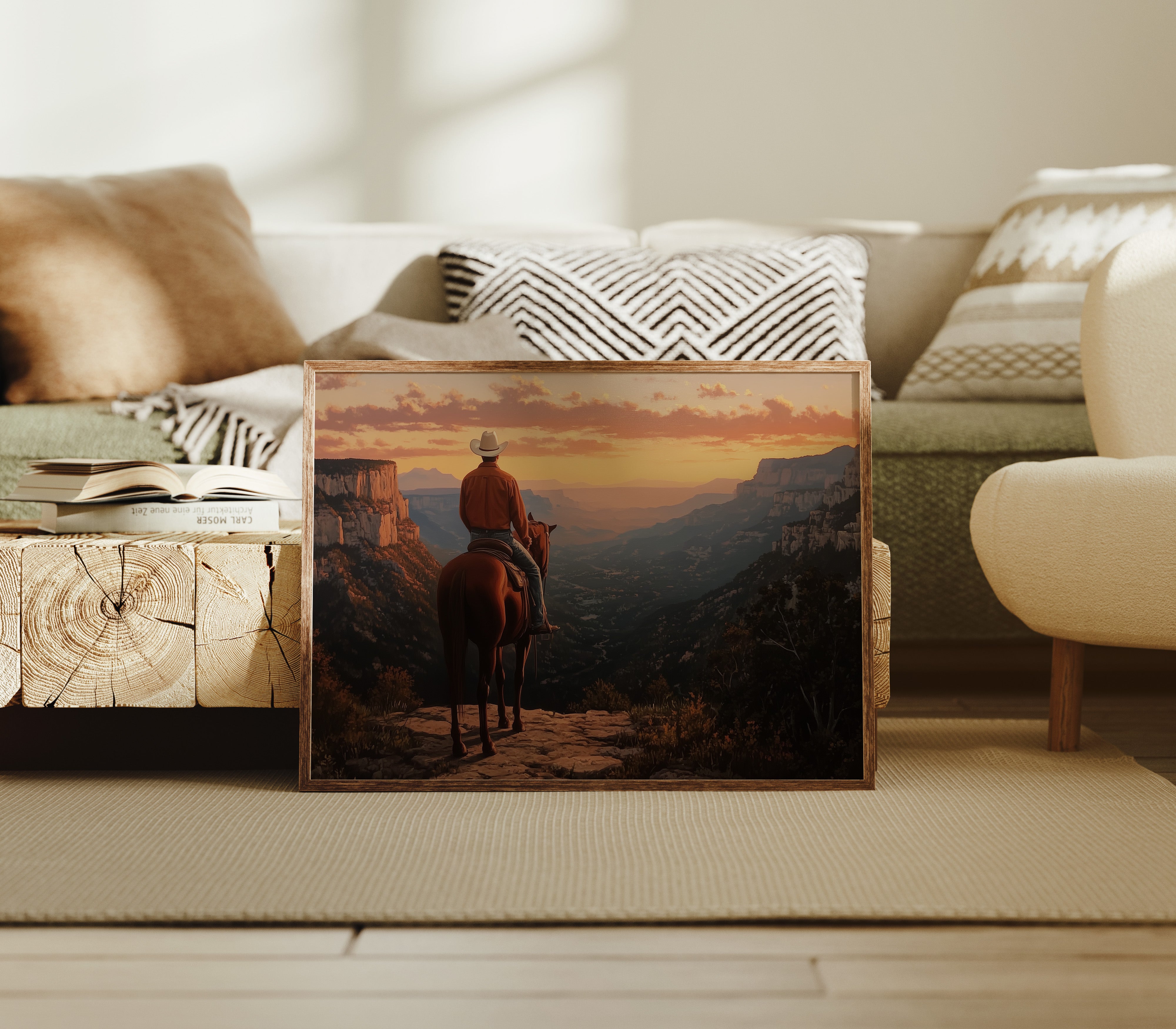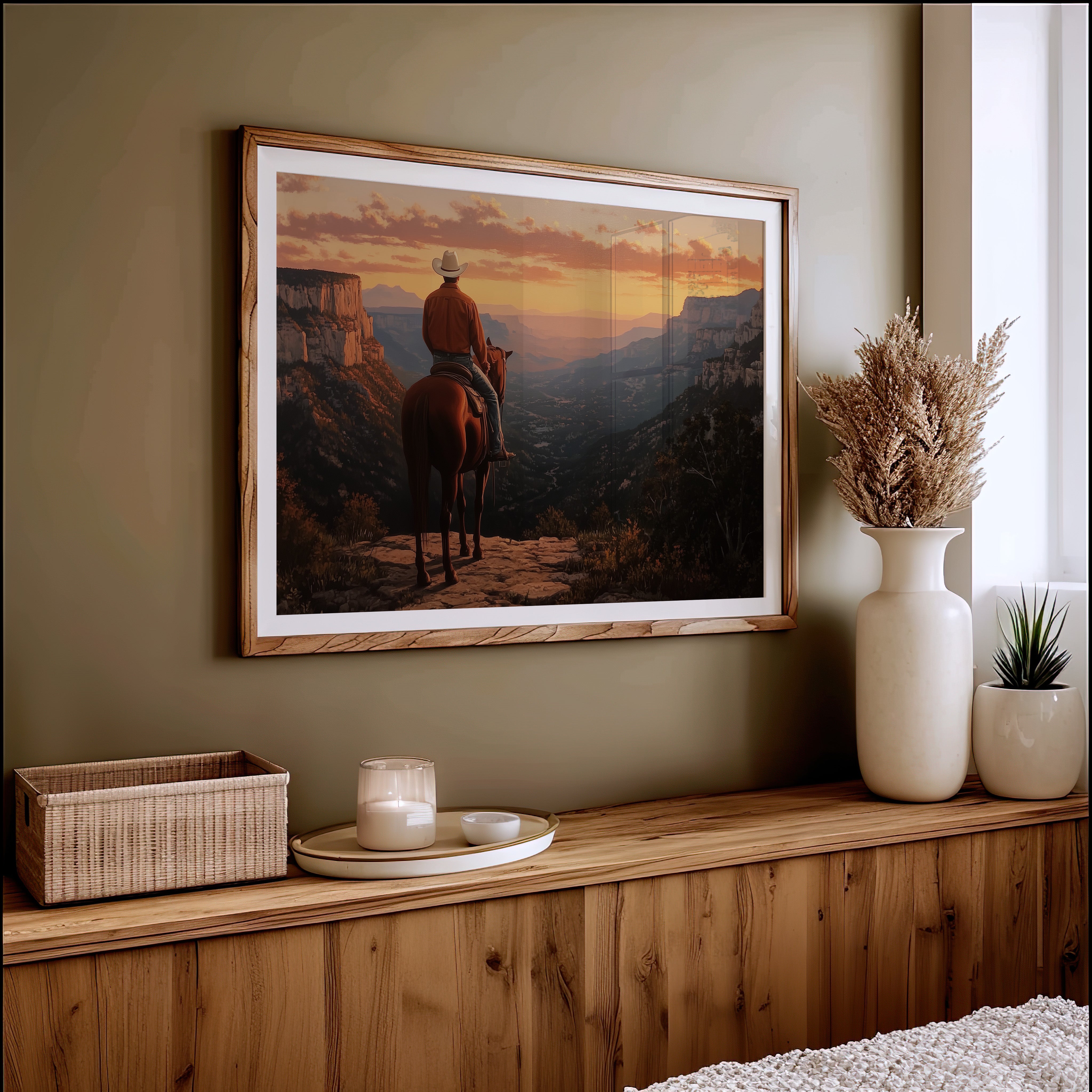 Time stands still as golden light washes over ancient stone walls, painting the landscape in warm copper and amber hues. This piece from our Contemporary Western collection captures the timeless romance of the American frontier. A lone rider and faithful mount pause at the canyon's edge, silhouetted against a sky ablaze with sunset colors, while layered cliffs stretch endlessly toward the horizon in deepening shades of purple and blue. The composition speaks to both solitude and connection – to the land, to tradition, to the quiet moments that define us. Perfect for adding dramatic atmosphere to a great room or office space, this piece invites viewers to pause and contemplate their own journey amid life's grand vistas.