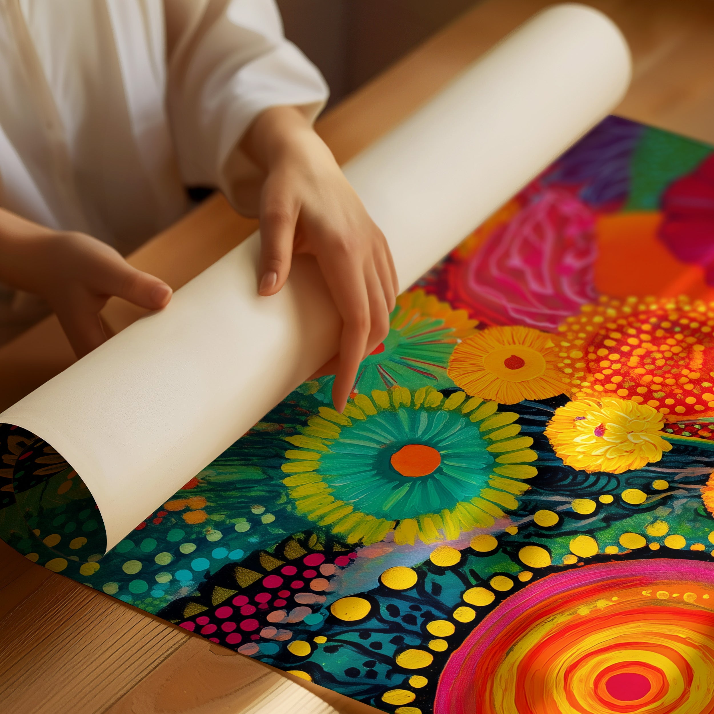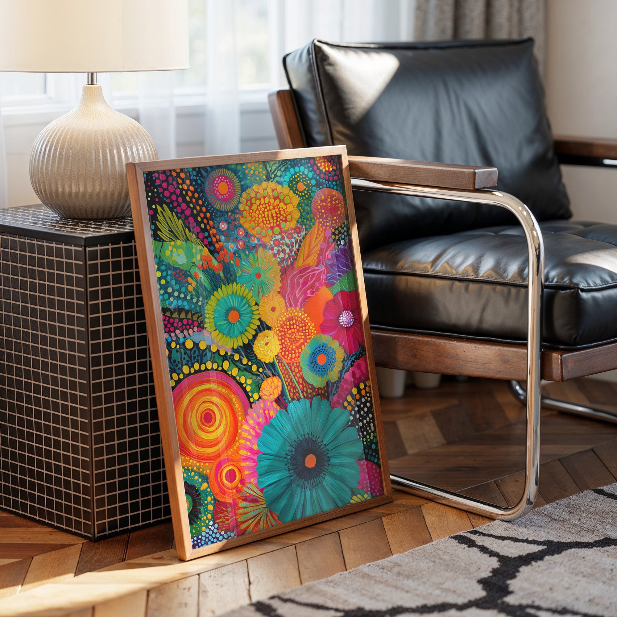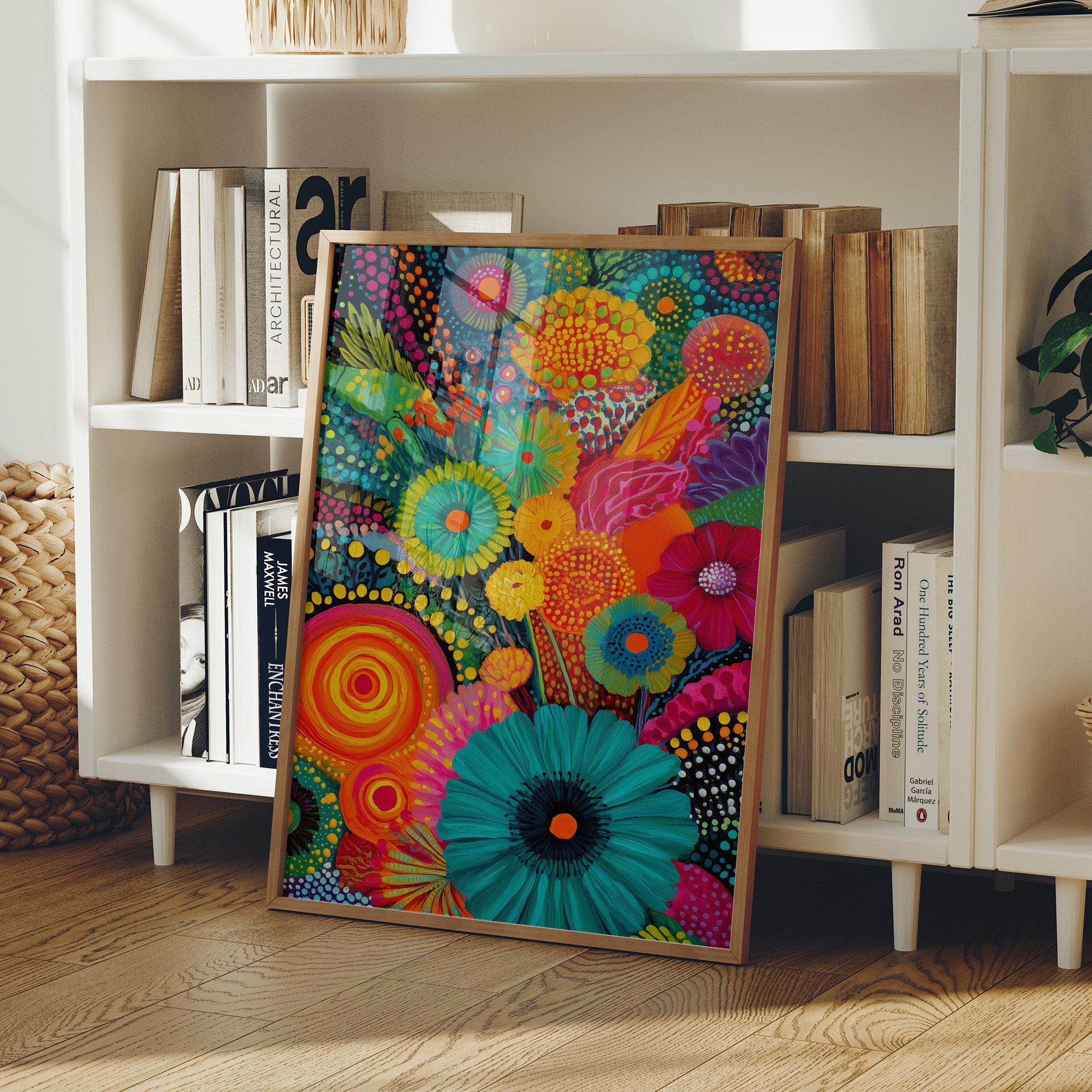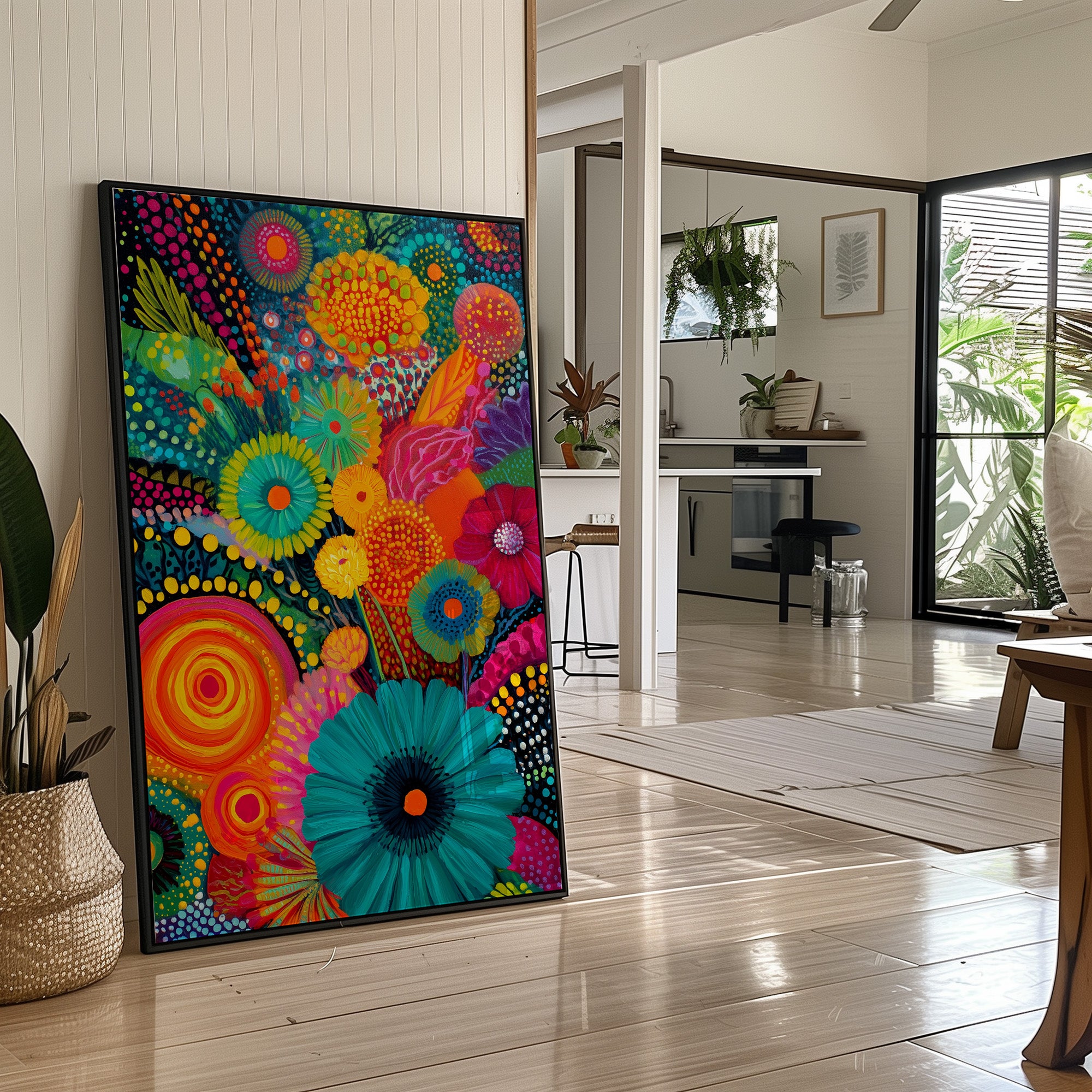 A burst of psychedelic florals explodes across the canvas, each petal pulsing with electric life and vibrant energy. Bold turquoise daisies mingle with fiery orange spirals and hot pink blooms, creating a kaleidoscopic garden where reality meets imagination. The intricate dotwork patterns weave between the flowers like cosmic constellations, while deep emerald and purple undertones ground the piece in nature's palette. This statement piece brings a bold pop of color and creative energy to a minimalist space, perfect for a home office or reading nook where inspiration is always welcome.