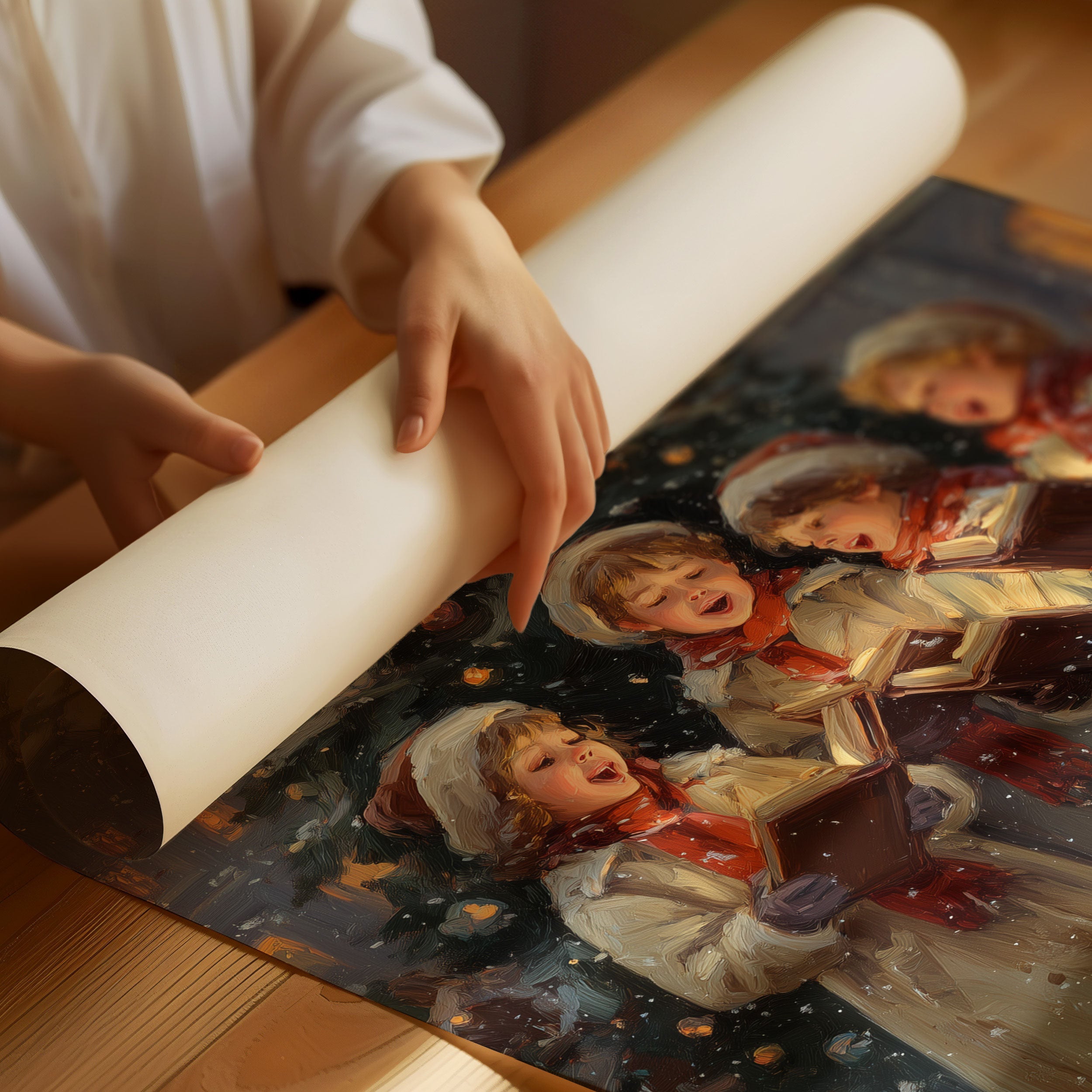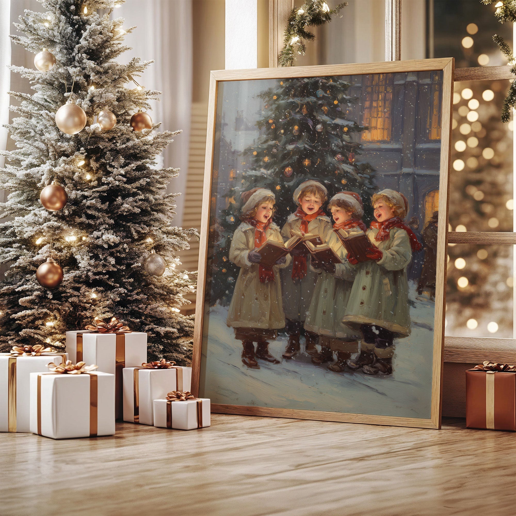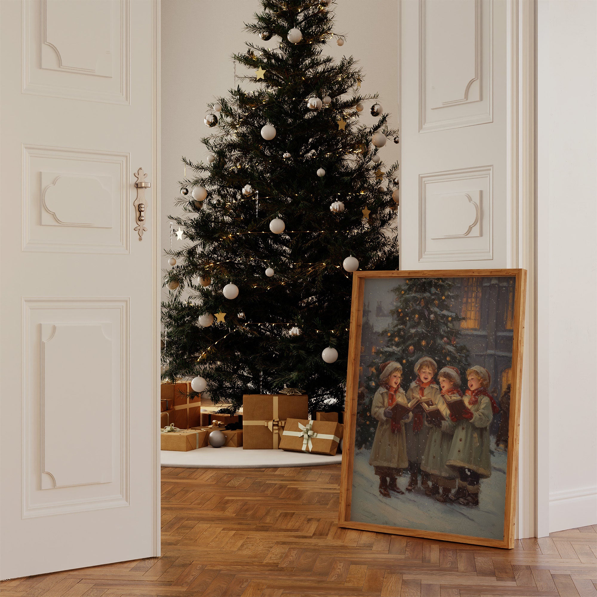 Soft snowflakes dance in the twilight air as harmonious voices rise against the winter chill. Warm golden lights twinkle through evergreen branches, casting a gentle glow on gathered songbooks and crimson scarves. The scene captures a timeless moment of holiday tradition, where cream-colored coats contrast against the dusky blue-grey of a December evening, while ornament-laden trees stand as silent witnesses to seasonal joy. This nostalgic winter scene brings warmth to contemporary spaces, perfect for creating an inviting atmosphere in living rooms or entryways during the holiday season.