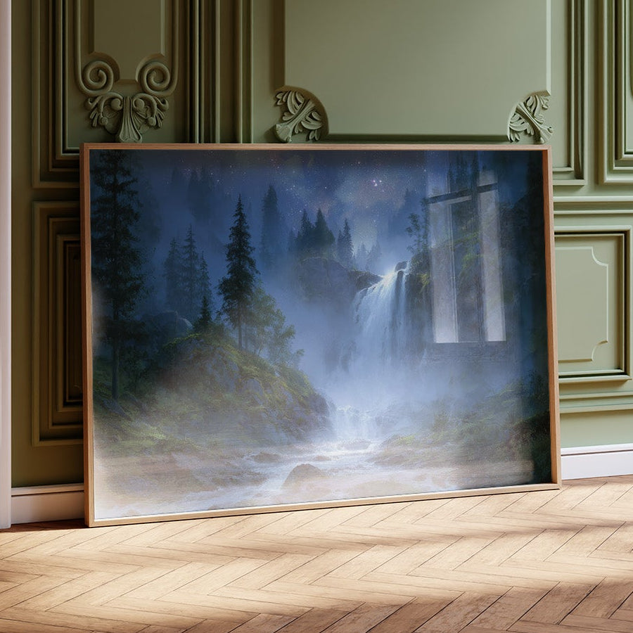 Moonlight spills across tumbling waters, creating an ethereal glow that beckons from within the frame. The waterfall cuts through ancient pines, its misty veil catching starlight as it descends through layers of midnight blue and forest green. Delicate brushstrokes capture the dynamic rush of water against the stillness of the surrounding wilderness, where each evergreen stands sentinel in the mystical darkness. This tranquil scene brings natural serenity to a study, reading nook, or contemplative space where one seeks both inspiration and calm.