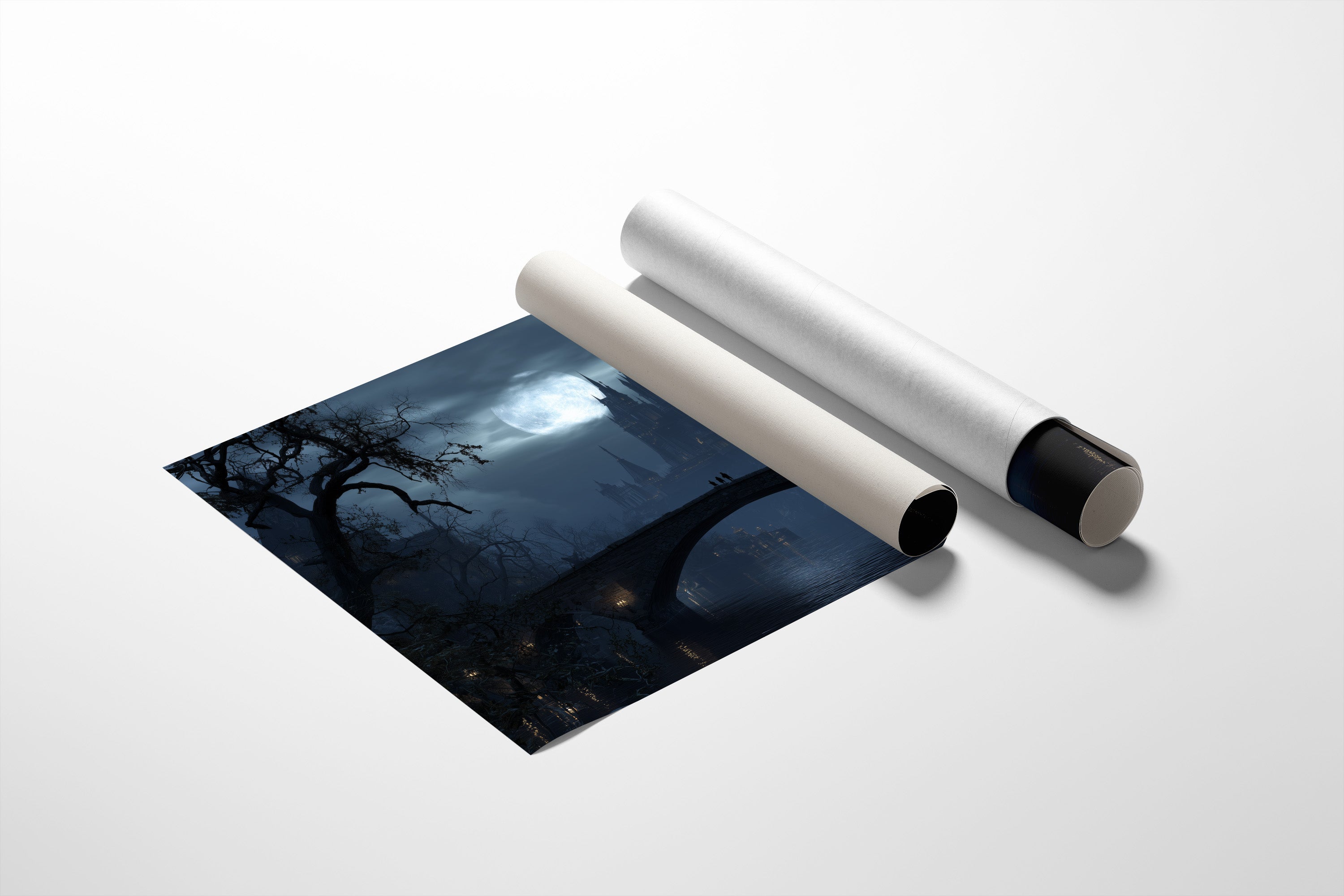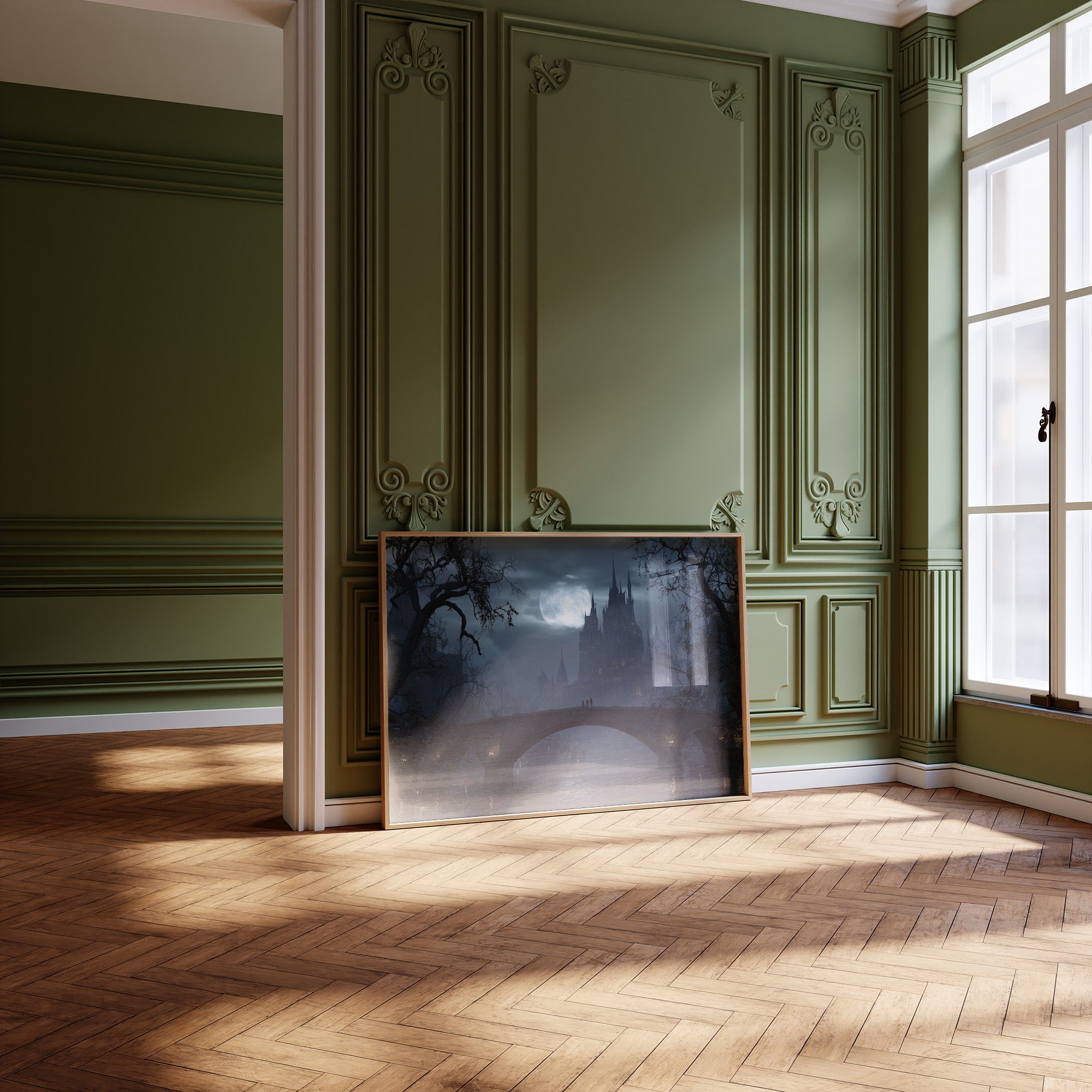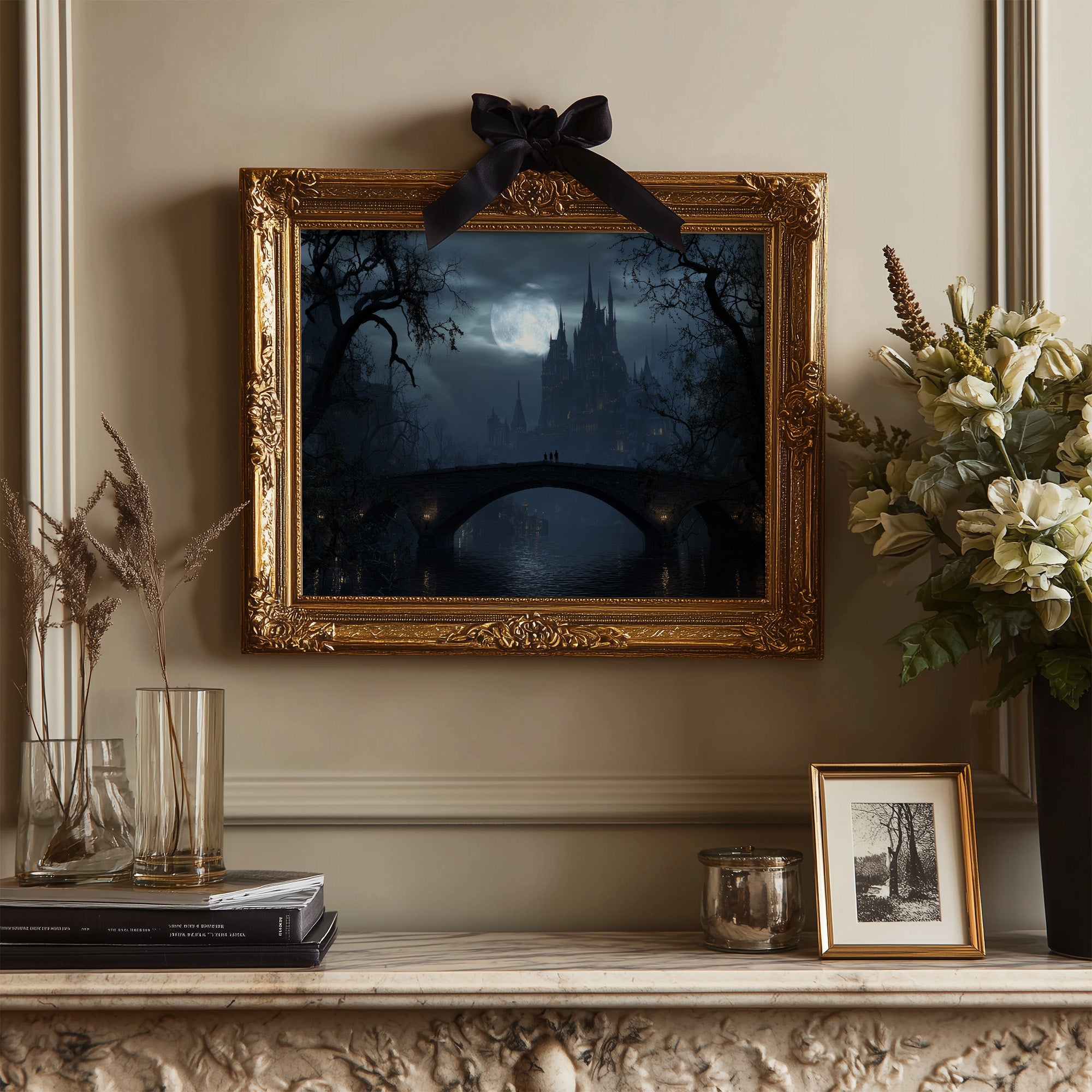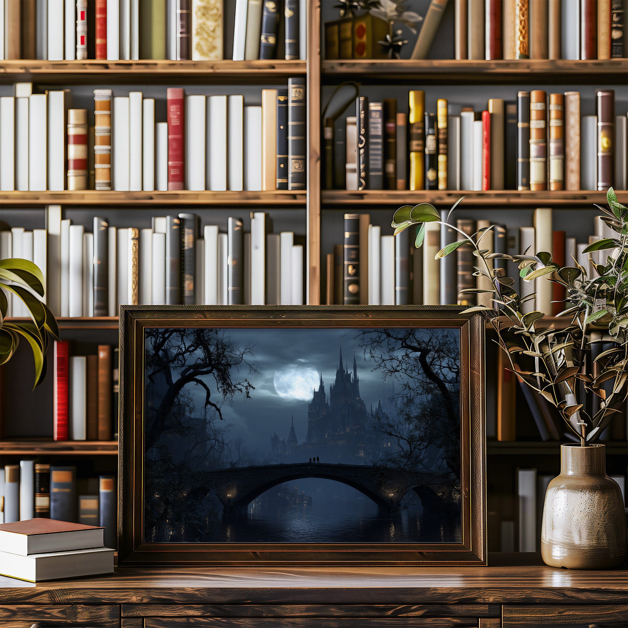 A haunting stillness hangs in the air as moonlight bathes an ancient stone bridge where three silhouettes stand frozen in time. The gothic spires of a distant castle pierce the night sky, their dark outlines stark against the luminous full moon that casts an ethereal glow across the misty landscape. Bare trees frame the scene like gnarled sentinels, their twisted branches reaching toward the celestial light while reflections shimmer on the quiet waters below. This atmospheric piece brings a touch of mystery and enchantment to a study, reading nook, or any space where imagination and contemplation flourish.