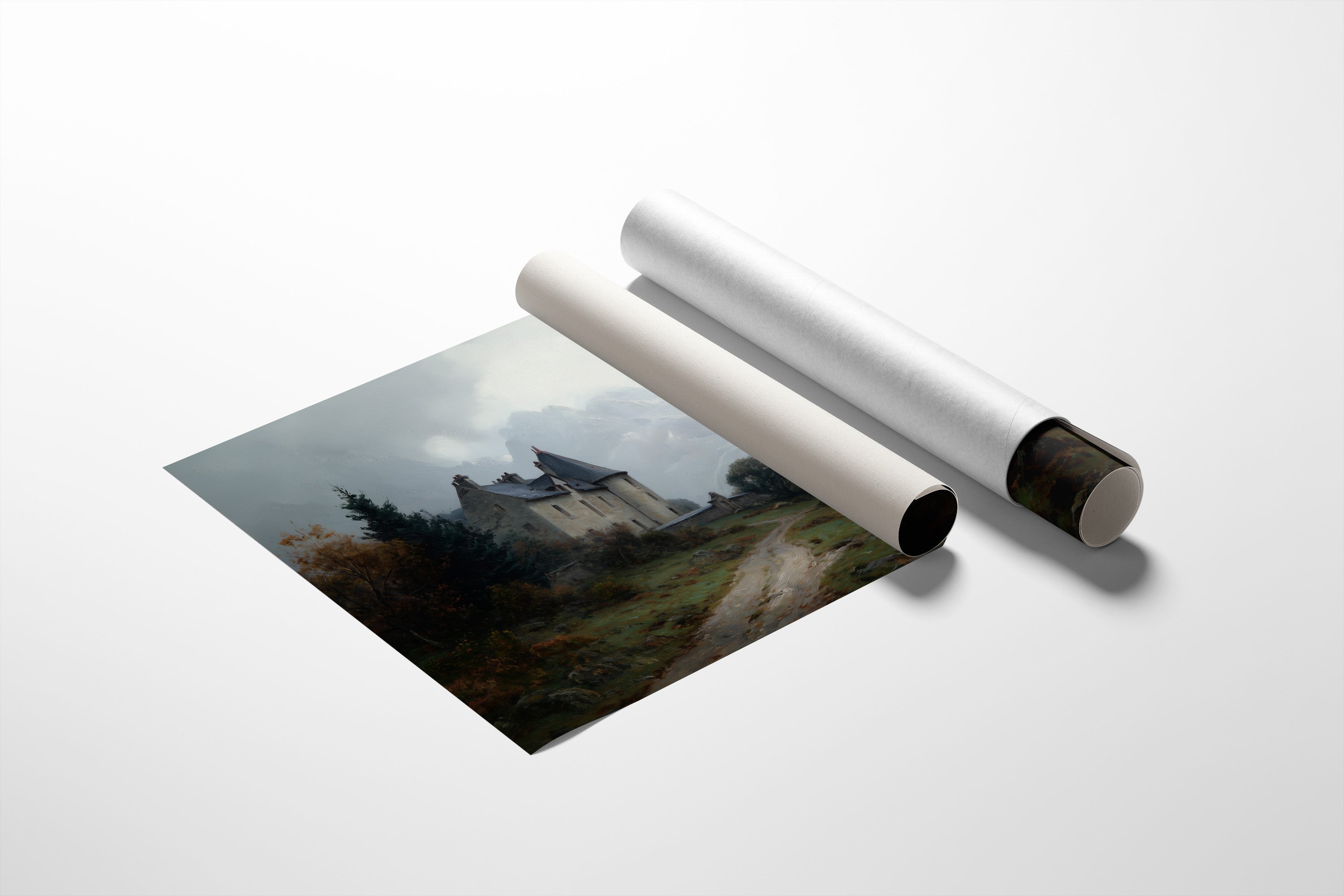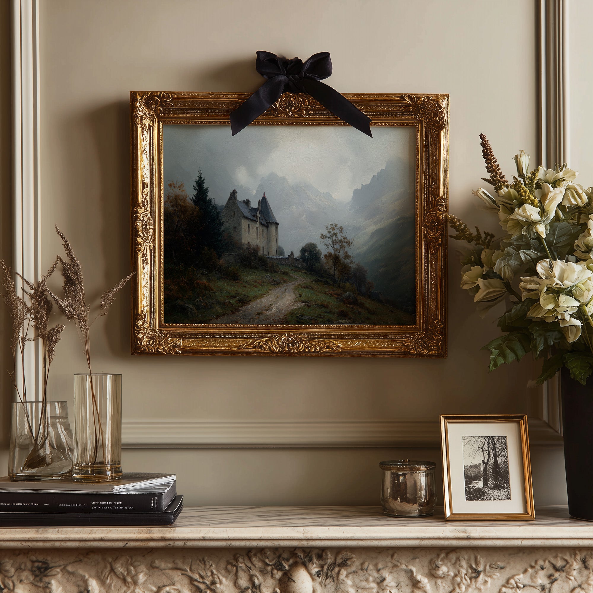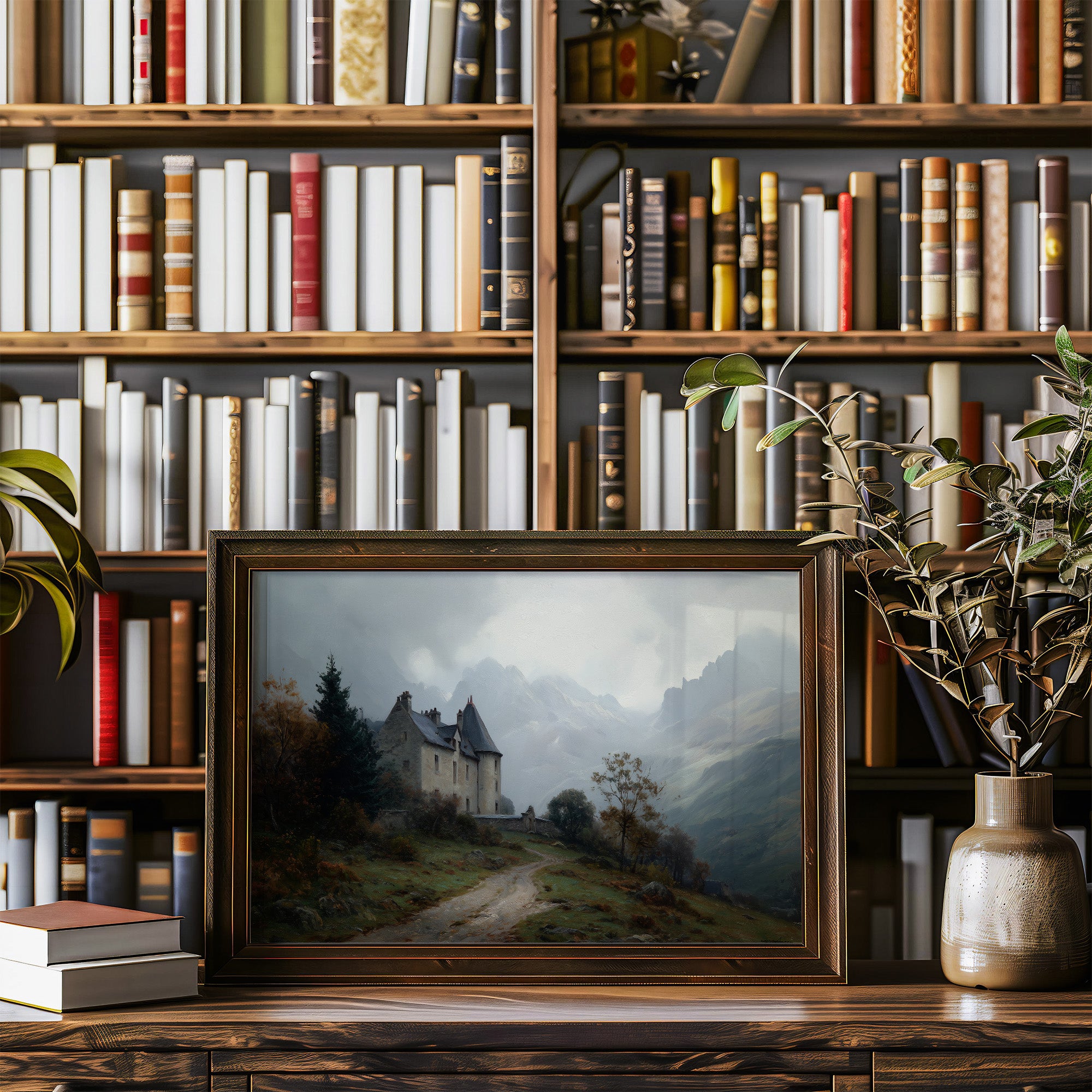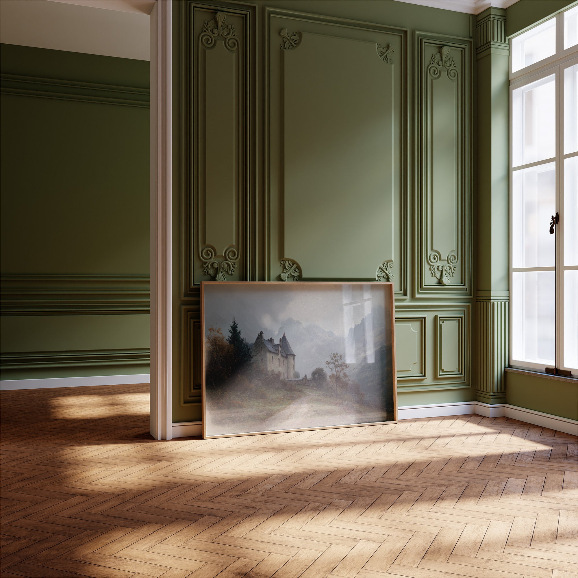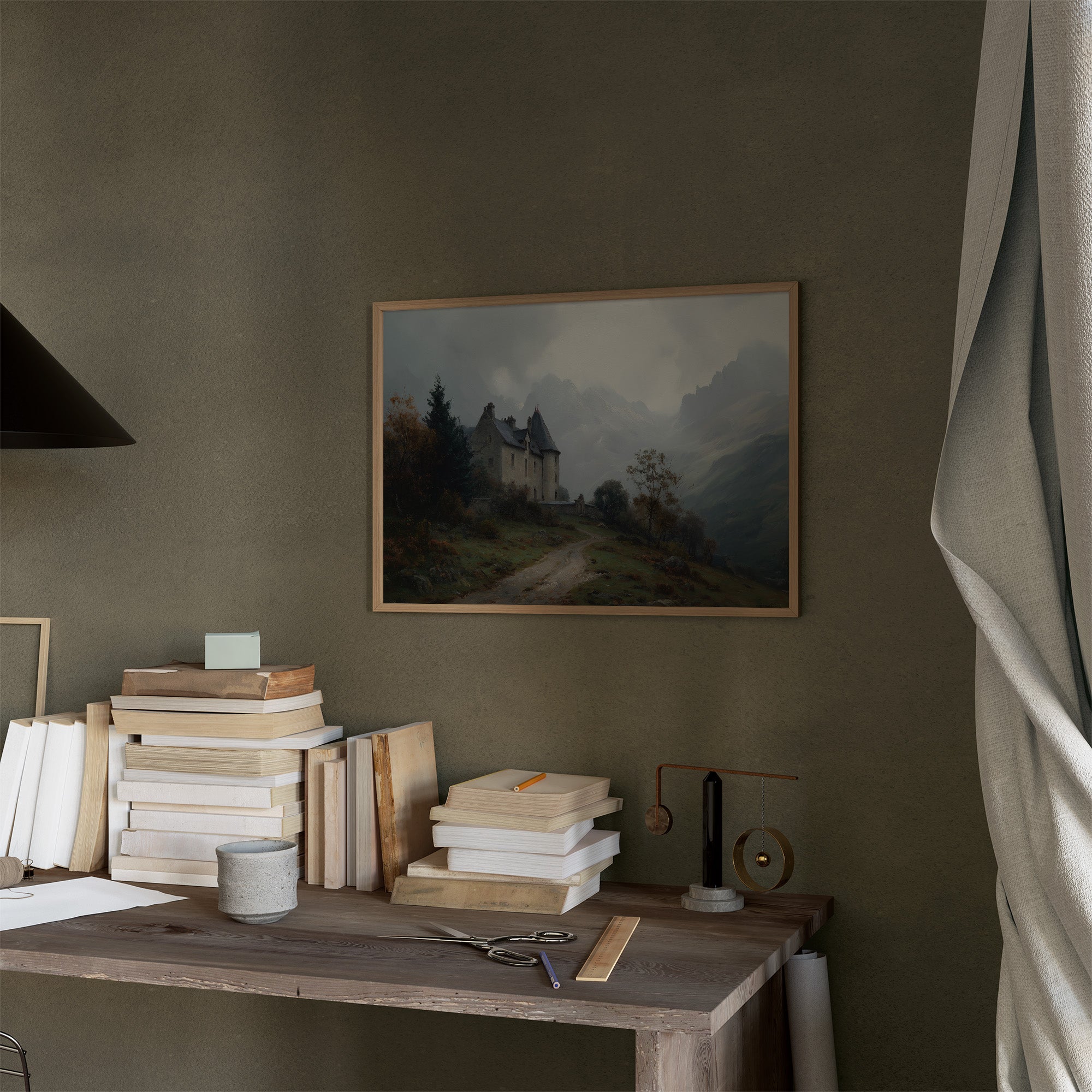 The painting captures that ethereal moment when fog rolls through mountain valleys, leaving only a solitary castle clinging to the verdant slope. Muted grays and greens create a dreamlike atmosphere where time seems suspended between seasons. The winding dirt path invites viewers into this tranquil scene, suggesting stories of those who once traveled to this remote sanctuary among the peaks. This piece brings sophisticated old-world charm to a home library, study, or reading nook where contemplation is treasured.