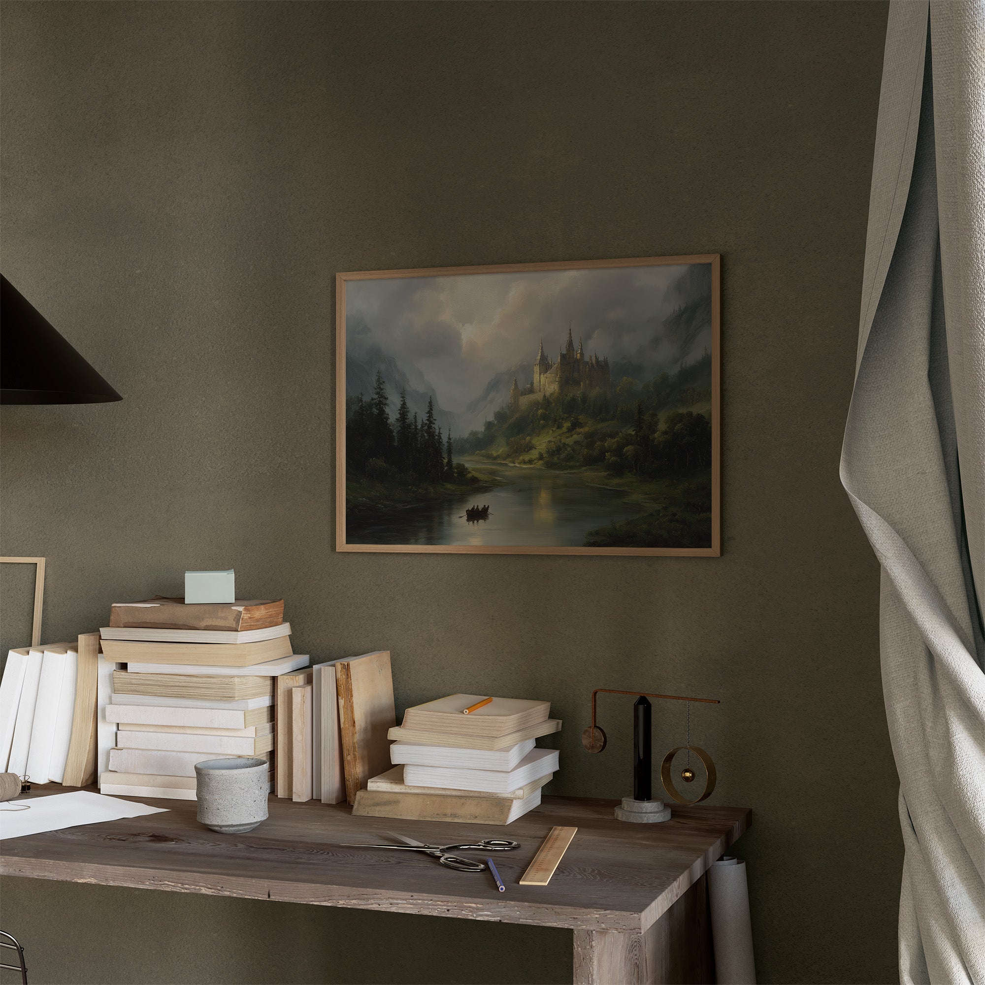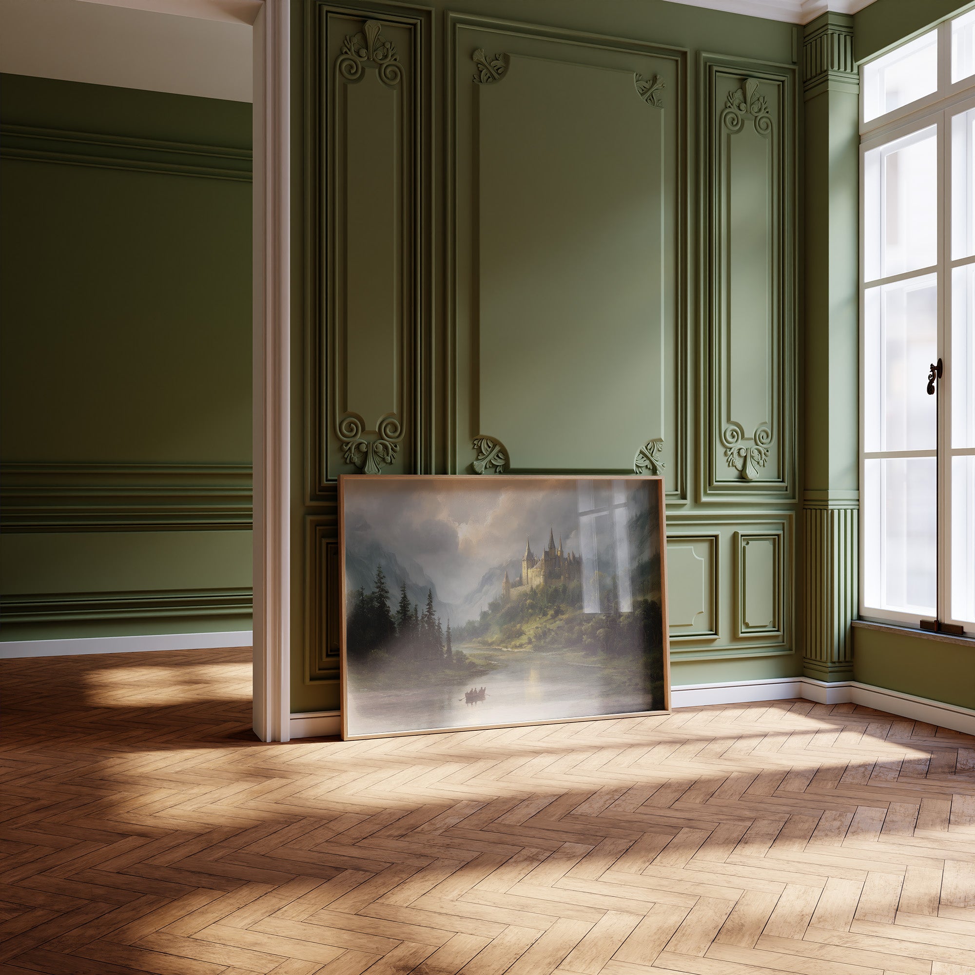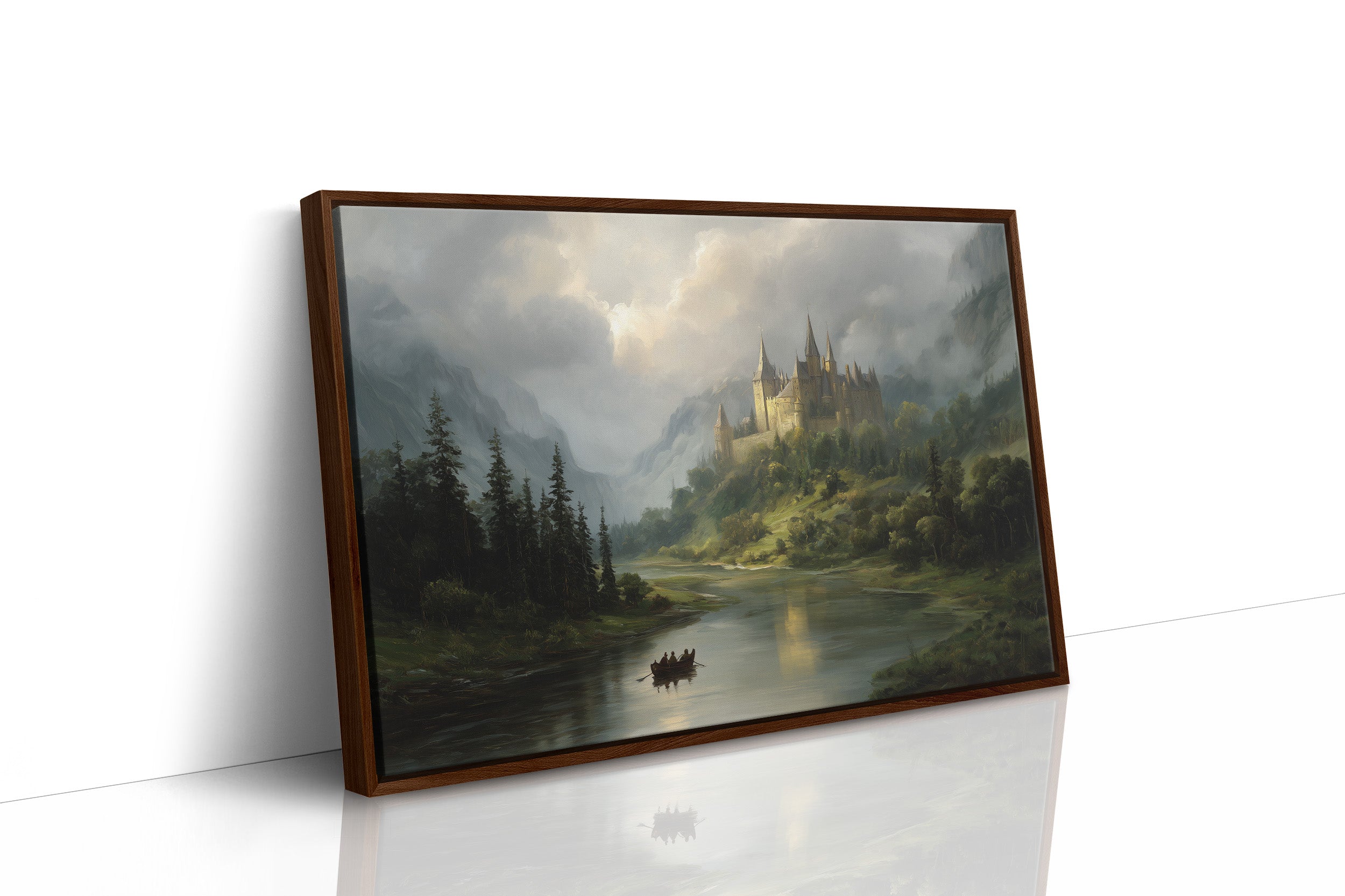 The mist clings to mountain peaks as travelers row toward a majestic fortress bathed in golden light. This romantic landscape captures the tension between wild nature and human ambition, where evergreen sentinels stand watch along riverbanks while dramatic clouds part to reveal sunlight touching ancient stone towers. The rich, moody palette evokes the feeling of stepping into a world where legends still breathe among the valleys and peaks. Perfect for a study, reading nook, or any space where you wish to inspire contemplation and a sense of timeless adventure.
