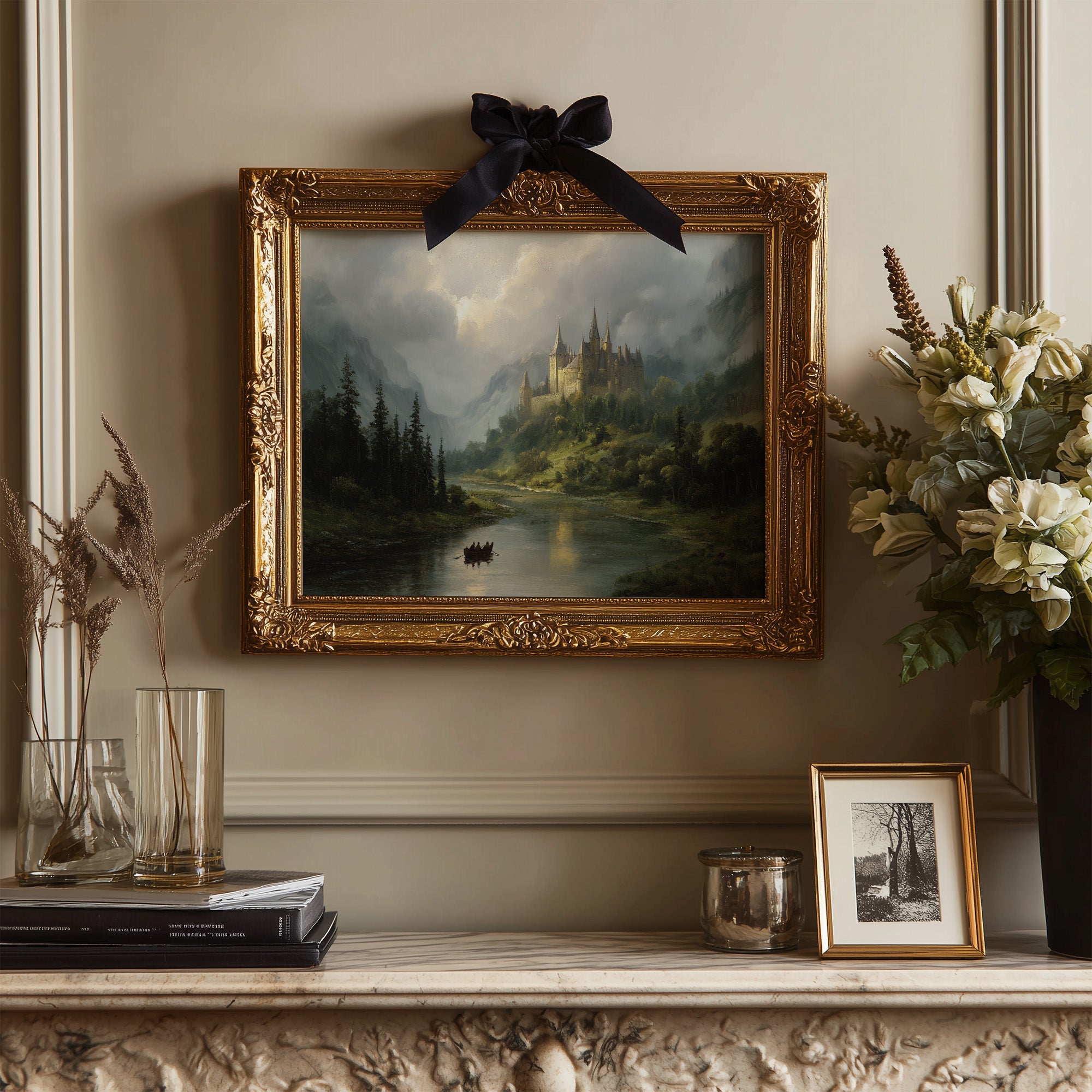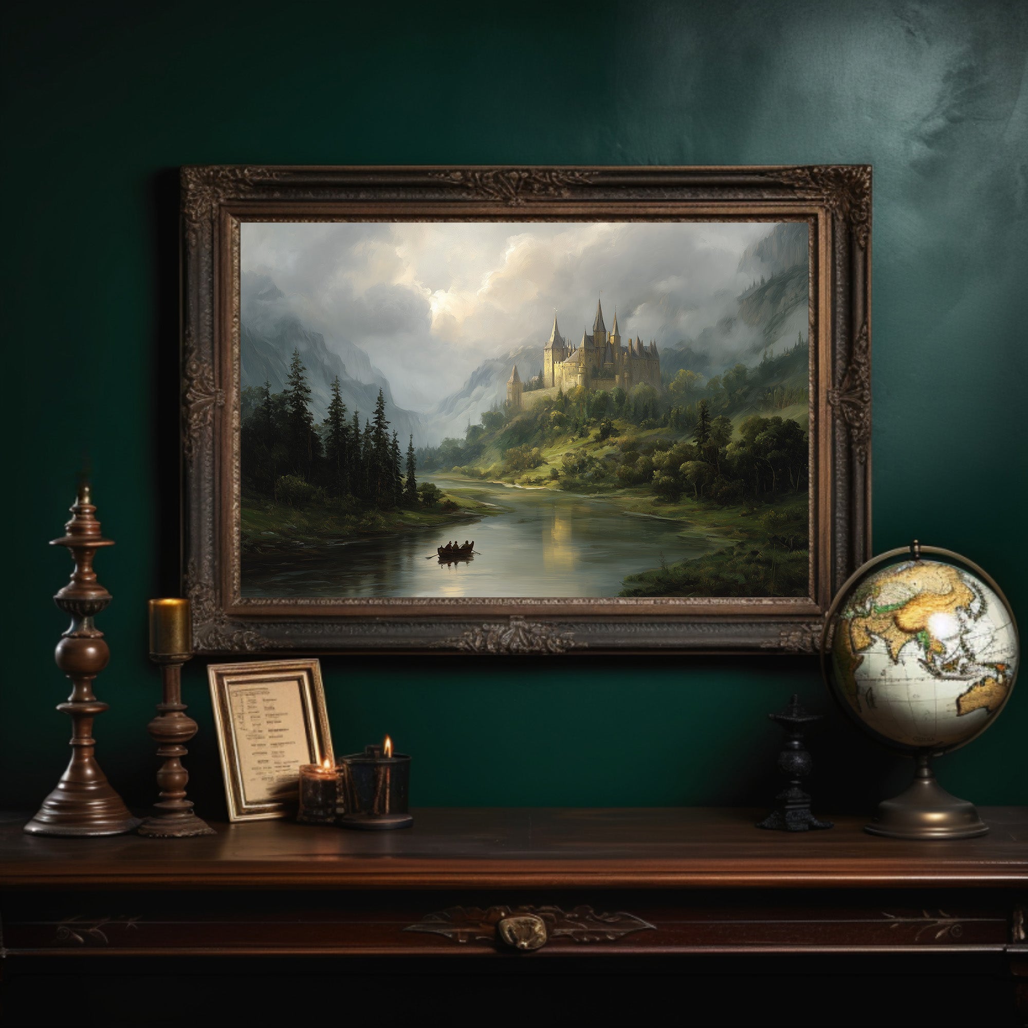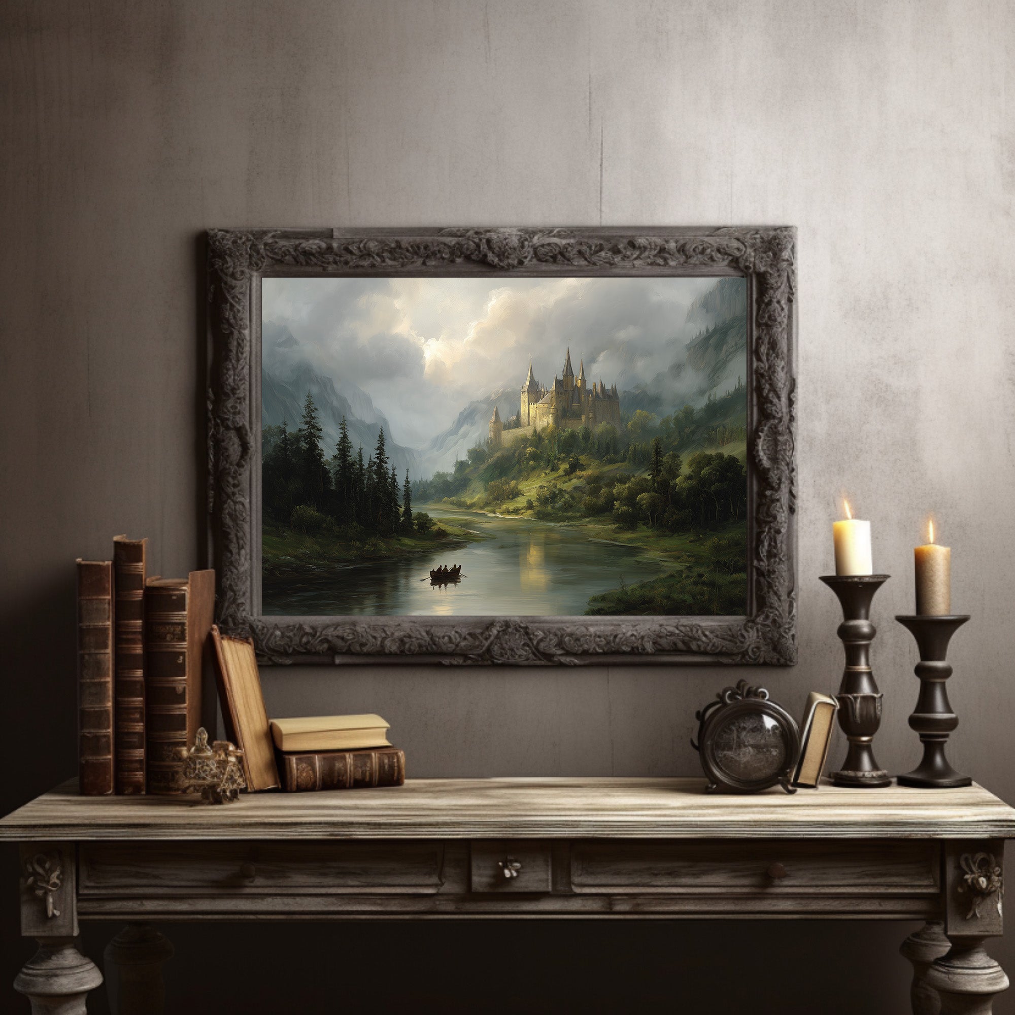 The mist clings to mountain peaks as travelers row toward a majestic fortress bathed in golden light. This romantic landscape captures the tension between wild nature and human ambition, where evergreen sentinels stand watch along riverbanks while dramatic clouds part to reveal sunlight touching ancient stone towers. The rich, moody palette evokes the feeling of stepping into a world where legends still breathe among the valleys and peaks. Perfect for a study, reading nook, or any space where you wish to inspire contemplation and a sense of timeless adventure.