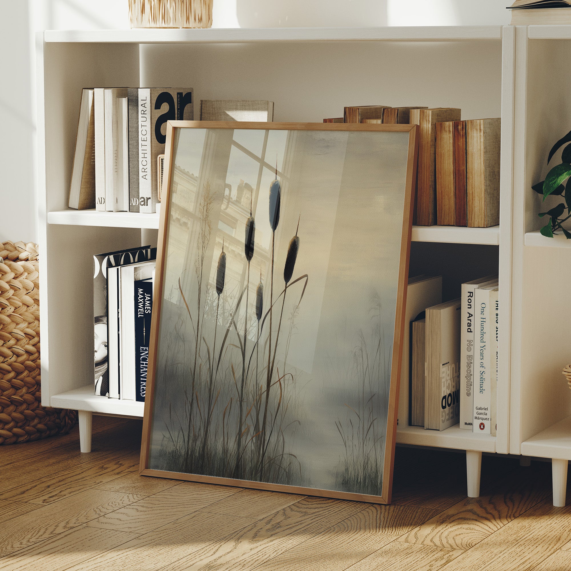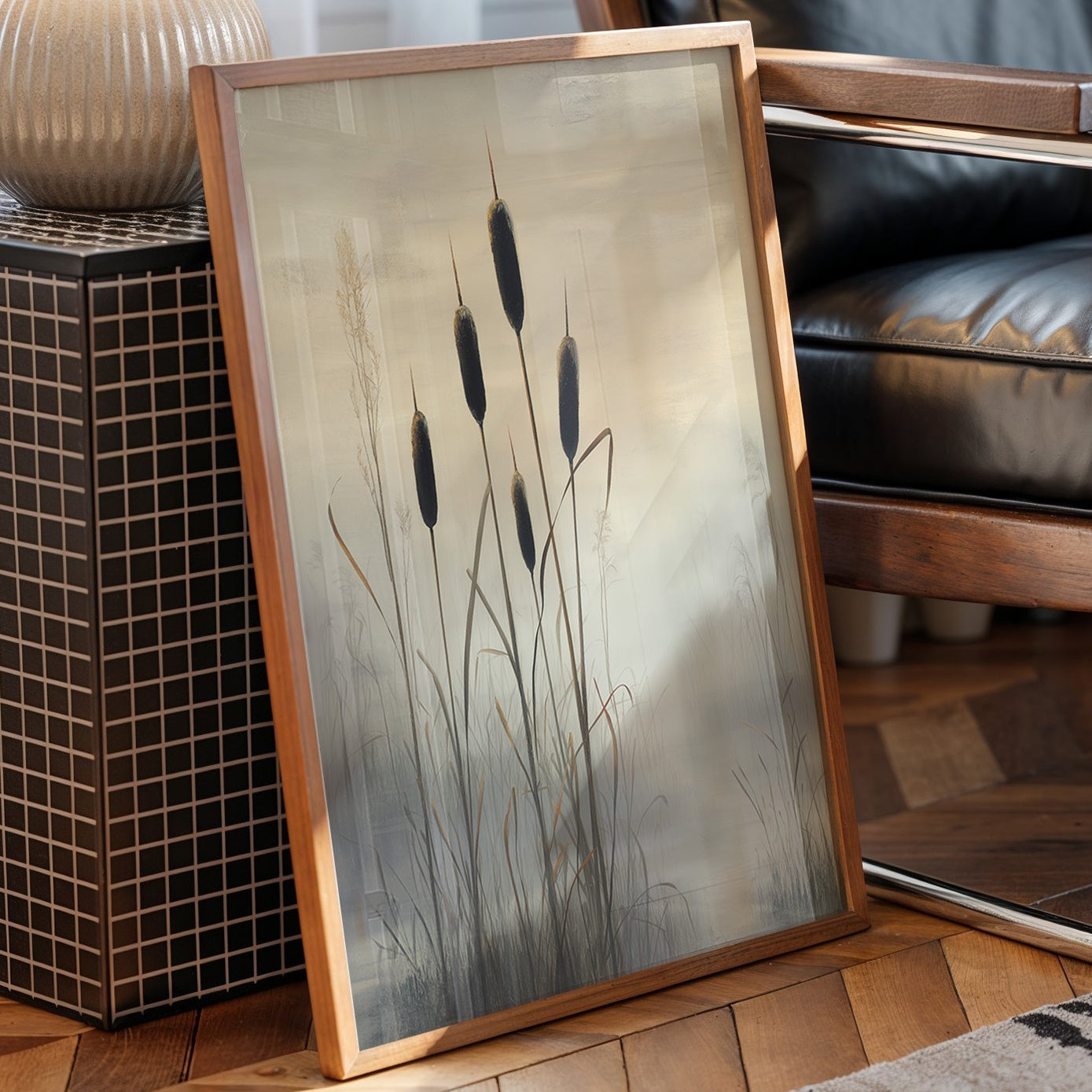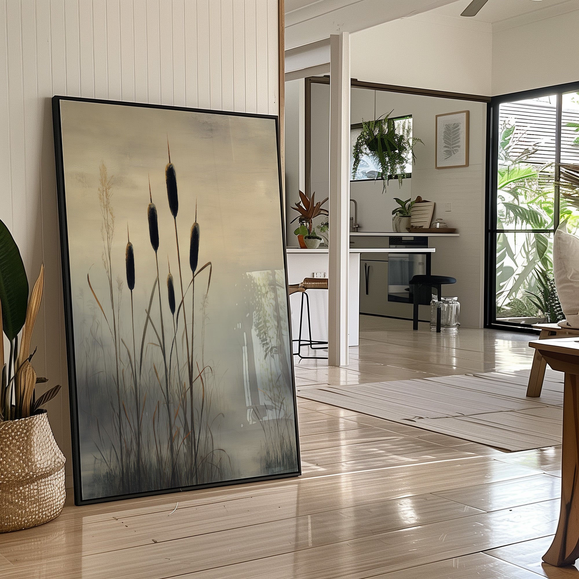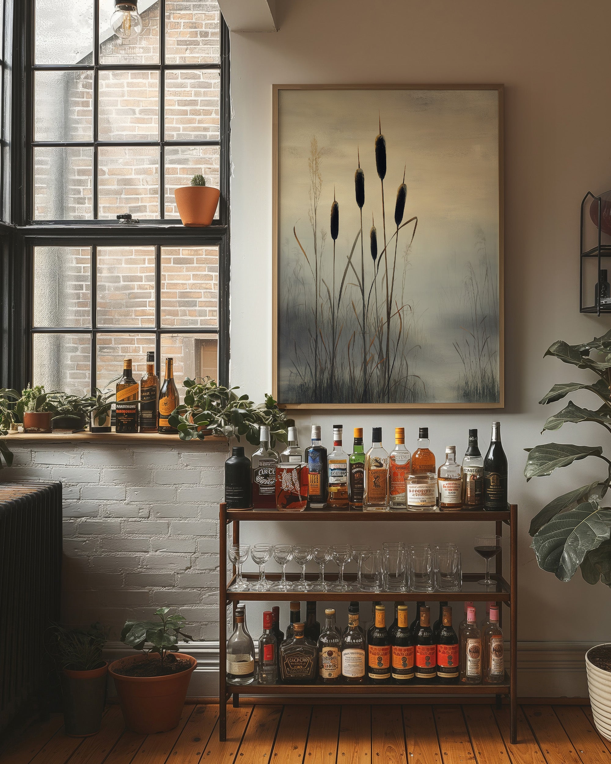 Misty marshlands fade into a golden horizon as elegant cattails stand sentinel against the dimming light. The composition captures nature's quiet dignity, with dark silhouettes reaching skyward through layers of atmospheric haze. This contemporary piece balances dramatic contrast with subtle color transitions, creating a meditative scene that speaks to the beauty of wetland landscapes. This striking botanical artwork serves as a sophisticated focal point in a modern home bar setting, complementing both minimalist and industrial design elements.
