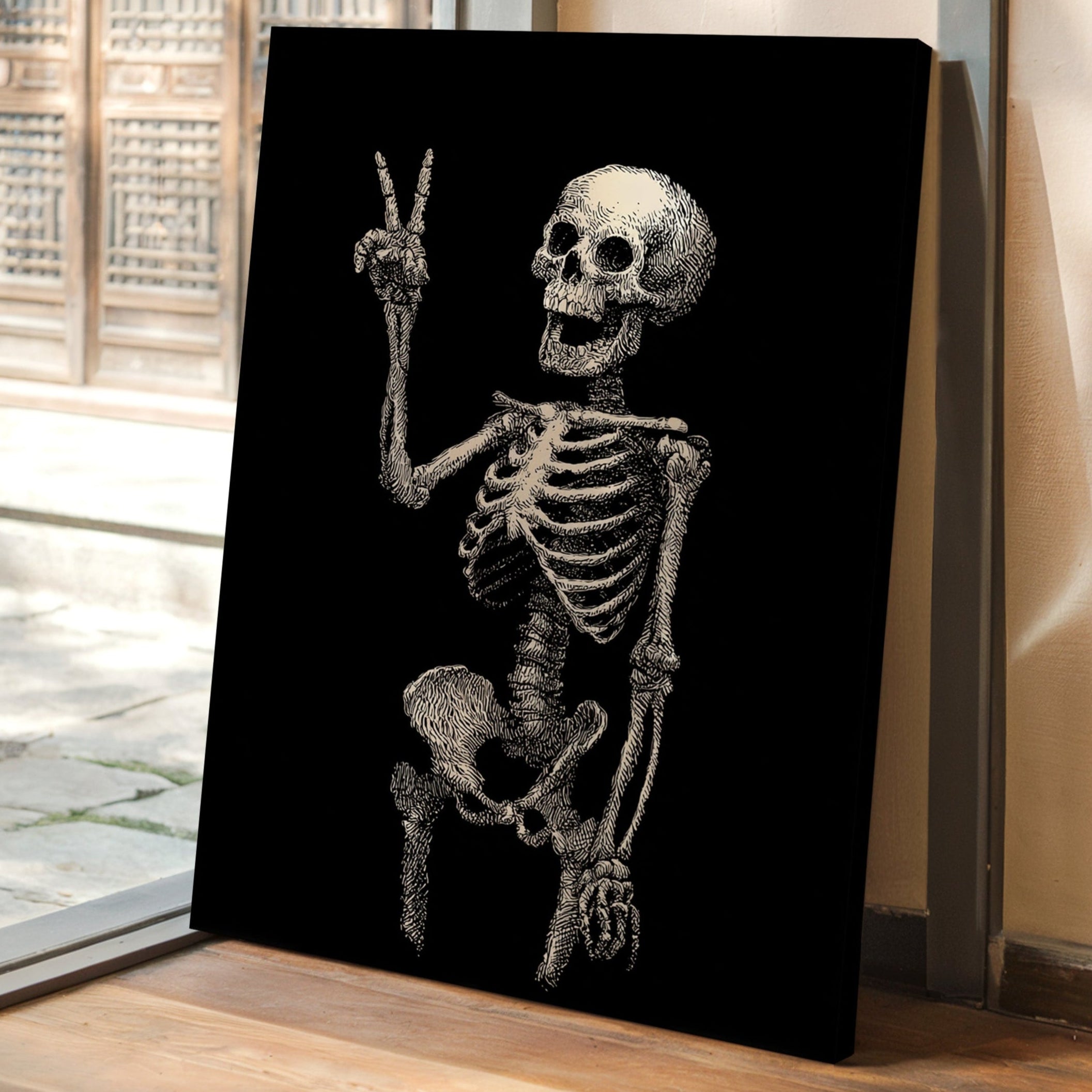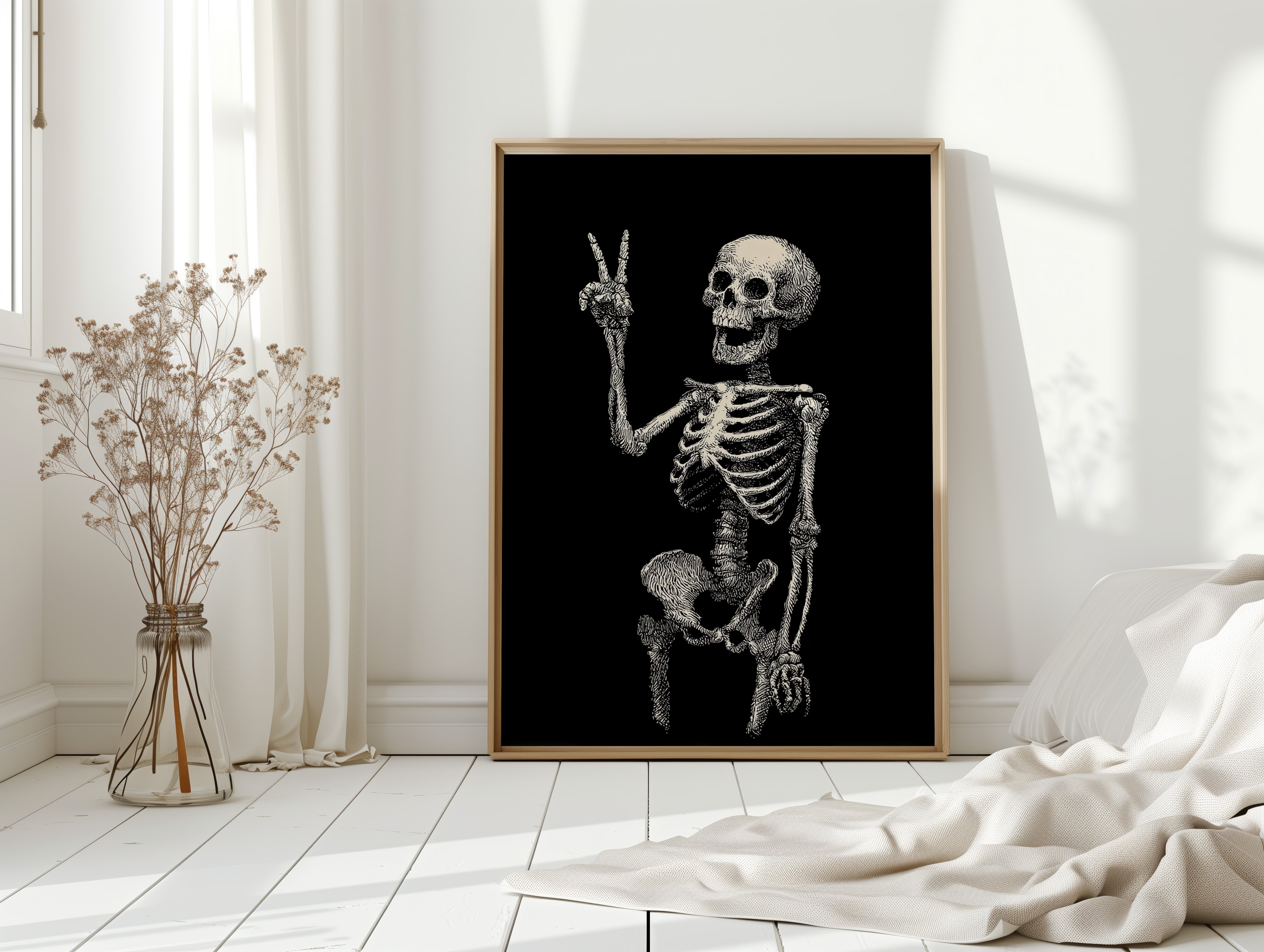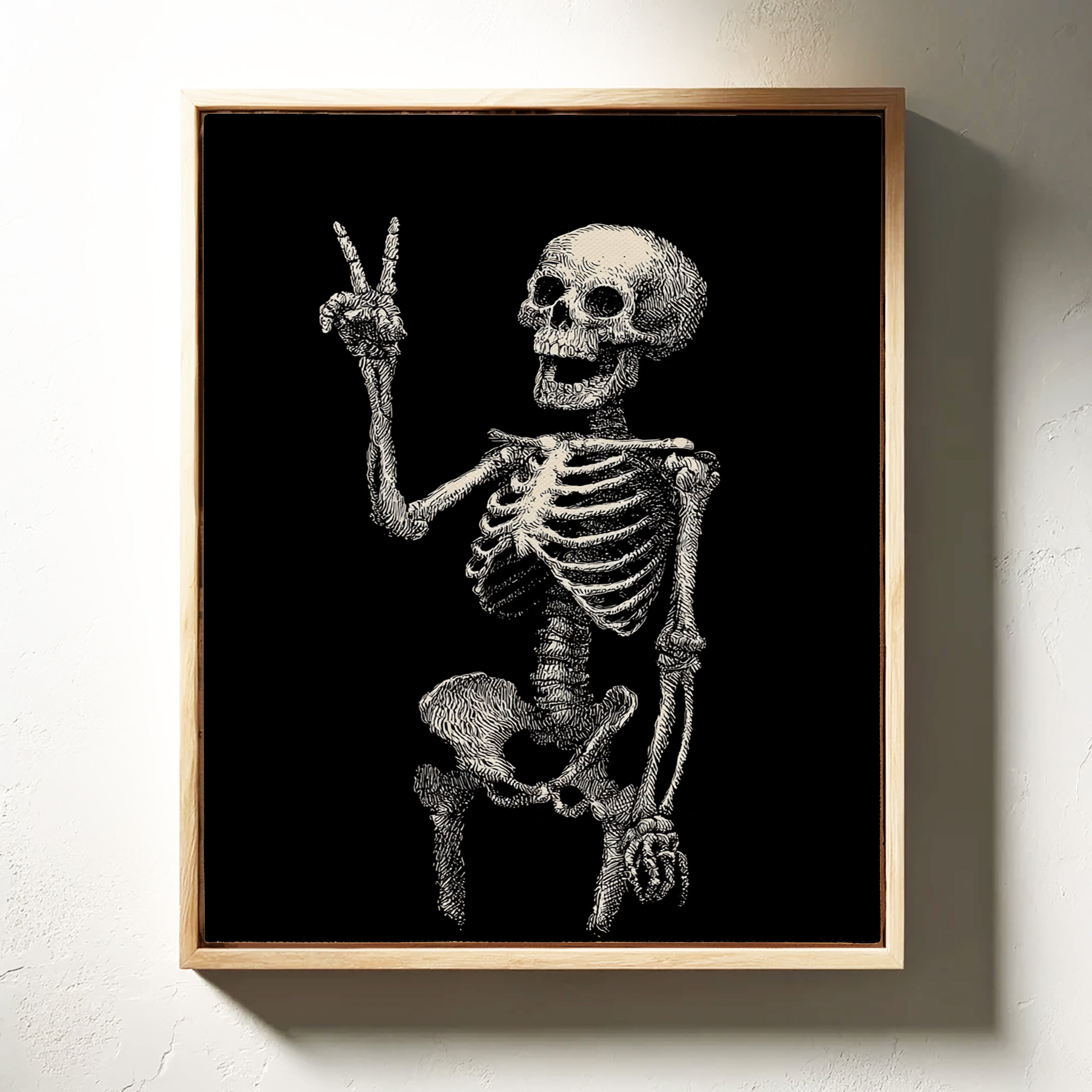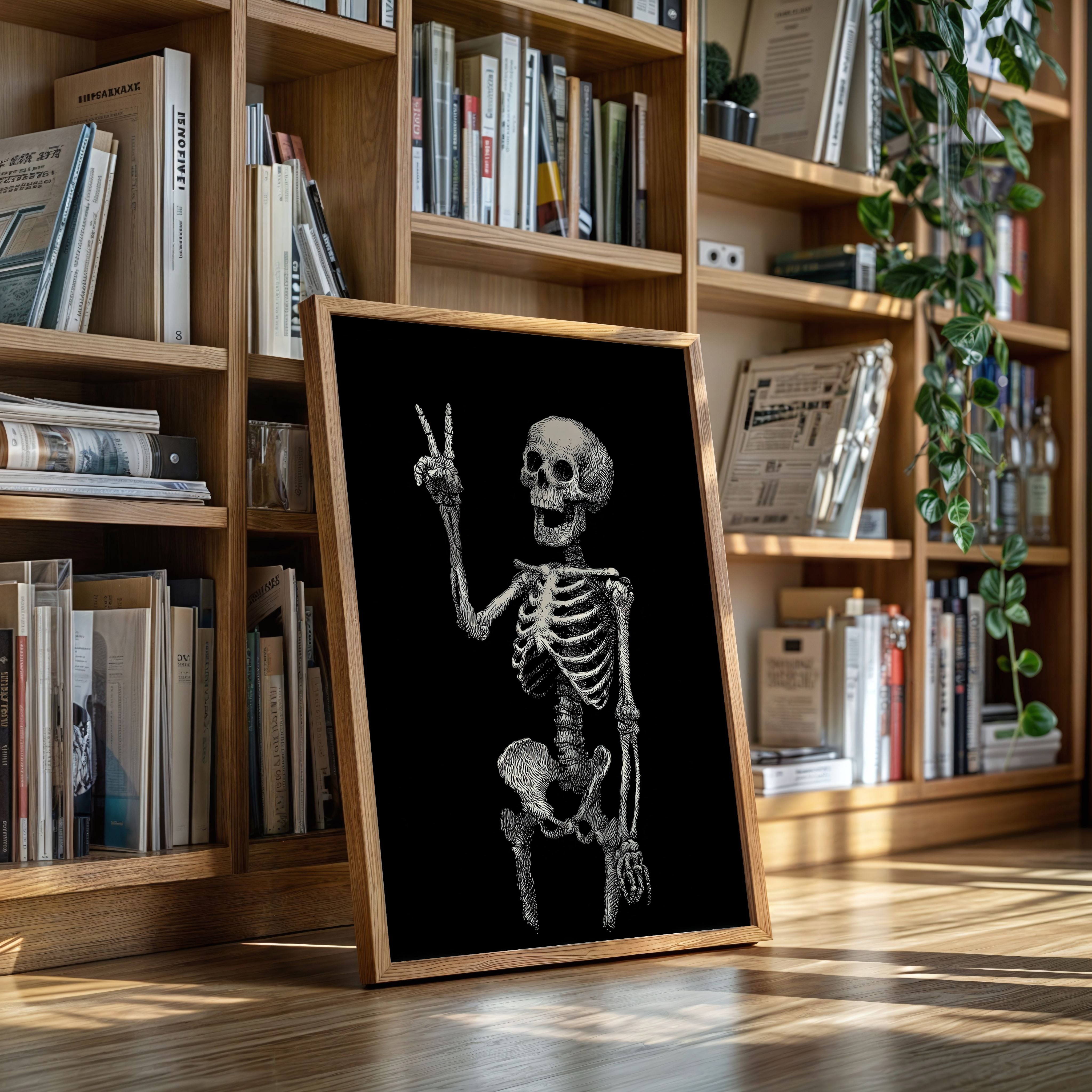 In a moment suspended between realms, a skeleton raises its hand in a gentle peace sign, exuding an unexpected warmth. This piece belongs to the Artisanal collection, where the macabre meets the whimsical. Lines intricately drawn bring life to bones, transforming the eerie into a celebration of existence, reminding us that joy can flourish in the most unlikely places. Imagine this striking figure illuminating a cozy reading nook or adding character to a home office, inviting curiosity and conversation.