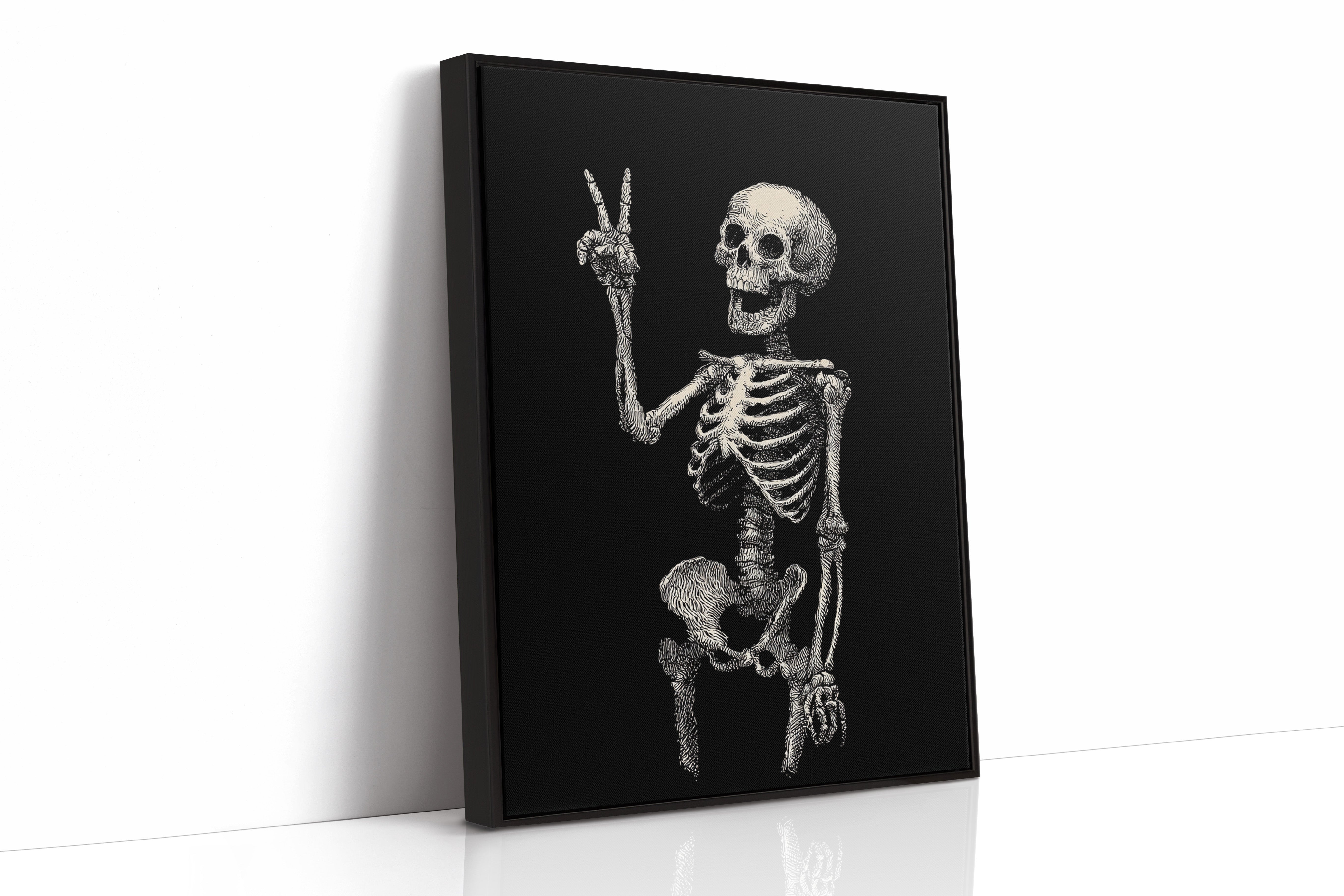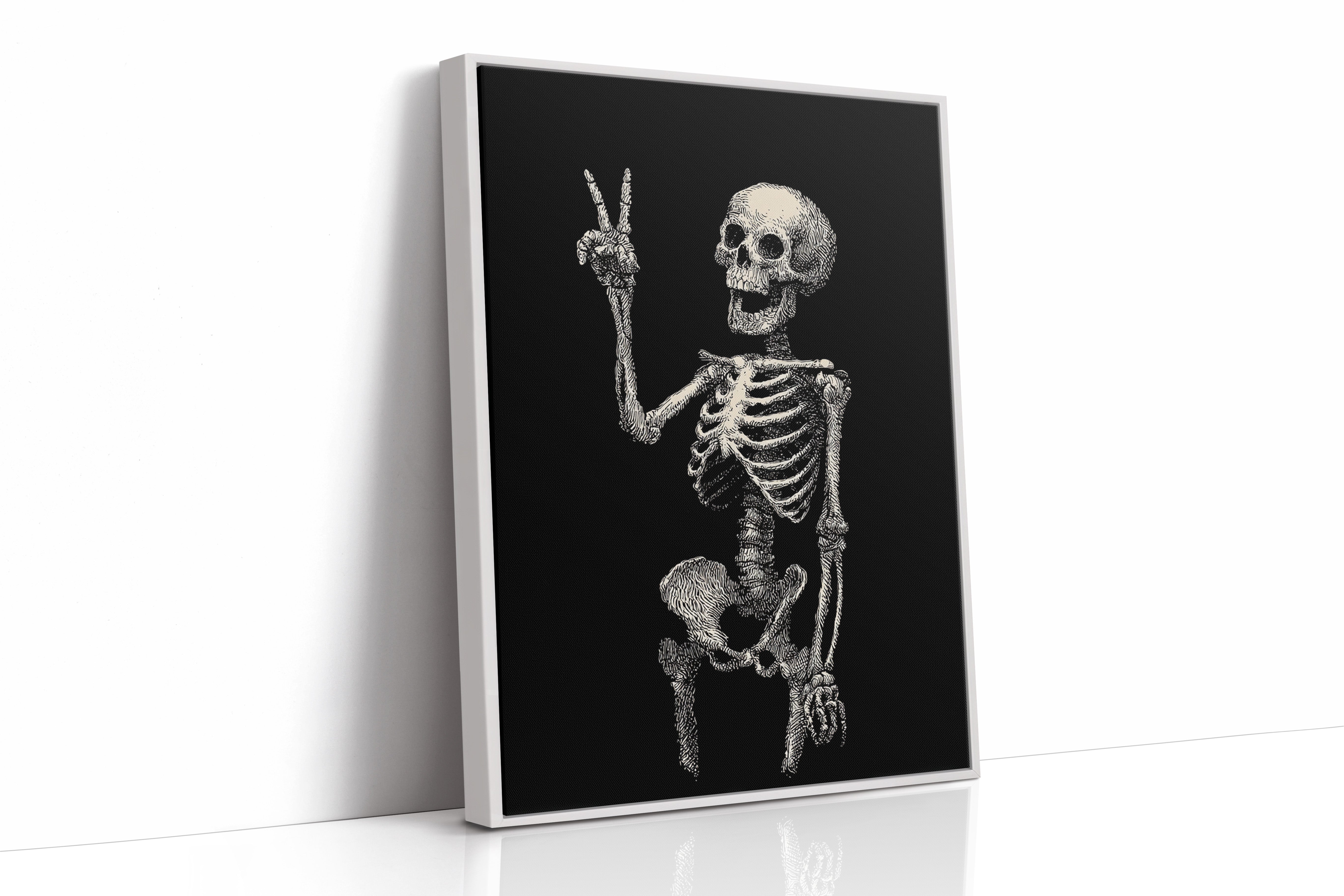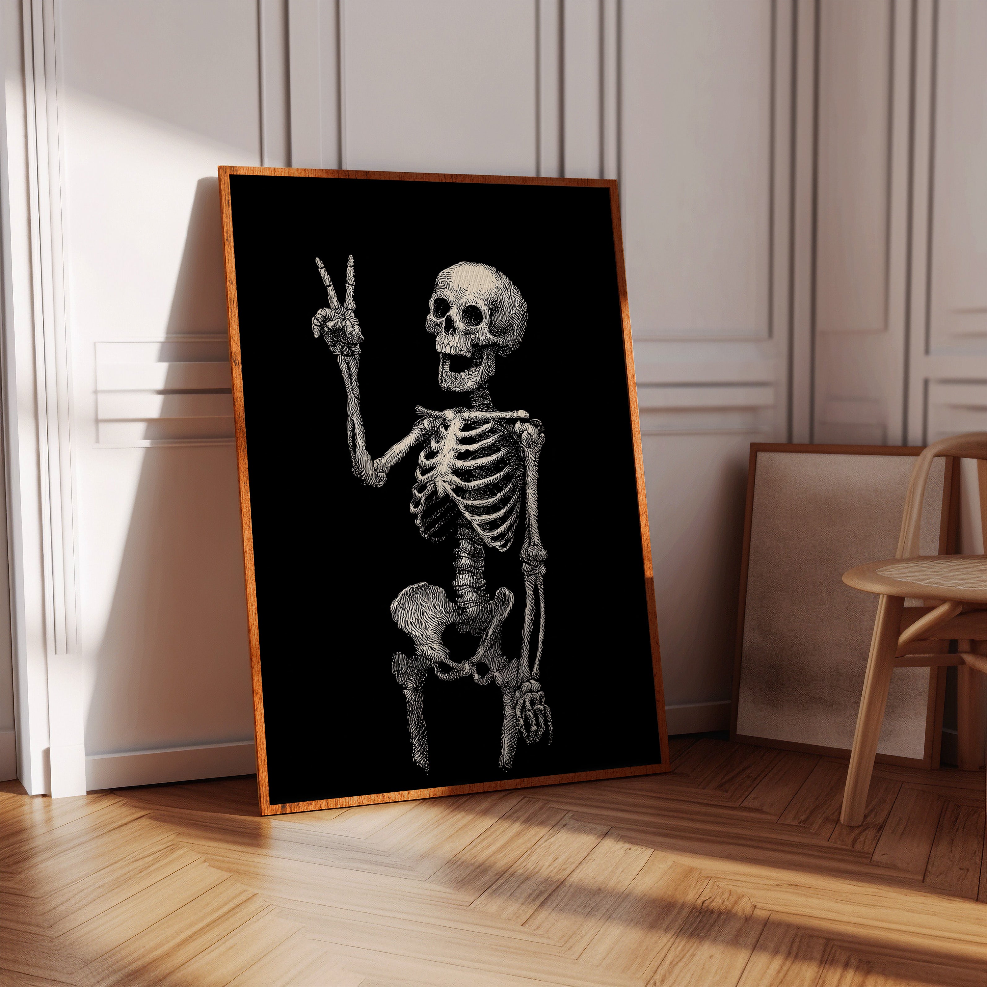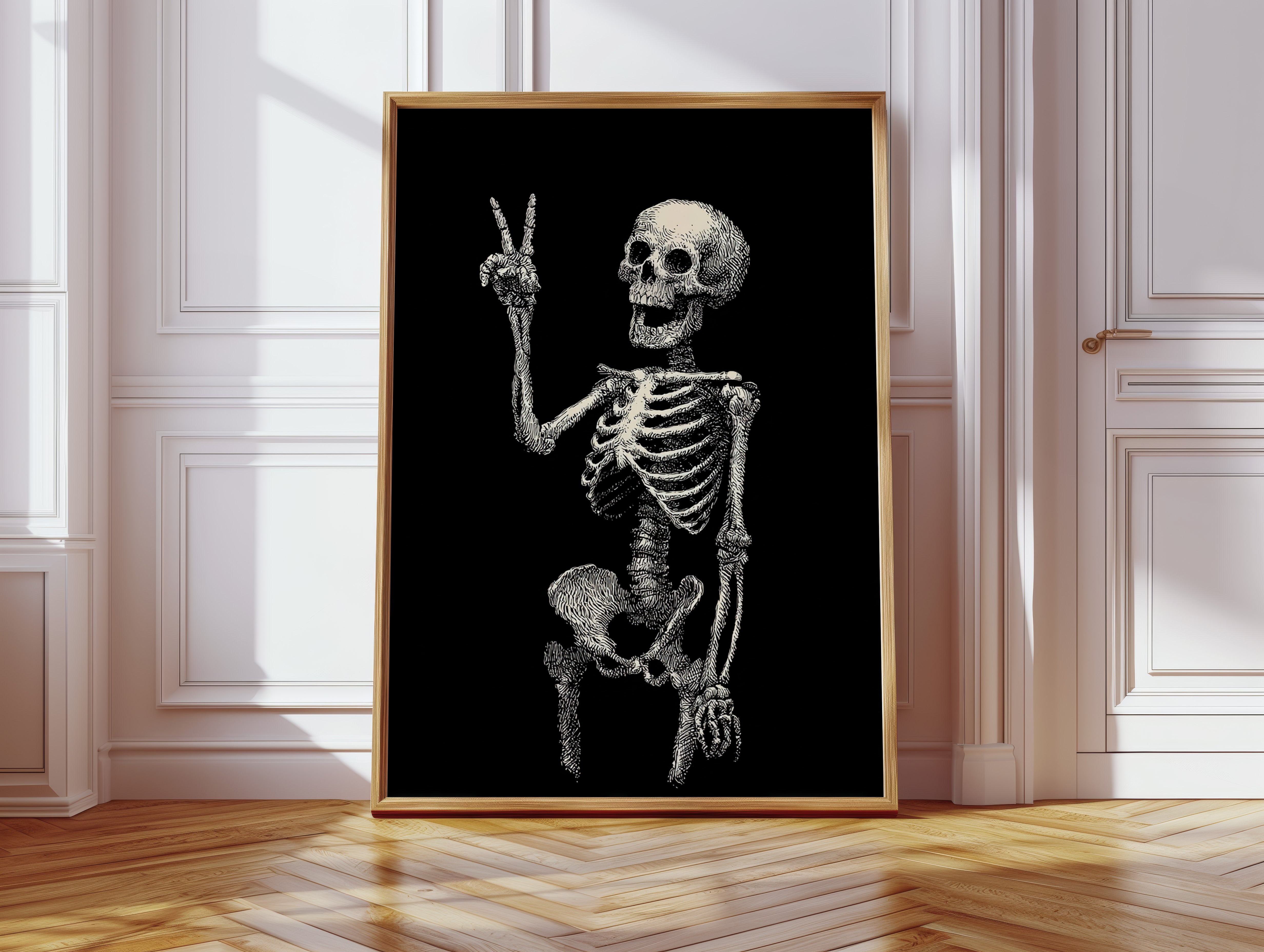 In a moment suspended between realms, a skeleton raises its hand in a gentle peace sign, exuding an unexpected warmth. This piece belongs to the Artisanal collection, where the macabre meets the whimsical. Lines intricately drawn bring life to bones, transforming the eerie into a celebration of existence, reminding us that joy can flourish in the most unlikely places. Imagine this striking figure illuminating a cozy reading nook or adding character to a home office, inviting curiosity and conversation.