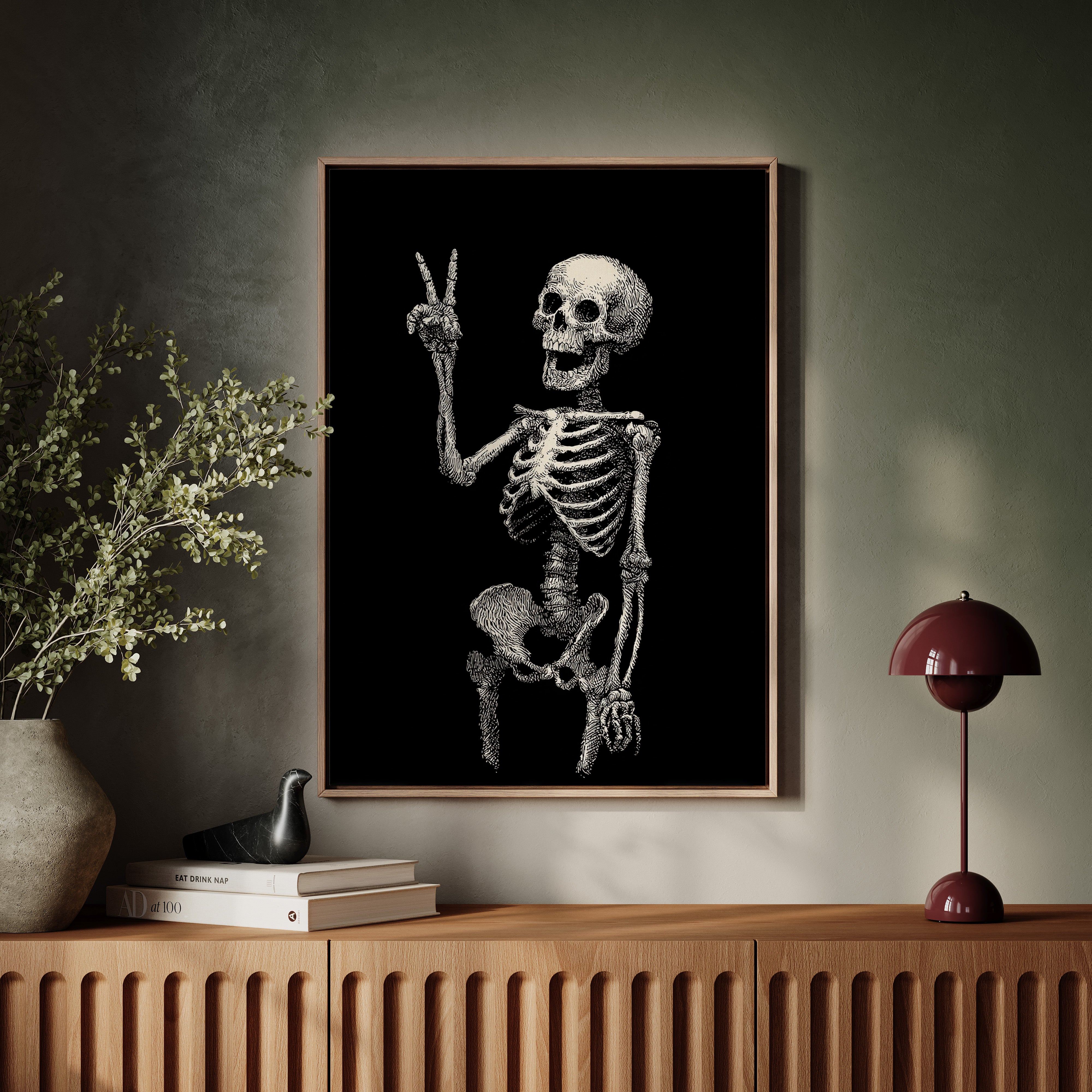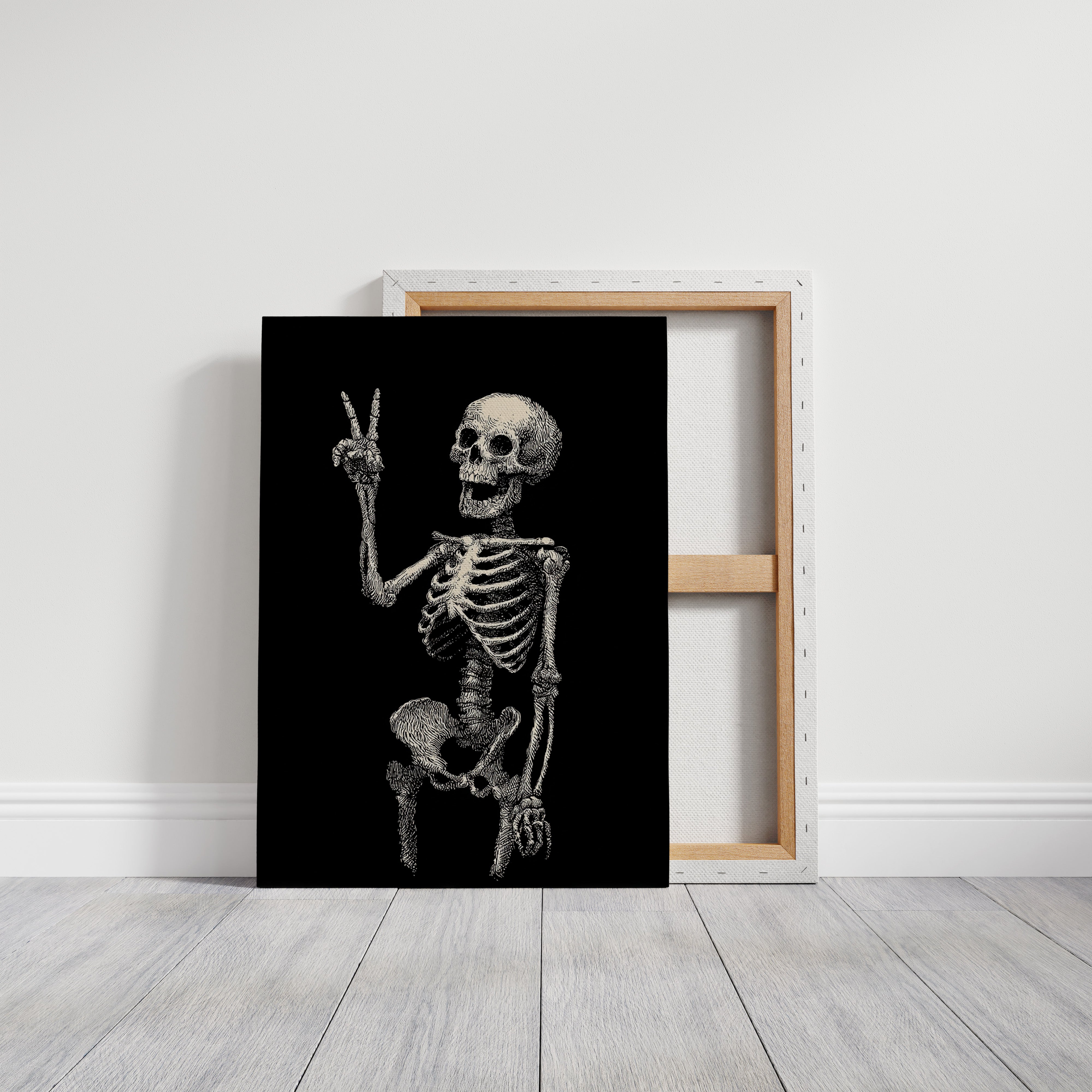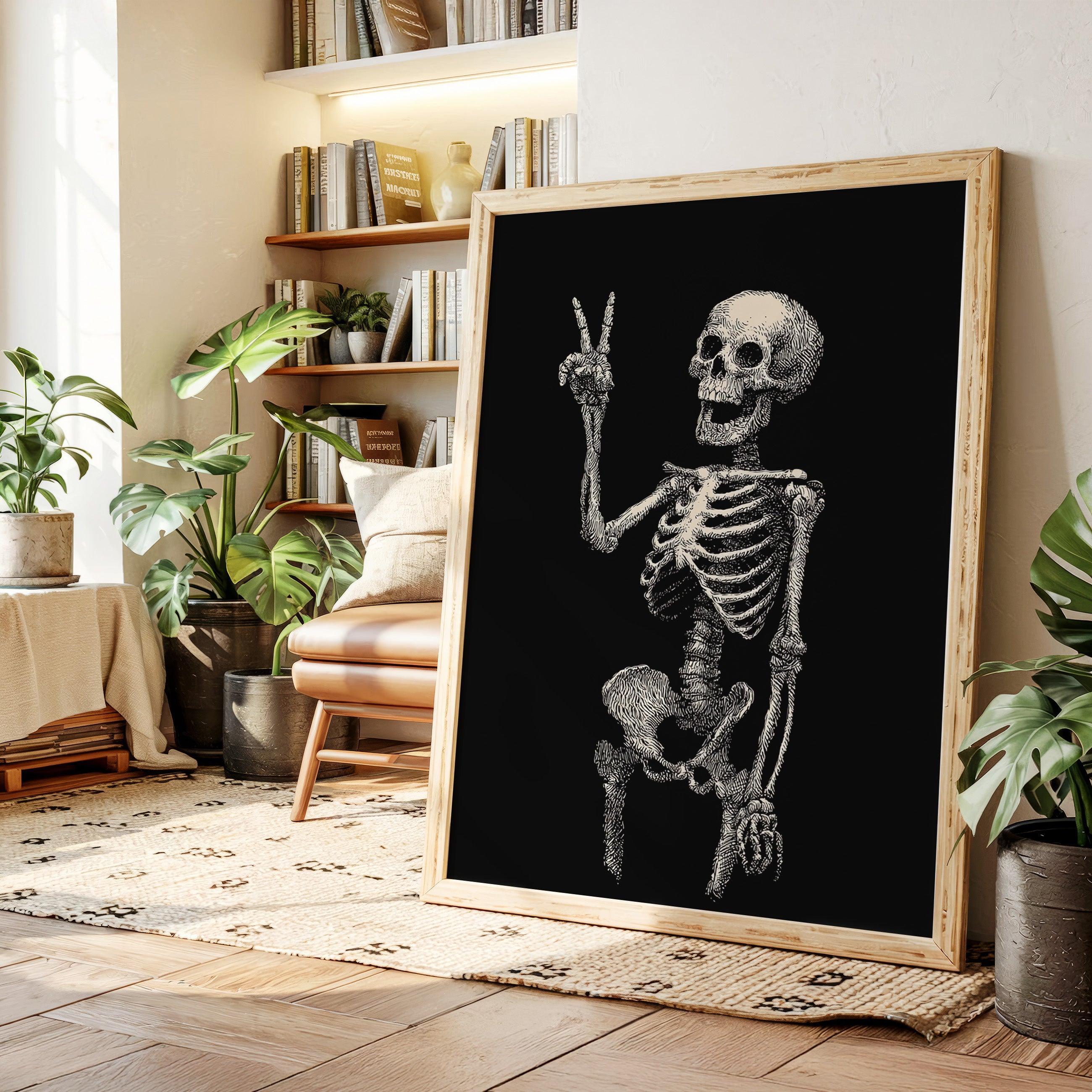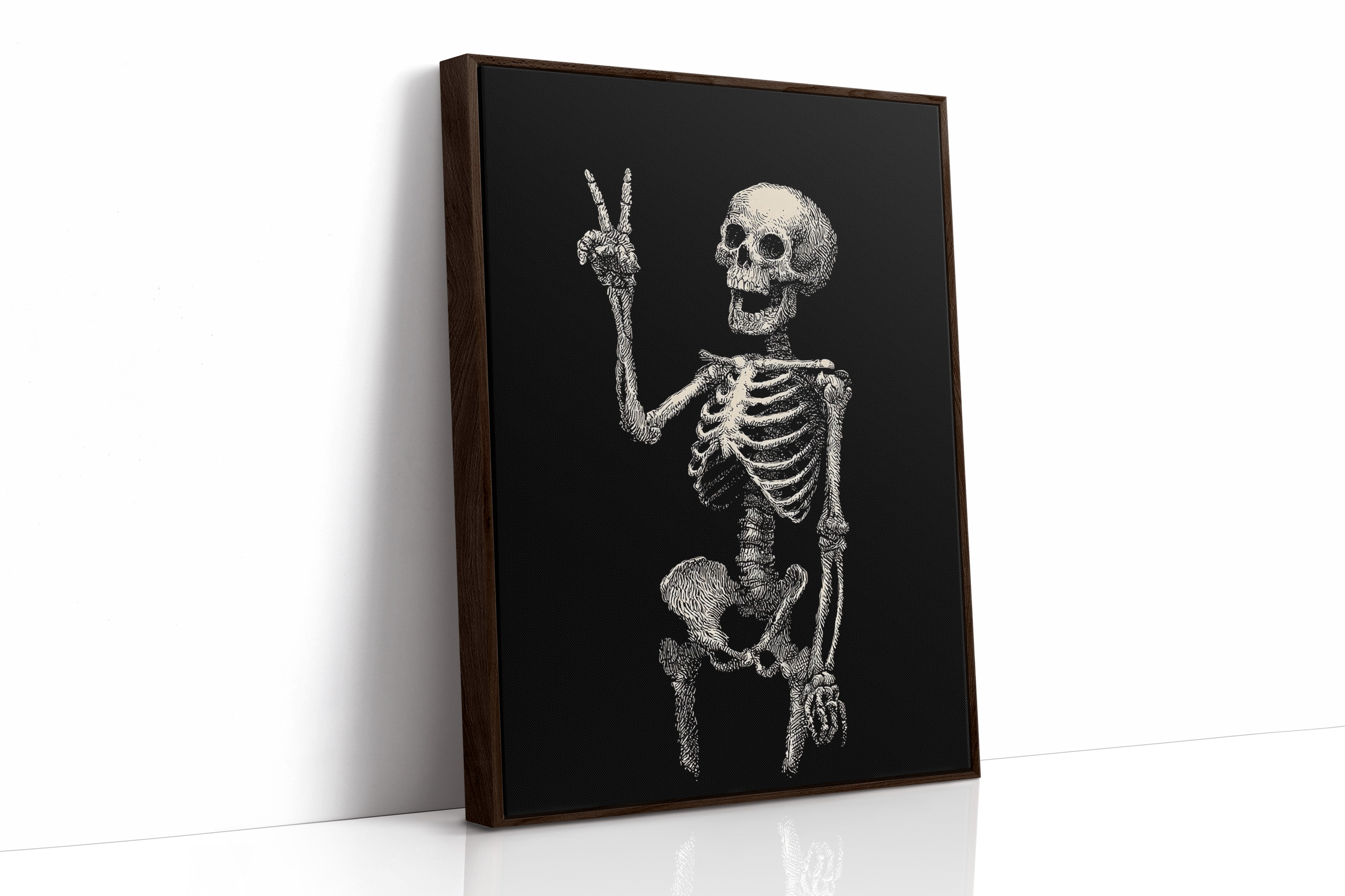 In a moment suspended between realms, a skeleton raises its hand in a gentle peace sign, exuding an unexpected warmth. This piece belongs to the Artisanal collection, where the macabre meets the whimsical. Lines intricately drawn bring life to bones, transforming the eerie into a celebration of existence, reminding us that joy can flourish in the most unlikely places. Imagine this striking figure illuminating a cozy reading nook or adding character to a home office, inviting curiosity and conversation.