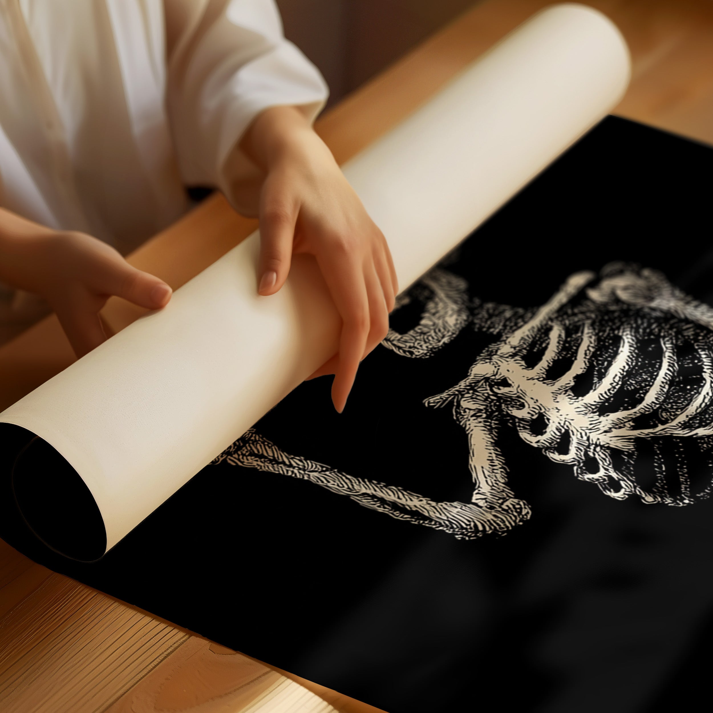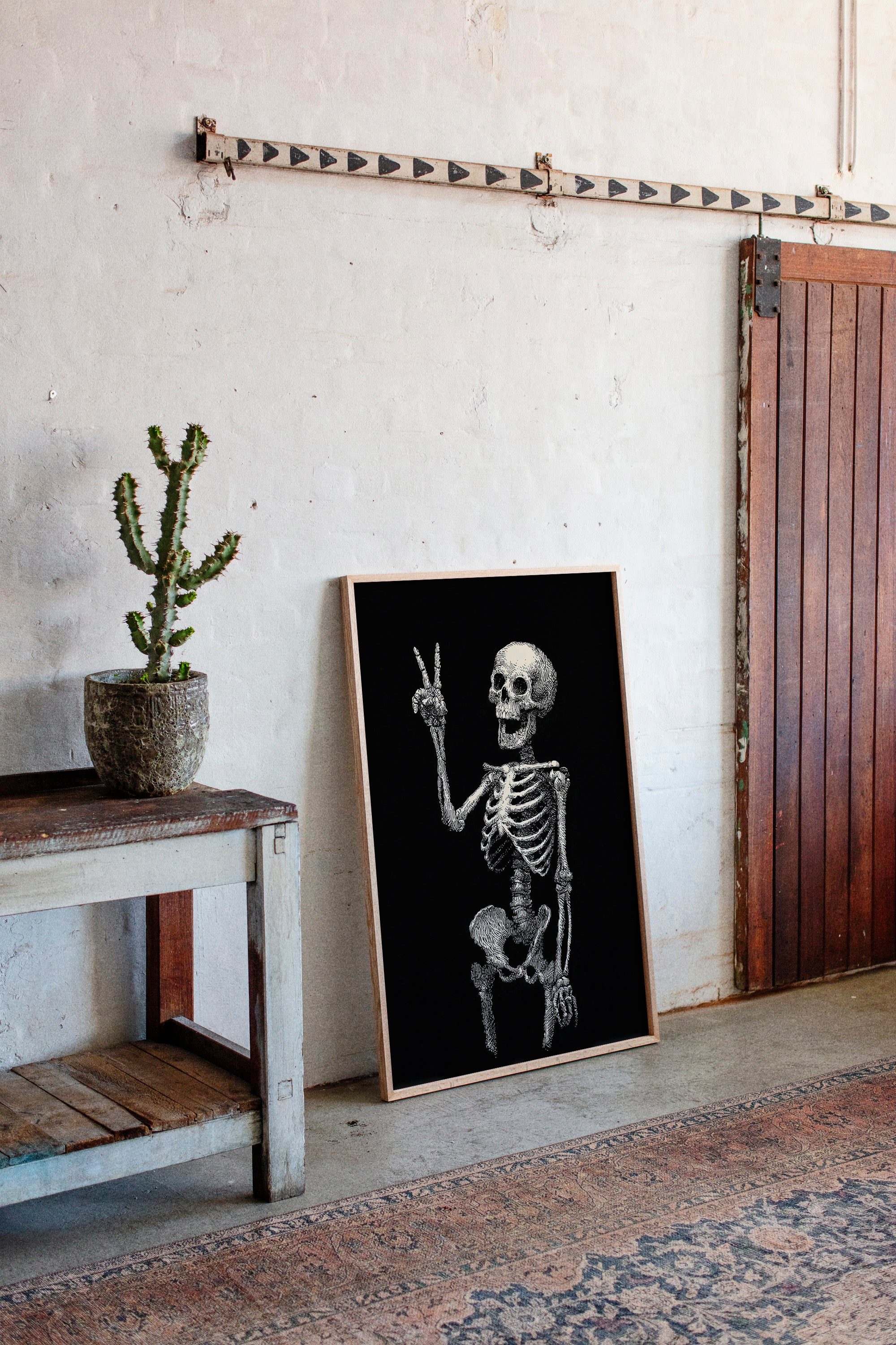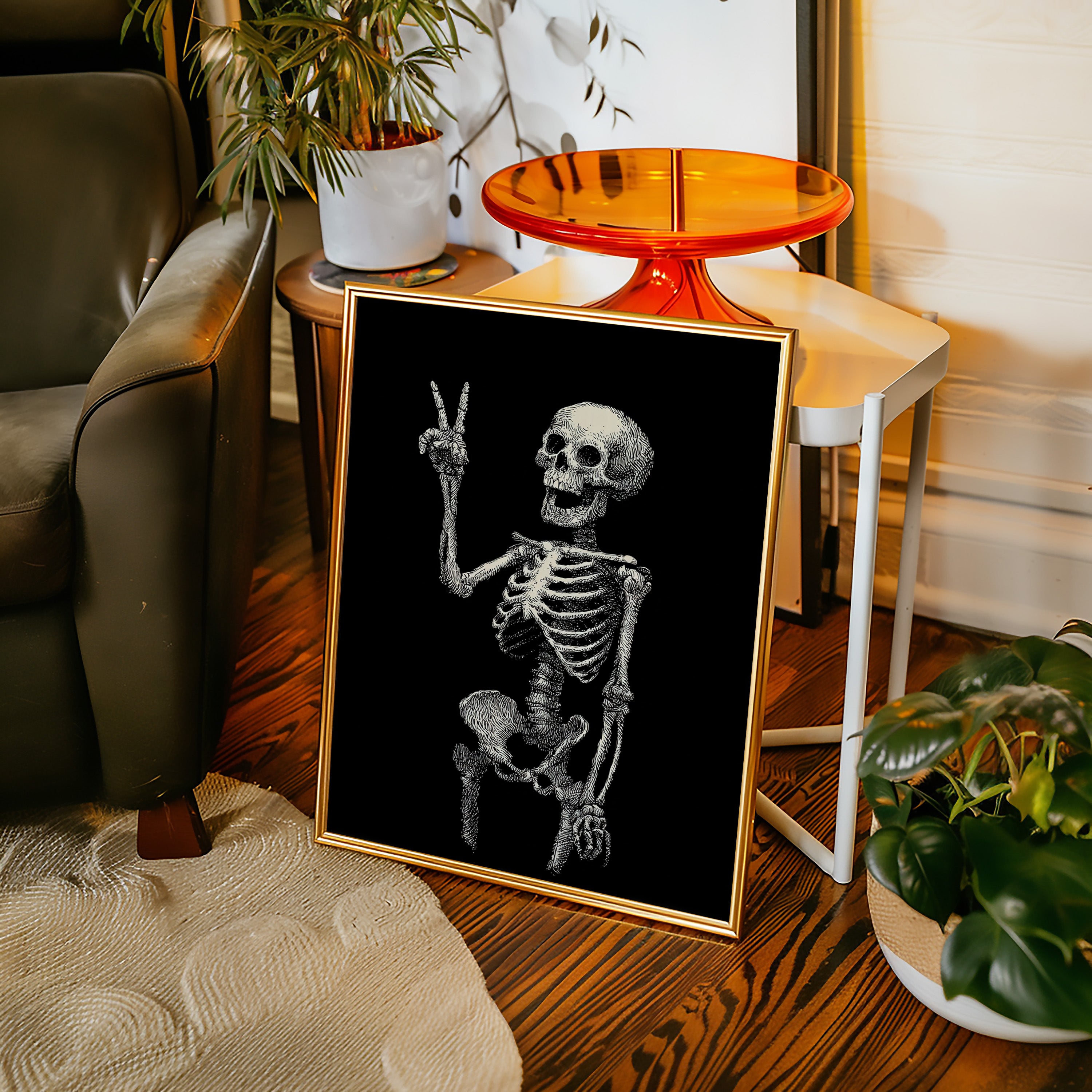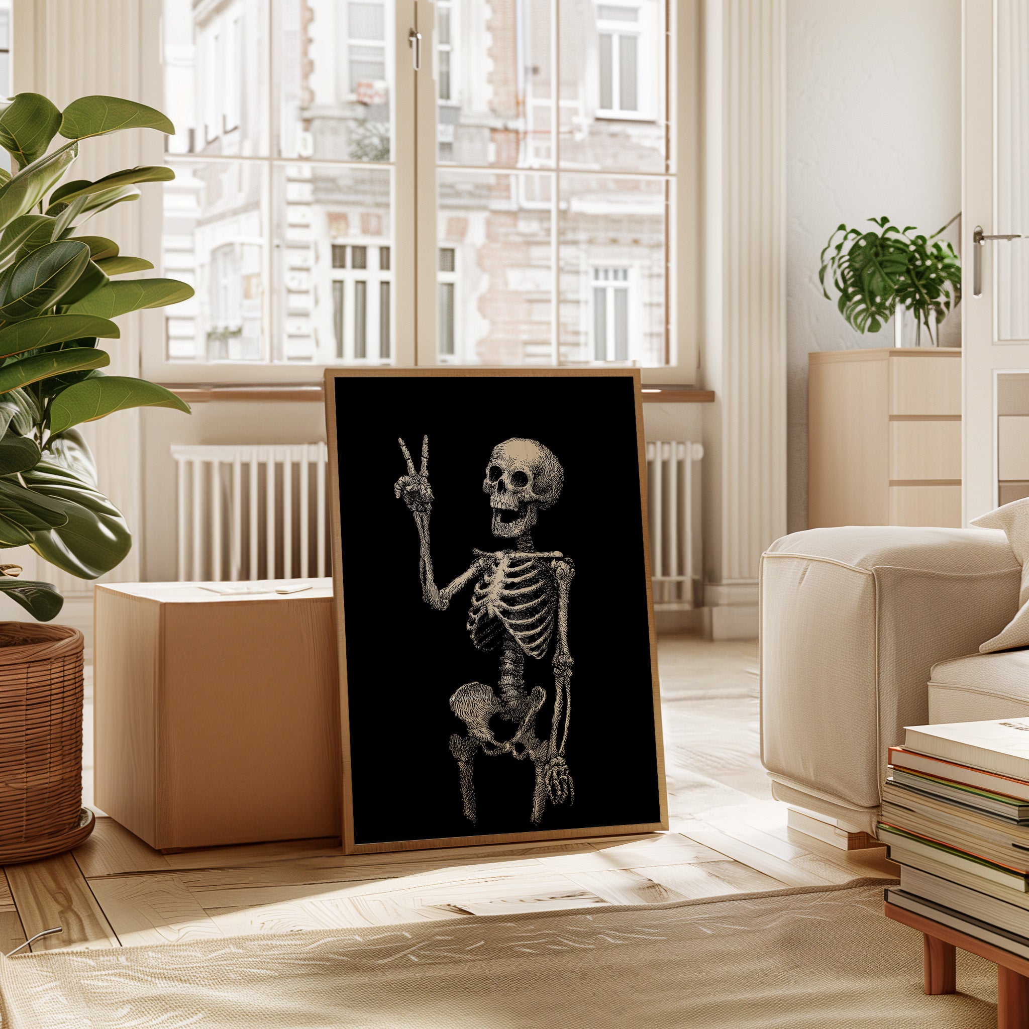 In a moment suspended between realms, a skeleton raises its hand in a gentle peace sign, exuding an unexpected warmth. This piece belongs to the Artisanal collection, where the macabre meets the whimsical. Lines intricately drawn bring life to bones, transforming the eerie into a celebration of existence, reminding us that joy can flourish in the most unlikely places. Imagine this striking figure illuminating a cozy reading nook or adding character to a home office, inviting curiosity and conversation.