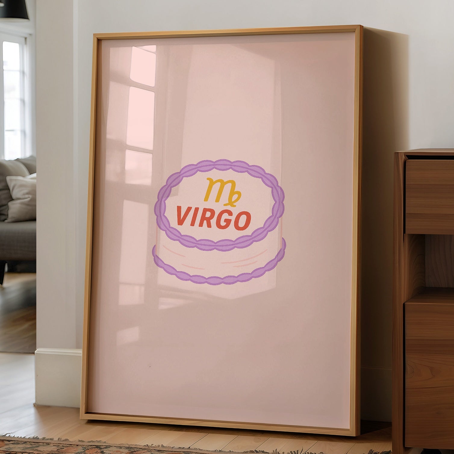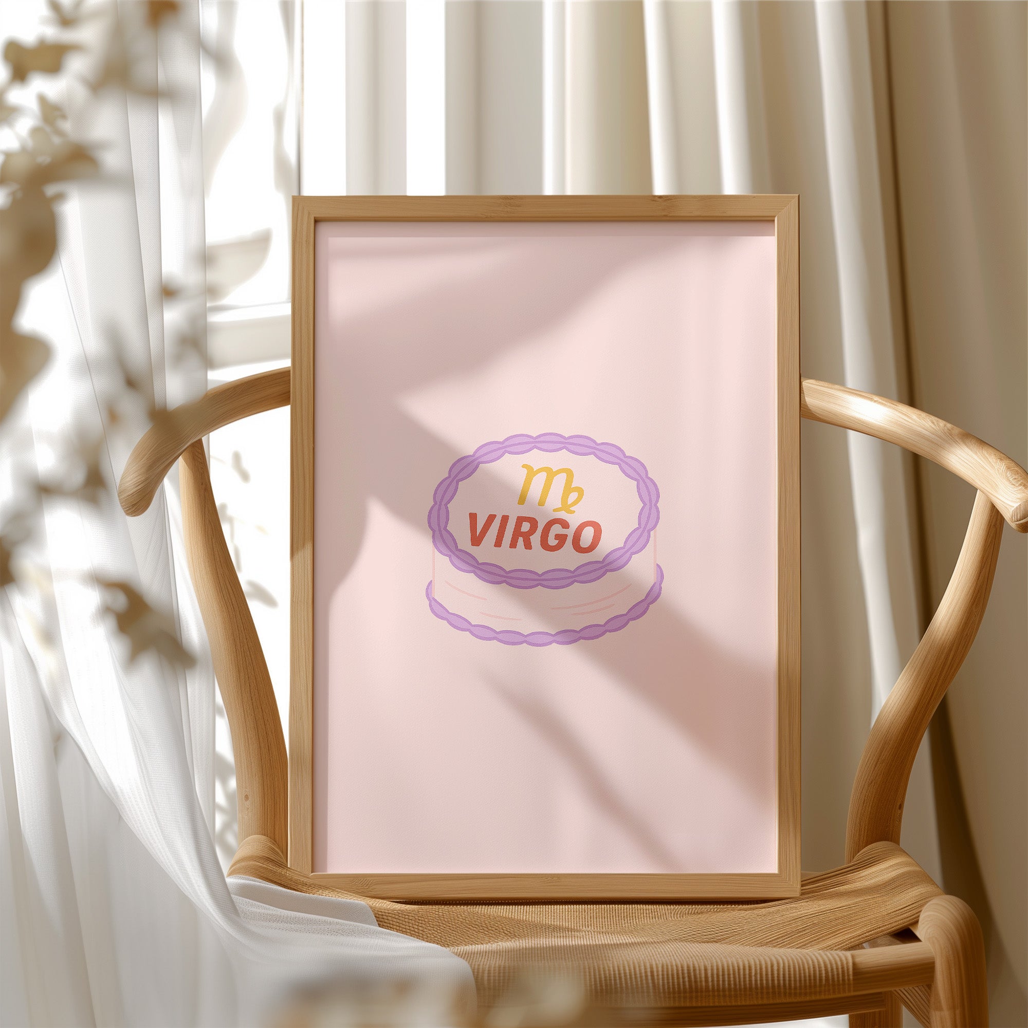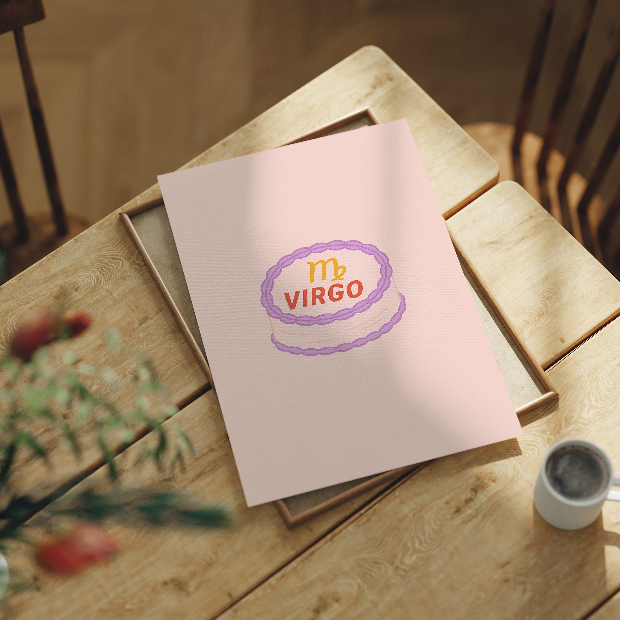 A minimalist illustration of a birthday cake with lavender frosting piped around the edges against a soft peach background. The cake is decorated with the Virgo zodiac symbol in golden yellow and "VIRGO" in bold coral lettering. This whimsical yet elegant design captures the essence of Virgo season celebrations, blending astrological symbolism with sweet indulgence. The pastel color palette creates a contemporary aesthetic that speaks to modern astrology enthusiasts and those who appreciate clean, thoughtful design.