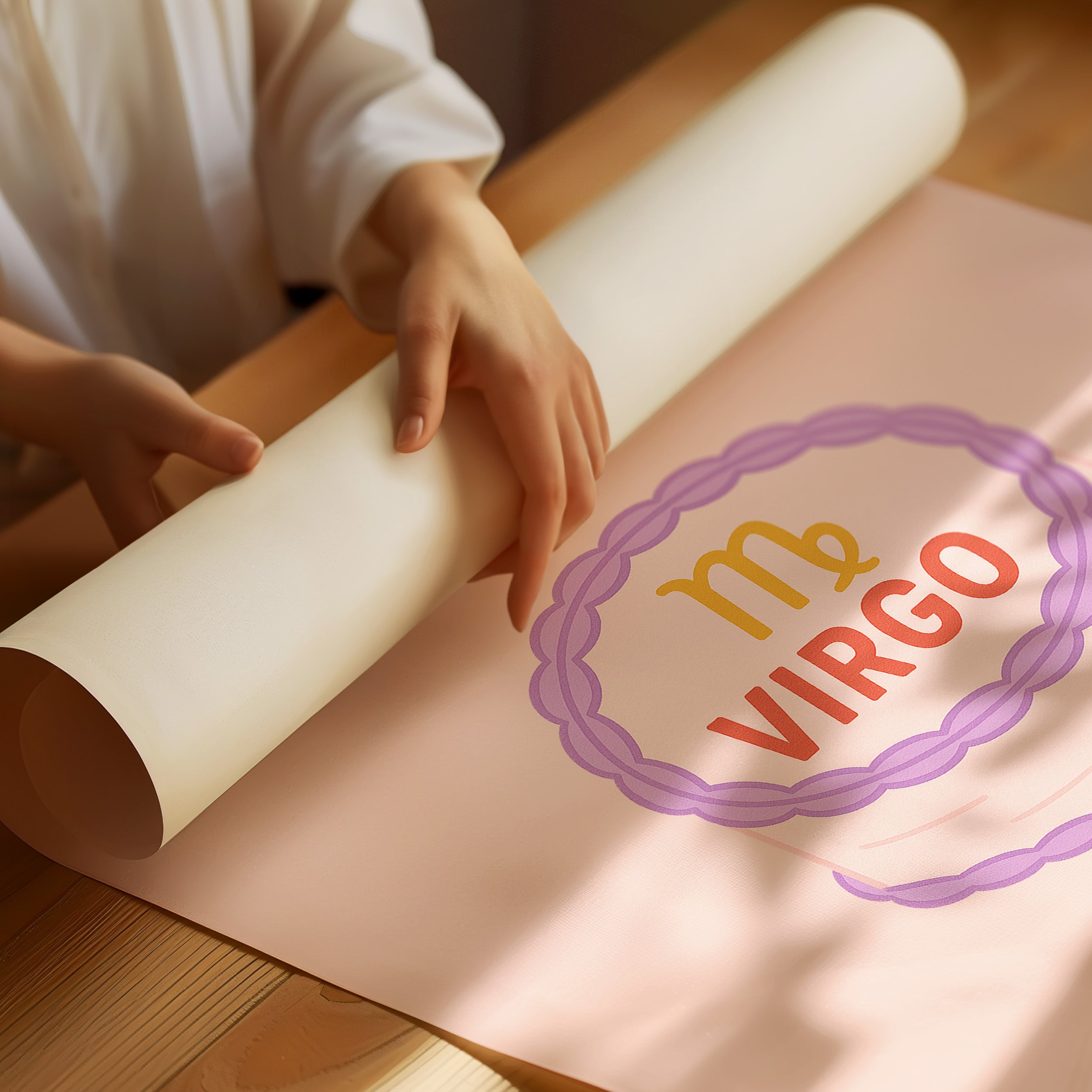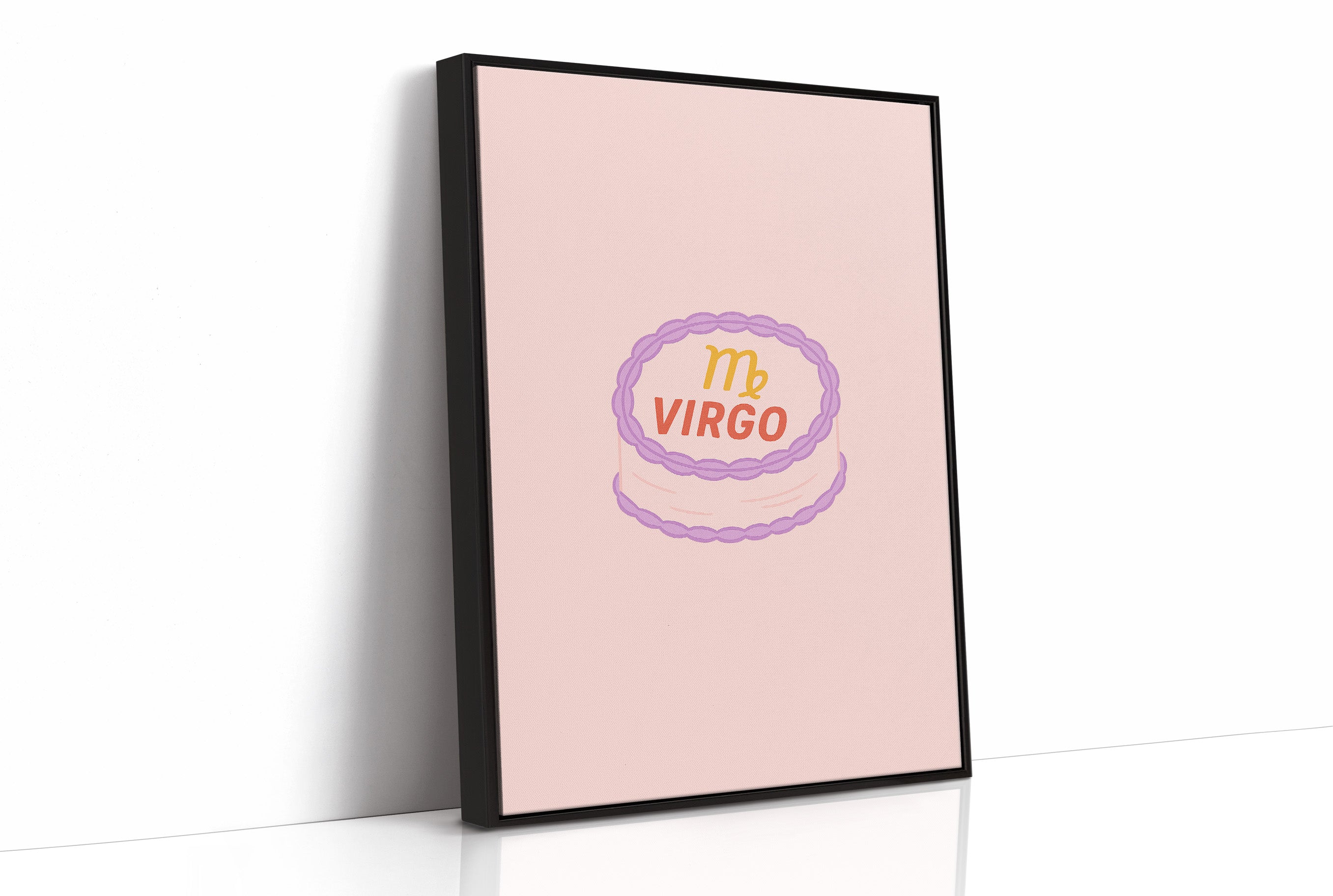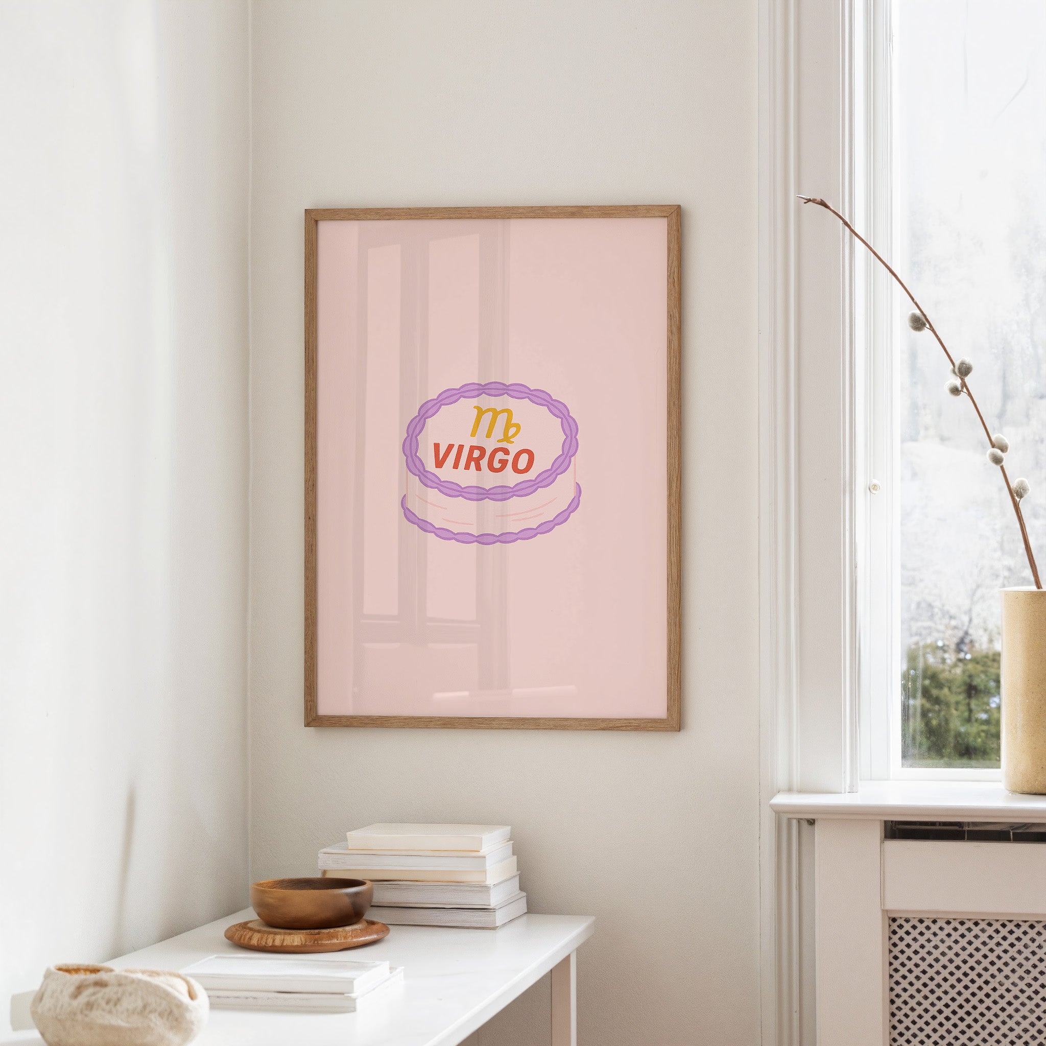 A minimalist illustration of a birthday cake with lavender frosting piped around the edges against a soft peach background. The cake is decorated with the Virgo zodiac symbol in golden yellow and "VIRGO" in bold coral lettering. This whimsical yet elegant design captures the essence of Virgo season celebrations, blending astrological symbolism with sweet indulgence. The pastel color palette creates a contemporary aesthetic that speaks to modern astrology enthusiasts and those who appreciate clean, thoughtful design.