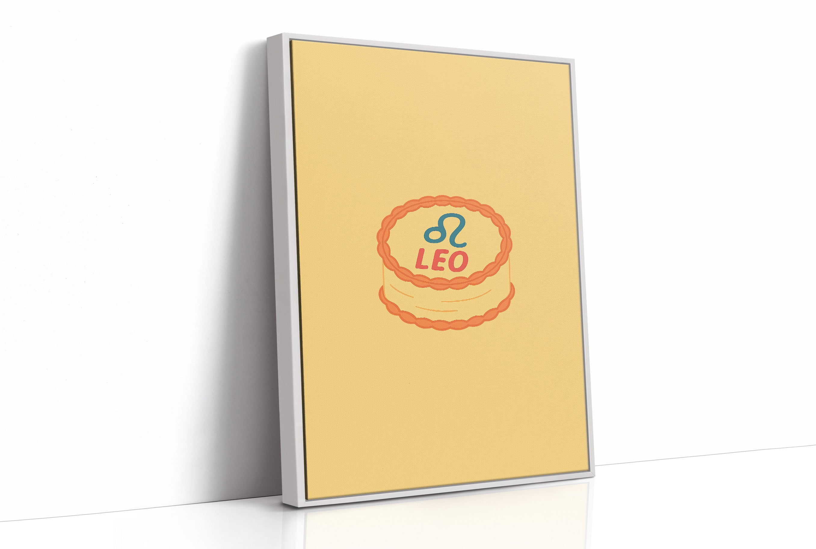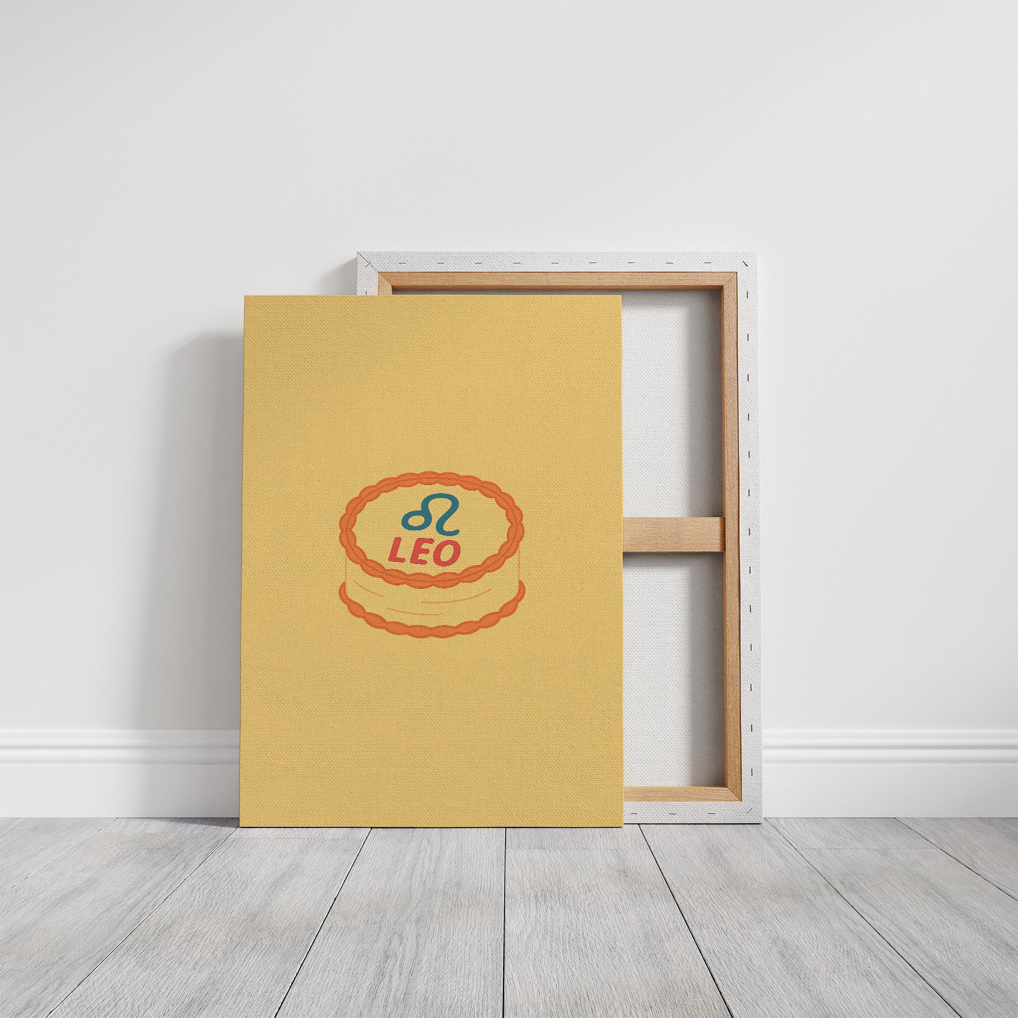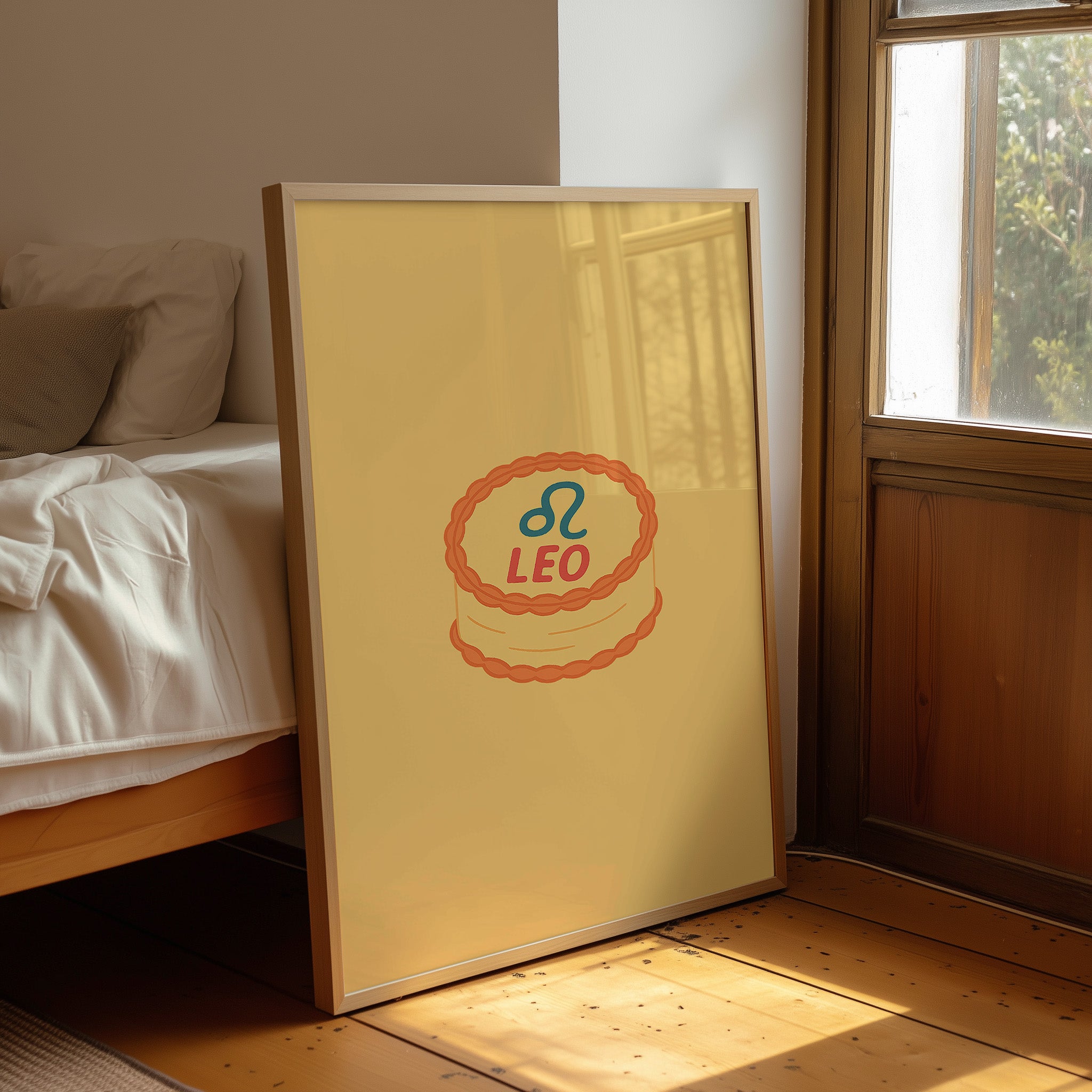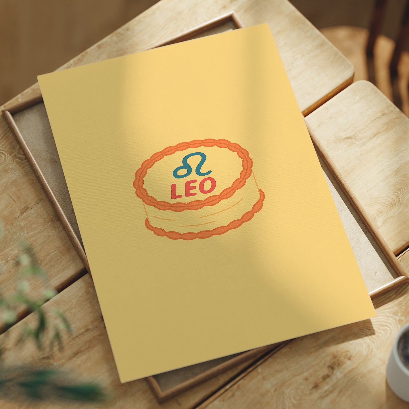 A minimalist illustration of a round cake with coral-orange frosted edges set against a warm yellow background. The cake features the Leo zodiac symbol in teal blue and the word "LEO" in bold red letters on top. This contemporary design merges astrology with celebratory dessert imagery, creating a simple yet striking visual that captures the fiery, confident essence associated with the Leo star sign. The clean lines and limited color palette give the piece a modern, graphic feel while maintaining a playful warmth.