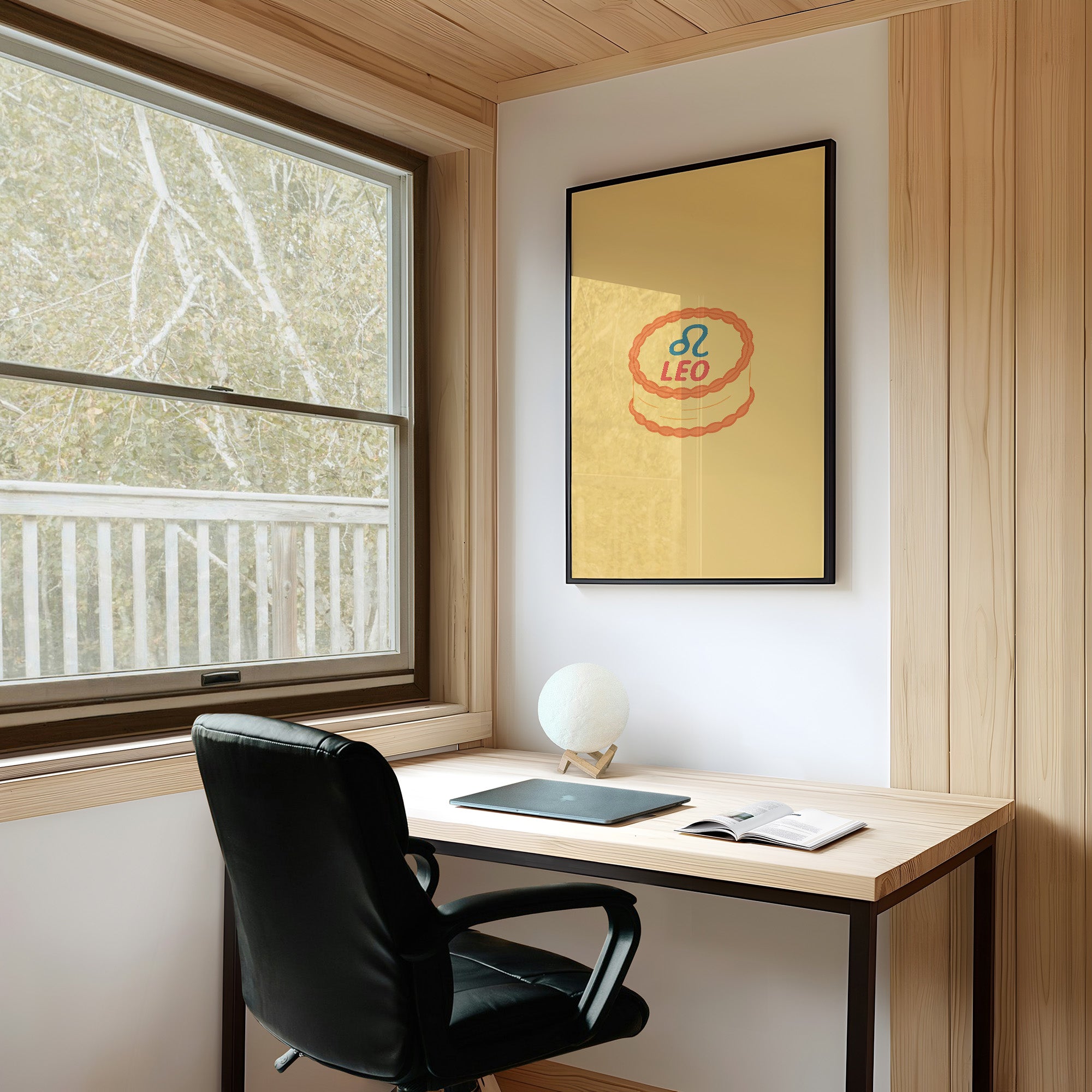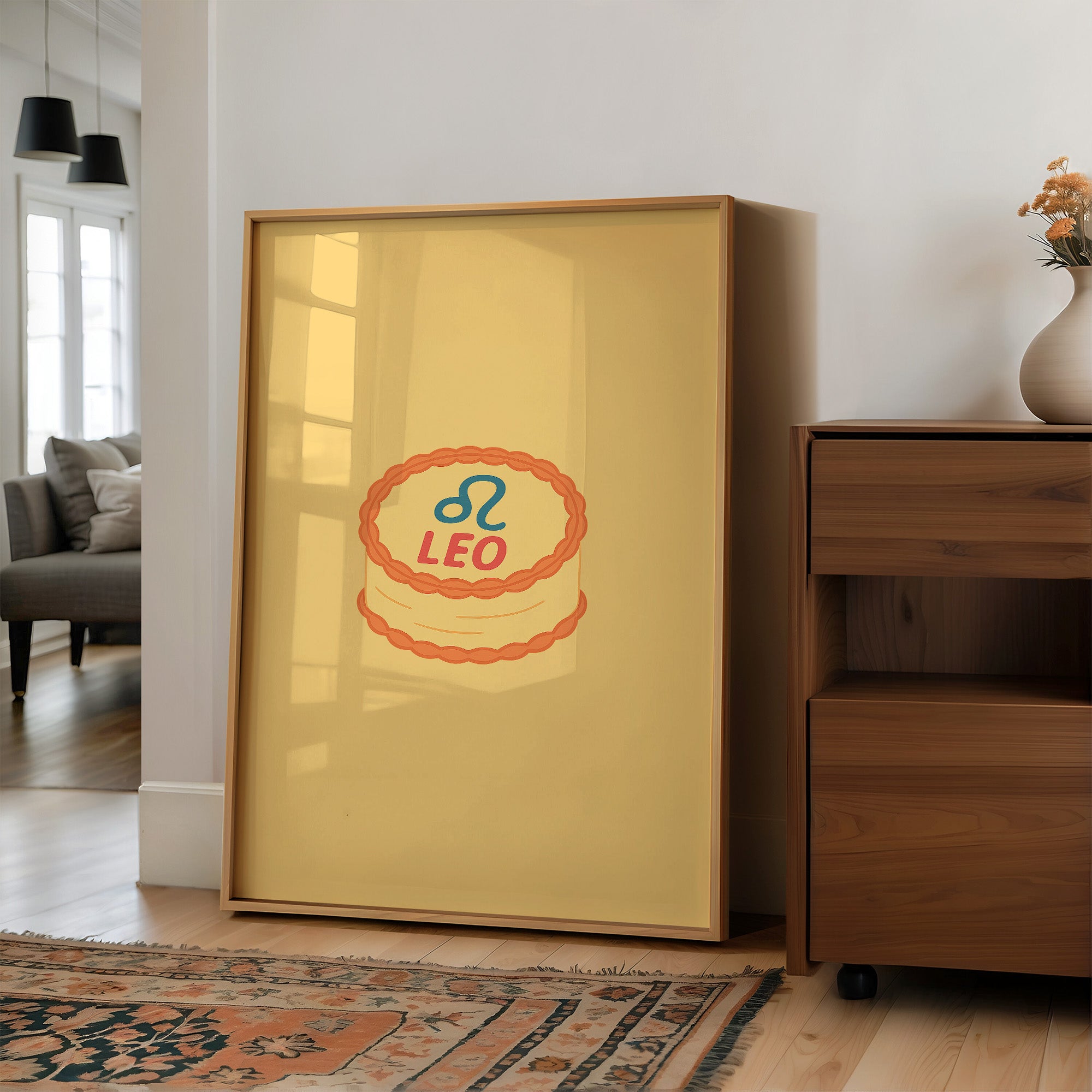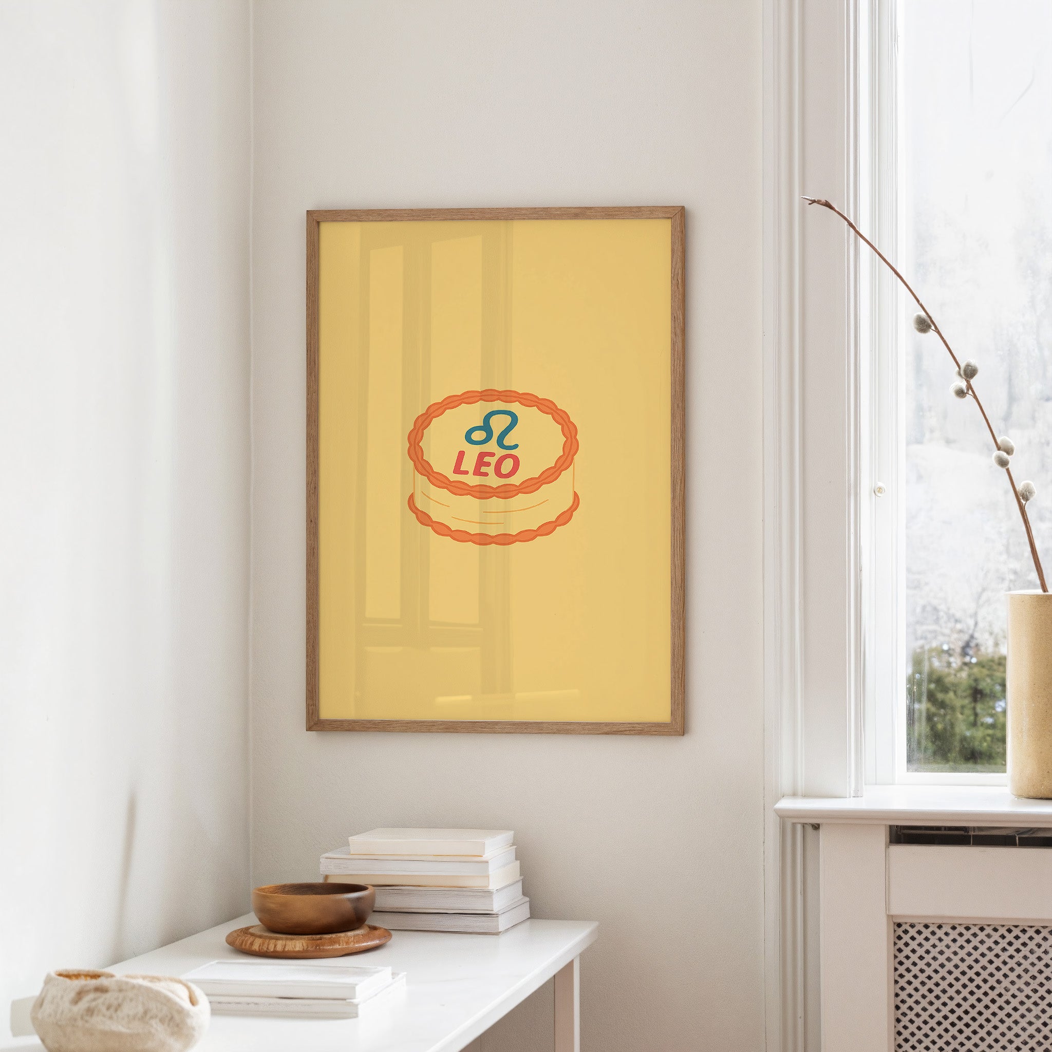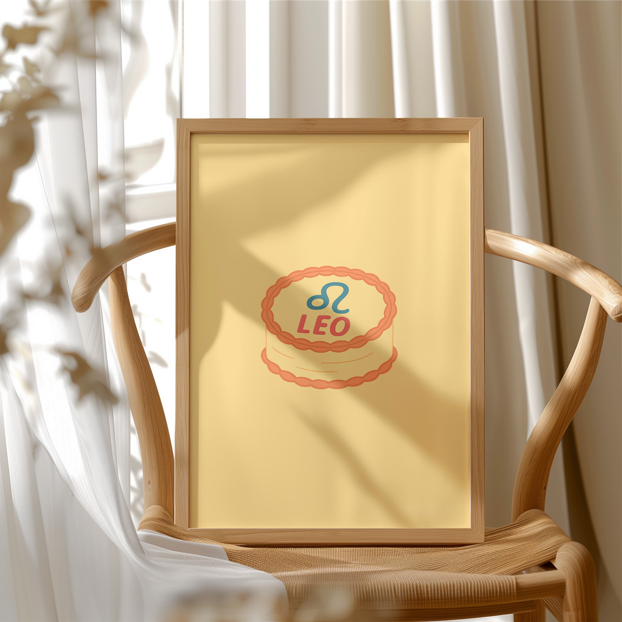 A minimalist illustration of a round cake with coral-orange frosted edges set against a warm yellow background. The cake features the Leo zodiac symbol in teal blue and the word "LEO" in bold red letters on top. This contemporary design merges astrology with celebratory dessert imagery, creating a simple yet striking visual that captures the fiery, confident essence associated with the Leo star sign. The clean lines and limited color palette give the piece a modern, graphic feel while maintaining a playful warmth.