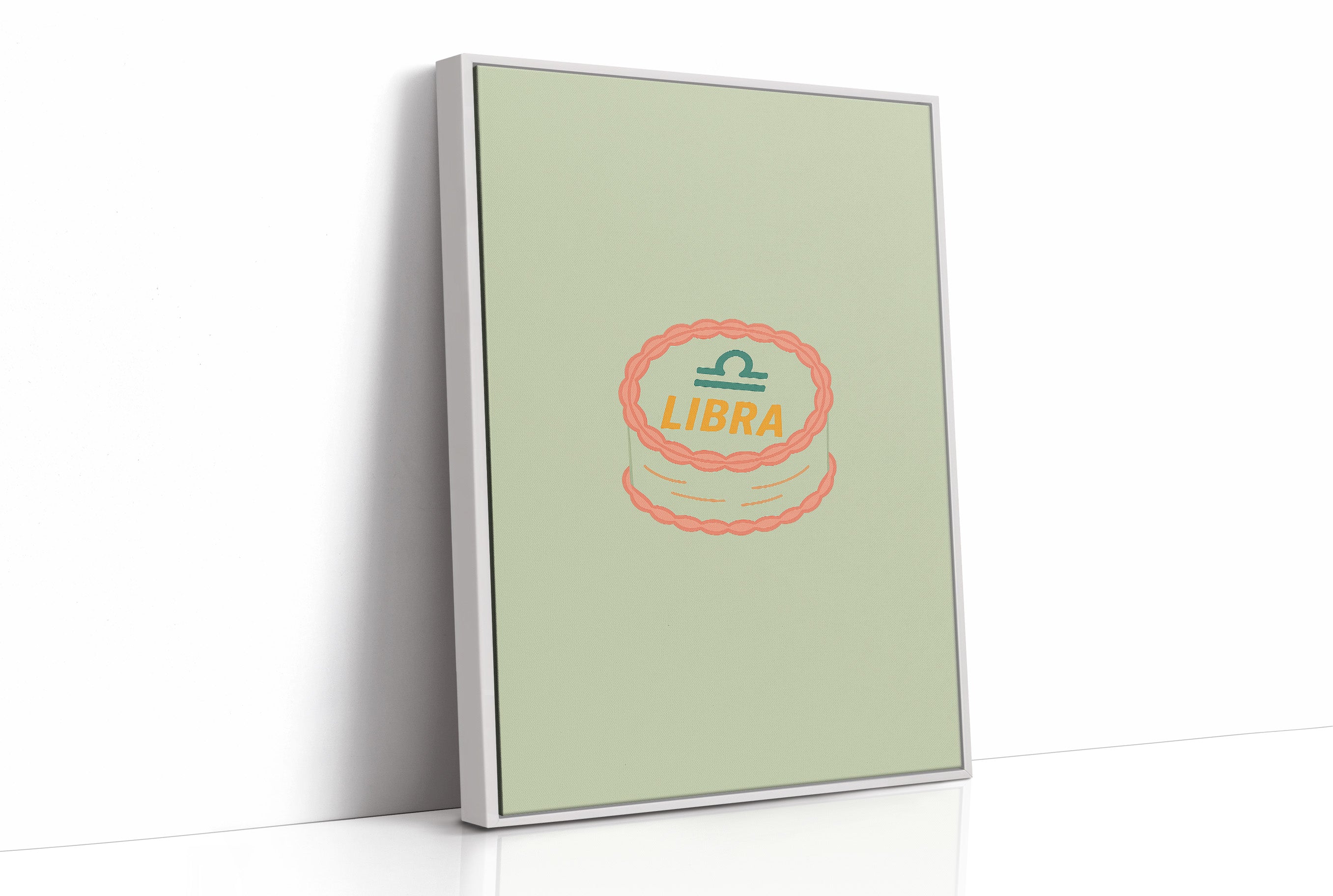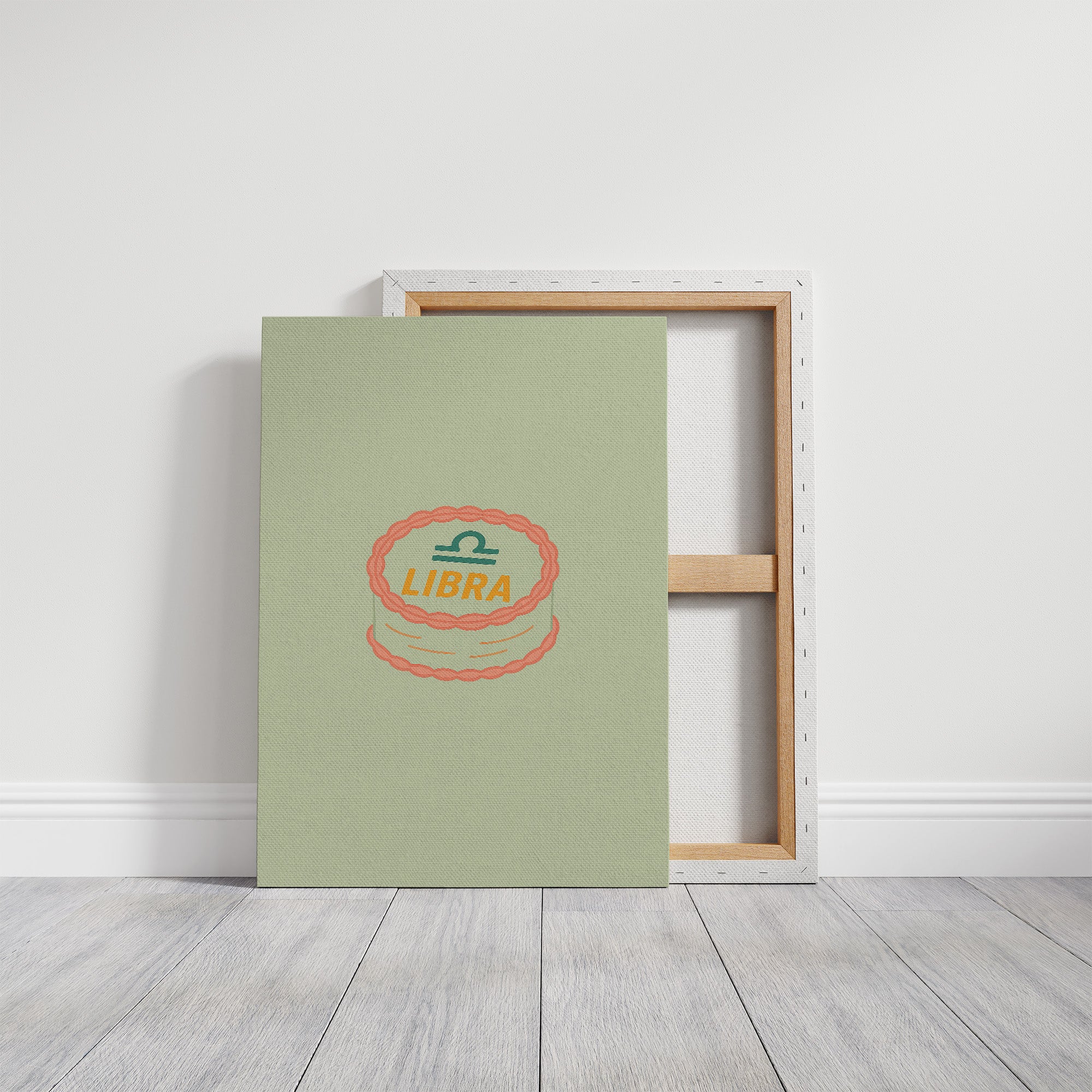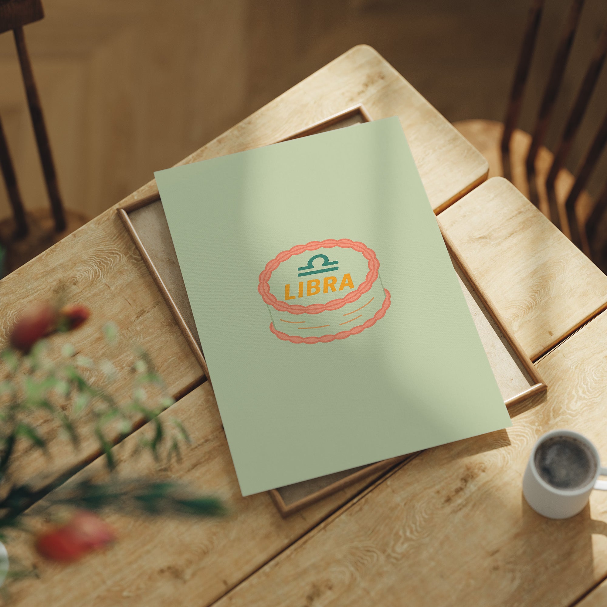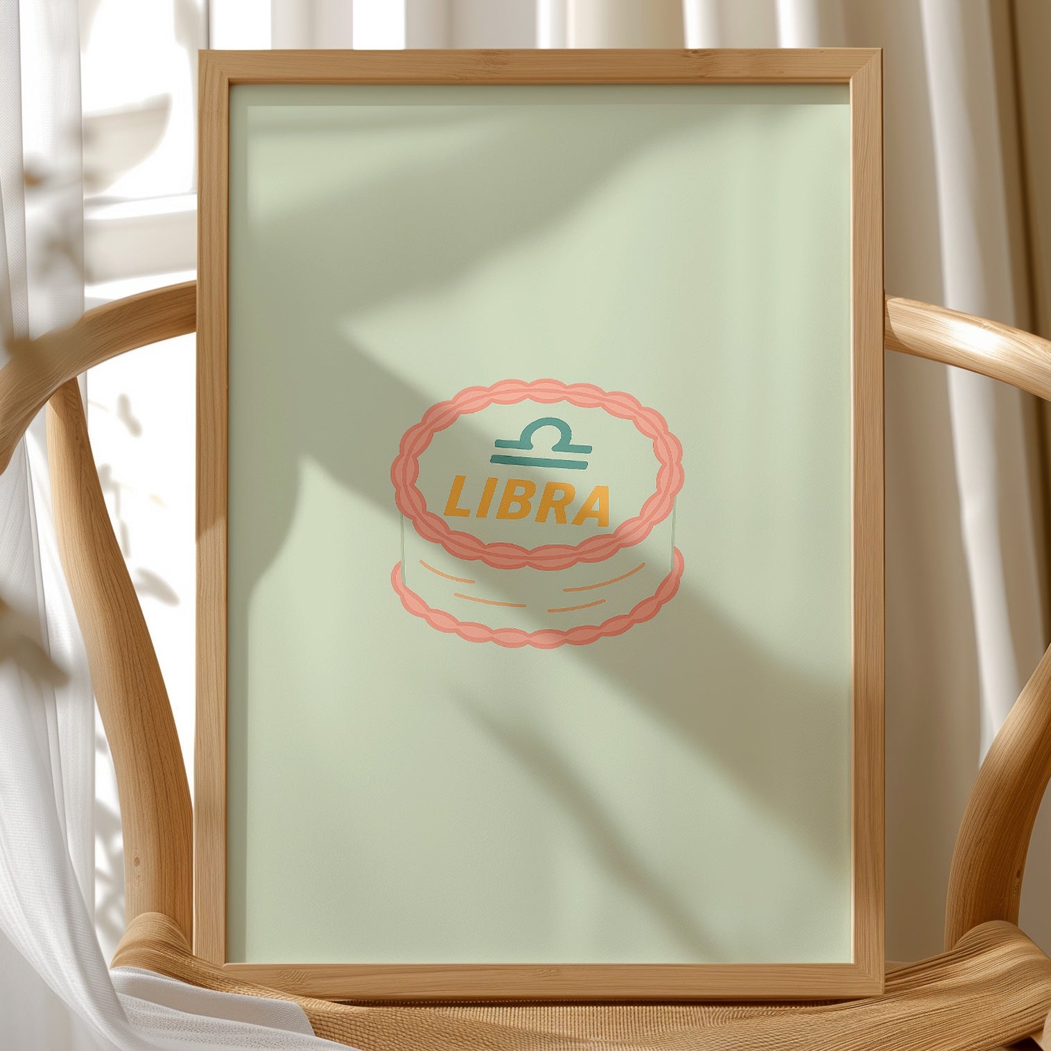 A minimalist illustration of a round cake decorated with coral-pink frosting and adorned with the Libra zodiac symbol. The cake features the word "LIBRA" in bold golden letters against a soft sage green background. The design marries the sweetness of celebration with astrological symbolism, representing harmony and equilibrium quintessential Libra traits. This contemporary piece blends pop art simplicity with cosmic significance, creating a playful yet meaningful representation of astrological identity.