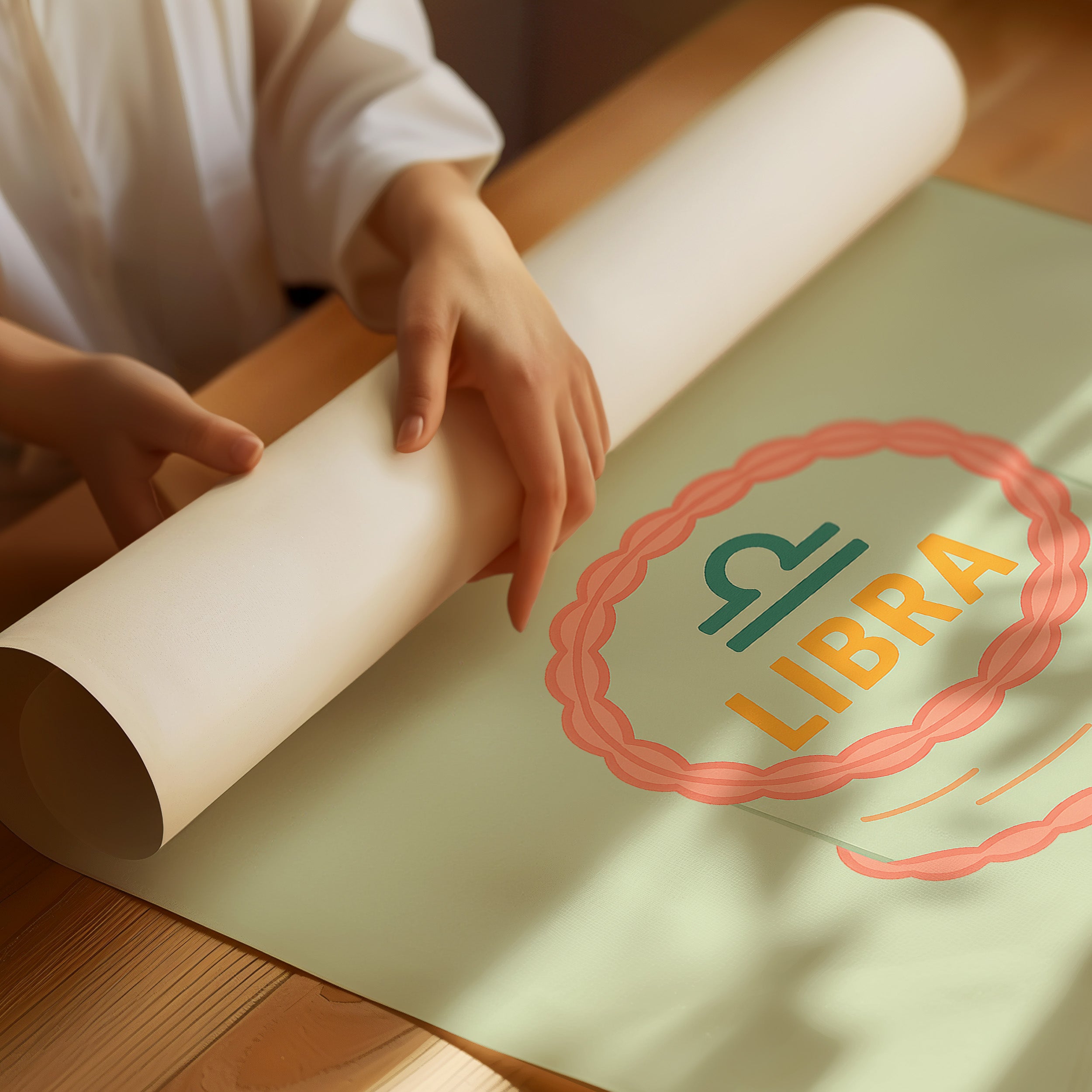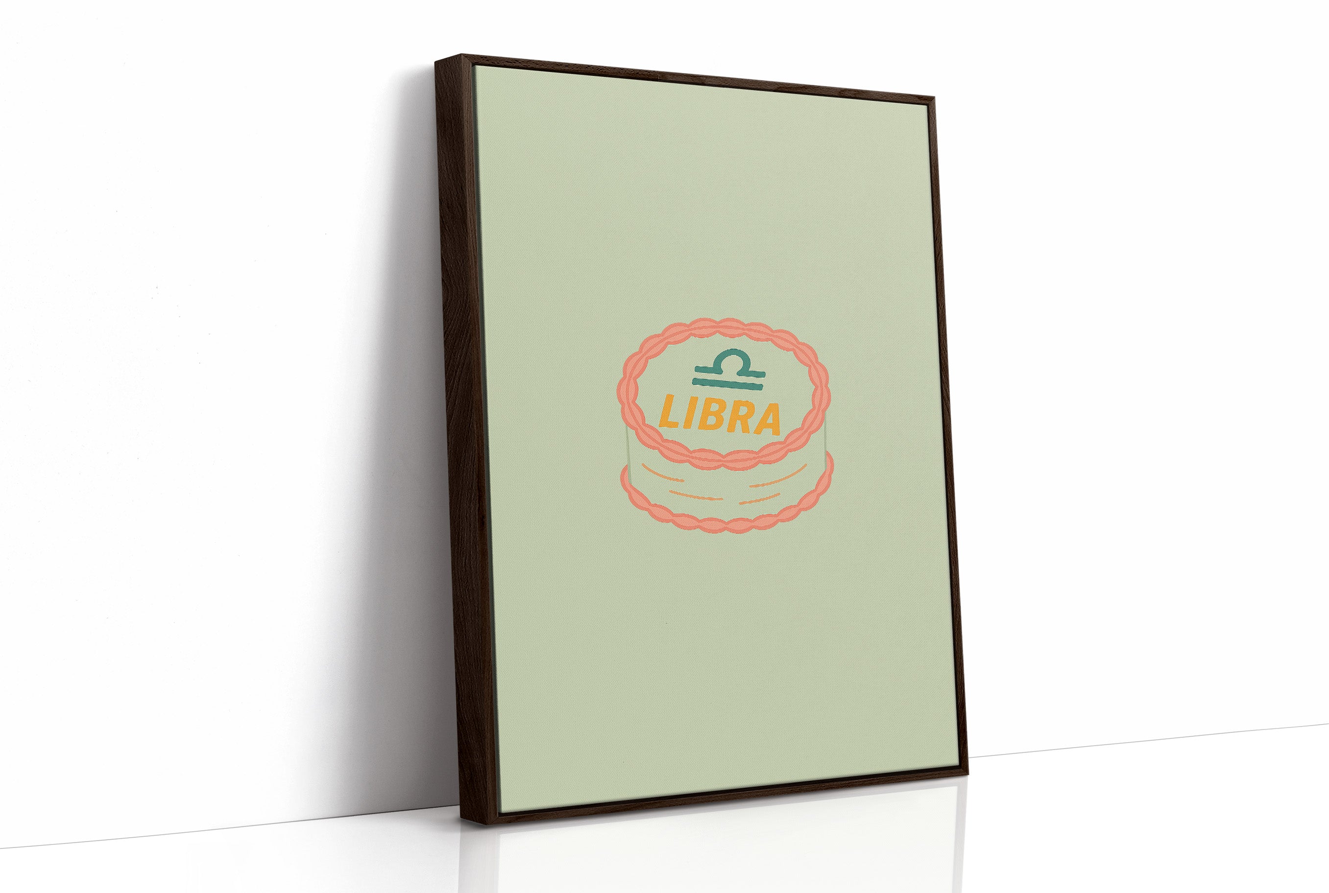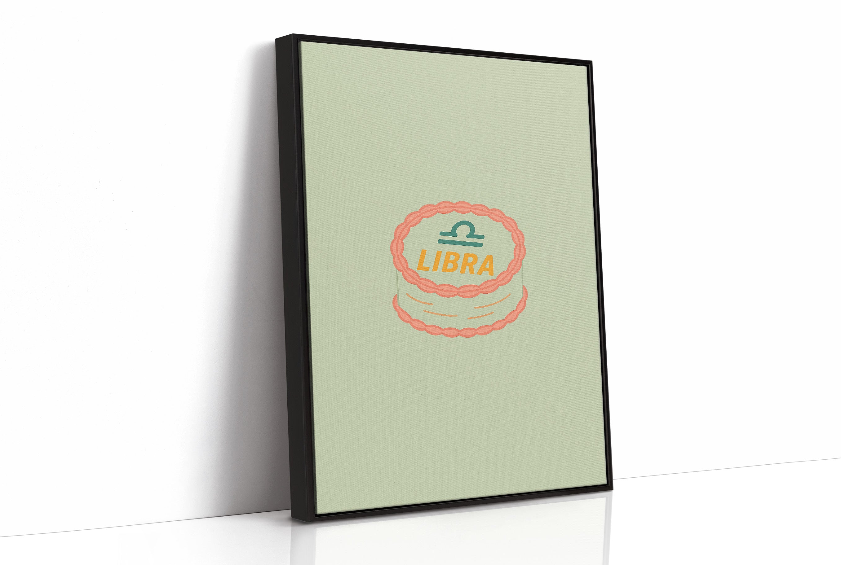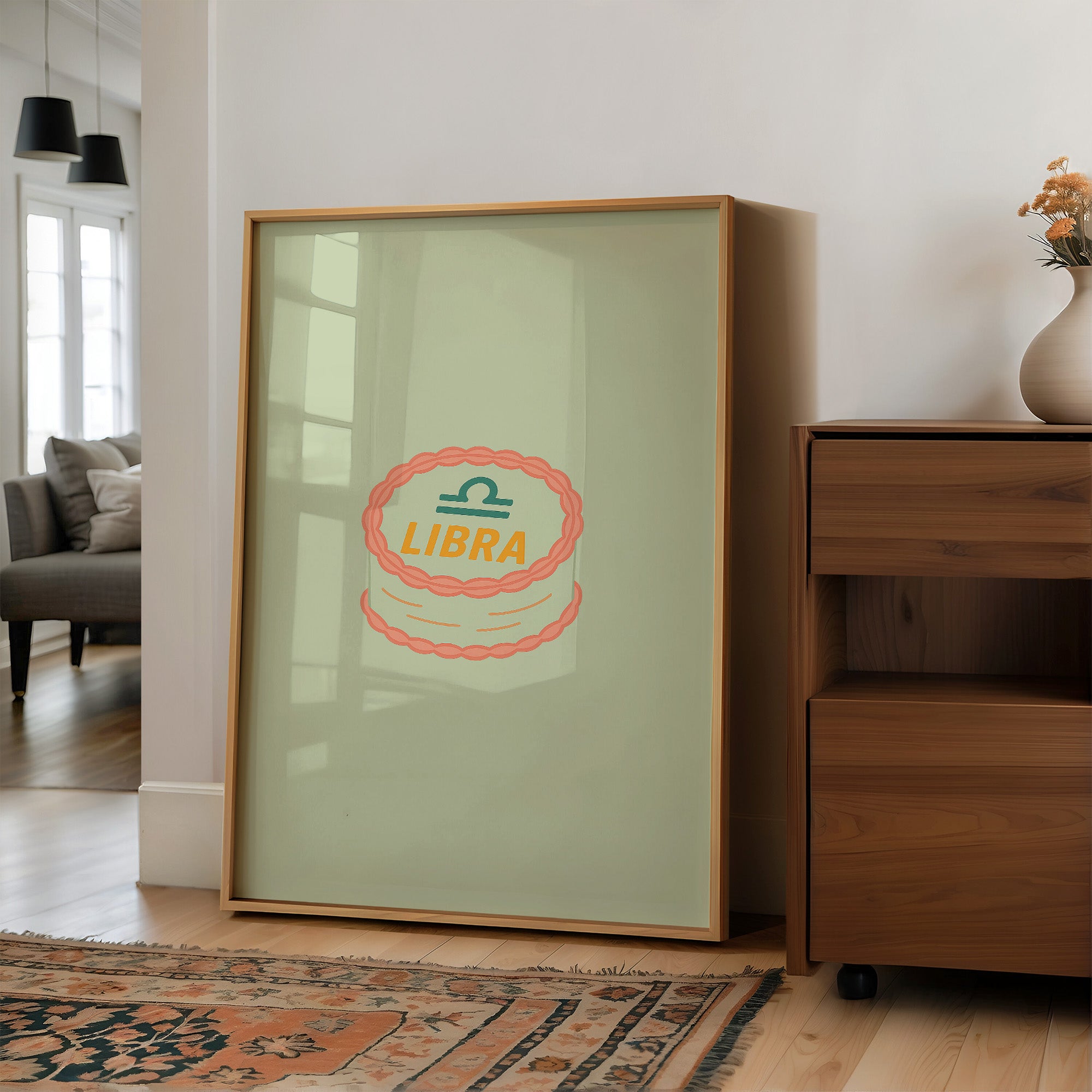 A minimalist illustration of a round cake decorated with coral-pink frosting and adorned with the Libra zodiac symbol. The cake features the word "LIBRA" in bold golden letters against a soft sage green background. The design marries the sweetness of celebration with astrological symbolism, representing harmony and equilibrium quintessential Libra traits. This contemporary piece blends pop art simplicity with cosmic significance, creating a playful yet meaningful representation of astrological identity.