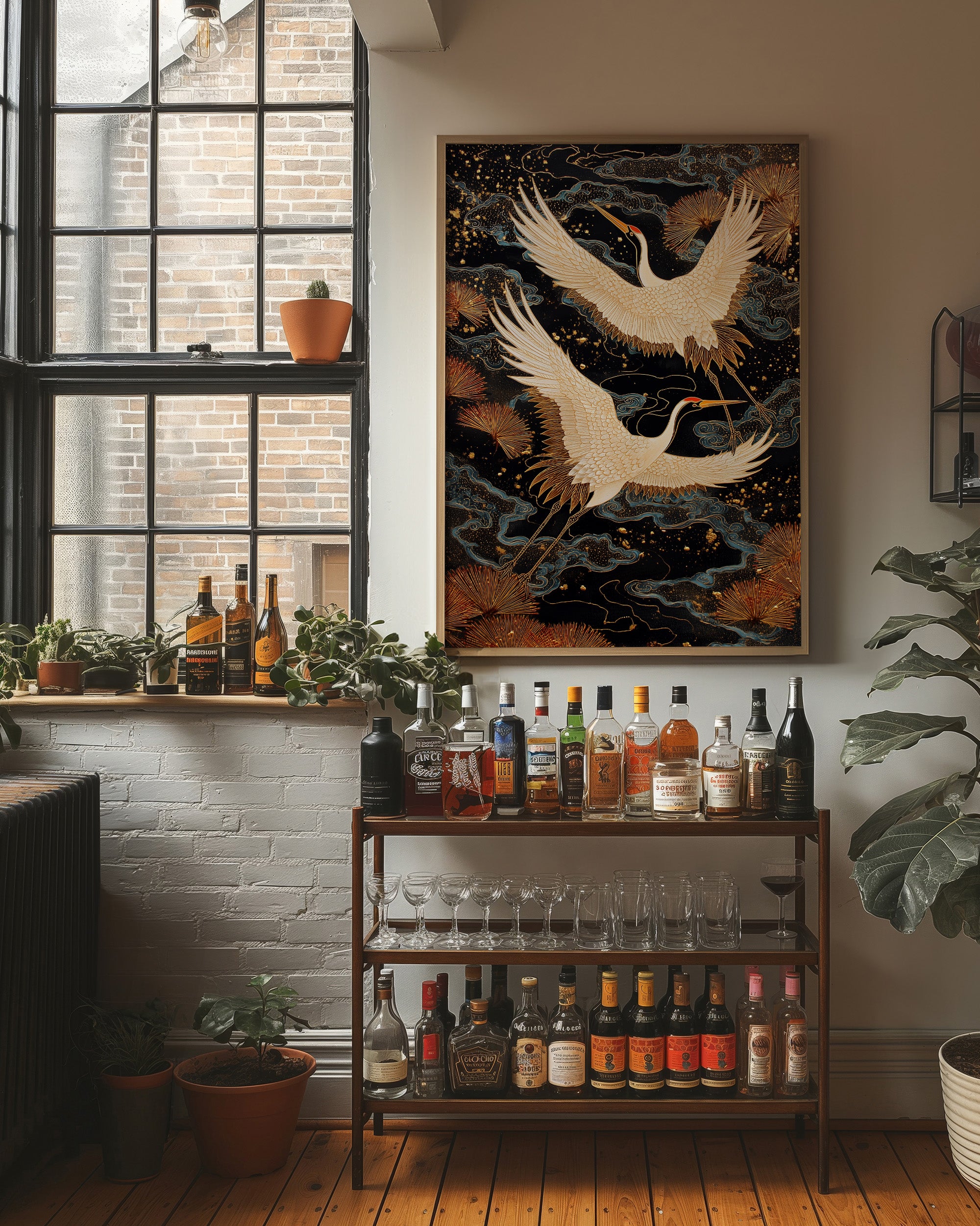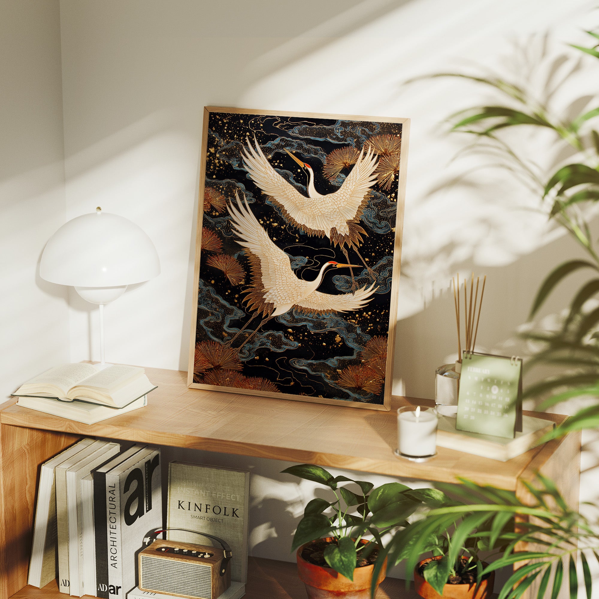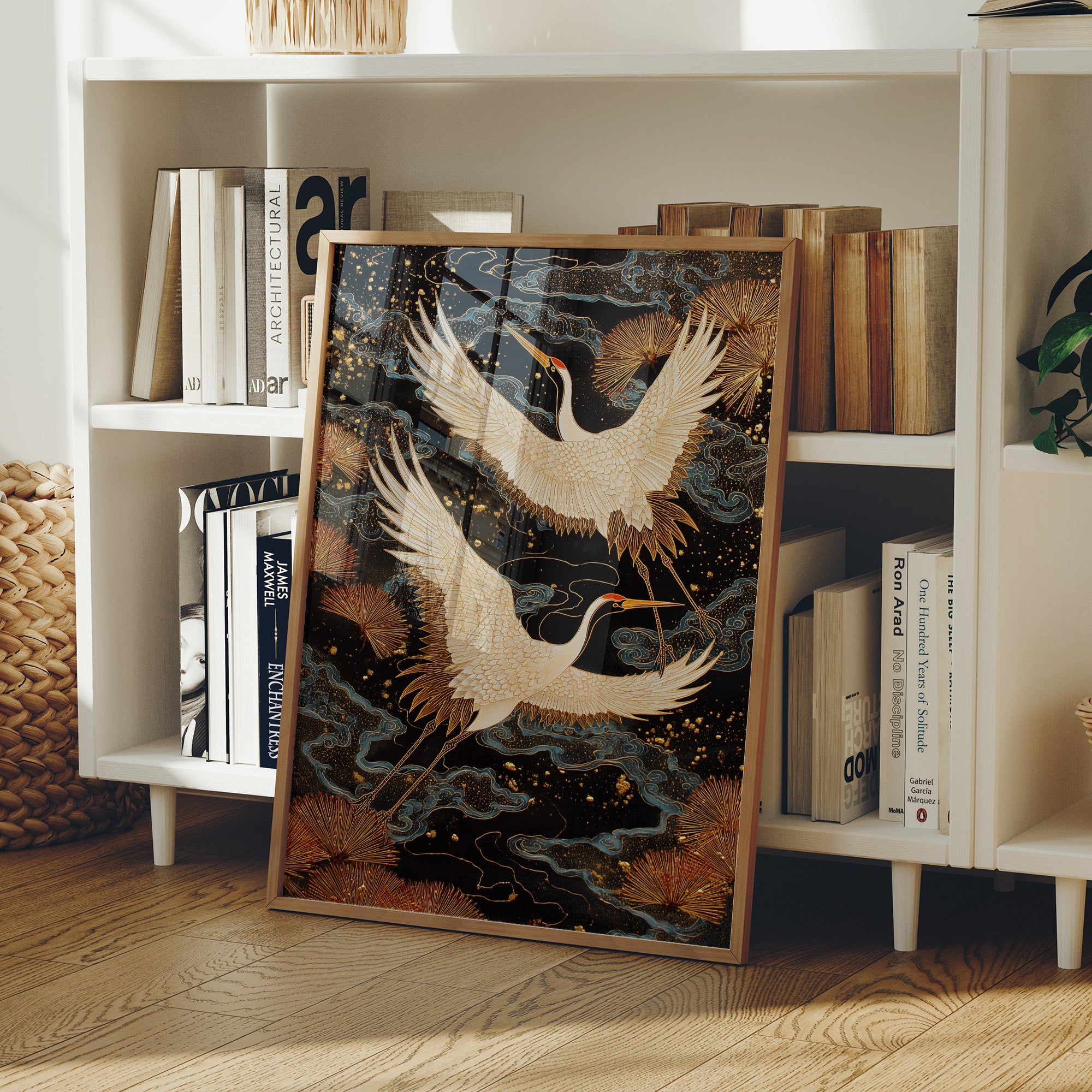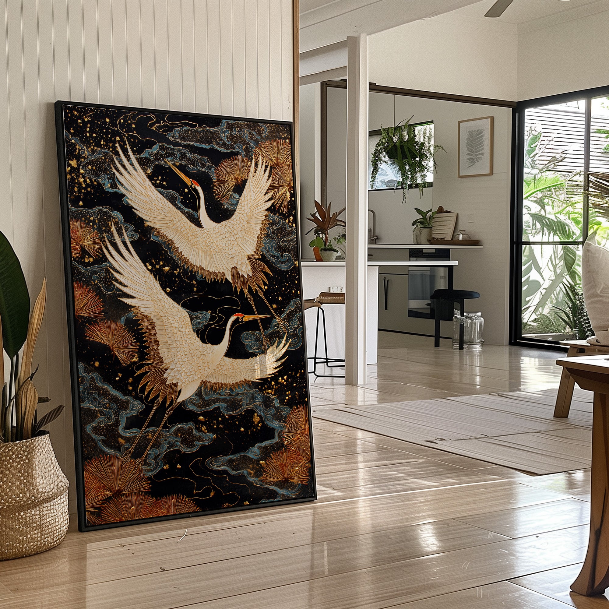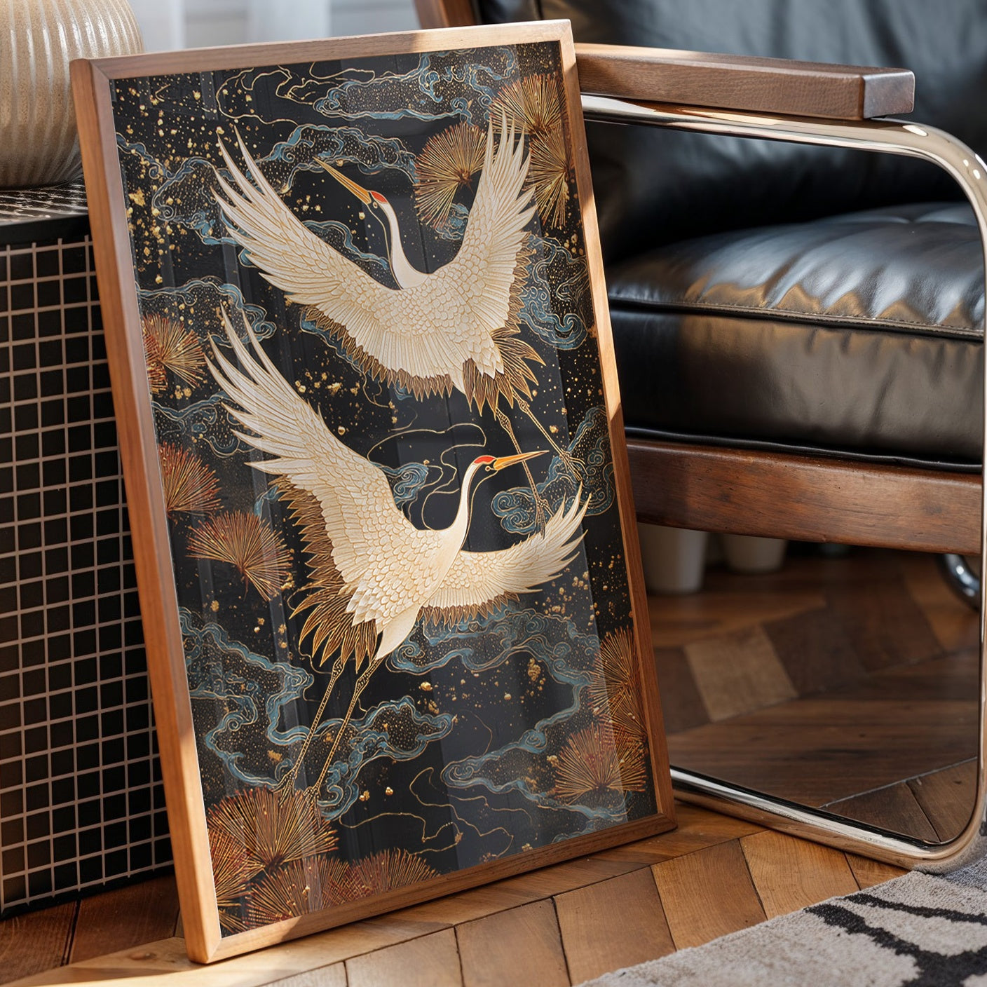 Against a midnight canvas, two majestic cranes take flight through a mystical atmosphere of swirling clouds and golden starbursts. Their cream-colored feathers catch an ethereal glow, creating a striking contrast against the deep navy background dotted with copper flourishes. The composition weaves together traditional Japanese artistry with contemporary elegance, as delicate line work and metallic accents create a sense of movement and grace. This striking piece would create an elegant focal point in a modern Asian-inspired study or bring sophisticated drama to a minimalist dining room.