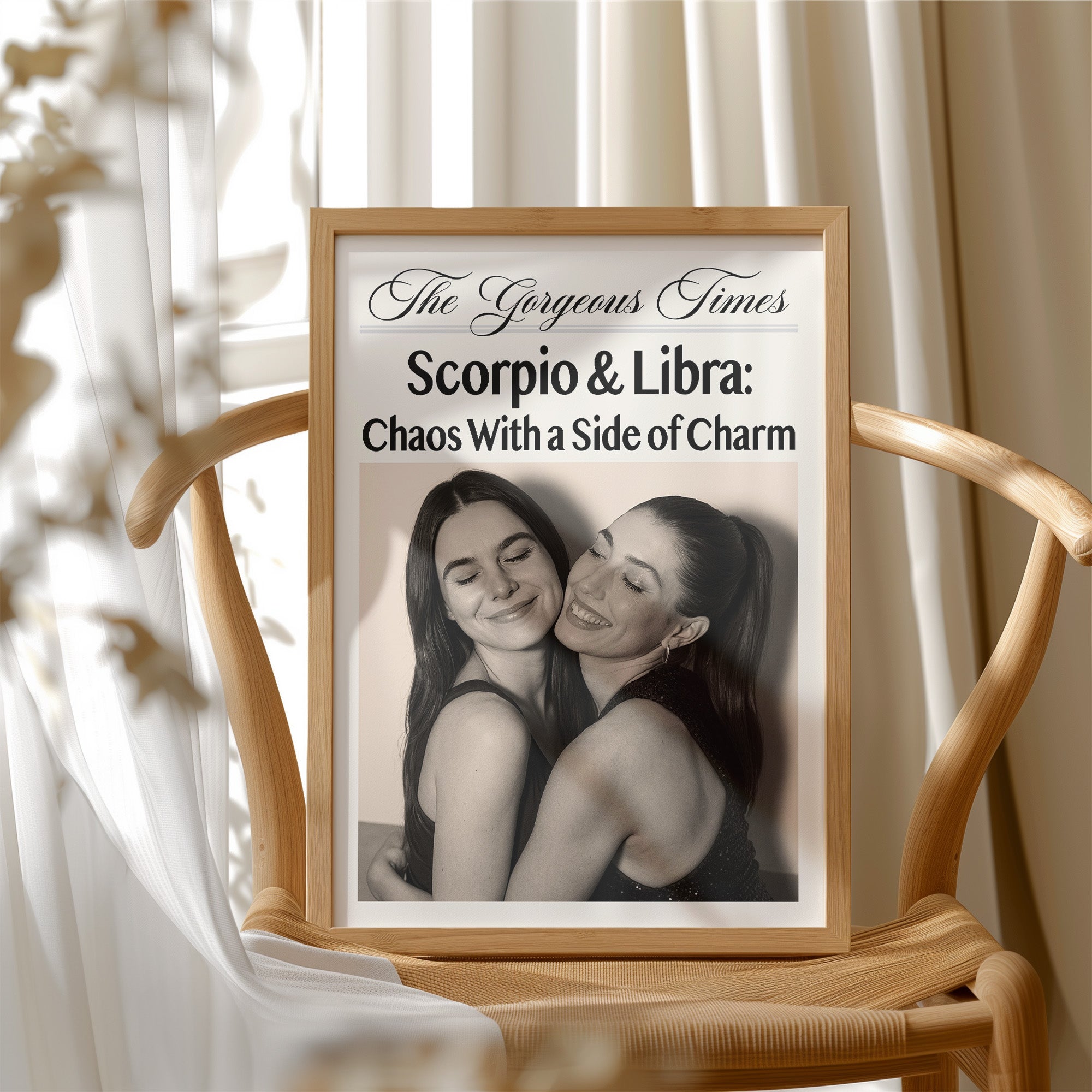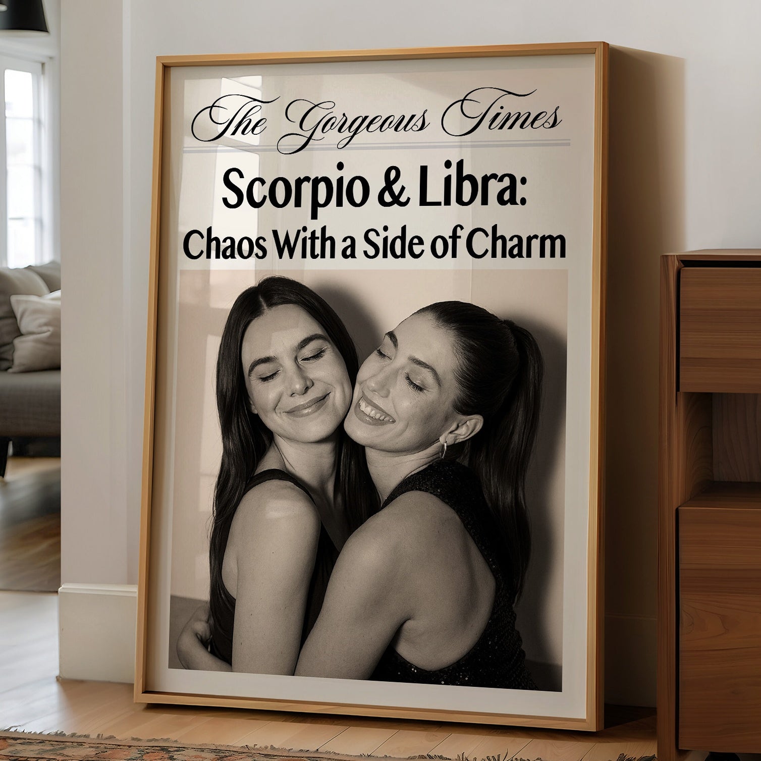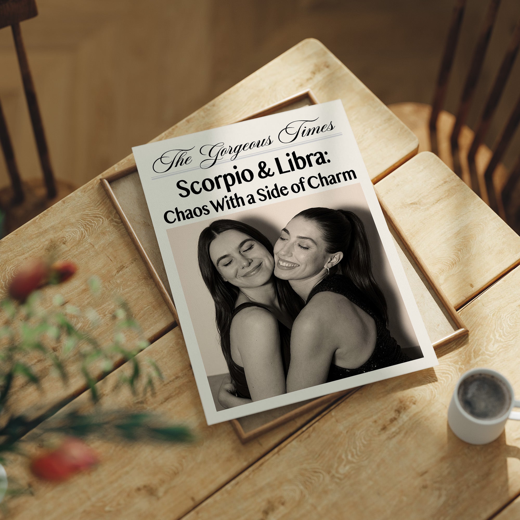 A striking black and white editorial layout designed in the style of a luxury magazine spread. The image features a sepia-toned photograph beneath elegant typography. The header reads "The Gorgeous Times" in flowing script, while the bold headline "Scorpio Libra: Chaos With a Side of Charm" suggests an astrological theme. The composition evokes nostalgic magazine aesthetics with its clean lines, contrasting fonts, and classic editorial design elements, creating a perfect blend of retro charm and contemporary styling.