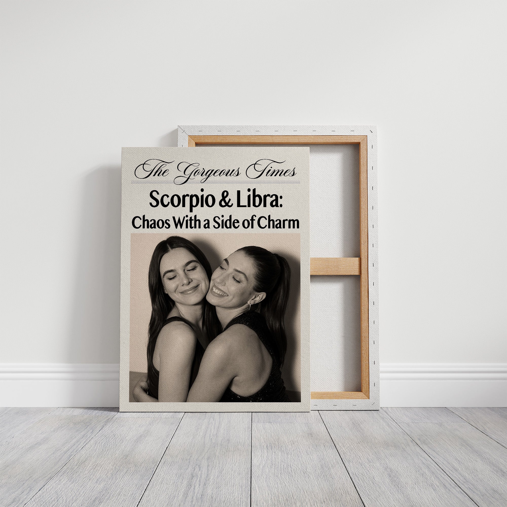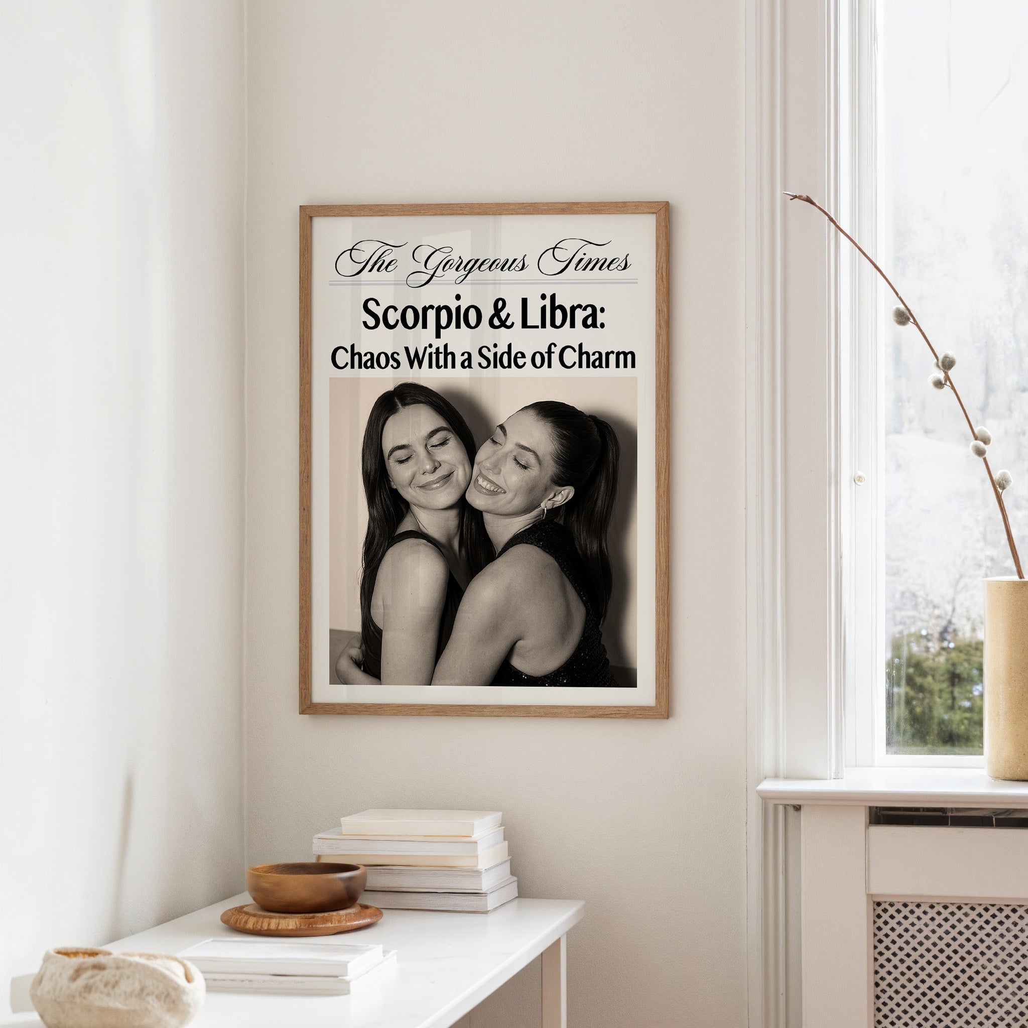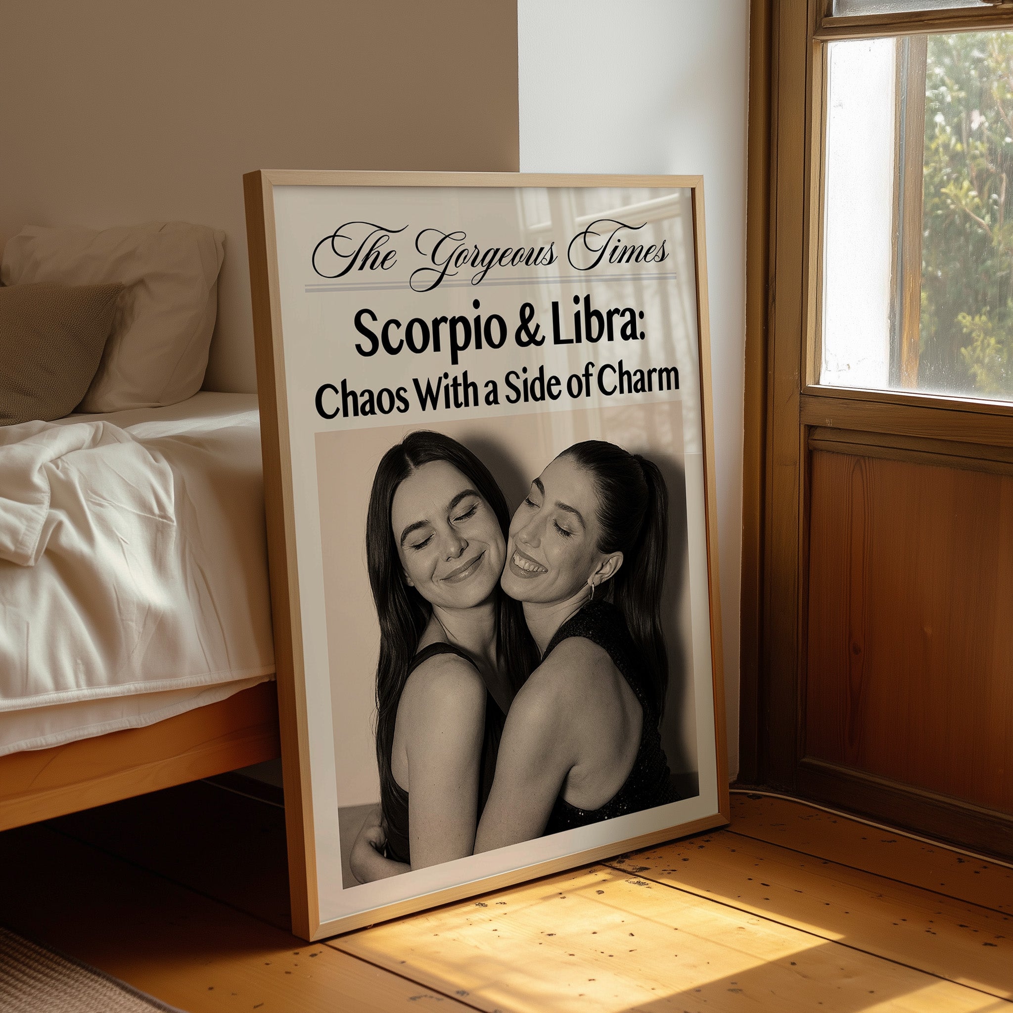 A striking black and white editorial layout designed in the style of a luxury magazine spread. The image features a sepia-toned photograph beneath elegant typography. The header reads "The Gorgeous Times" in flowing script, while the bold headline "Scorpio Libra: Chaos With a Side of Charm" suggests an astrological theme. The composition evokes nostalgic magazine aesthetics with its clean lines, contrasting fonts, and classic editorial design elements, creating a perfect blend of retro charm and contemporary styling.