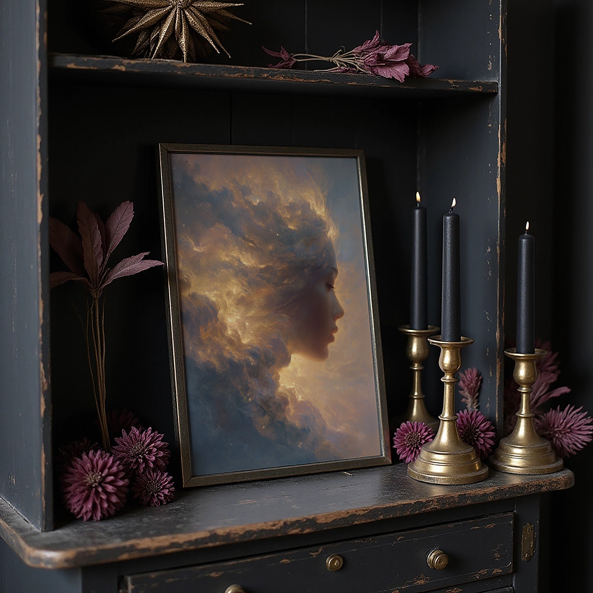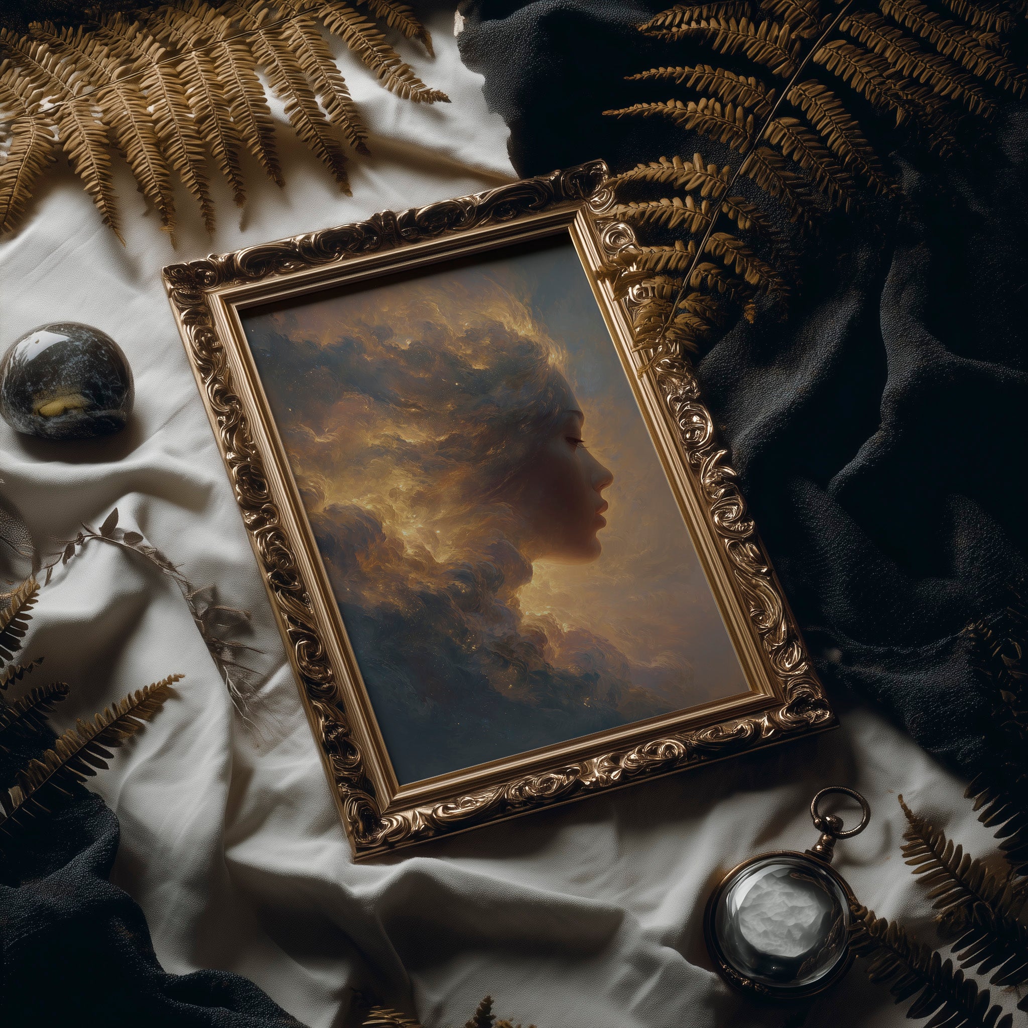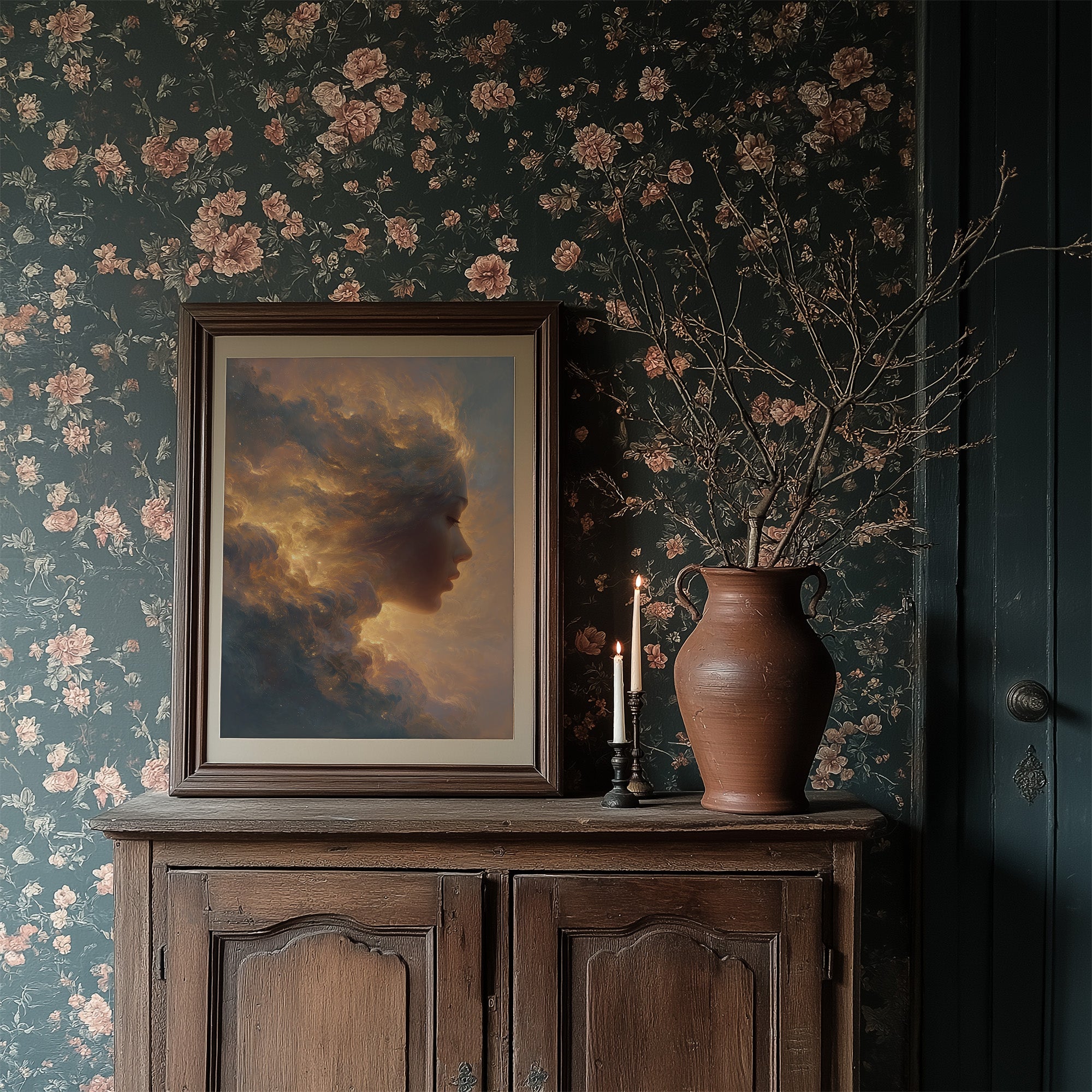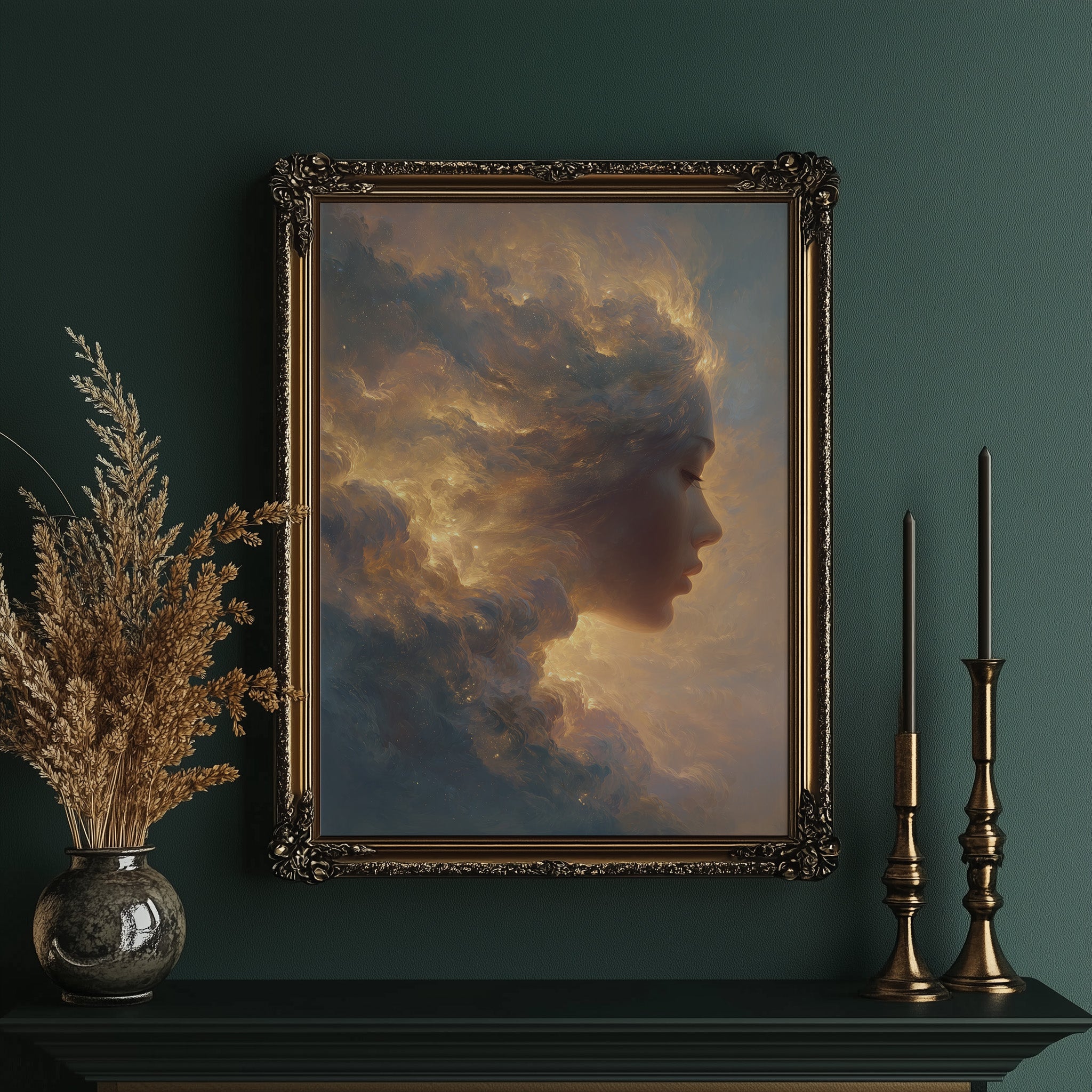 Sunset hues dance across a dreamlike portrait where a silhouette emerges from billowing clouds. The ethereal composition blends the boundary between human form and atmospheric wonder, with amber and gold tones swirling into stormy grays. The elegant framing sets this otherworldly vision against a dramatic black wall, where sunlight creates diagonal patterns across herringbone floors beneath.