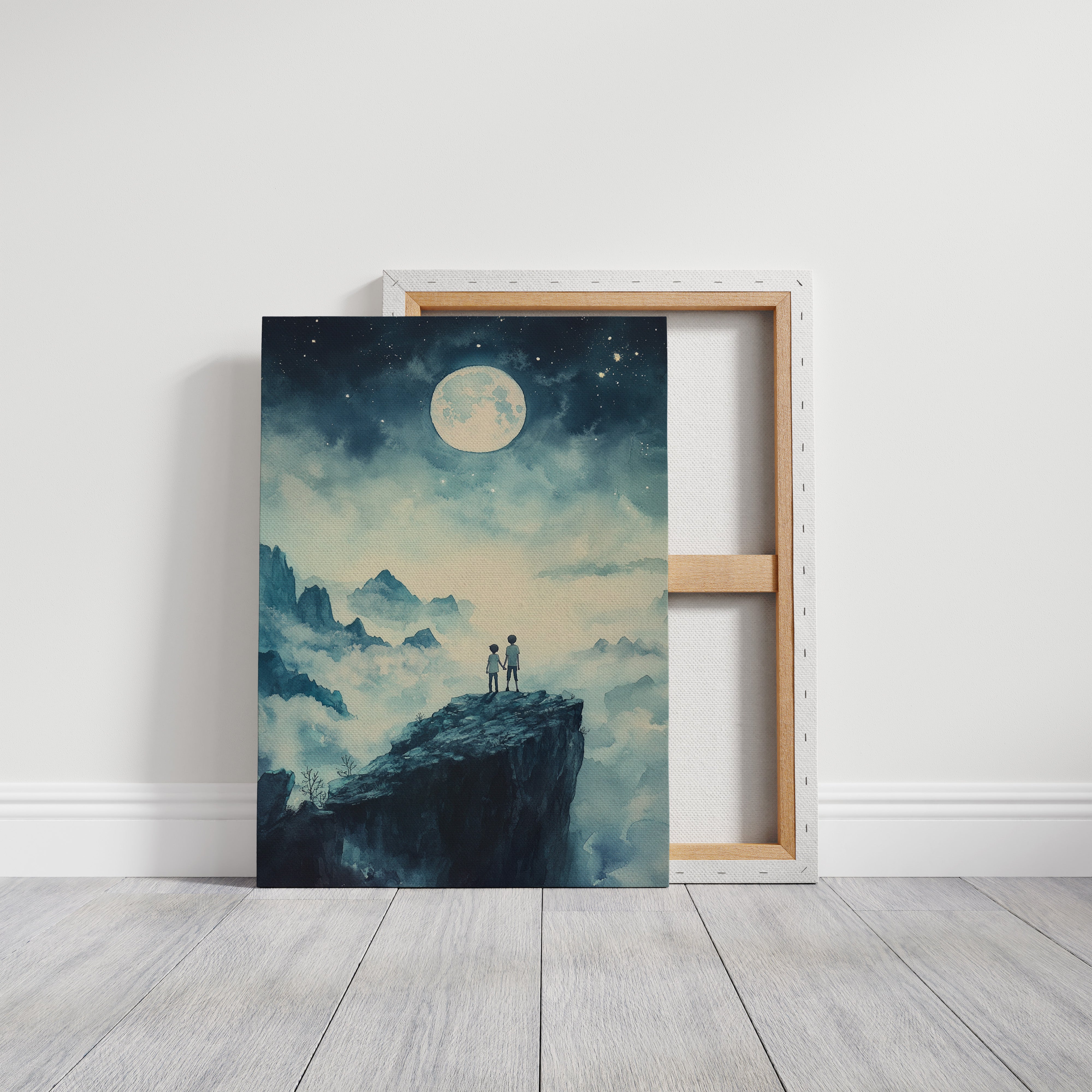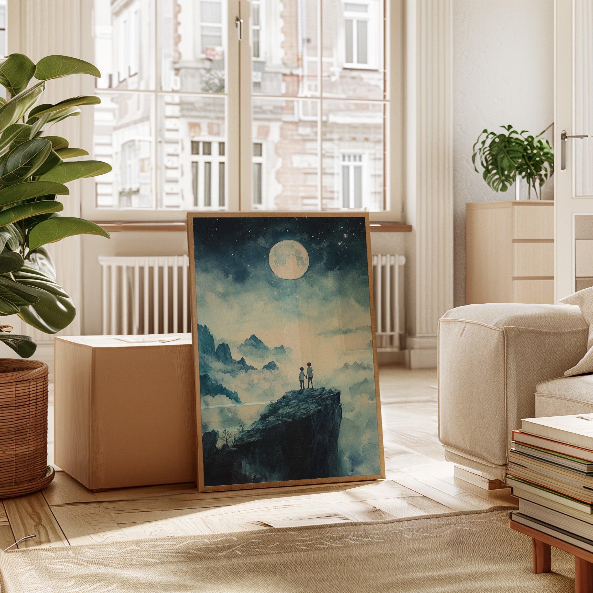 Step into a world of ethereal beauty with 'Celestial Reverie,' where two figures stand on the precipice of a dreamscape, gazing at a luminous moon that bathes the misty mountains in a serene glow. This captivating piece invites you to explore the mysteries of the cosmos, capturing the wonder of endless possibilities beneath the starlit sky. Perfect for adding a touch of the mystical to your space, it's a portal to tranquility and imagination, evoking feelings of awe and introspection.