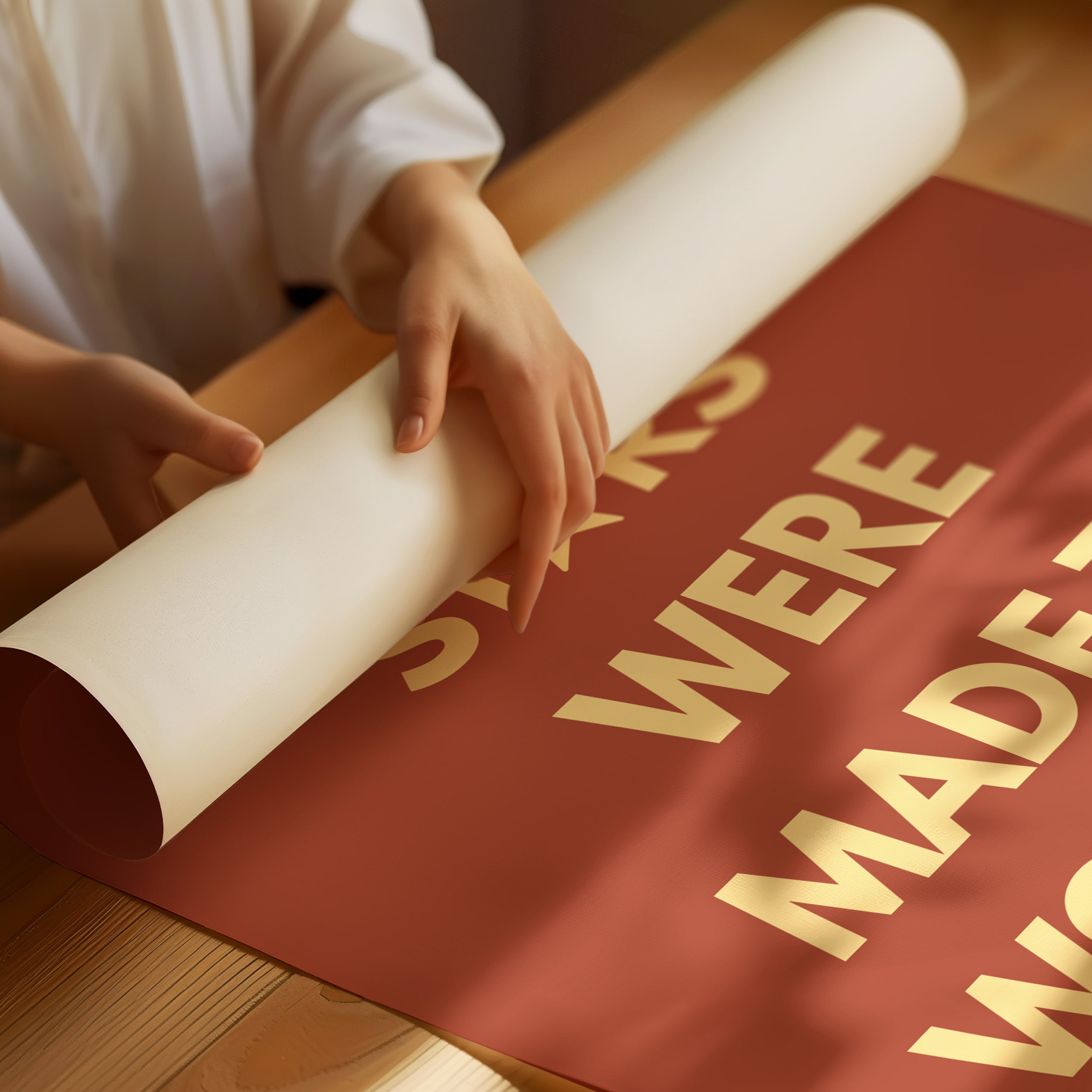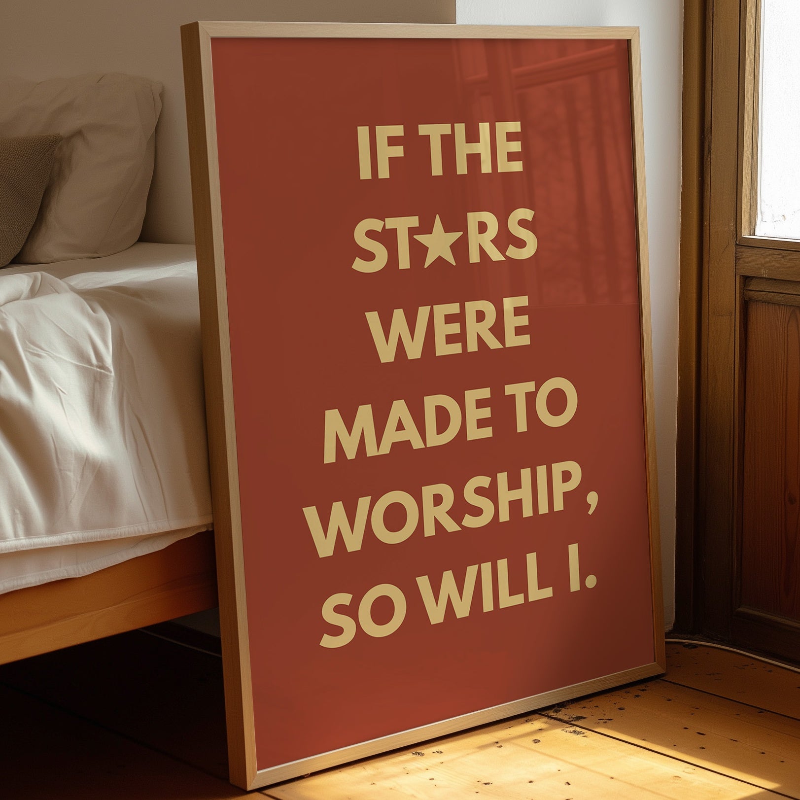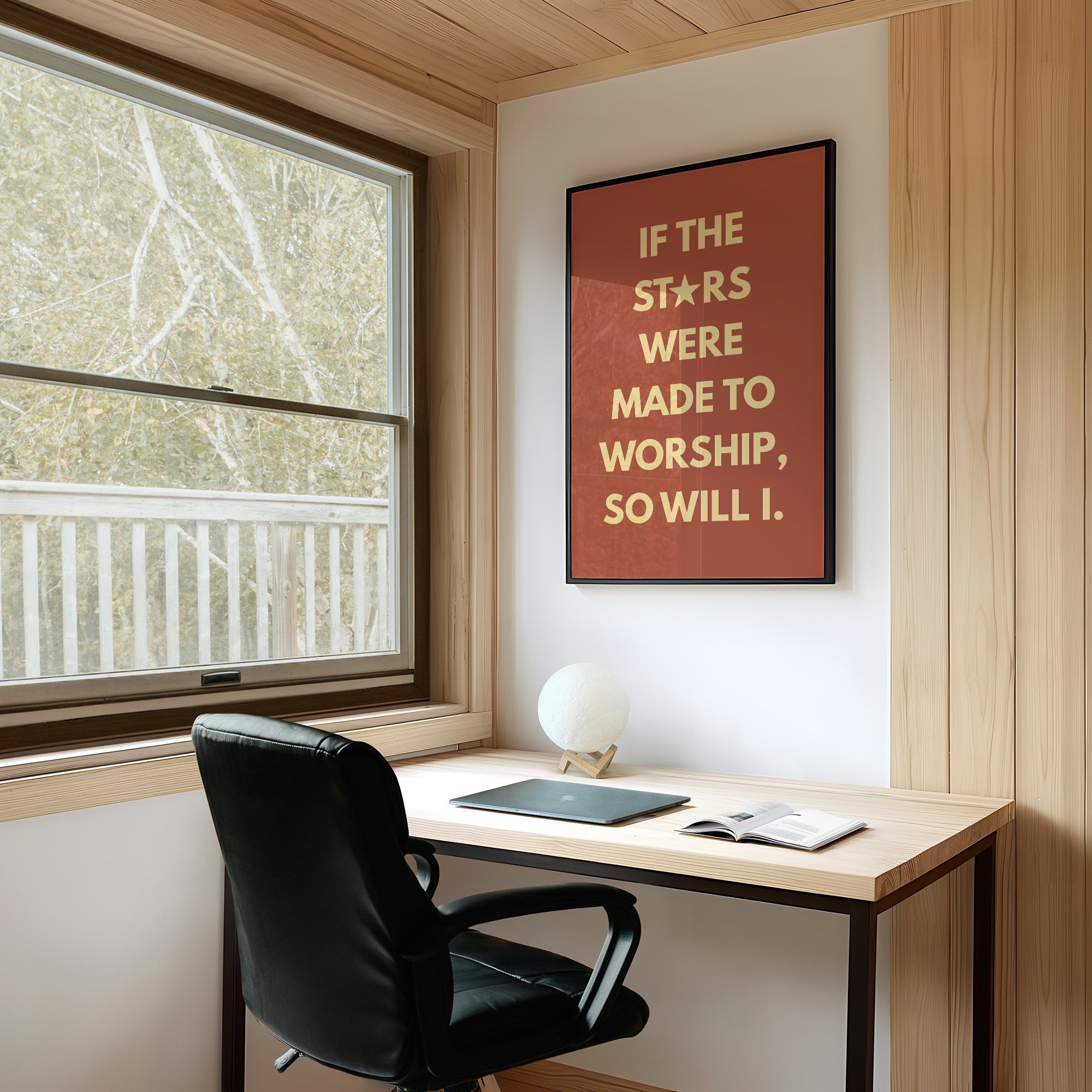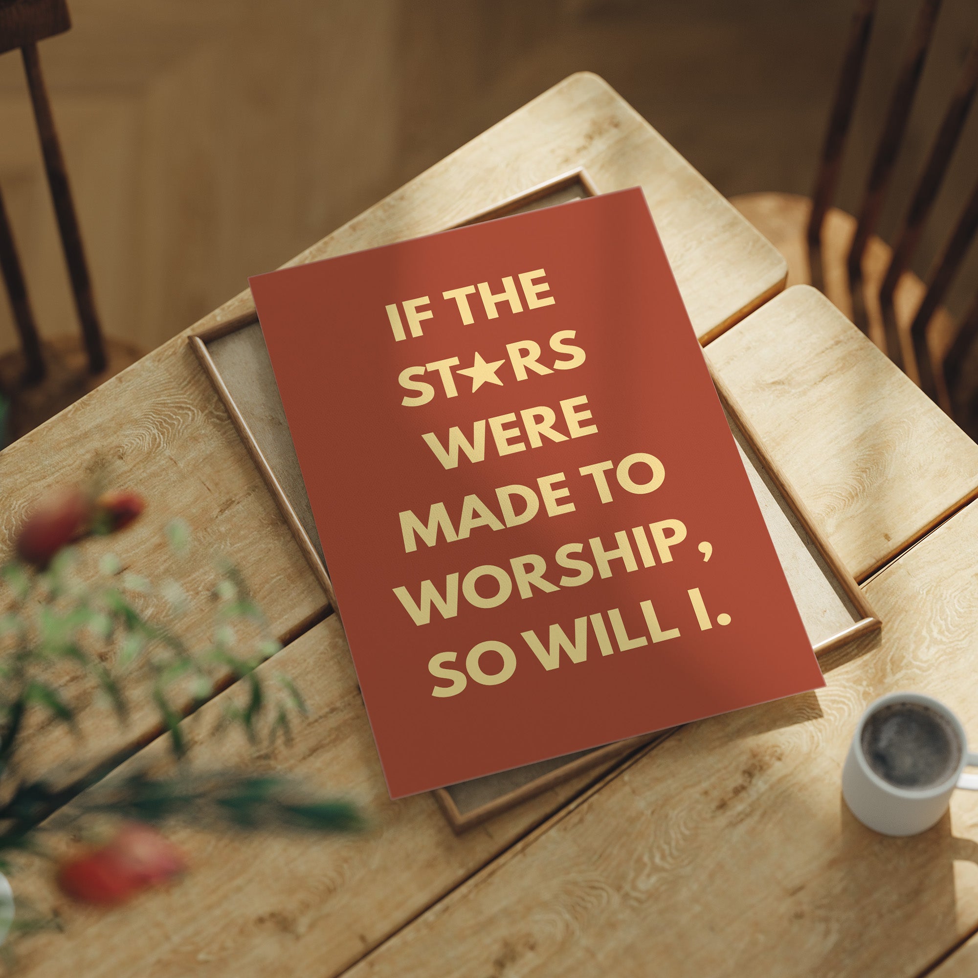 The warmth of terracotta embraces golden words of devotion, creating a moment of profound spiritual declaration. Bold typography stands against the earthy backdrop, each letter illuminated like the very stars referenced in this declaration of faith. The contrast between the rich rust-colored canvas and creamy yellow text evokes the feeling of sunset prayers, where heaven and earth meet in quiet reverence.