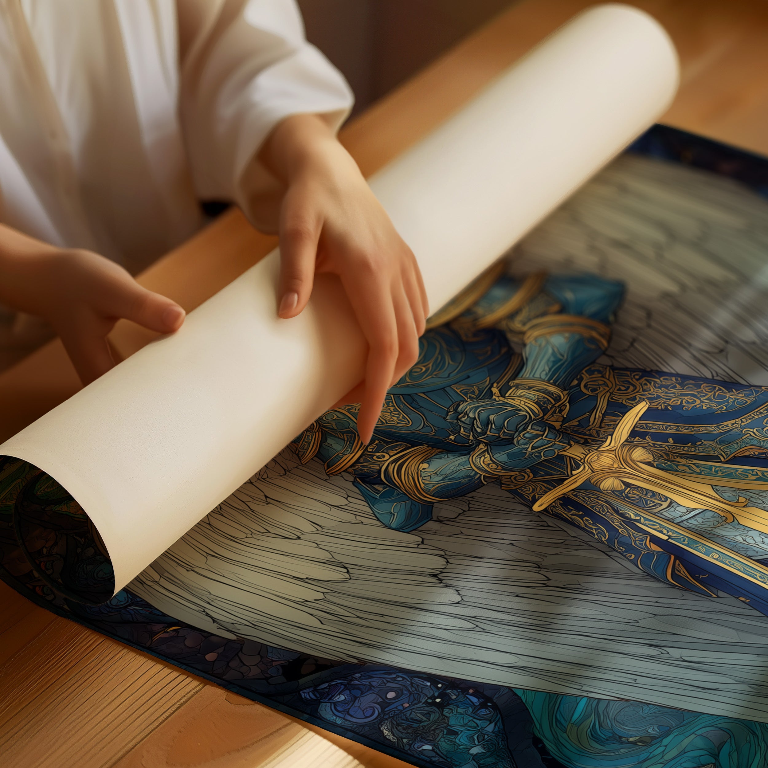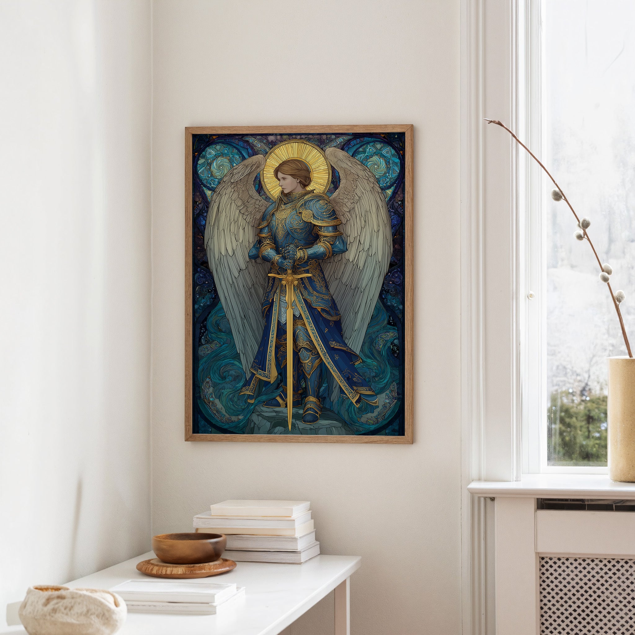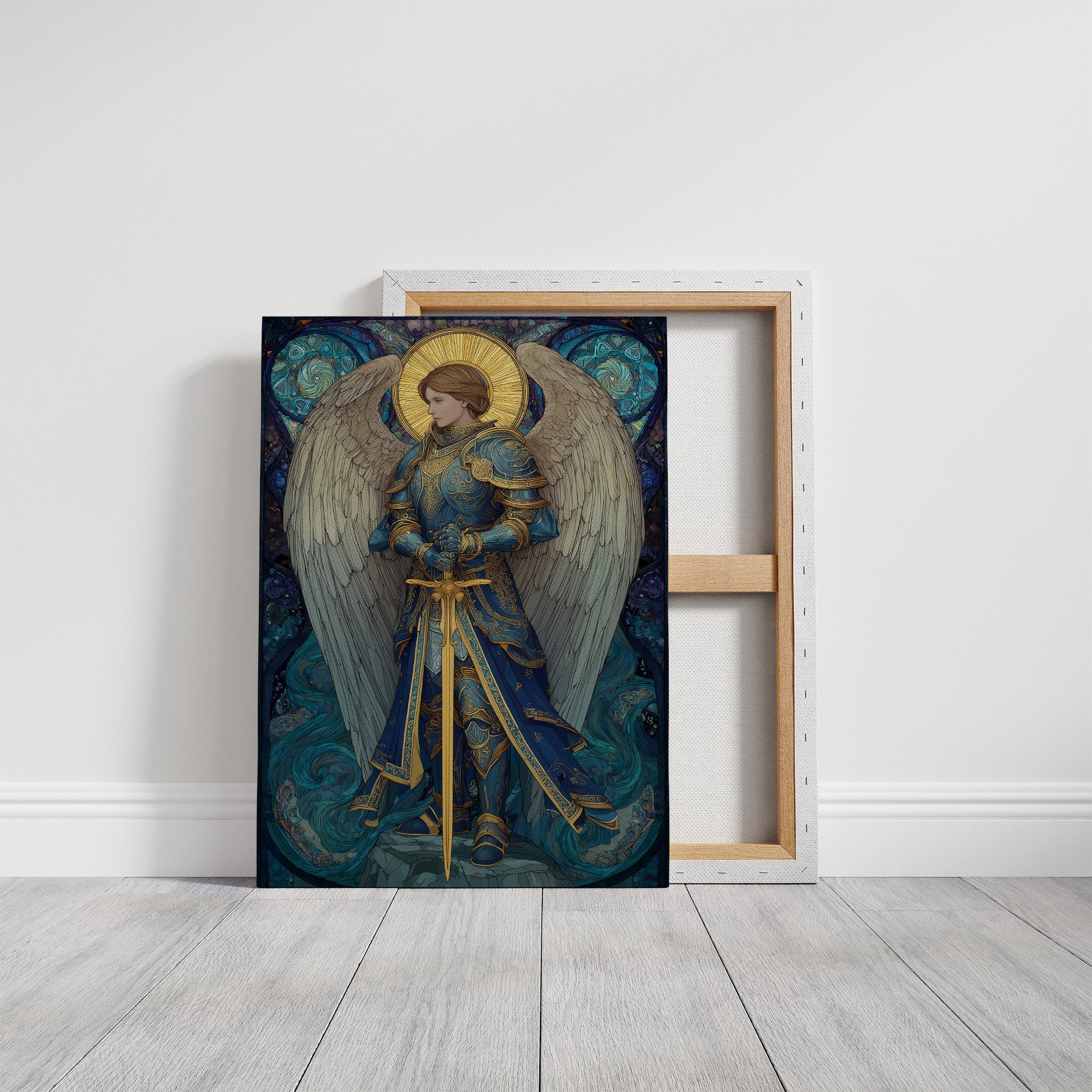 Golden light radiates against swirling seas of blue, capturing a moment of divine strength and ethereal grace. The armored figure stands resolute, sword gleaming with purpose against the flowing backdrop of turquoise waves and celestial patterns. White wings unfurl with quiet dignity, while intricate golden details dance across the azure armor, telling stories of ancient protection and heavenly duty. This piece brings a touch of sacred artistry to meditation spaces or reading nooks where contemplation flows freely.