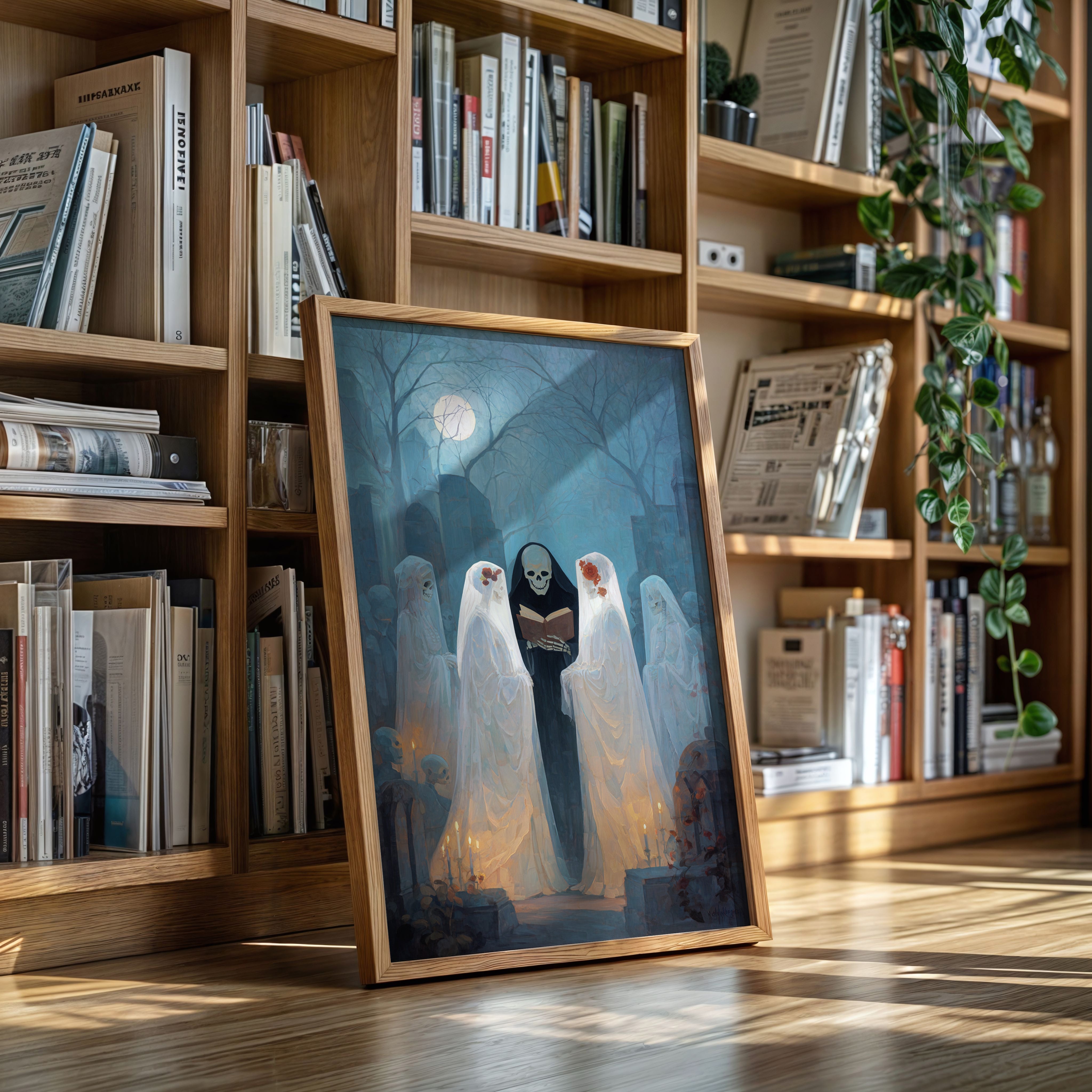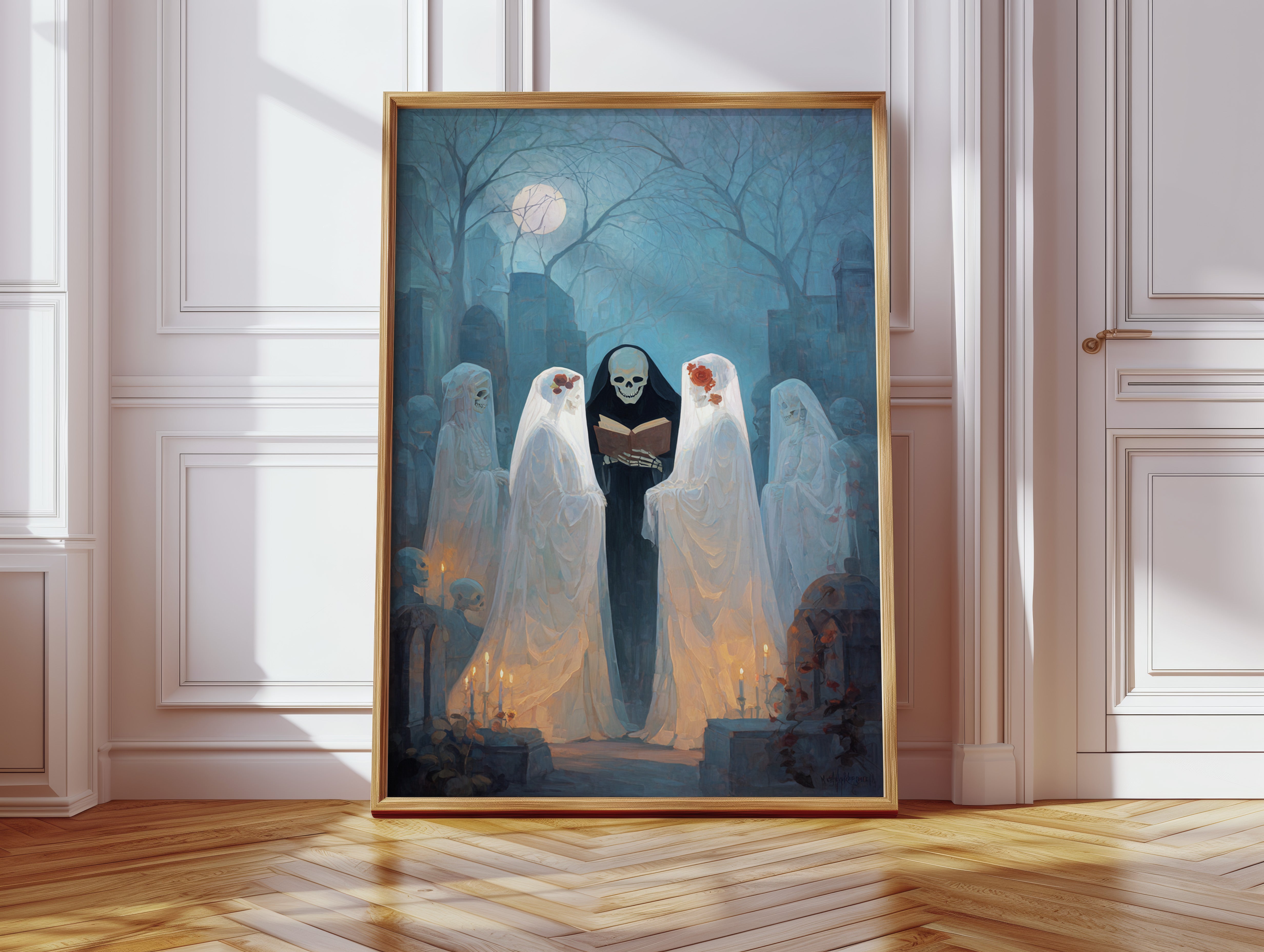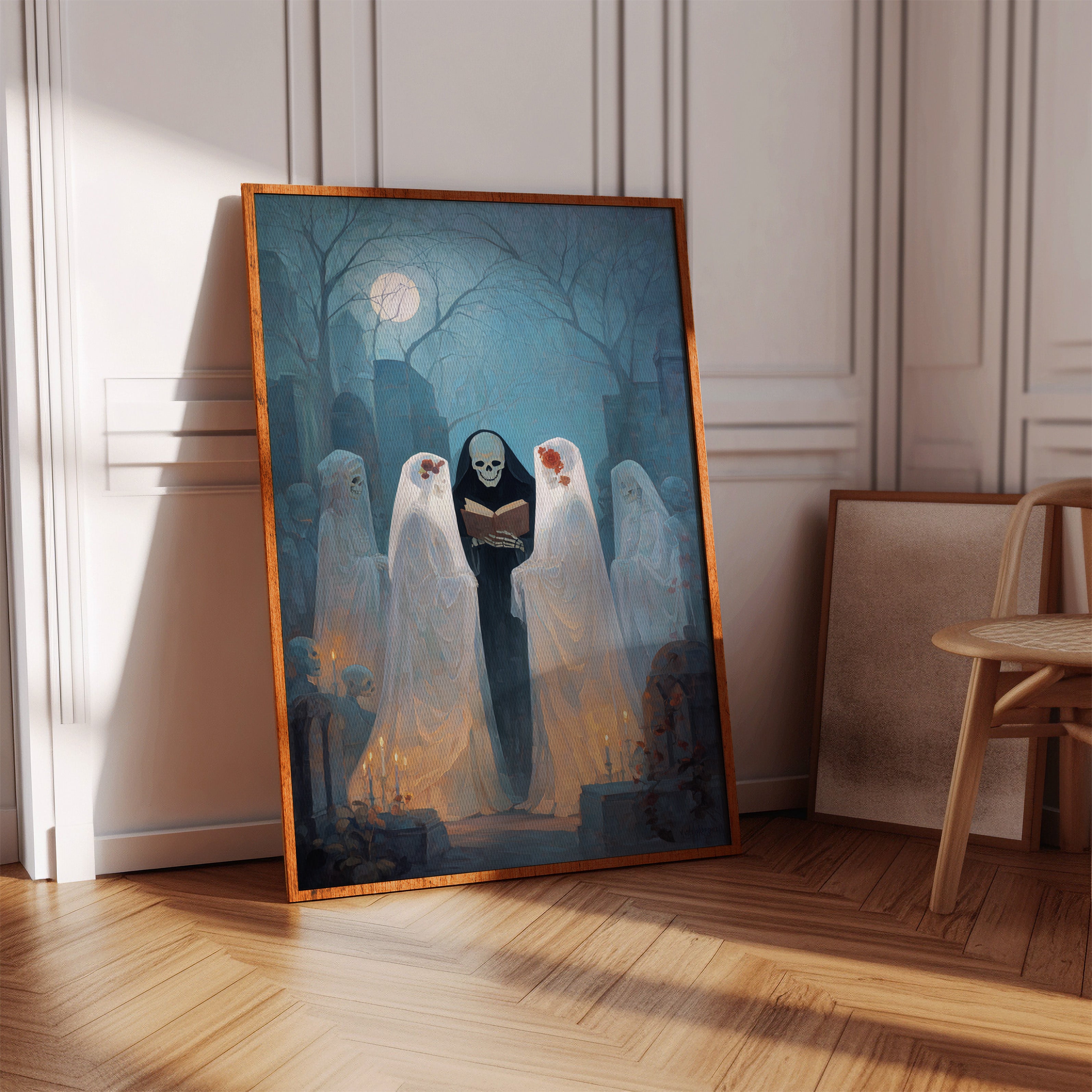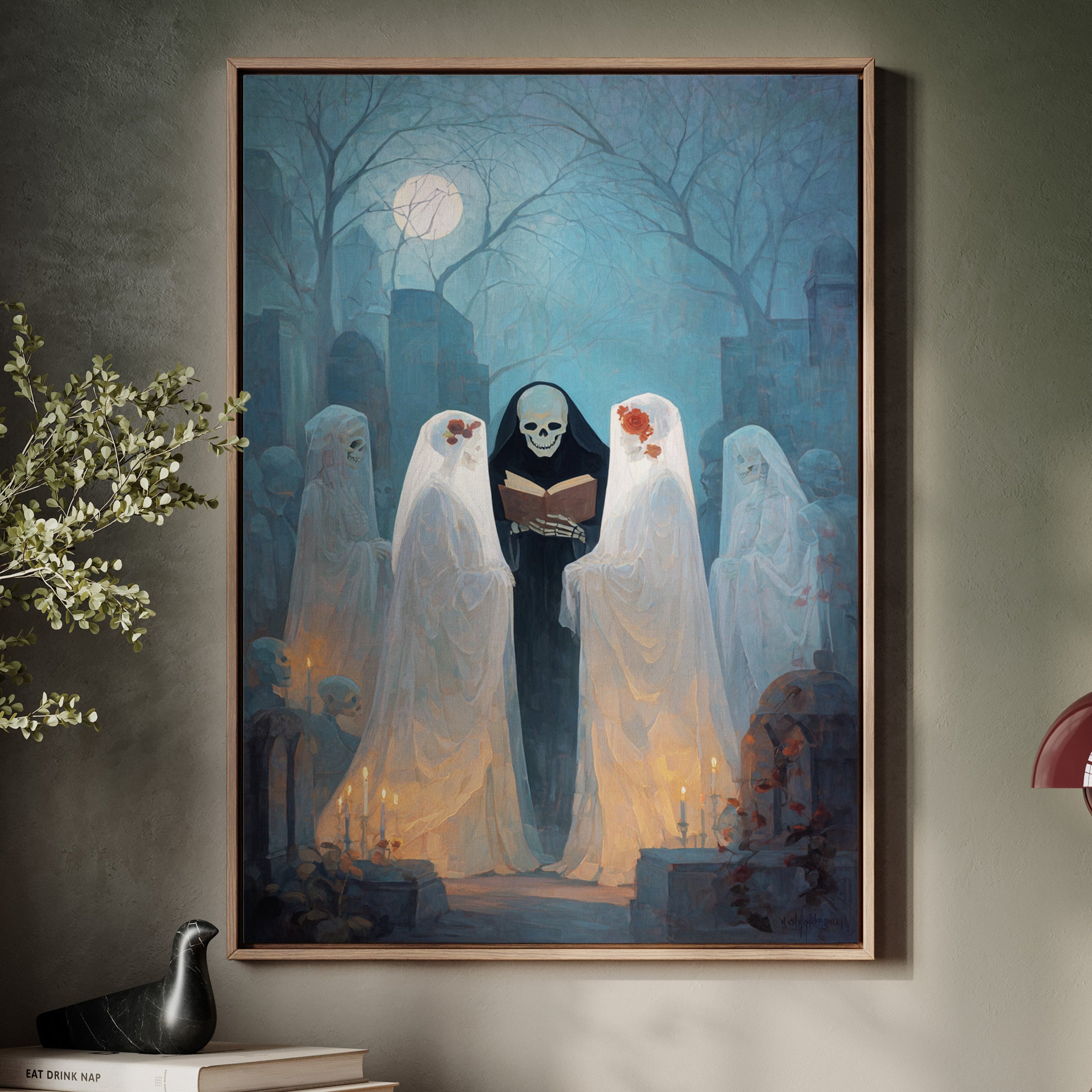 In the stillness of night, two ethereal figures stand poised, their delicate forms adorned with floral whispers, as they gather in an age-old ritual amidst the shadows of forgotten graves. This piece evokes the haunting beauty of the Artisanal collection, where the ordinary meets the extraordinary in a dance of life and death. The painter masterfully captures the tension of the moment, with colors that meld the serene blues of twilight and the warm glow of candlelight, inviting the viewer to ponder the fragility of existence. Ideal for a moody nook or a contemplative space, this artwork invites reflection and conversation.
