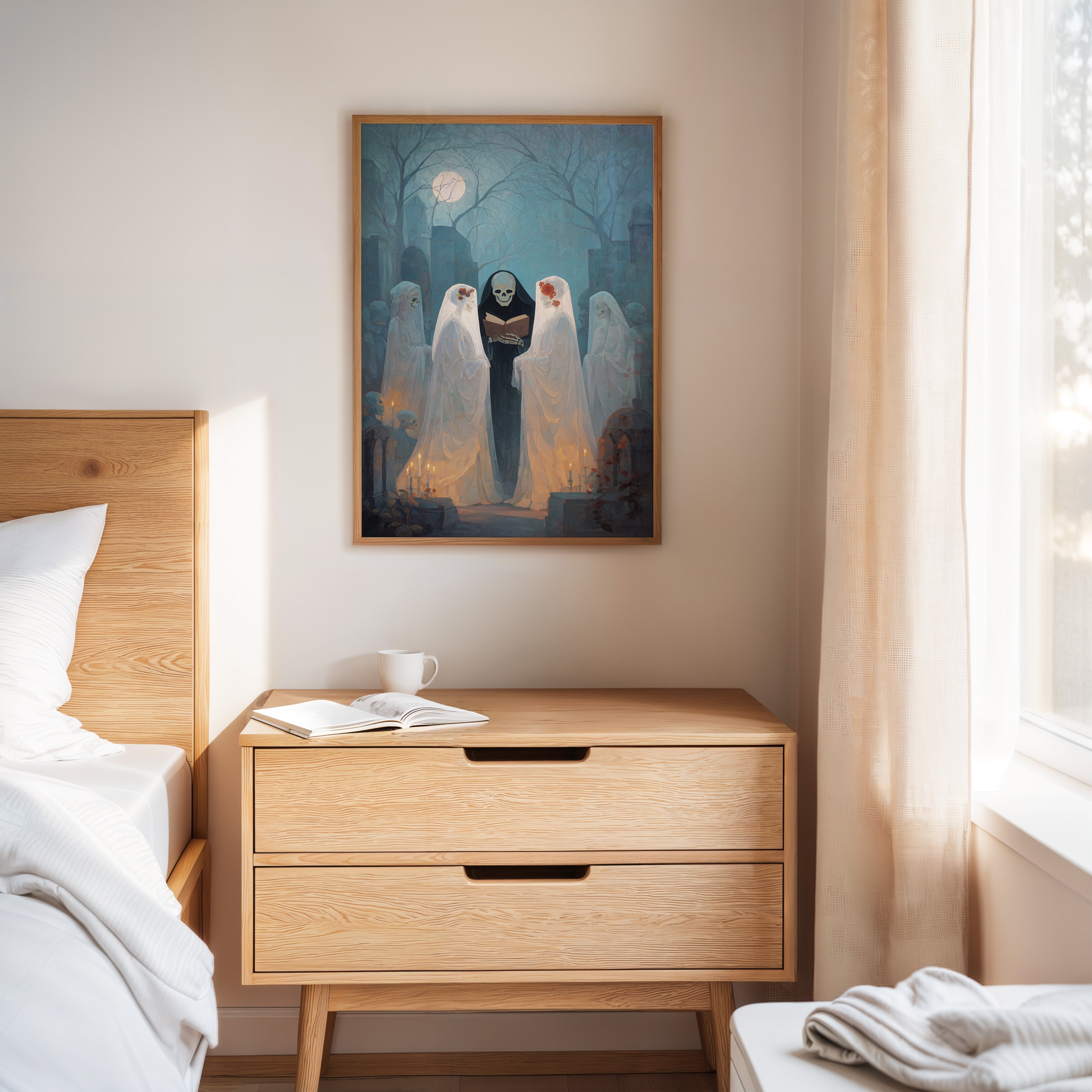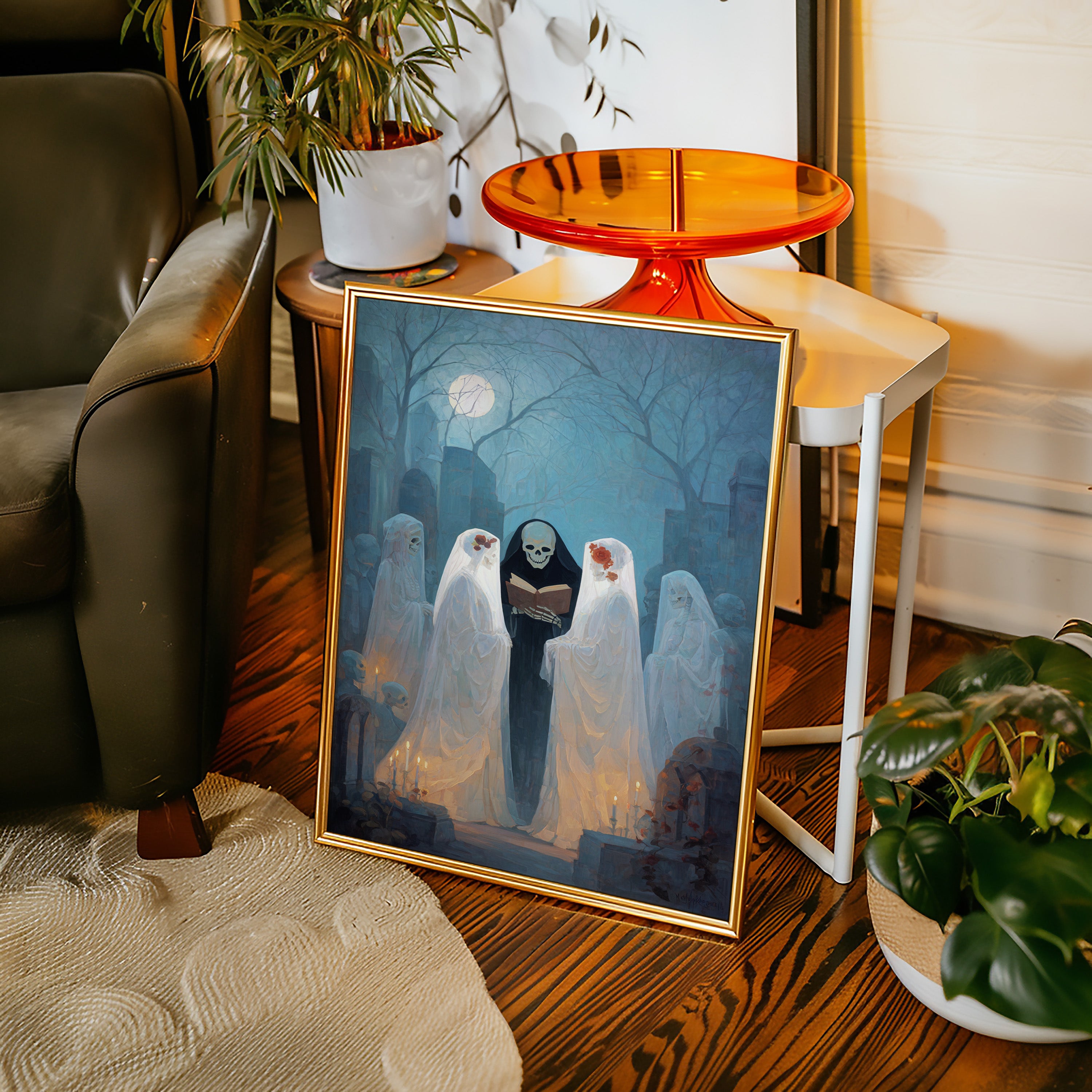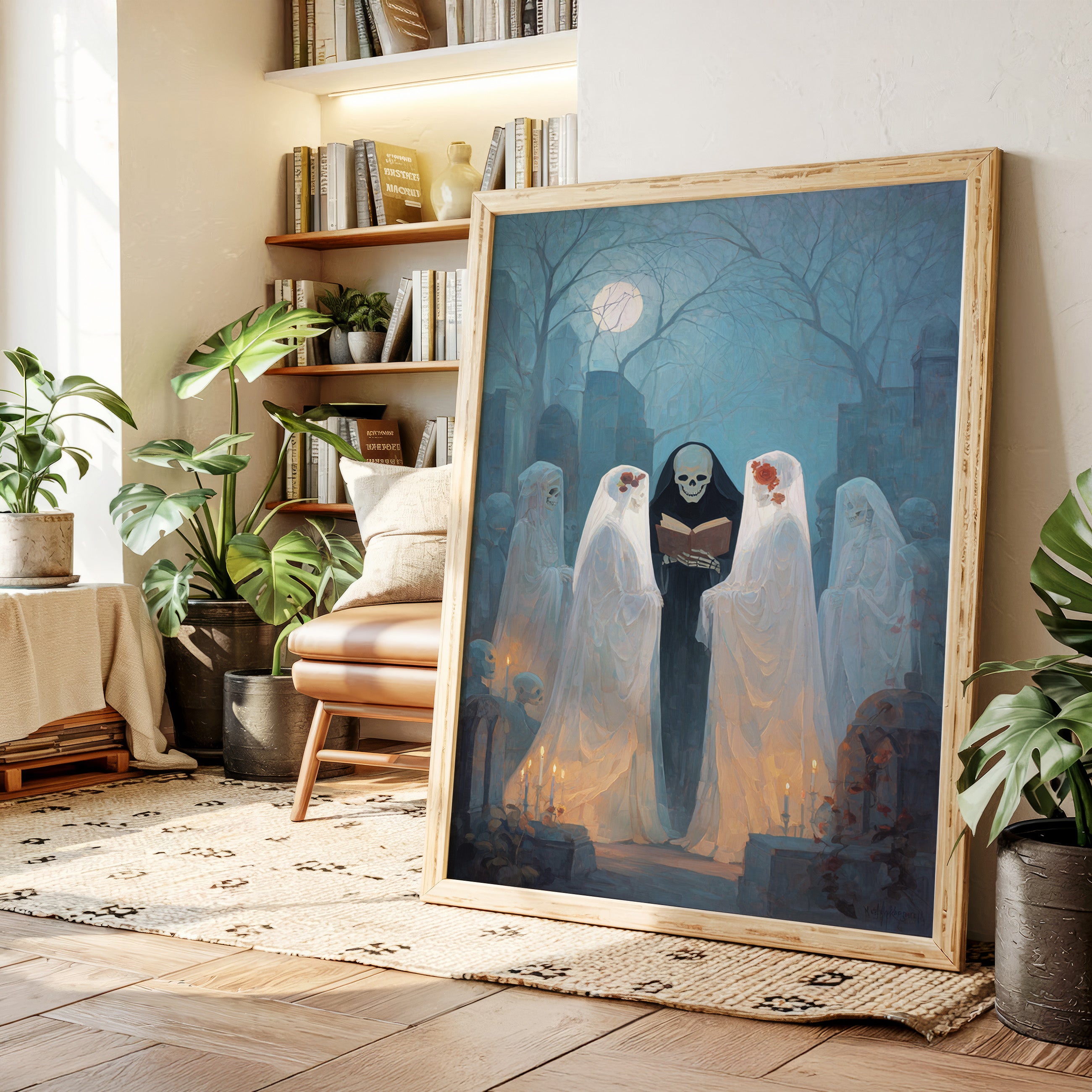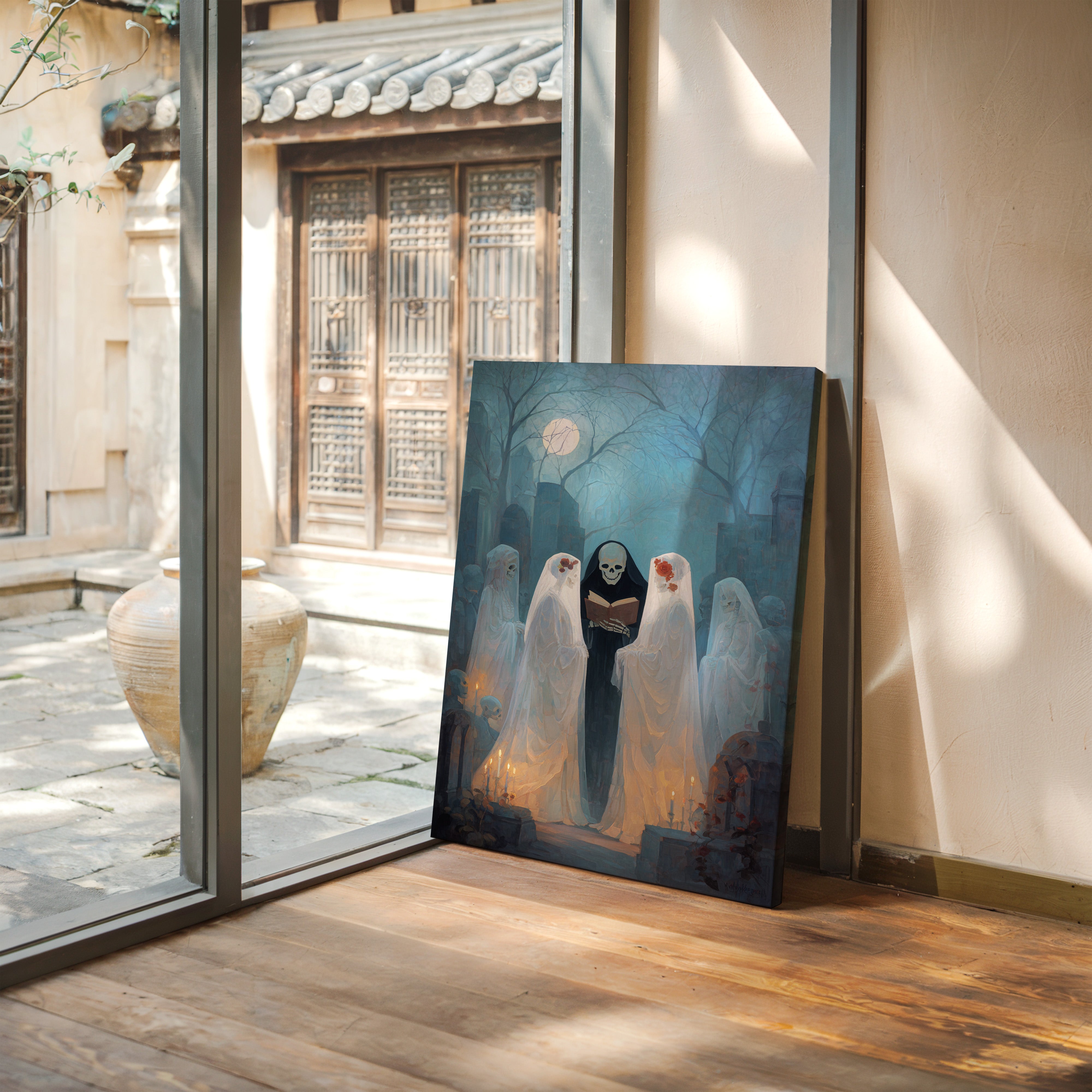 In the stillness of night, two ethereal figures stand poised, their delicate forms adorned with floral whispers, as they gather in an age-old ritual amidst the shadows of forgotten graves. This piece evokes the haunting beauty of the Artisanal collection, where the ordinary meets the extraordinary in a dance of life and death. The painter masterfully captures the tension of the moment, with colors that meld the serene blues of twilight and the warm glow of candlelight, inviting the viewer to ponder the fragility of existence. Ideal for a moody nook or a contemplative space, this artwork invites reflection and conversation.