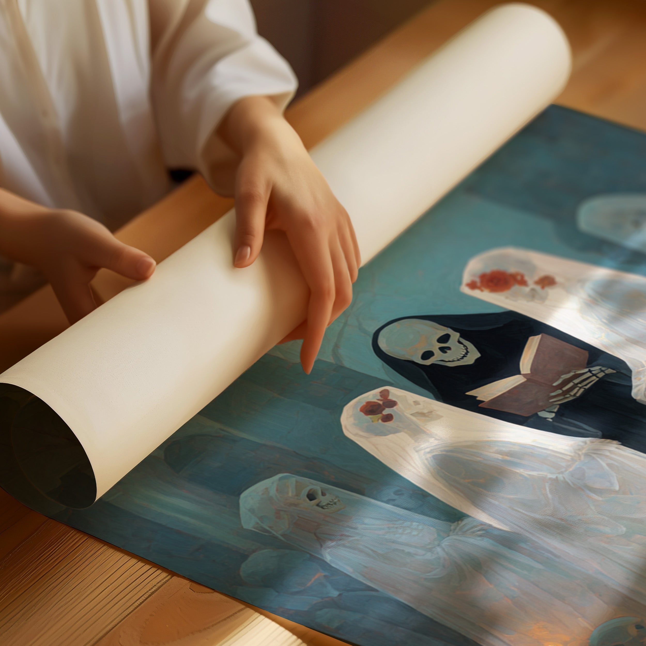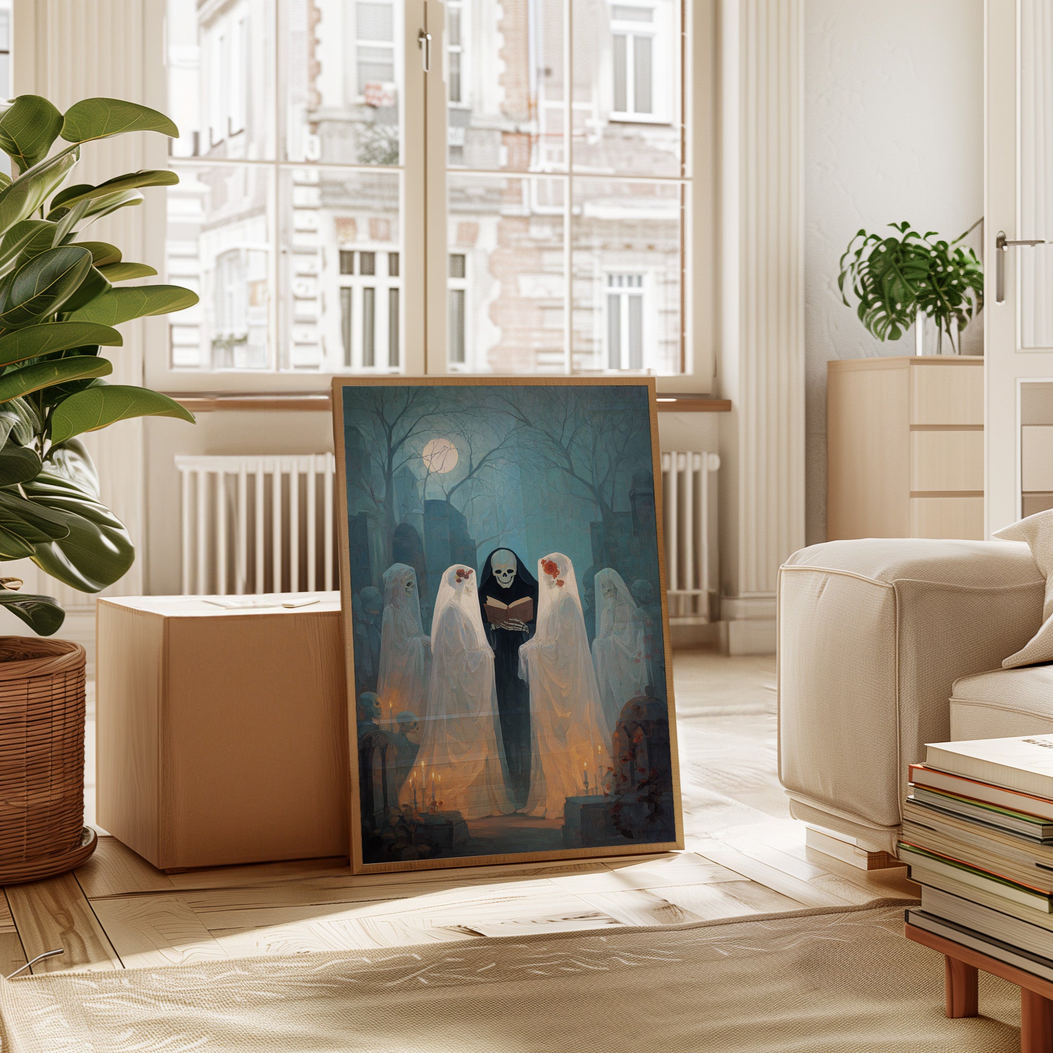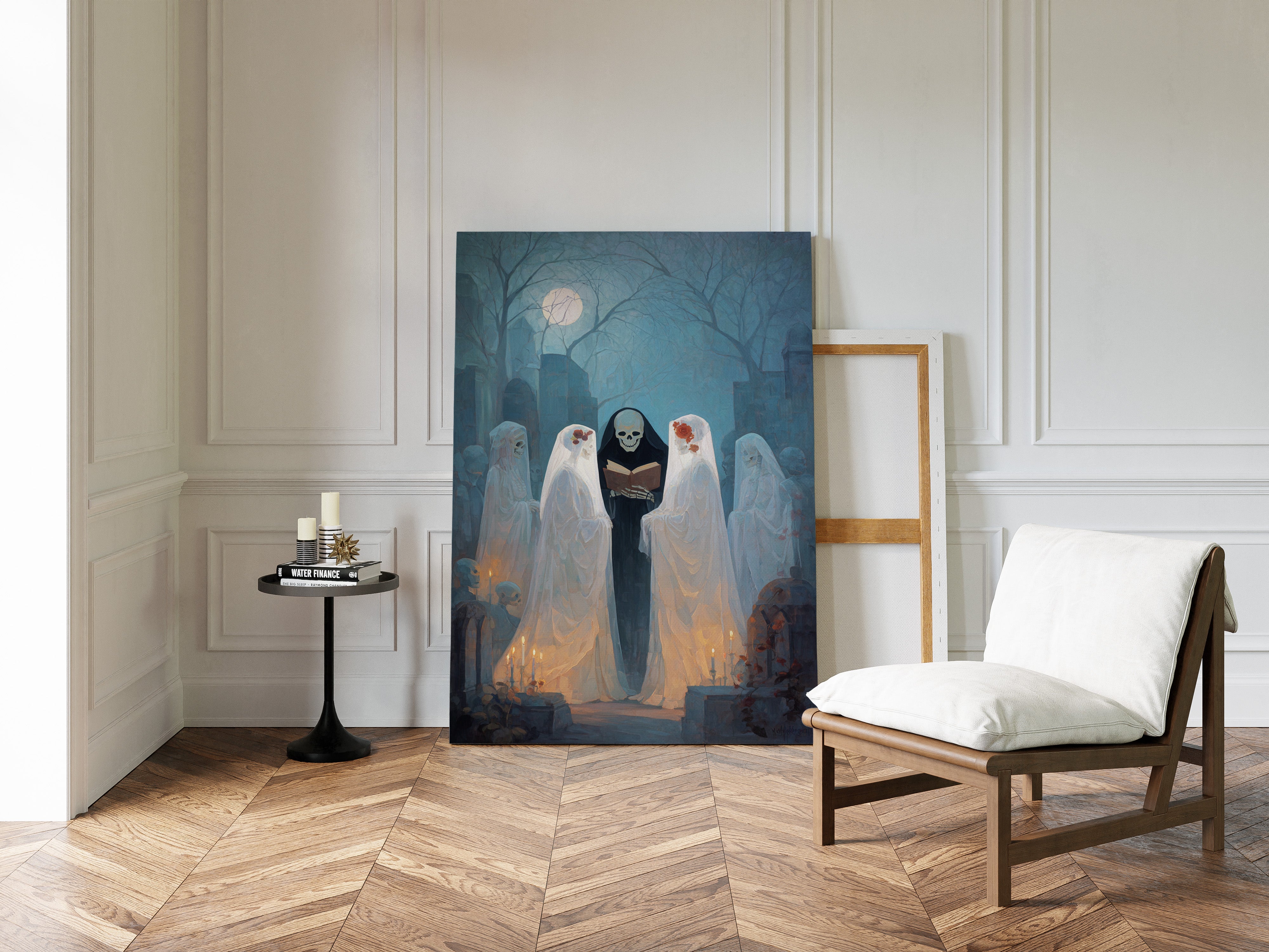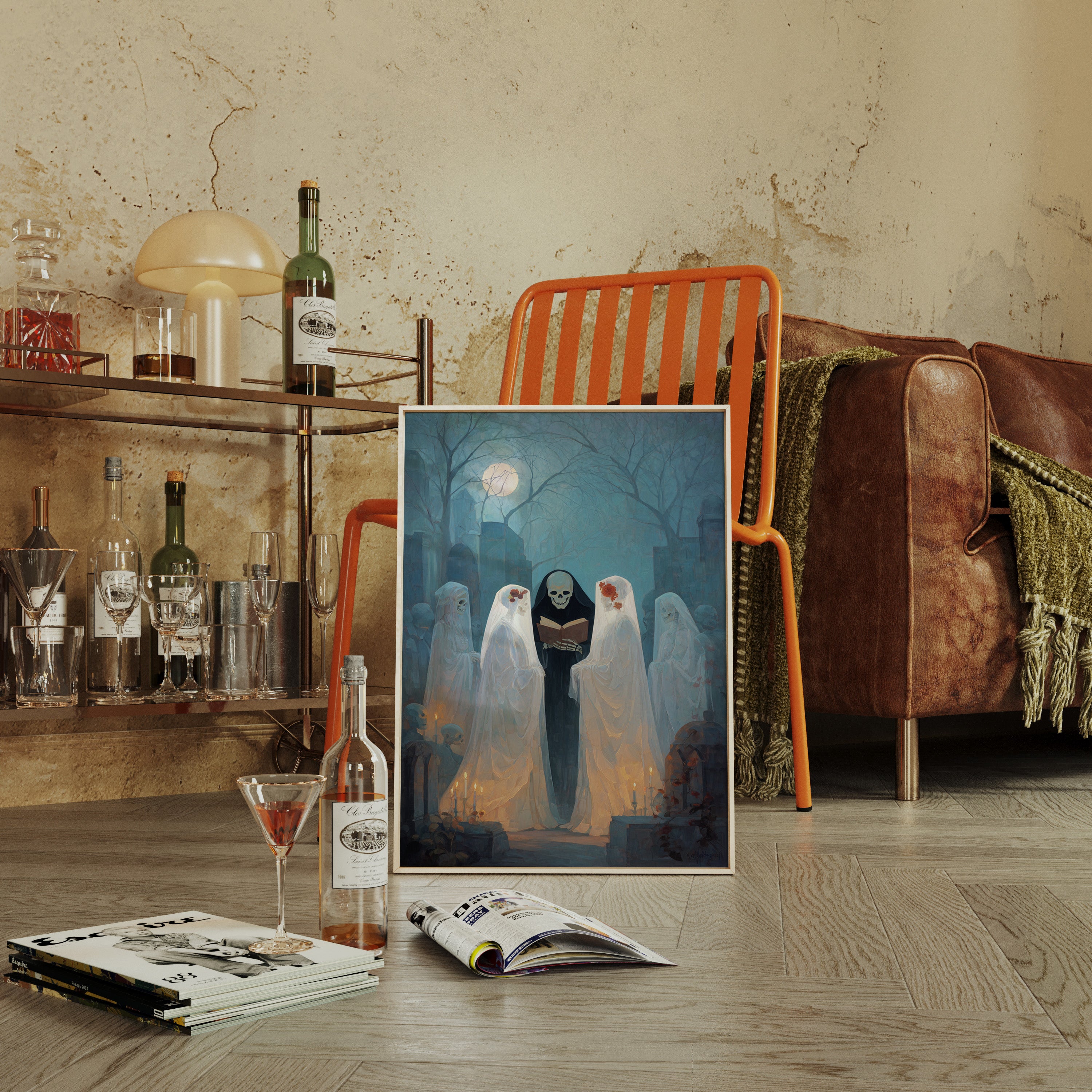 In the stillness of night, two ethereal figures stand poised, their delicate forms adorned with floral whispers, as they gather in an age-old ritual amidst the shadows of forgotten graves. This piece evokes the haunting beauty of the Artisanal collection, where the ordinary meets the extraordinary in a dance of life and death. The painter masterfully captures the tension of the moment, with colors that meld the serene blues of twilight and the warm glow of candlelight, inviting the viewer to ponder the fragility of existence. Ideal for a moody nook or a contemplative space, this artwork invites reflection and conversation.