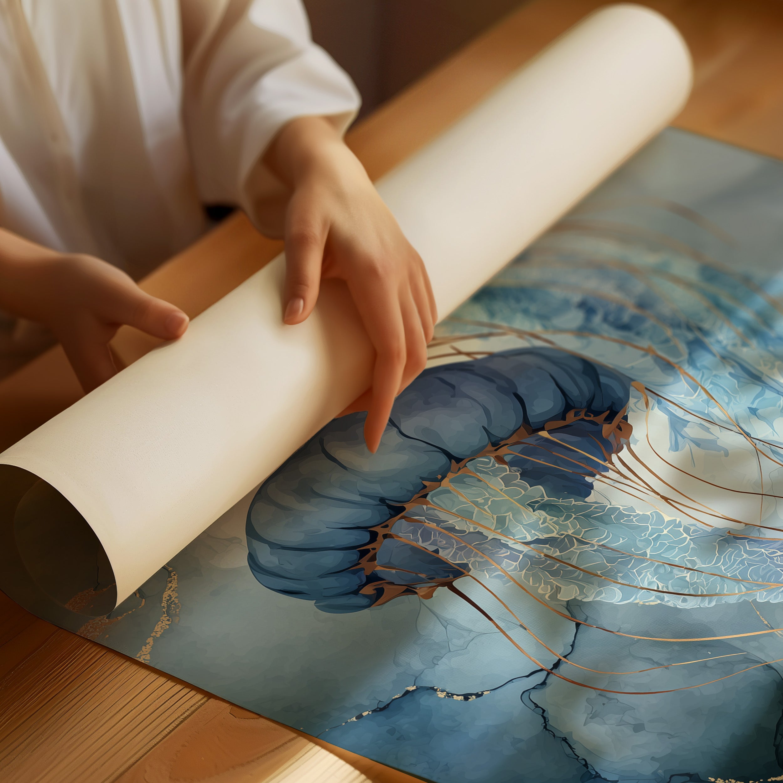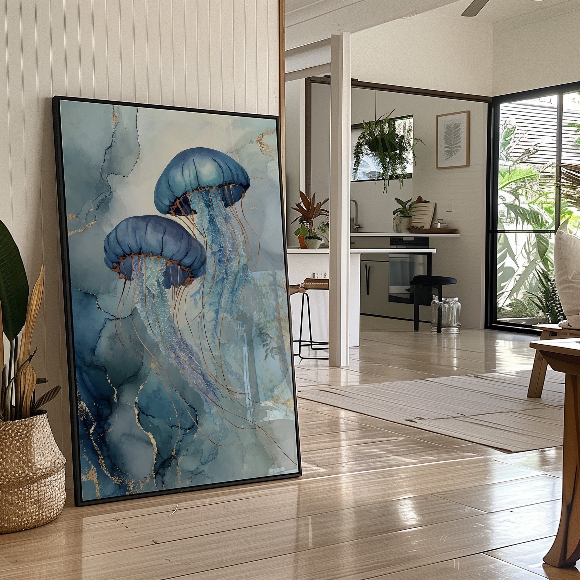 A stunning contemporary artwork depicting two graceful jellyfish floating through a dreamy aquatic environment. The piece features rich blue and teal watercolor tones accented with delicate gold veining, creating an elegant marble-like effect. The translucent tendrils of the jellyfish seem to sway with invisible currents, bringing movement and life to this serene underwater scene.