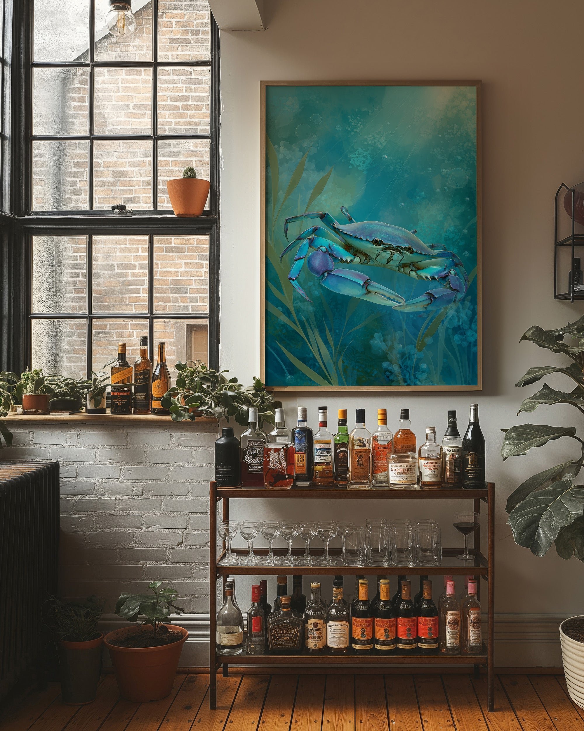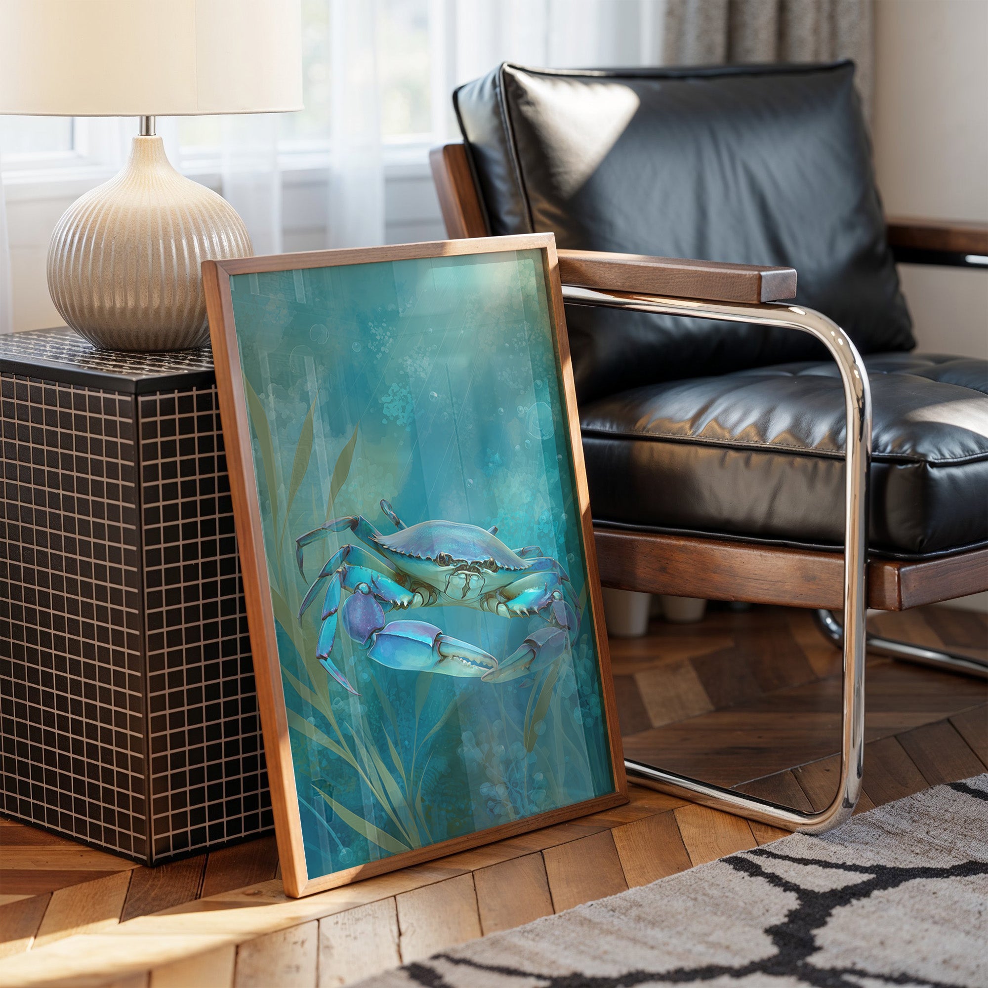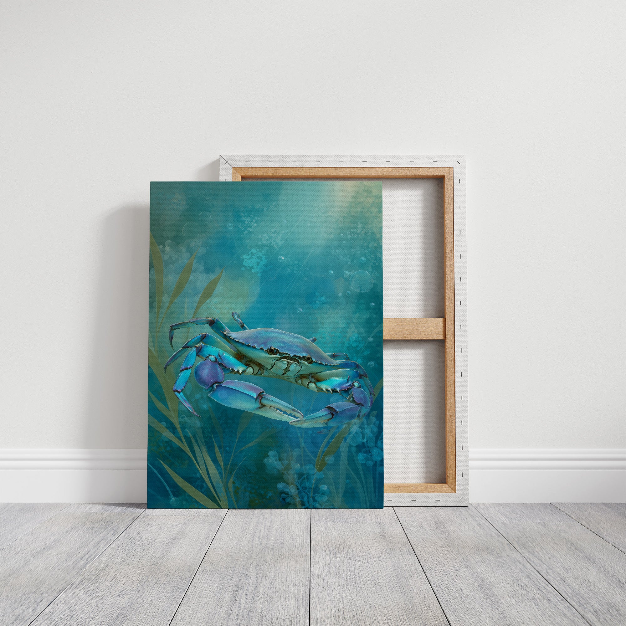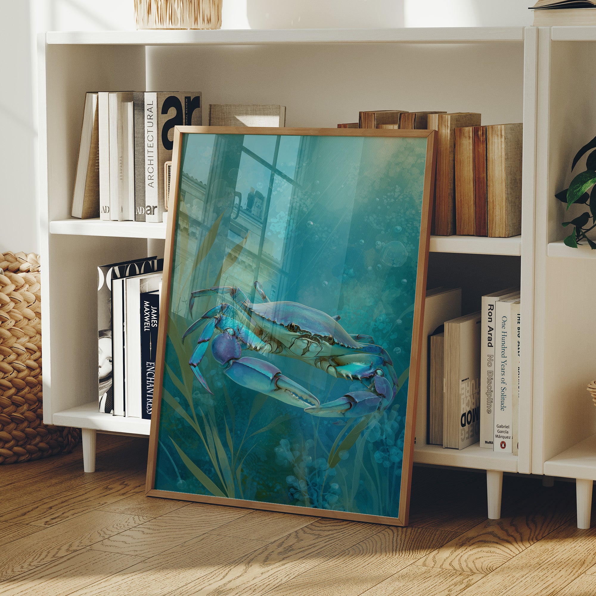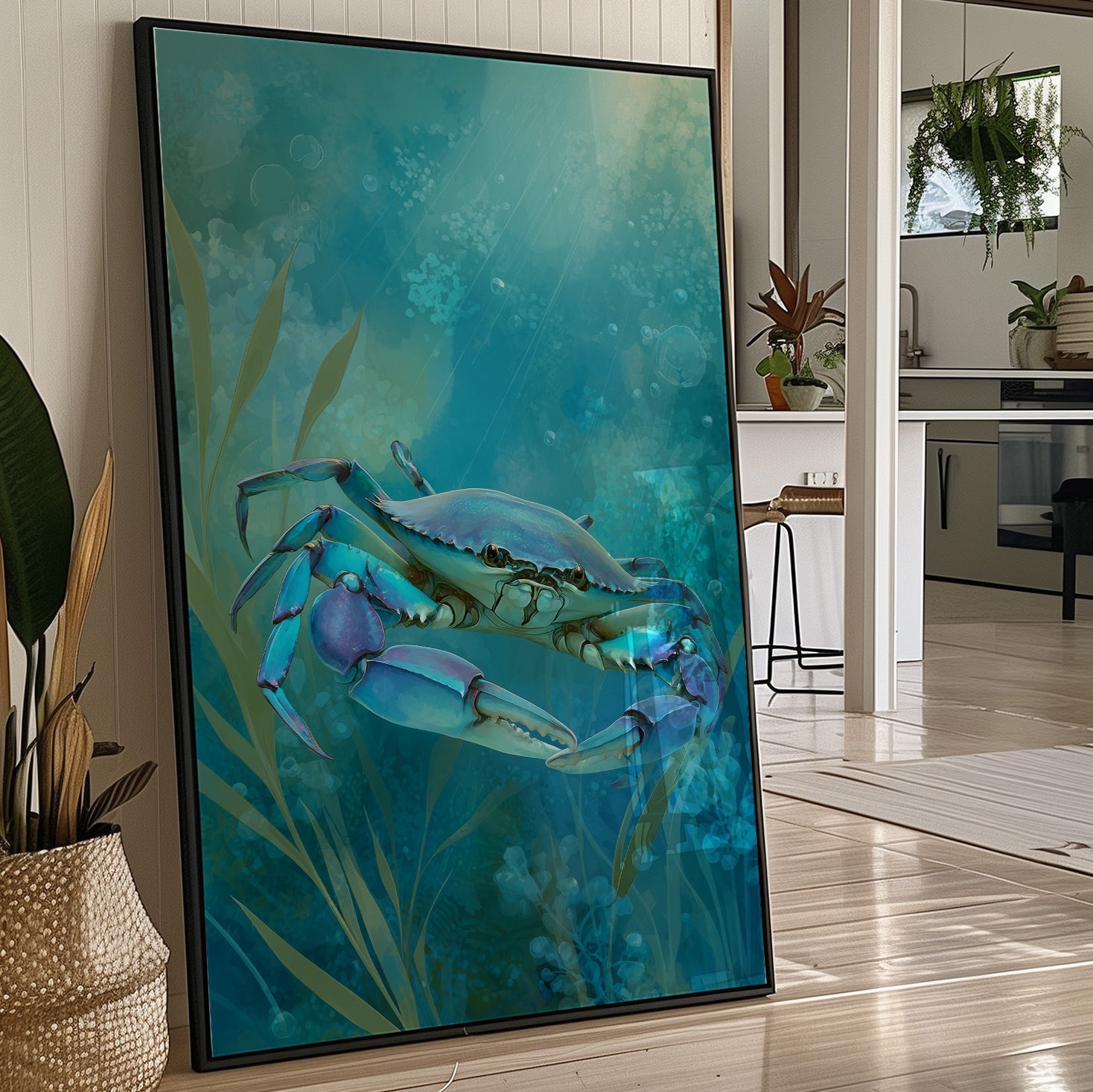 Cool aquamarine hues wash over the scene as two blue crabs dance in their underwater ballet. The delicate brushstrokes capture both the translucent quality of water and the armored elegance of these coastal creatures. Seagrass sways gently in an invisible current, creating a serene underwater narrative that brings a slice of oceanic calm into the modern space.
