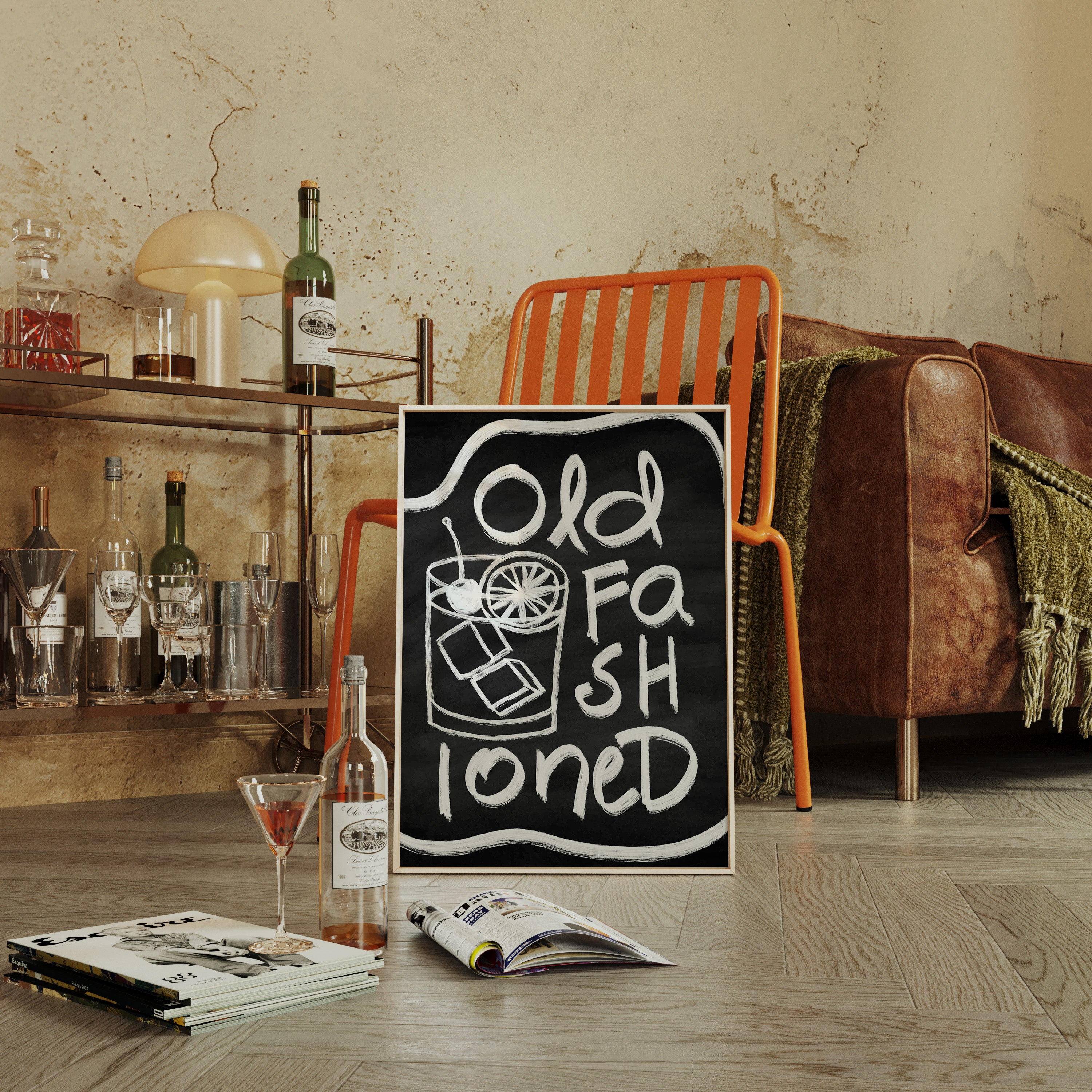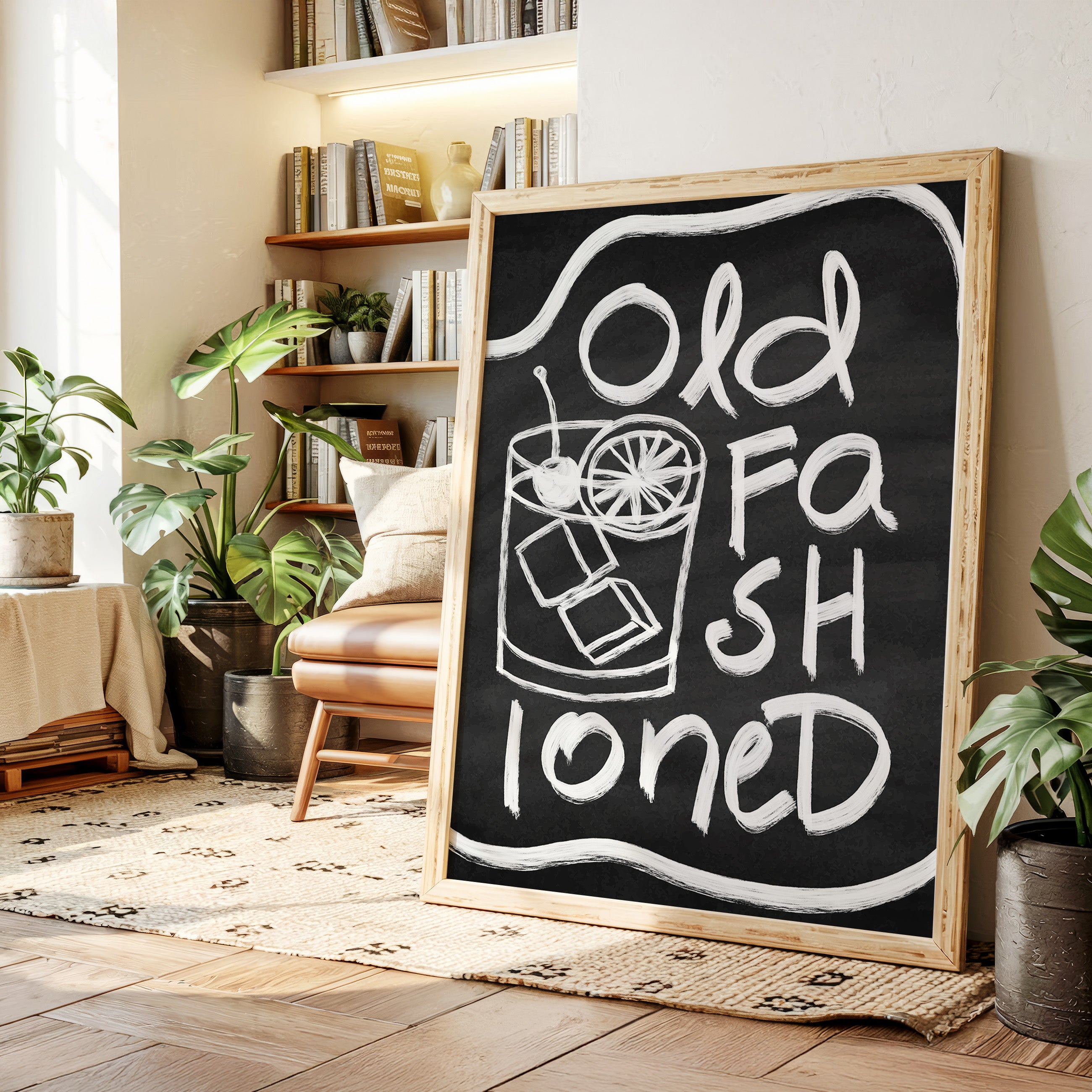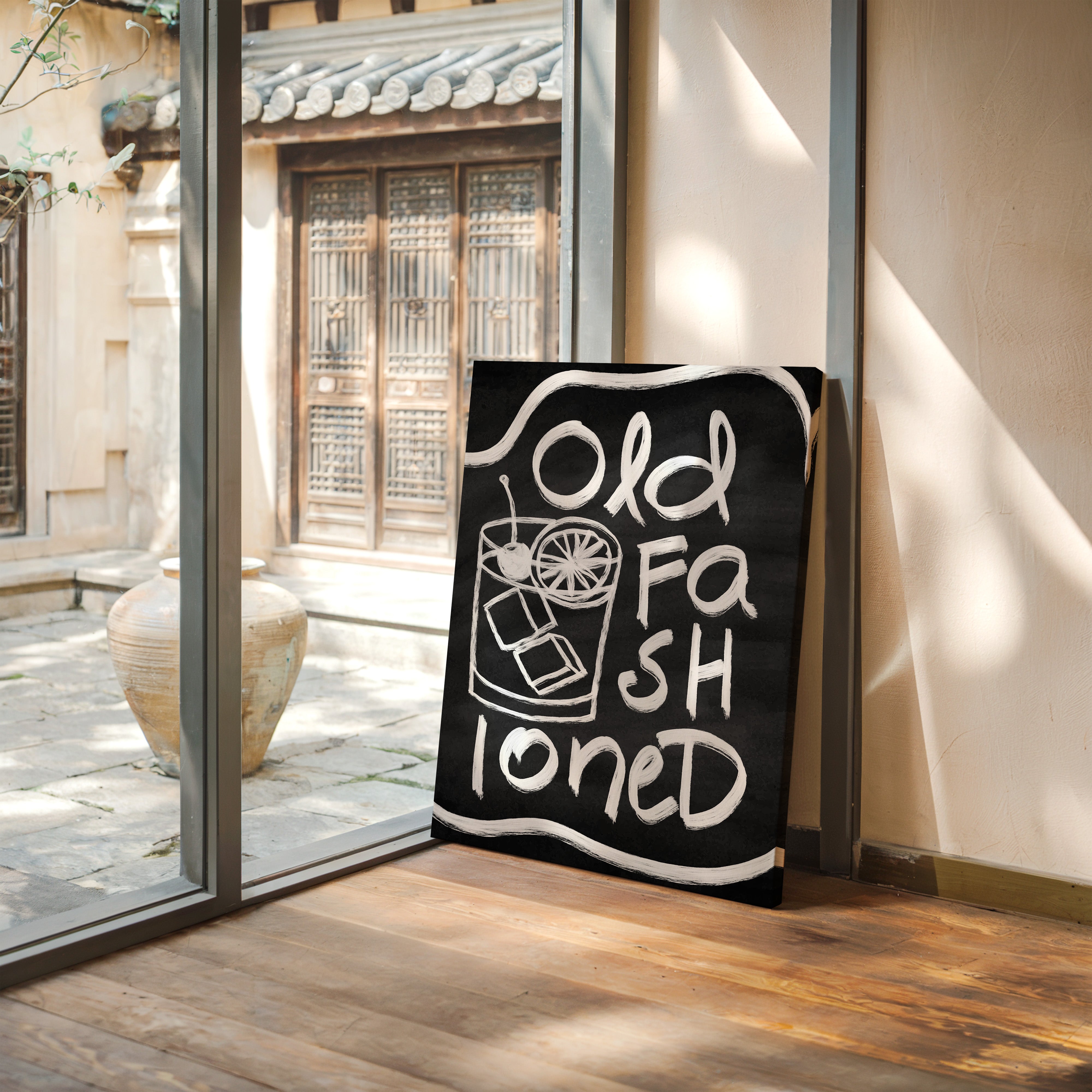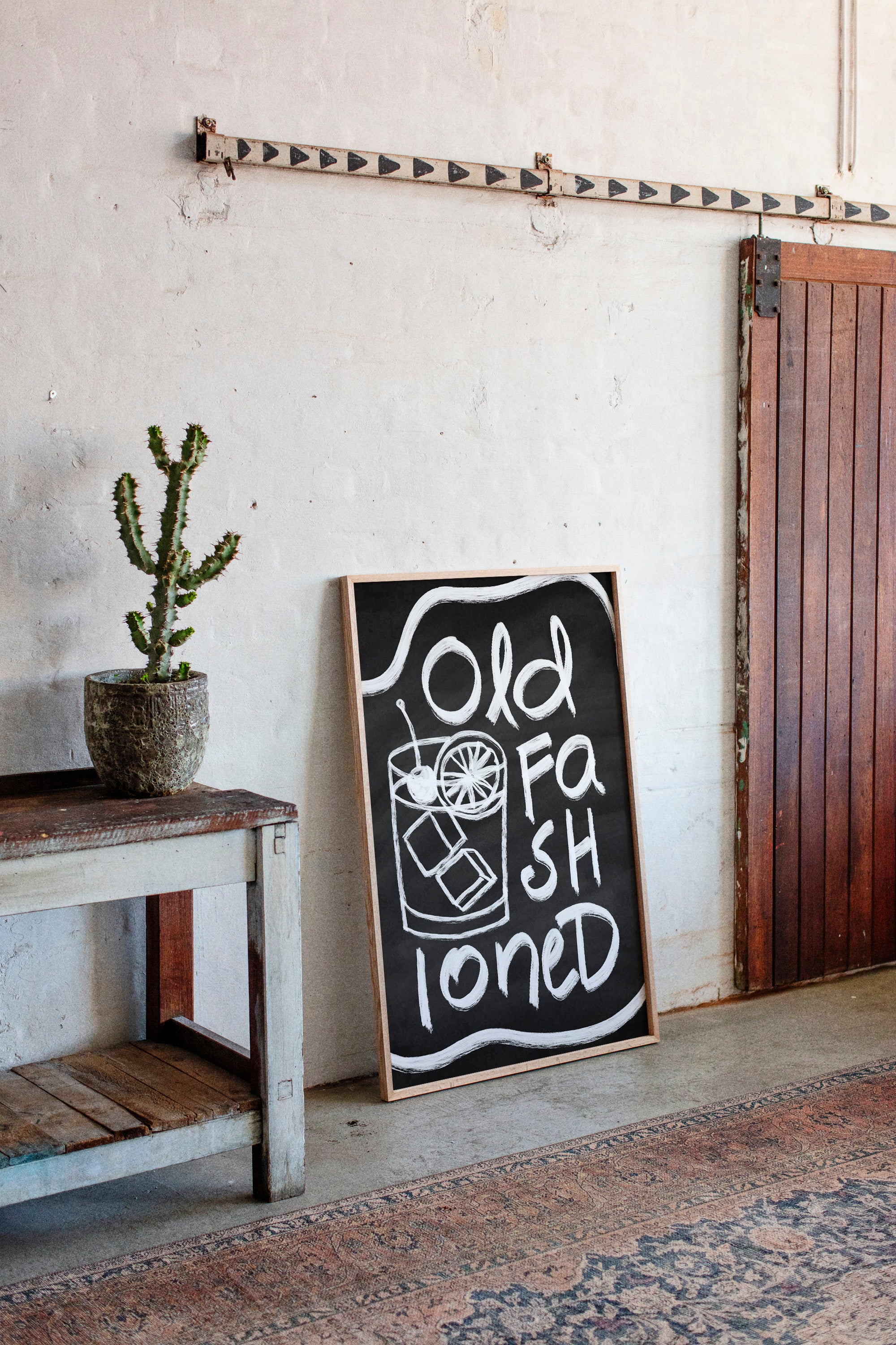 A rustic corner where time slows down, marked by the bold strokes of hand-drawn letters against deep black chalk. Part of our Contemporary collection, this piece captures the laid-back spirit of modern desert living. The composition creates a perfect balance between industrial and organic elements - from the geometric arrow rail above to the spiky cactus companion standing guard. The weathered wooden bench and textured concrete wall add layers of authentic charm that ground the playful typography. This striking piece makes a statement in modern kitchens, coffee bars, or any space seeking that perfect blend of vintage industrial and desert modern aesthetics. The monochromatic palette ensures it remains both bold and versatile.